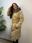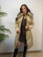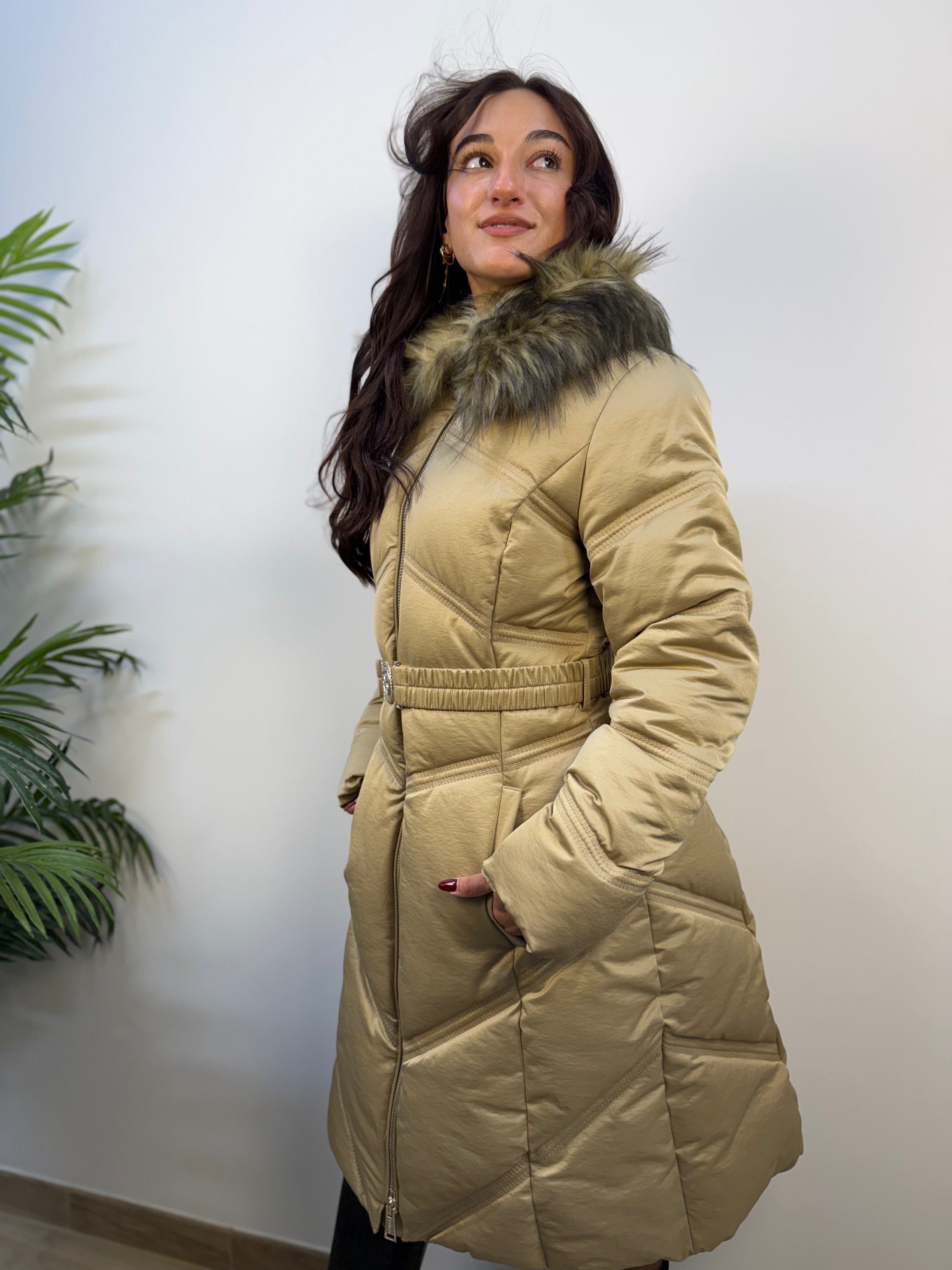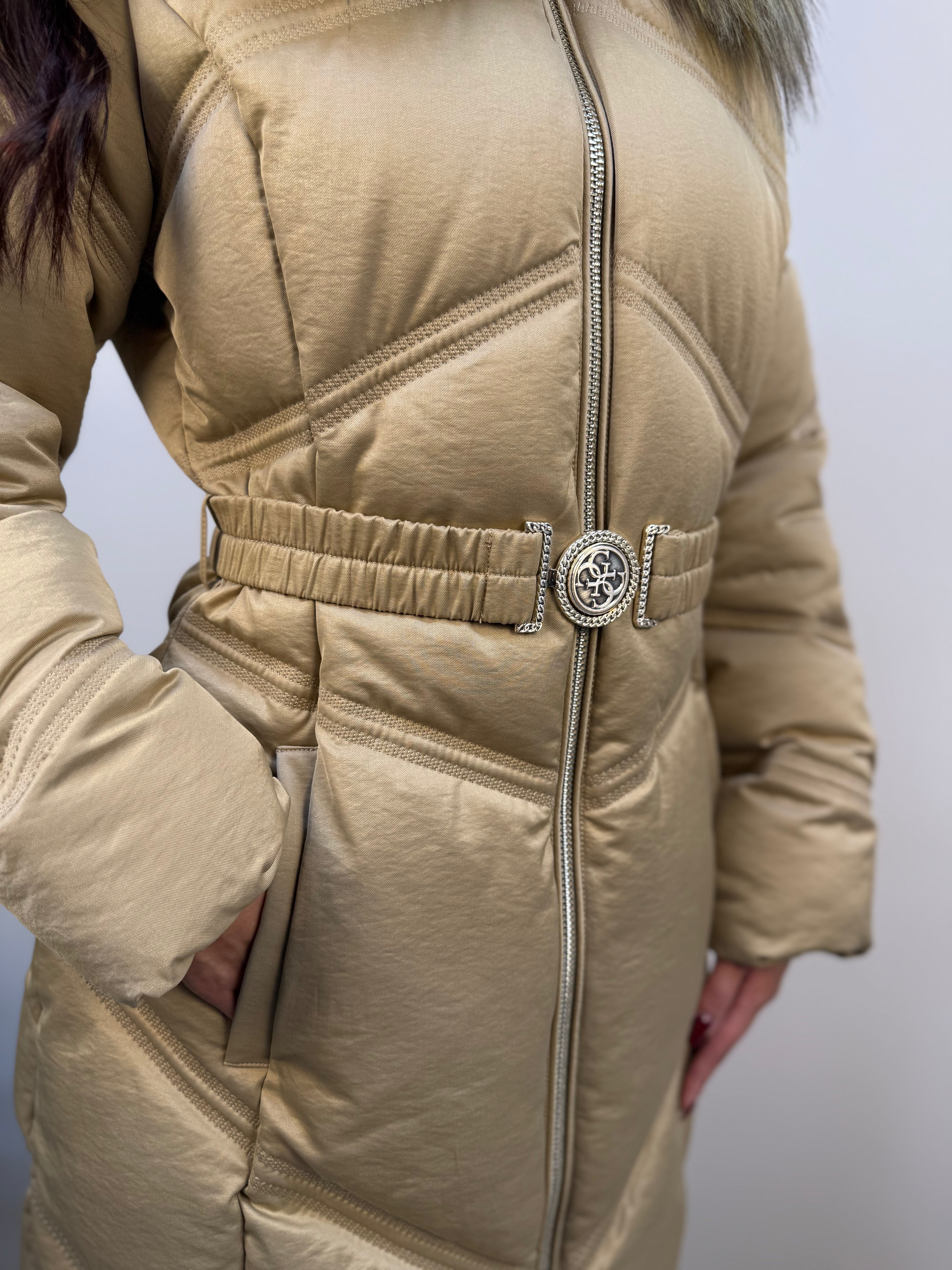 Giacca piumino Guess calda e avvolgente, pensata per offrire il massimo comfort durante la stagione più fredda. Dotata di chiusura con zip frontale e cintura elasticizzata con logo metallico oro, che sottolinea la vita aggiungendo un tocco elegante. La pelliccia è removibile grazie a pratici bottoni, per adattare il look alle diverse occasioni. Completano il capo le tasche frontali funzionali e discrete. Un mix perfetto di stile e praticità.
