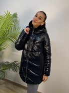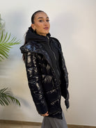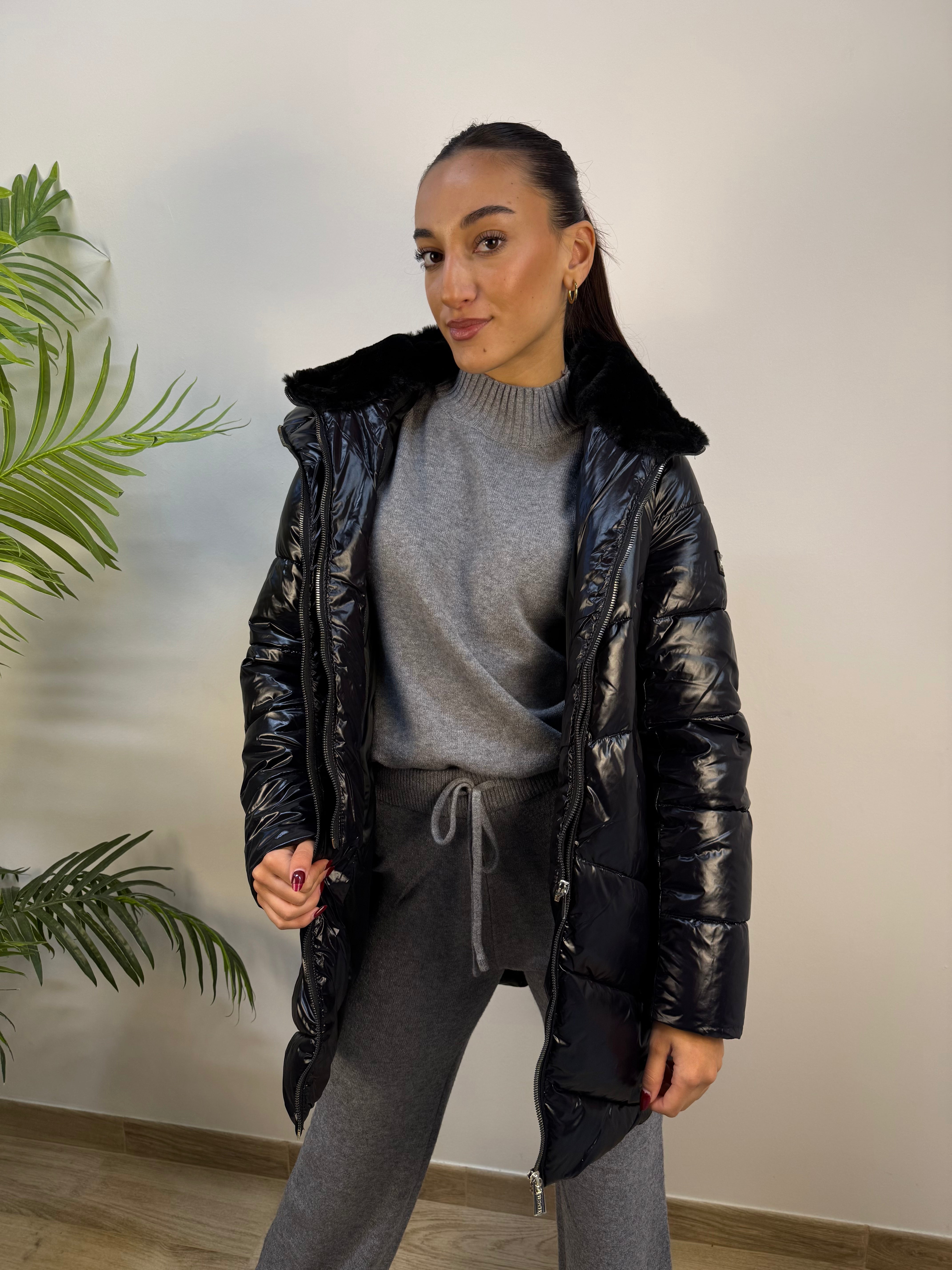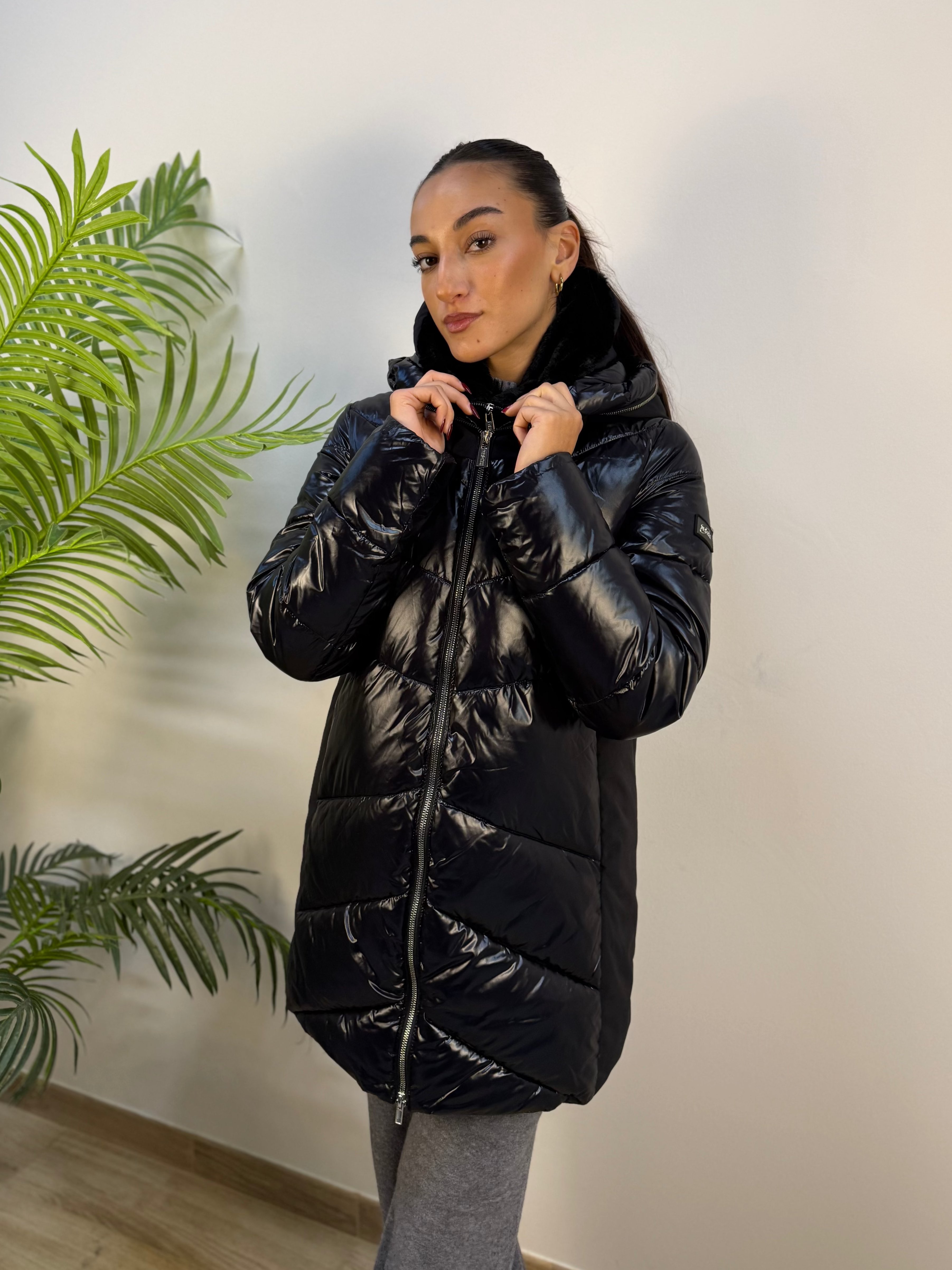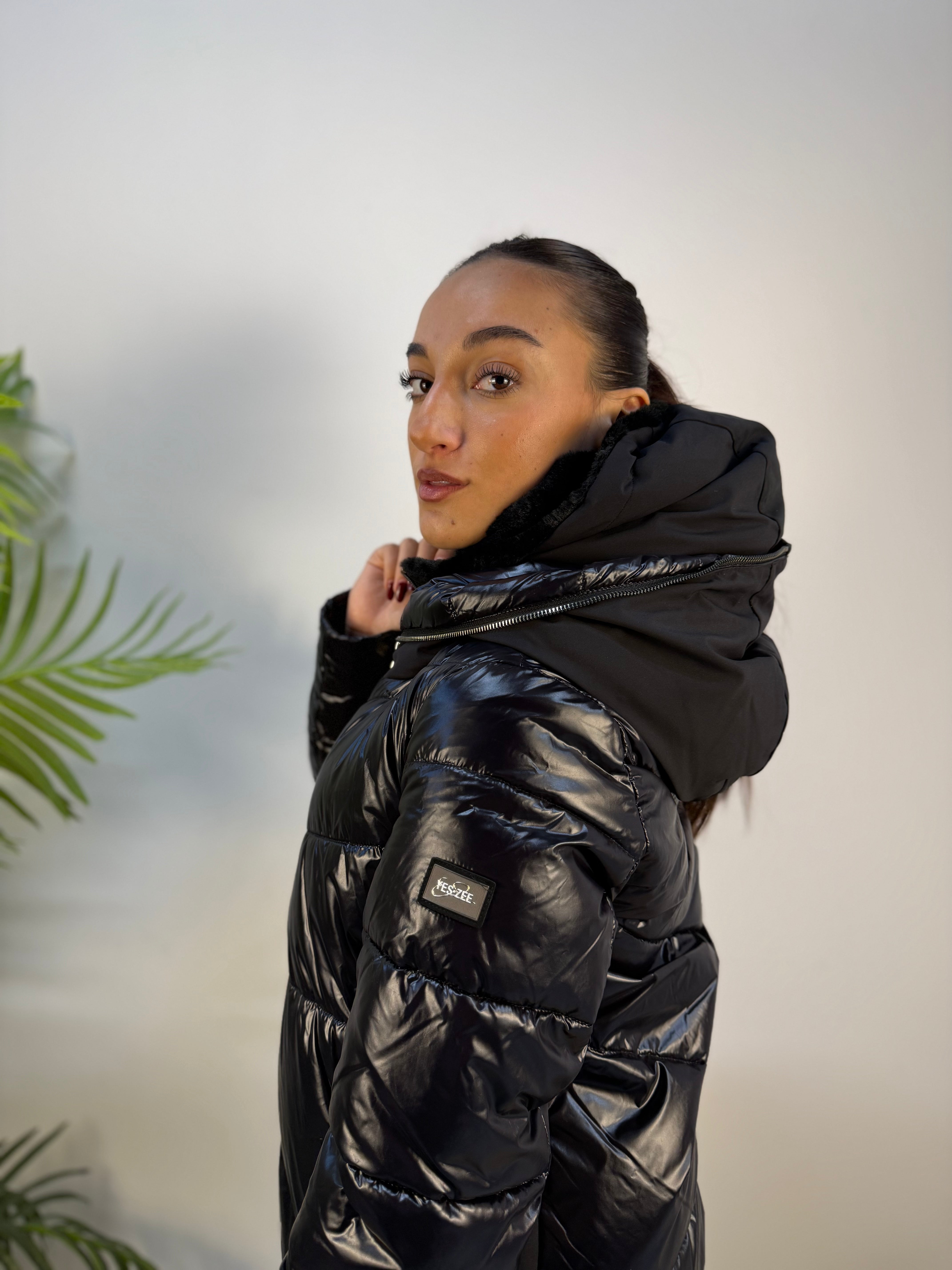 Piumino Yes-Zee lungo dall’effetto lucido con dettagli in tessuto tecnico e doppiopetto con zip removibile. Dotato di colletto in pelo corto morbido e cappuccio con bordo in pelo, presenta chiusura con zip argento e tasche laterali con zip invisibile. Caldo e morbido, un capo elegante e confortevole, ideale per affrontare la stagione con stile.