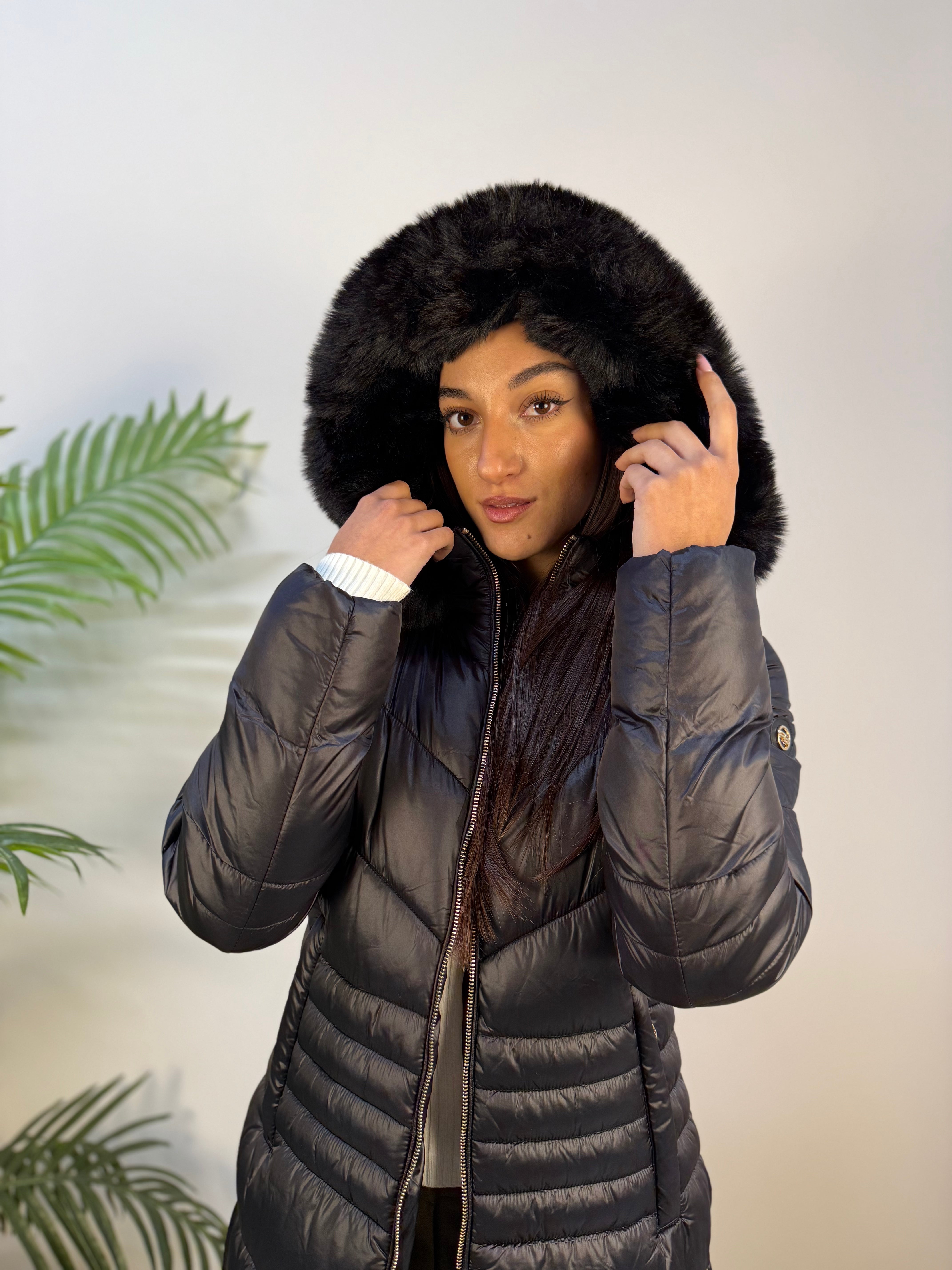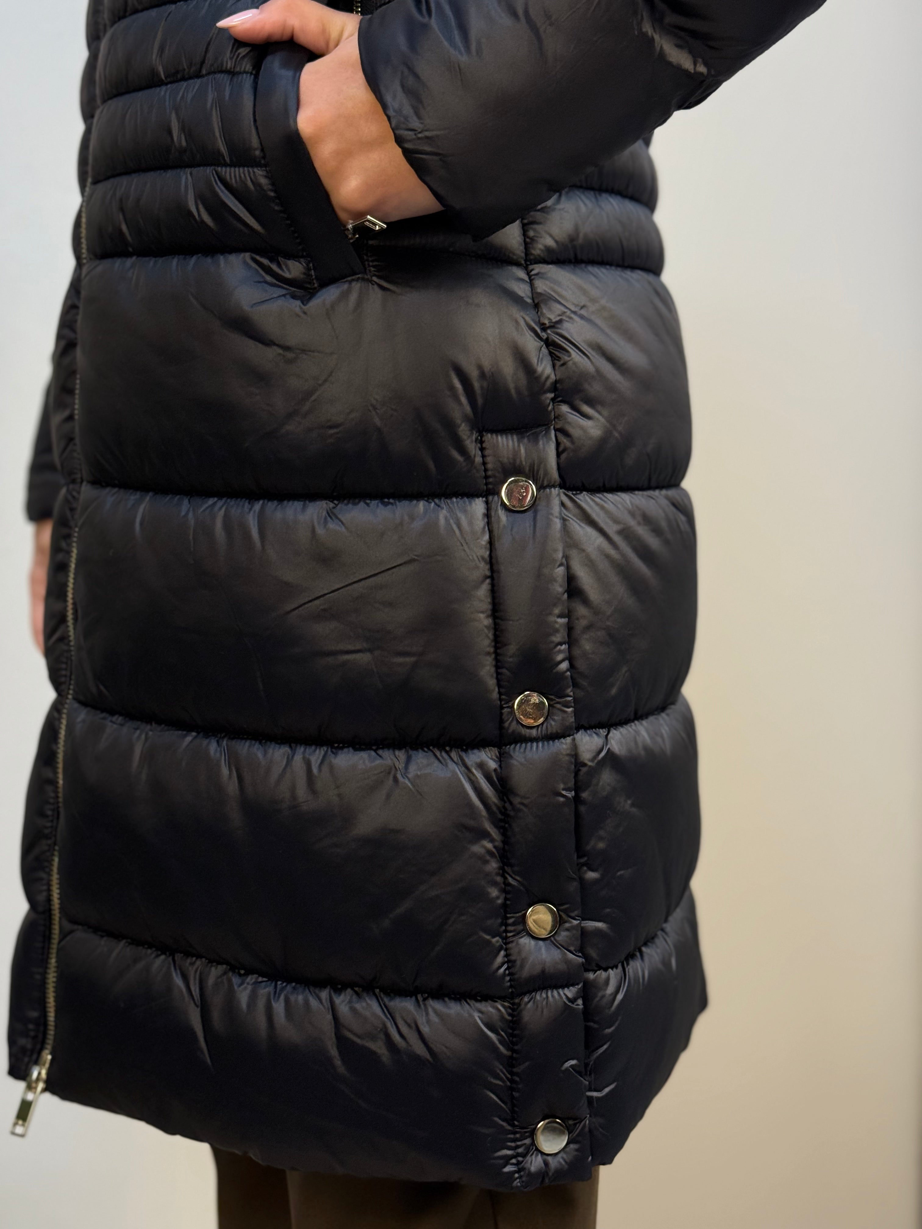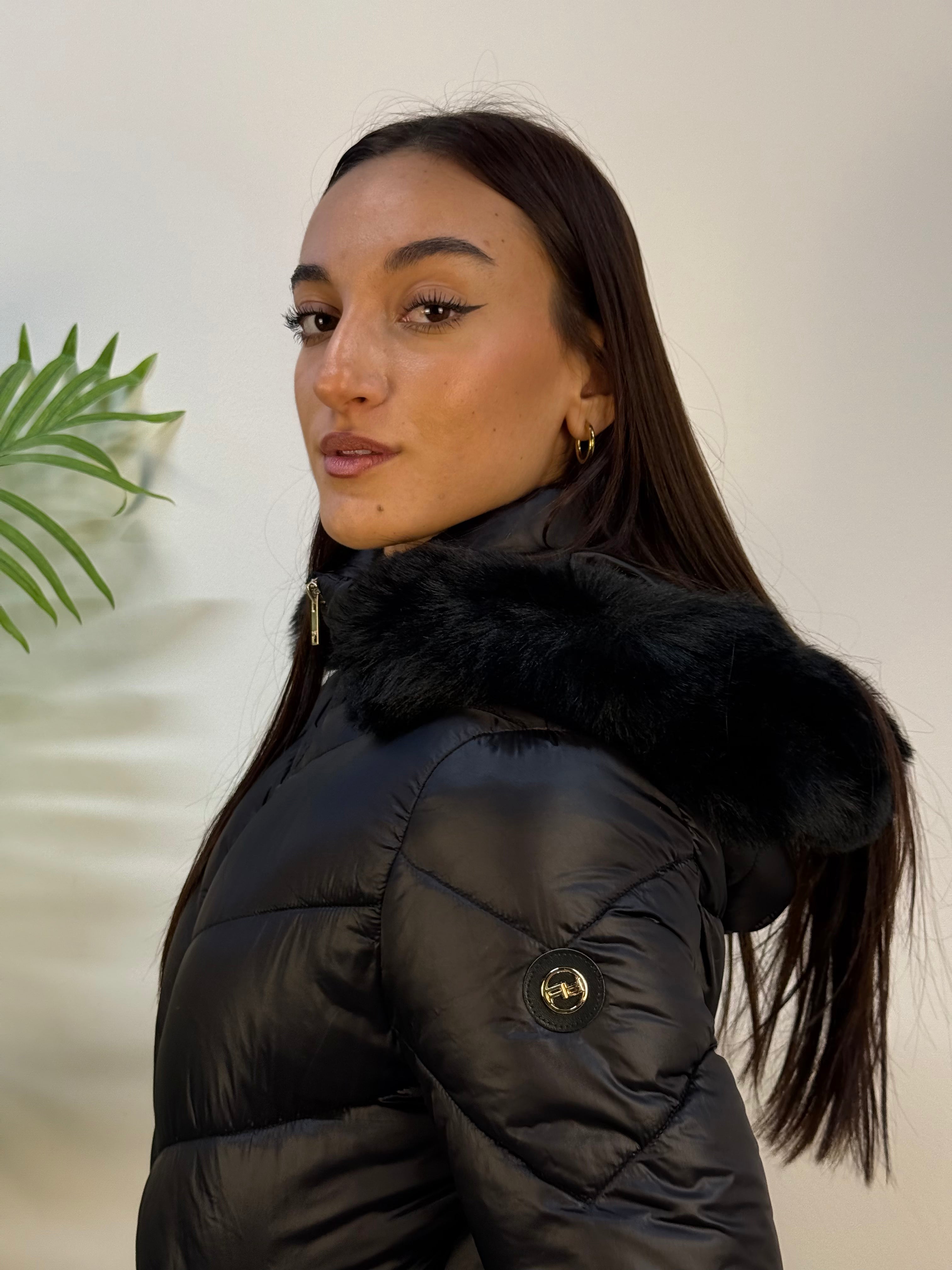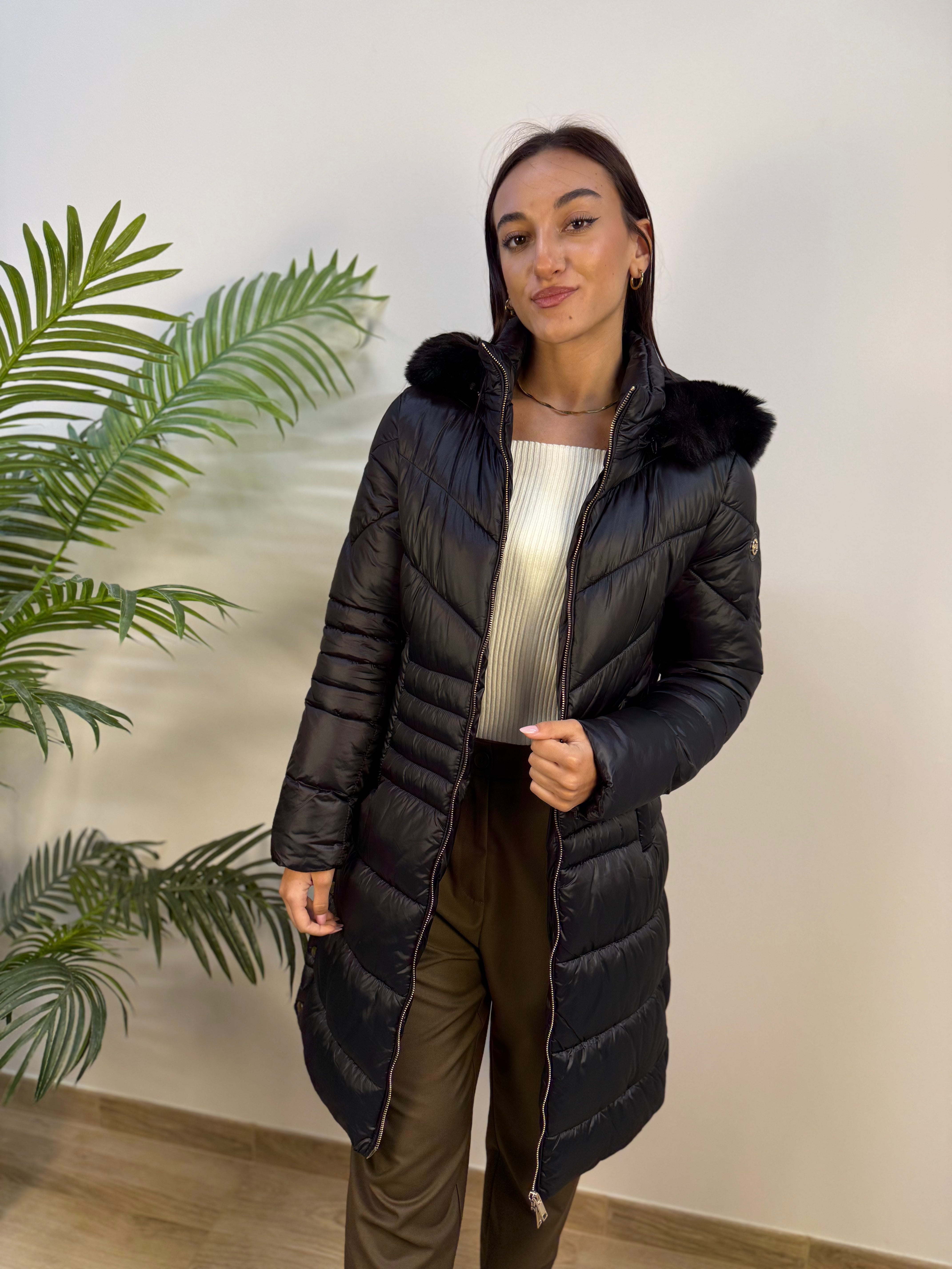 Piumino lungo Artigli con cappuccio removibile tramite zip, contornato da pelliccia nera removibile. Dotato di chiusura frontale con zip, tasche con zip e bottoni a pressione laterali oro che aggiungono un tocco di carattere. Completano il design il suo stile fine e delicato e il piccolo logo metallico dorato sulla manica.
