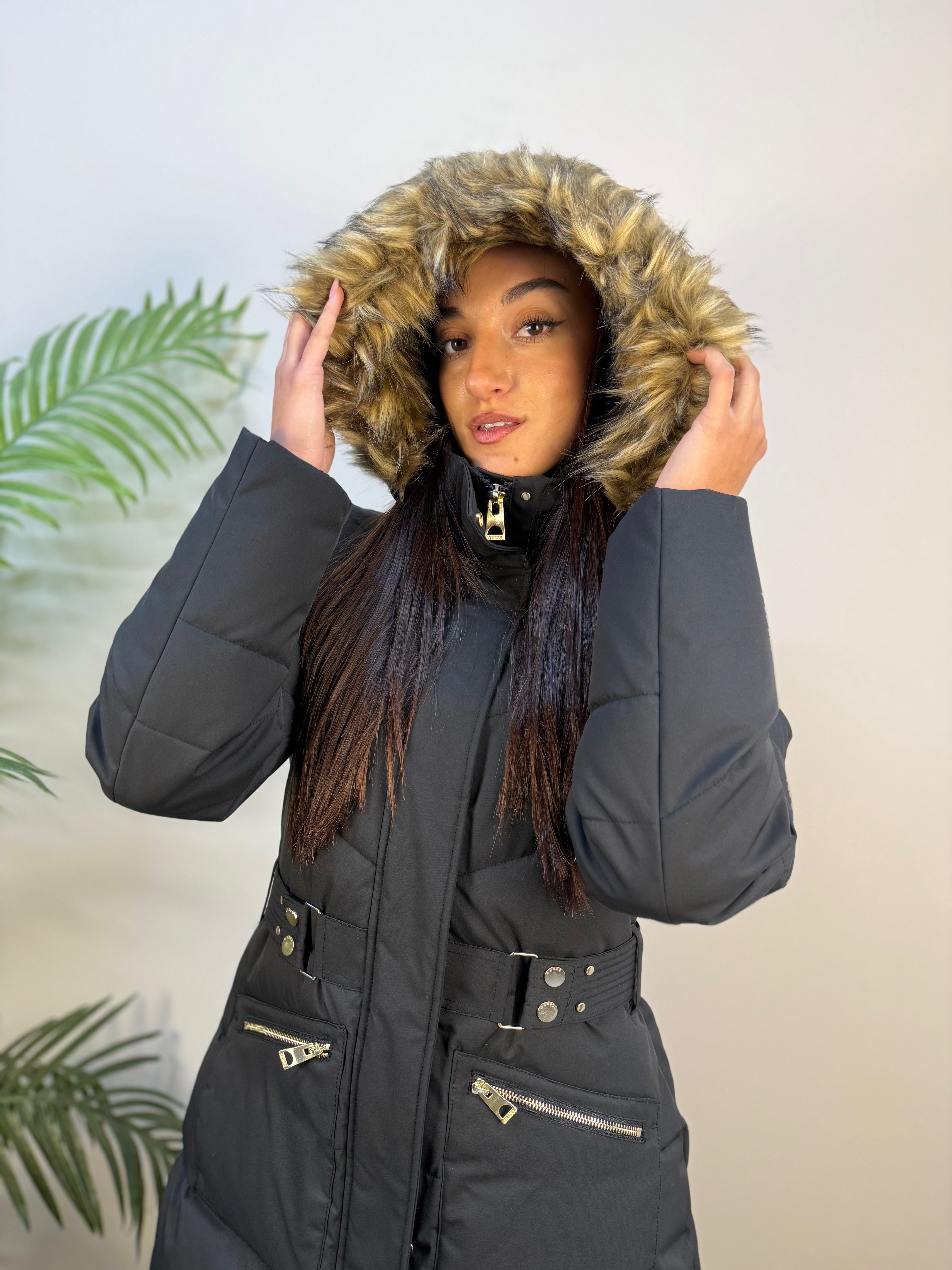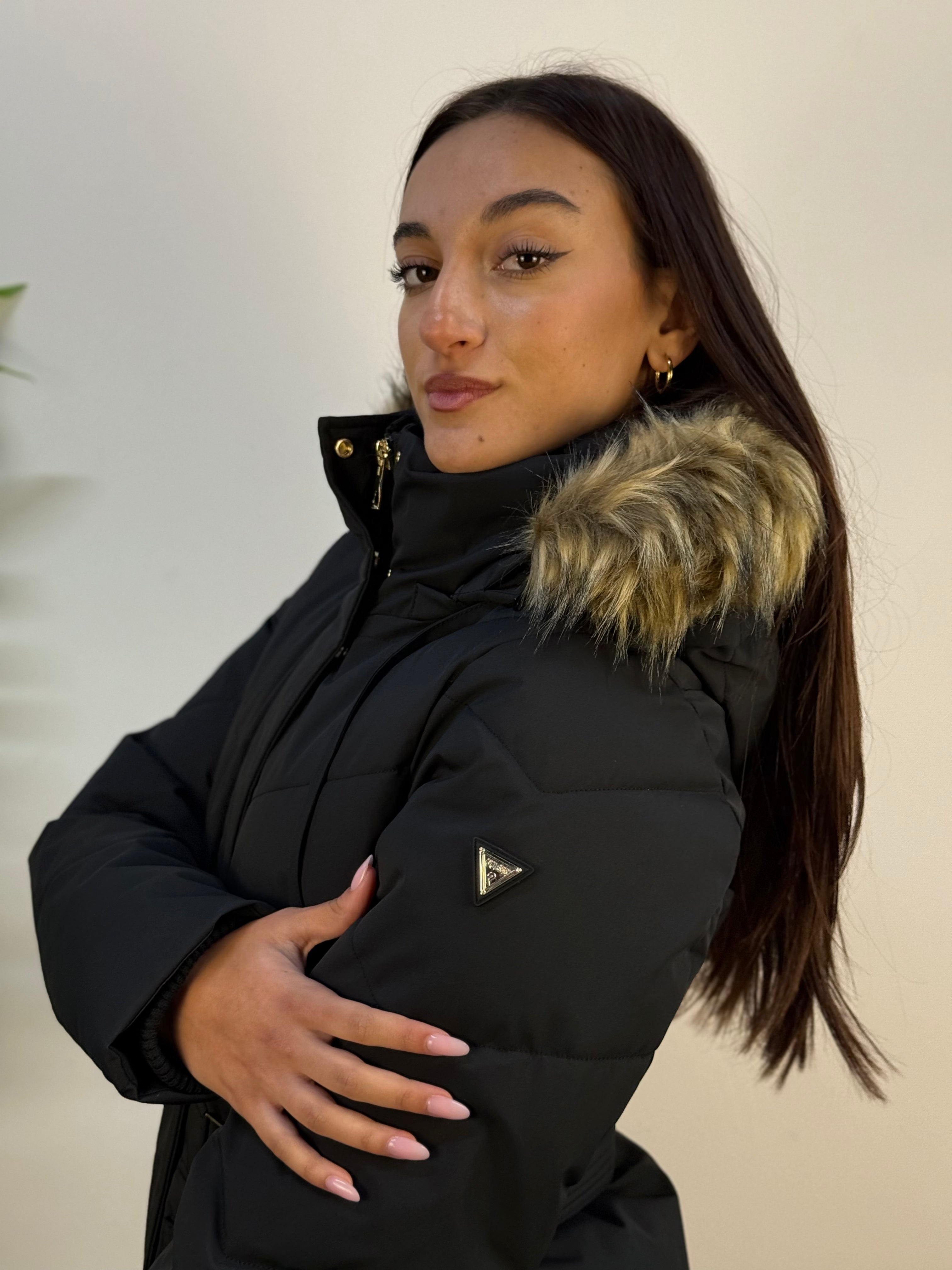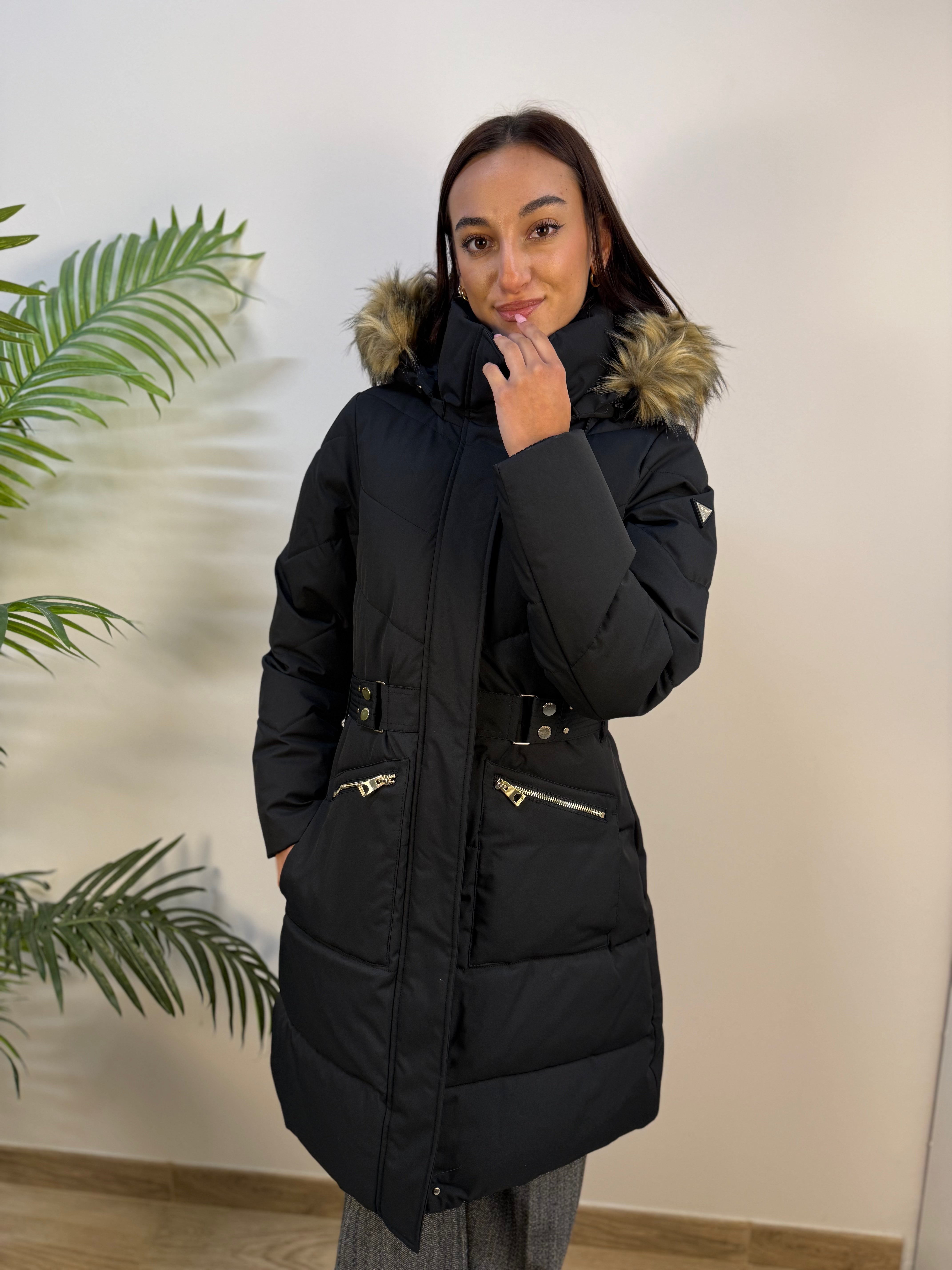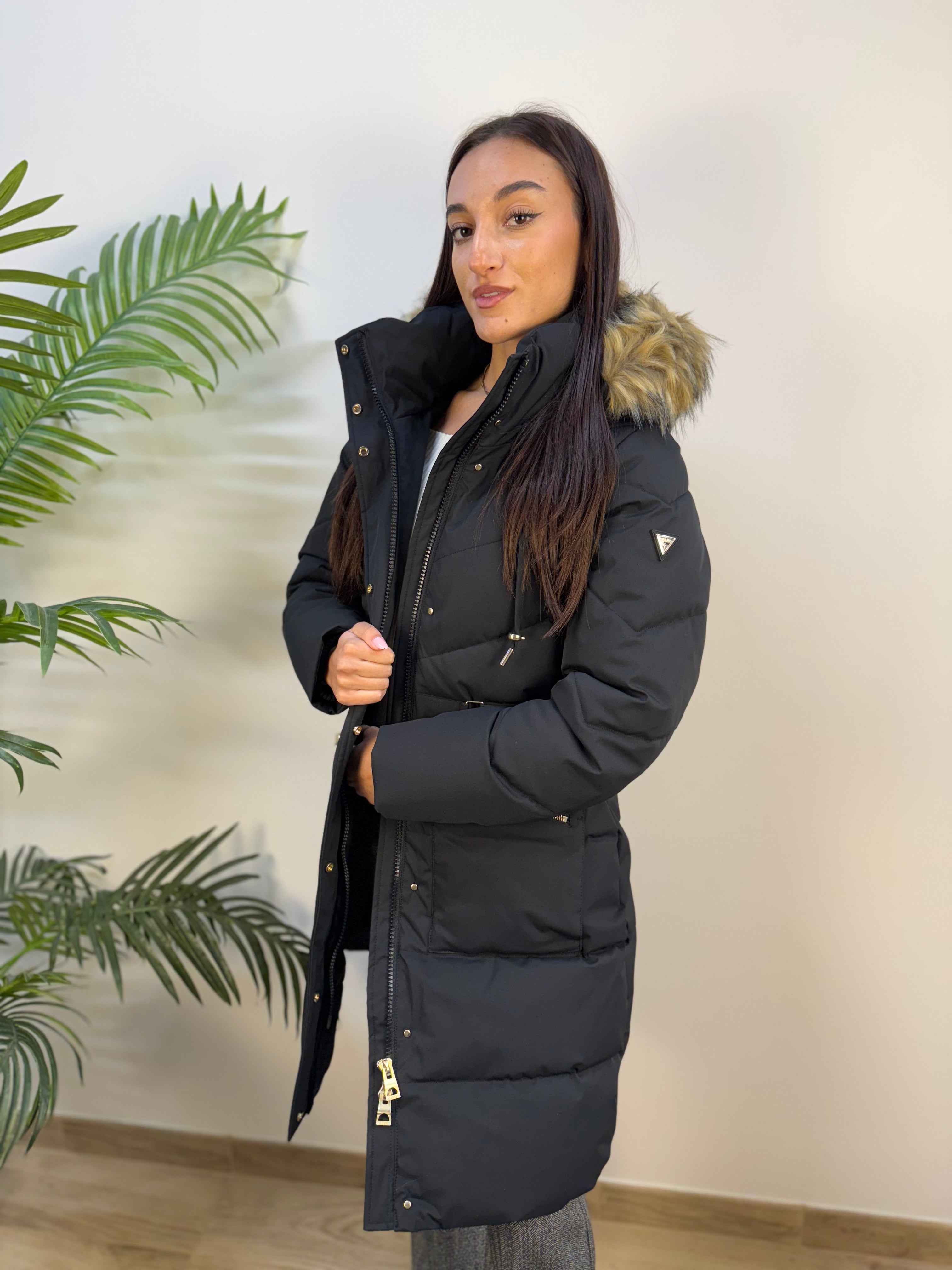 Piumino lungo Guess elegante e caldo, con chiusura a zip nascosta da patta con bottoni a pressione. Presenta due tasche frontali con zip, polsini a costine, cappuccio con lacci e pelliccia removibile. La cintura elasticizzata valorizza la silhouette, mentre il logo metallico sulla manica aggiunge un tocco raffinato.
