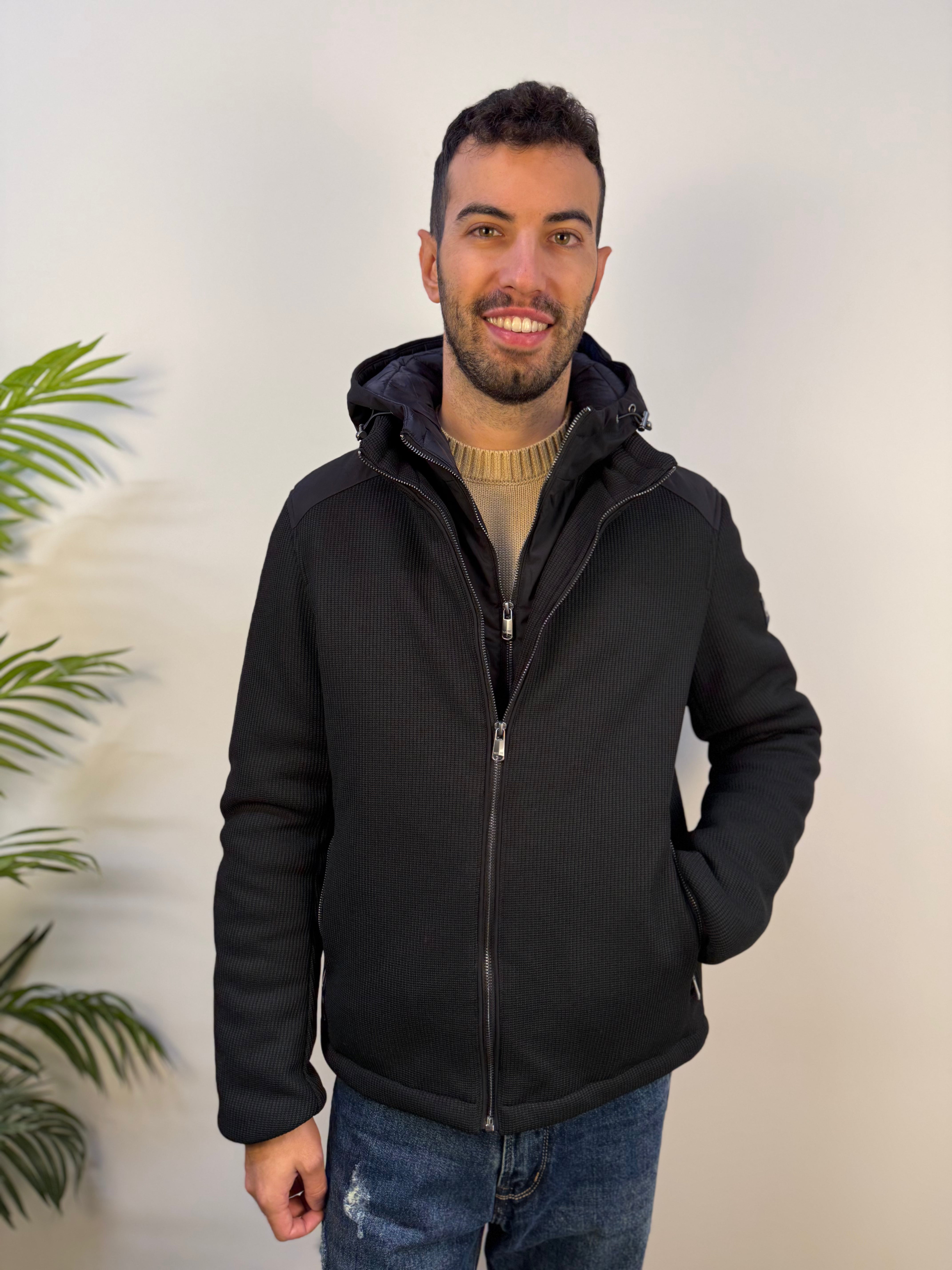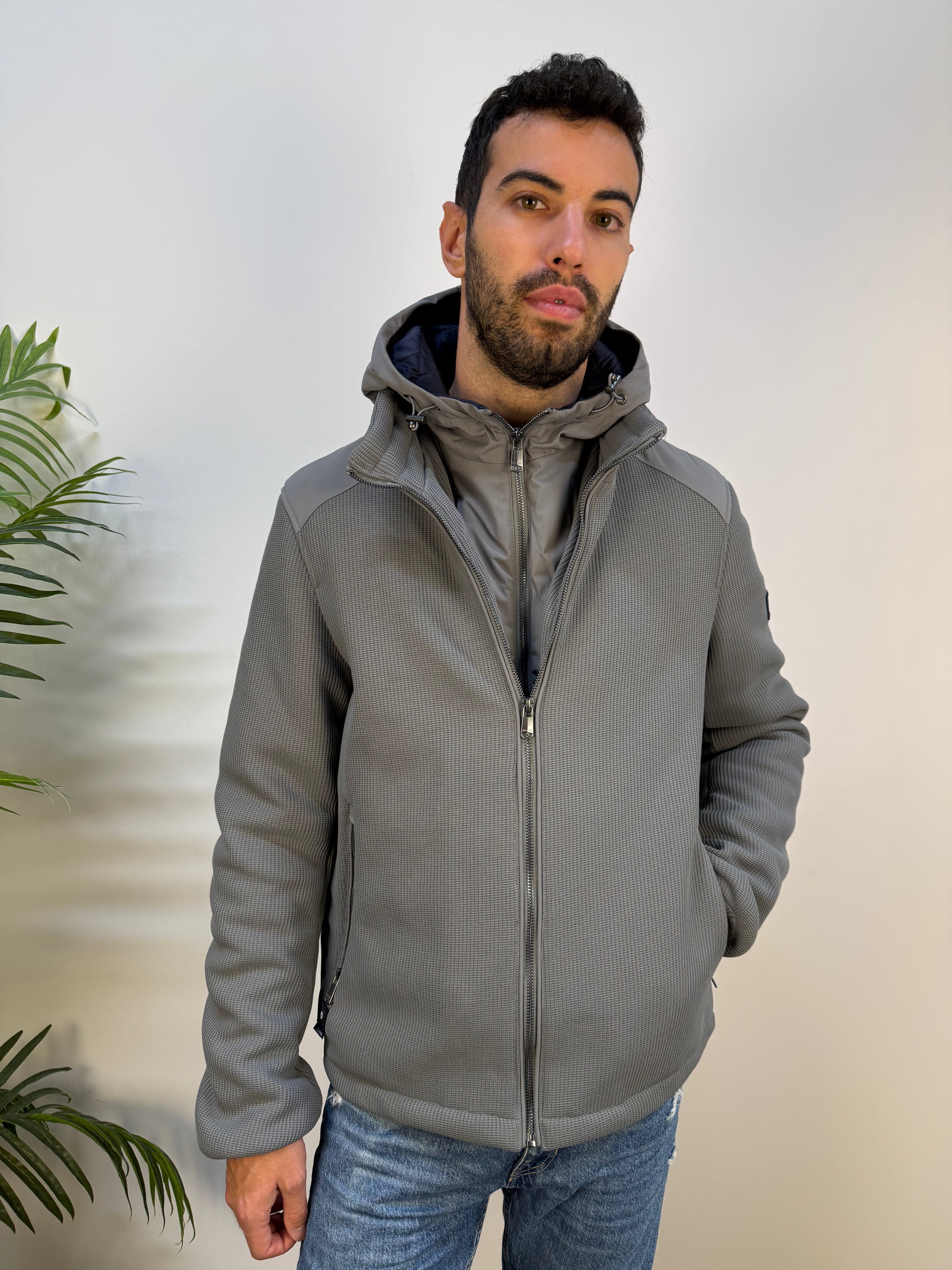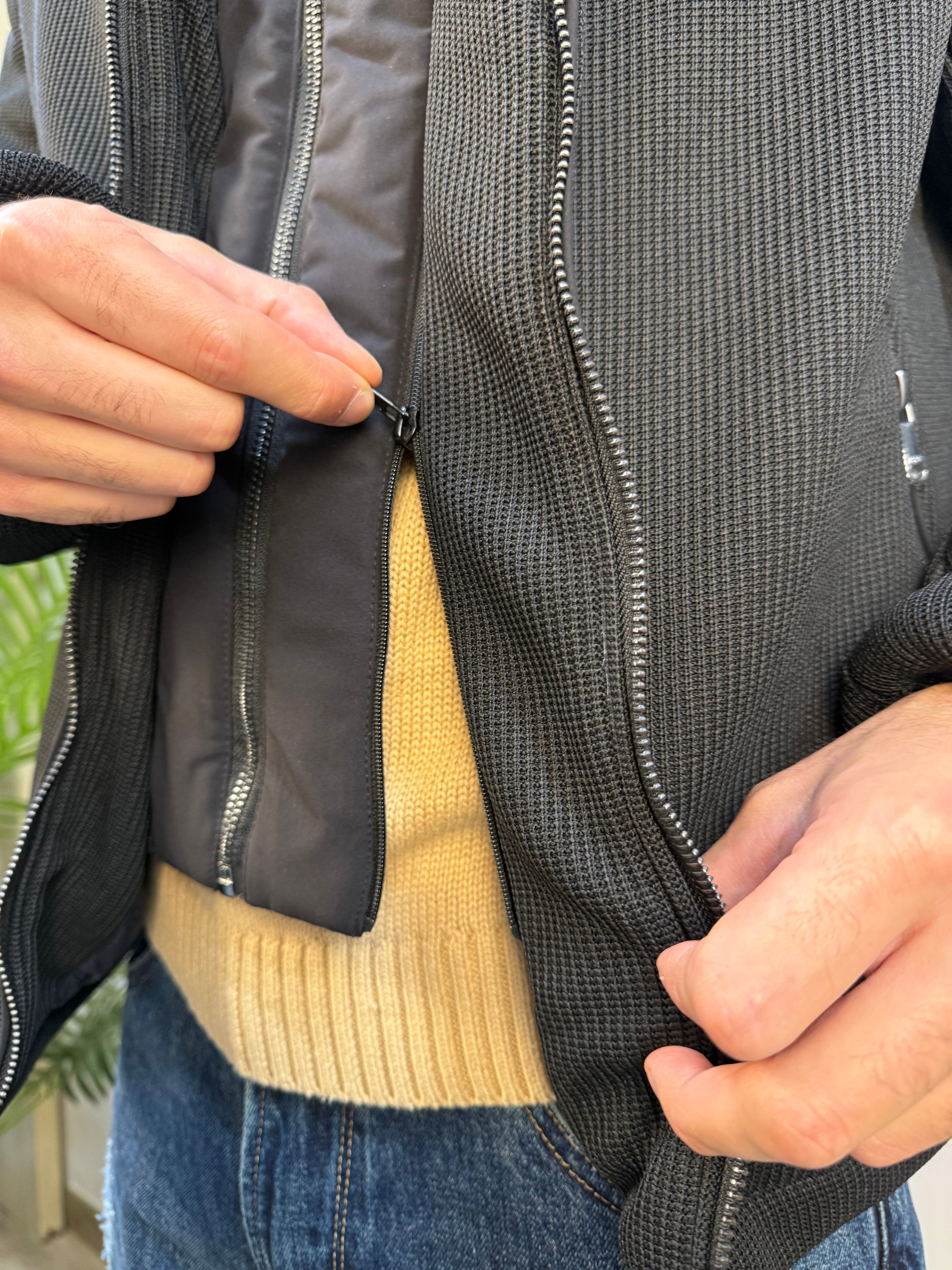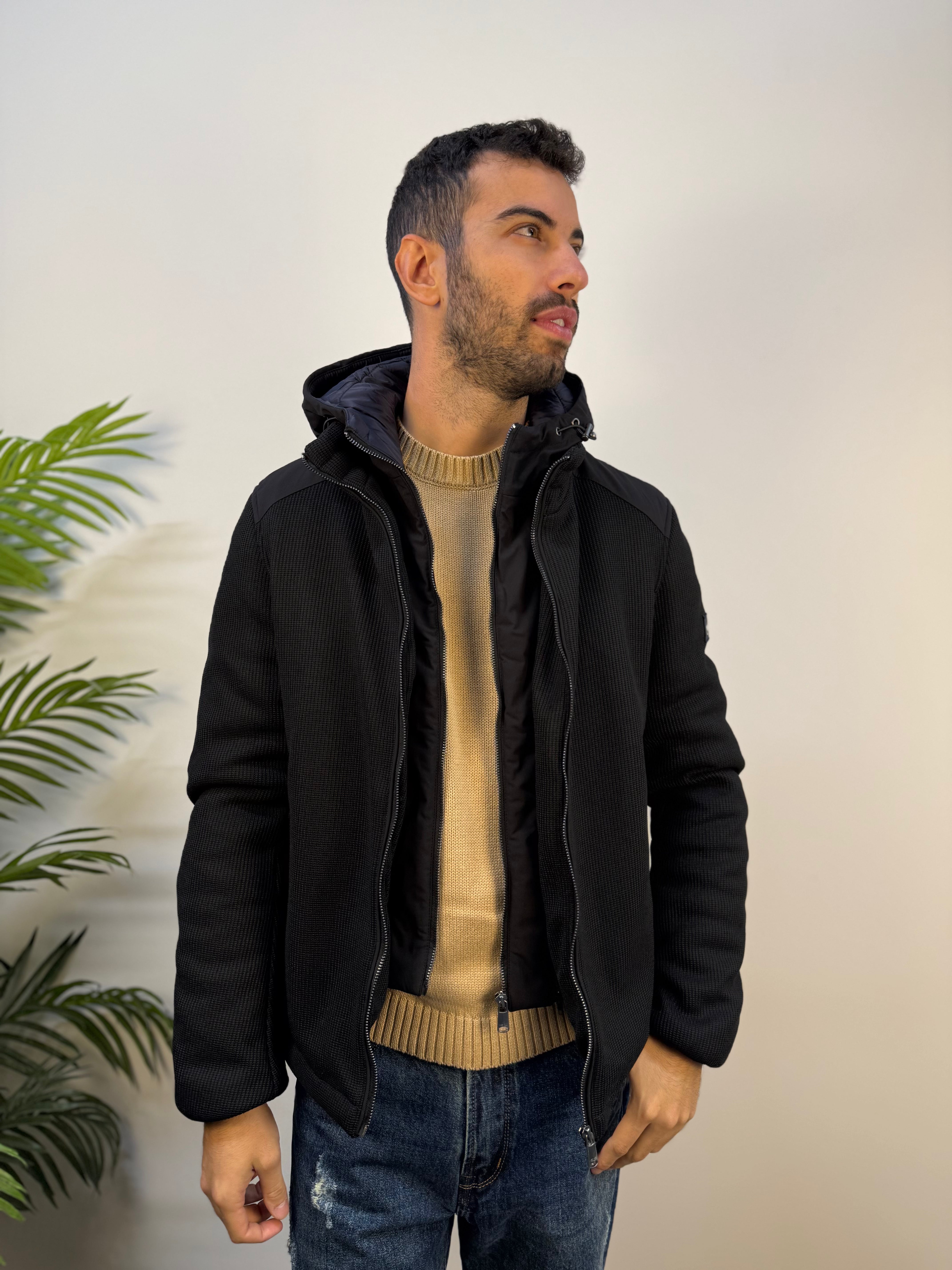 Giubbotto Yes-Zee con esterno in trama a maglia e interno imbottito, pensato per offrire calore e comfort. Dotato di antivento e cappuccio removibili tramite zip, è completato da tasche frontali con zip color argento e chiusura centrale con zip. Un capo pratico e versatile, perfetto per affrontare la stagione fredda con stile.