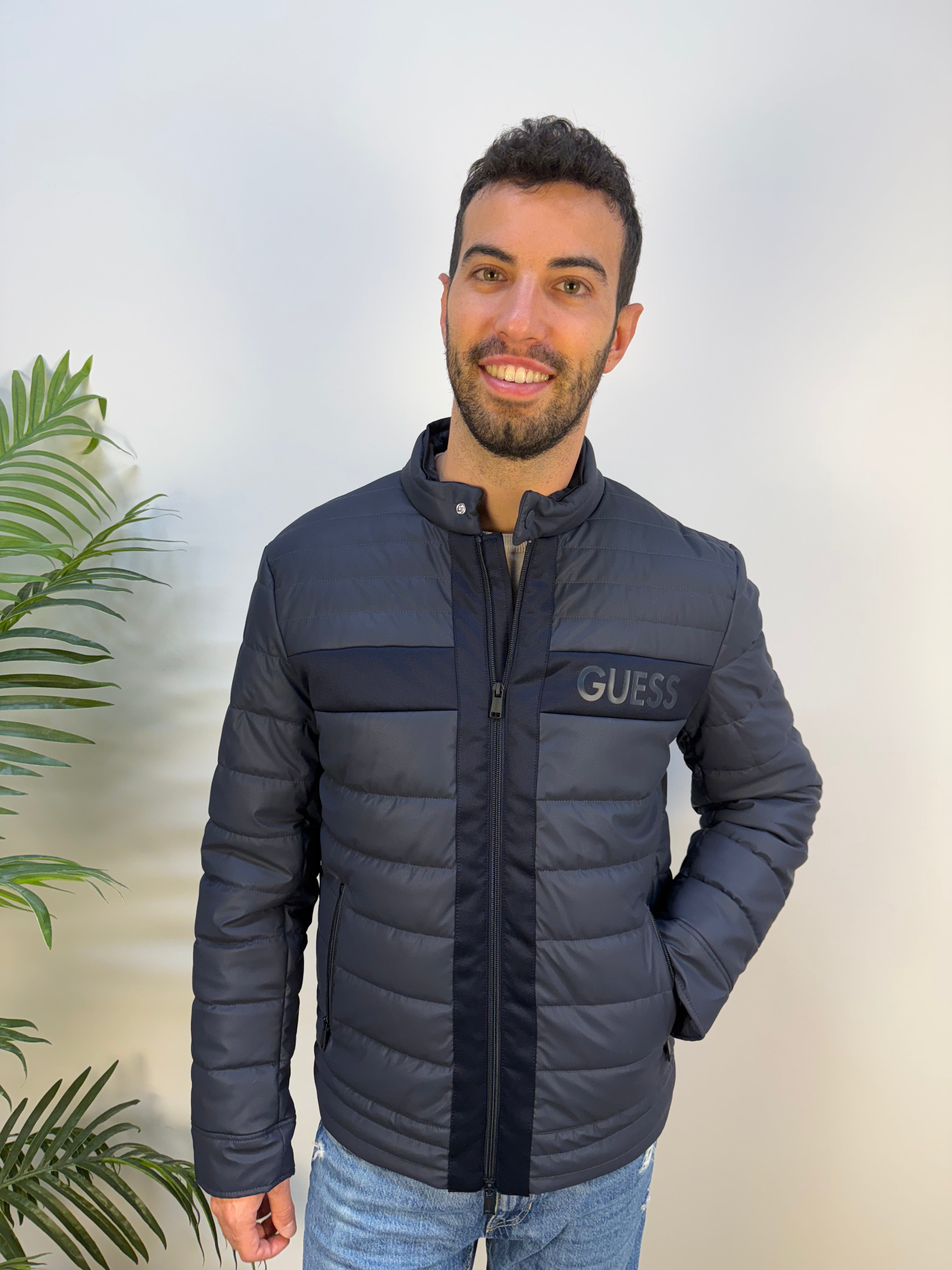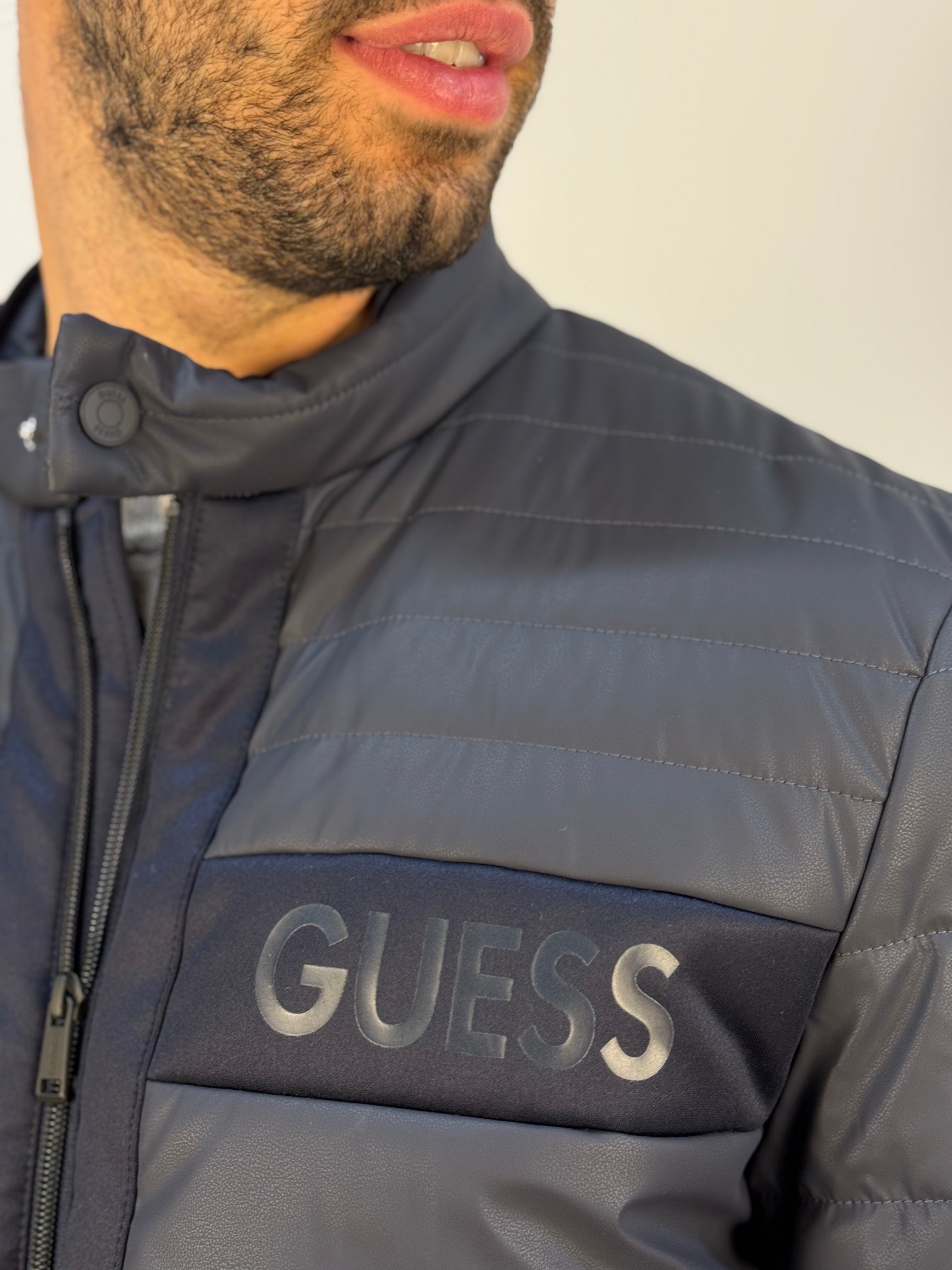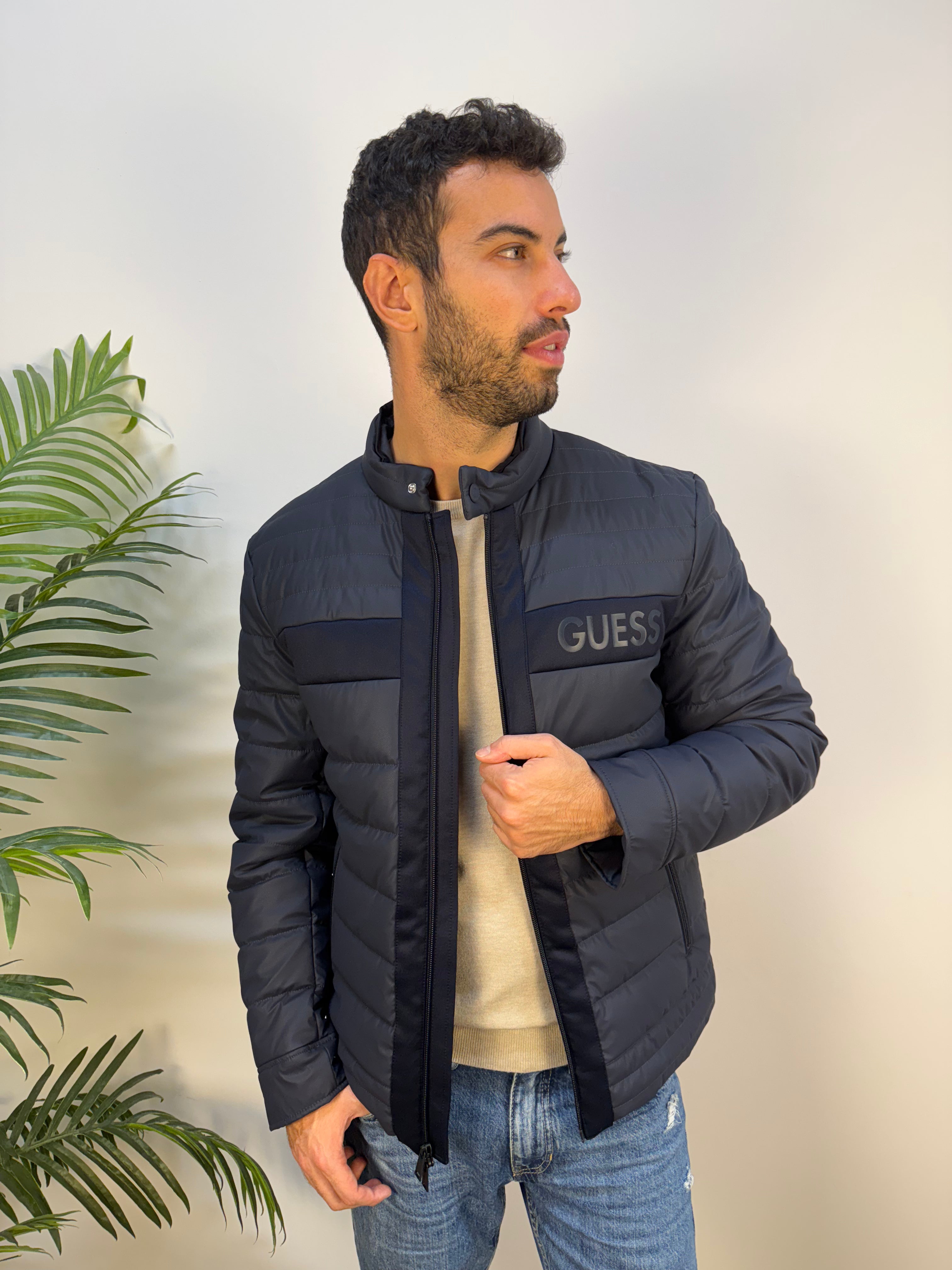 Giubbotto Guess dal design elegante e raffinato, proposto in un sofisticato color navy. Realizzato con inserti in tessuto scuba tono su tono, unisce stile e comfort in un look contemporaneo. Presenta un colletto con chiusura a bottone a pressione, zip frontale e un logo gommato sul cuore, dettaglio discreto ma distintivo. Un capo versatile, perfetto per completare con classe sia outfit casual che più ricercati.