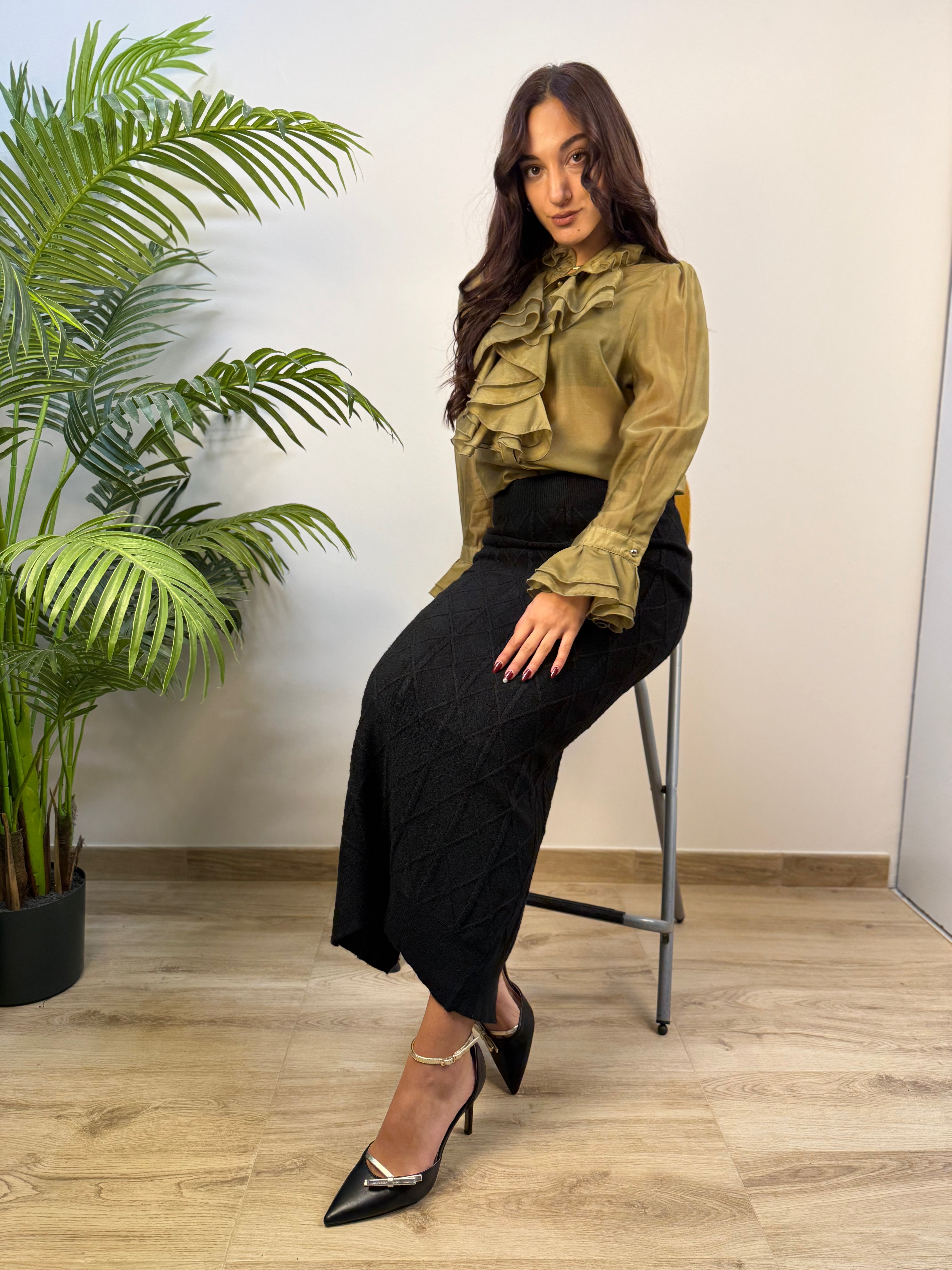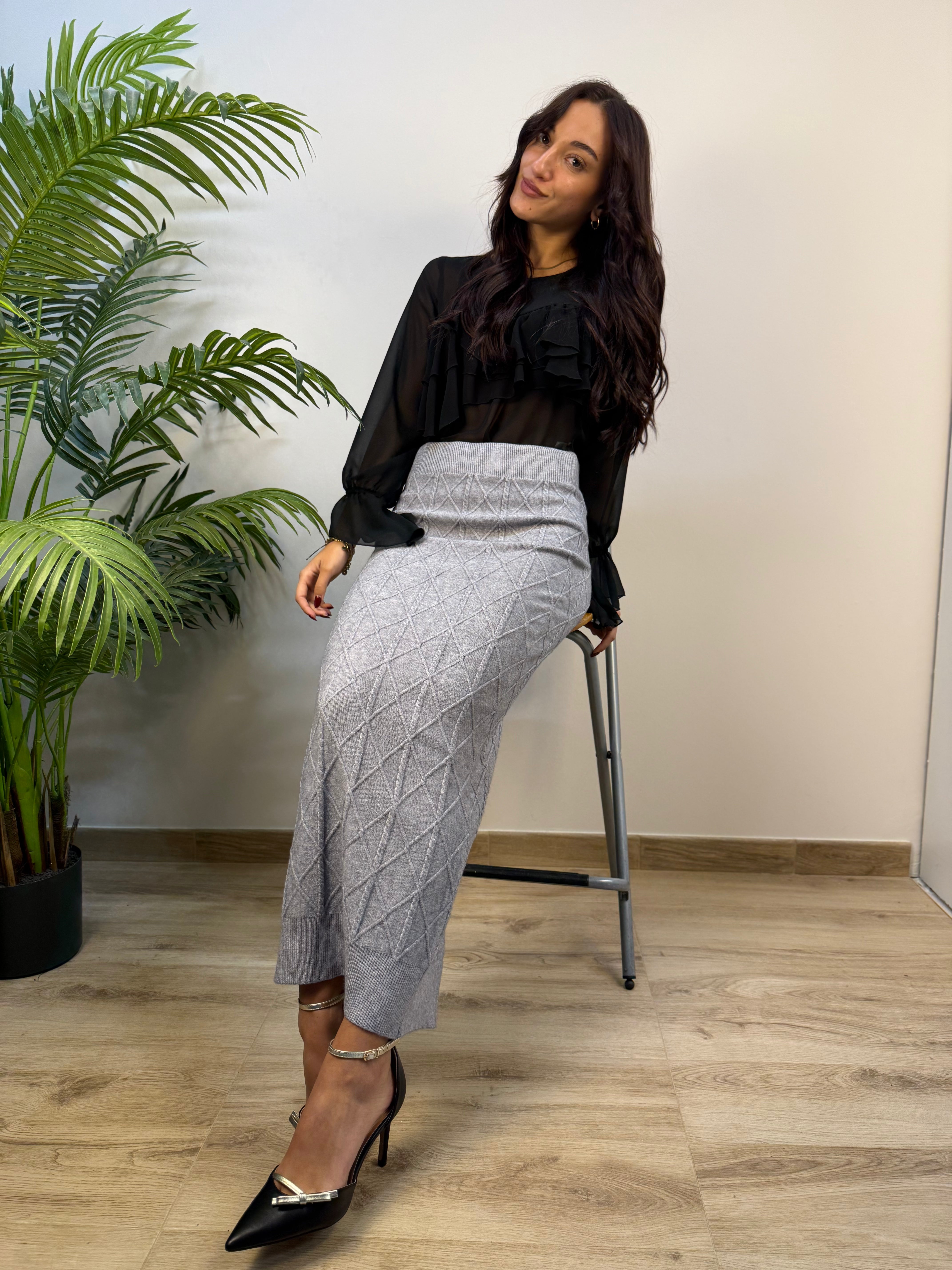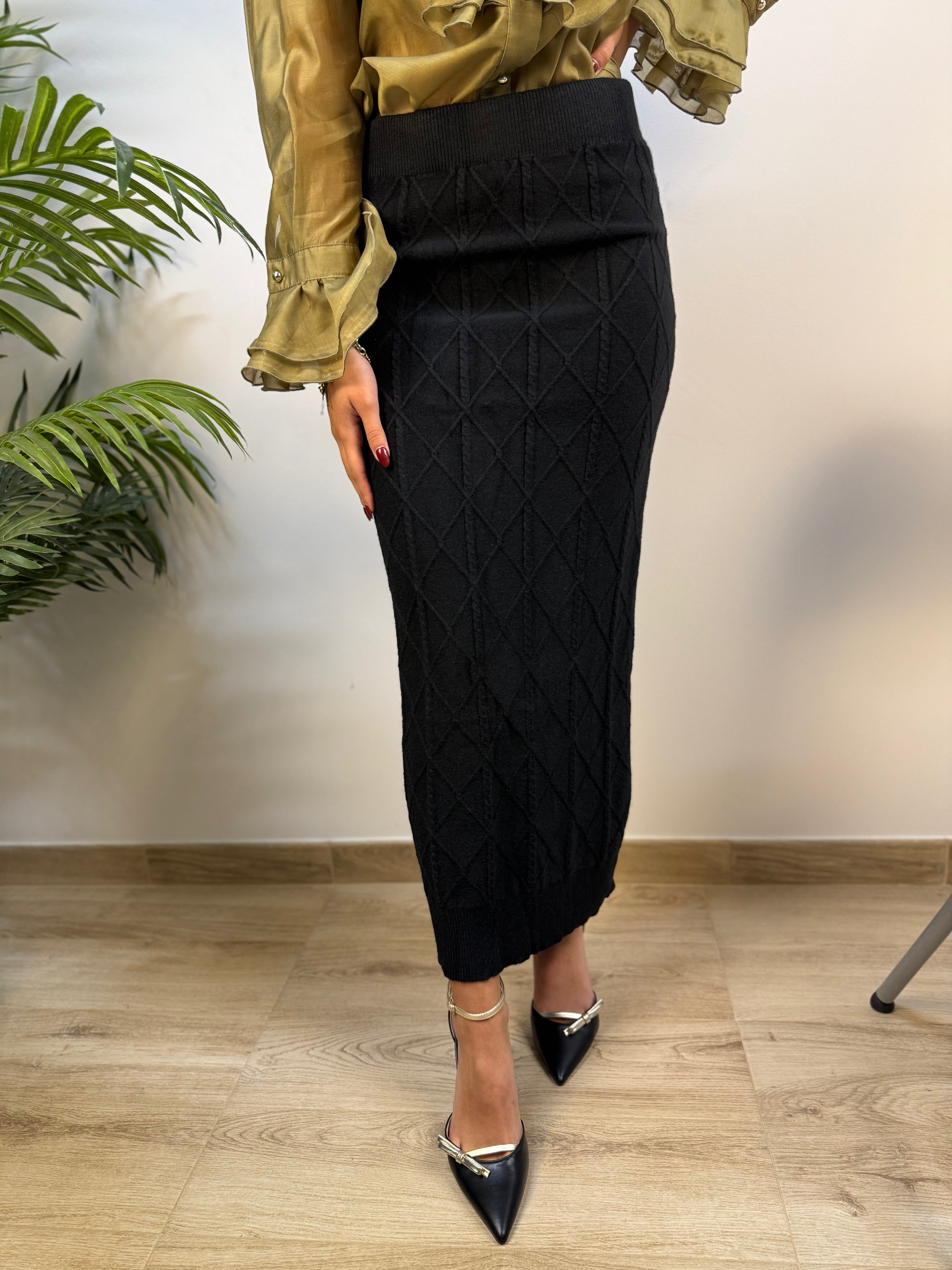 Gonna Akè in maglia lavorata con raffinata trama a rombi e trecce, un capo che unisce comfort e stile. Il taglio tubino, arricchito da un elegante spacco sul retro, valorizza la silhouette con un tocco romantico e femminile. Realizzata in maglia elasticizzata, calda e morbida, è perfetta per la stagione fredda. Il fascione in vita e il fondo a costine garantiscono una vestibilità comoda e aderente. Disponibile in diverse colorazioni, per adattarsi a ogni gusto e occasione.