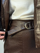 Gonna Marzia B in similpelle effetto pitonato dal fascino deciso e sofisticato. Il modello, in una raffinata tonalità cioccolato, presenta una vita alta che valorizza la silhouette e uno spacco centrale che dona movimento e femminilità. La cintura frontale con fibbia argento aggiunge un dettaglio luminoso e di carattere, mentre la zip invisibile sul retro garantisce una chiusura pulita e discreta. Completano il design comode tasche laterali, perfette per un tocco di praticità senza rinunciare allo stile.