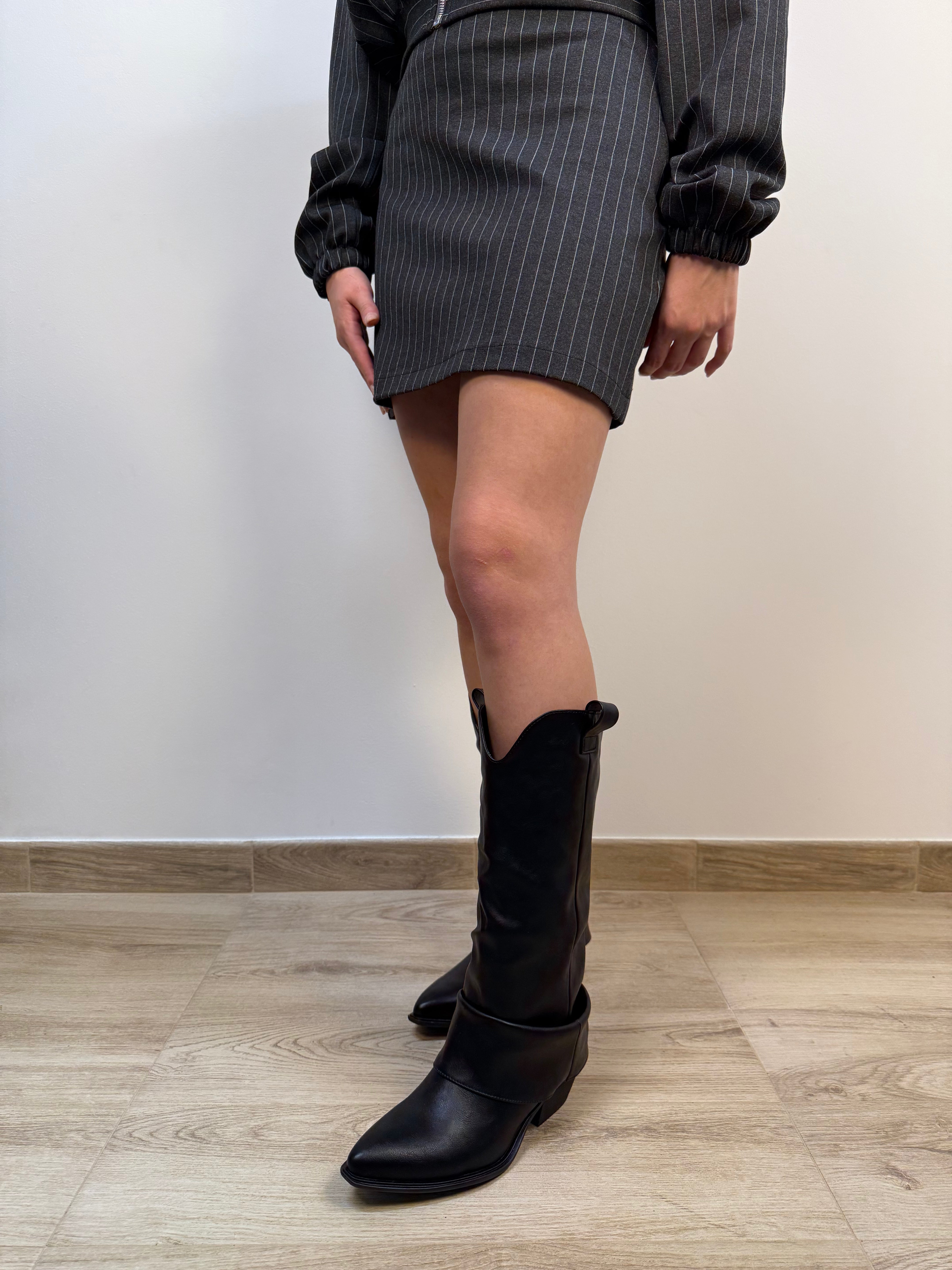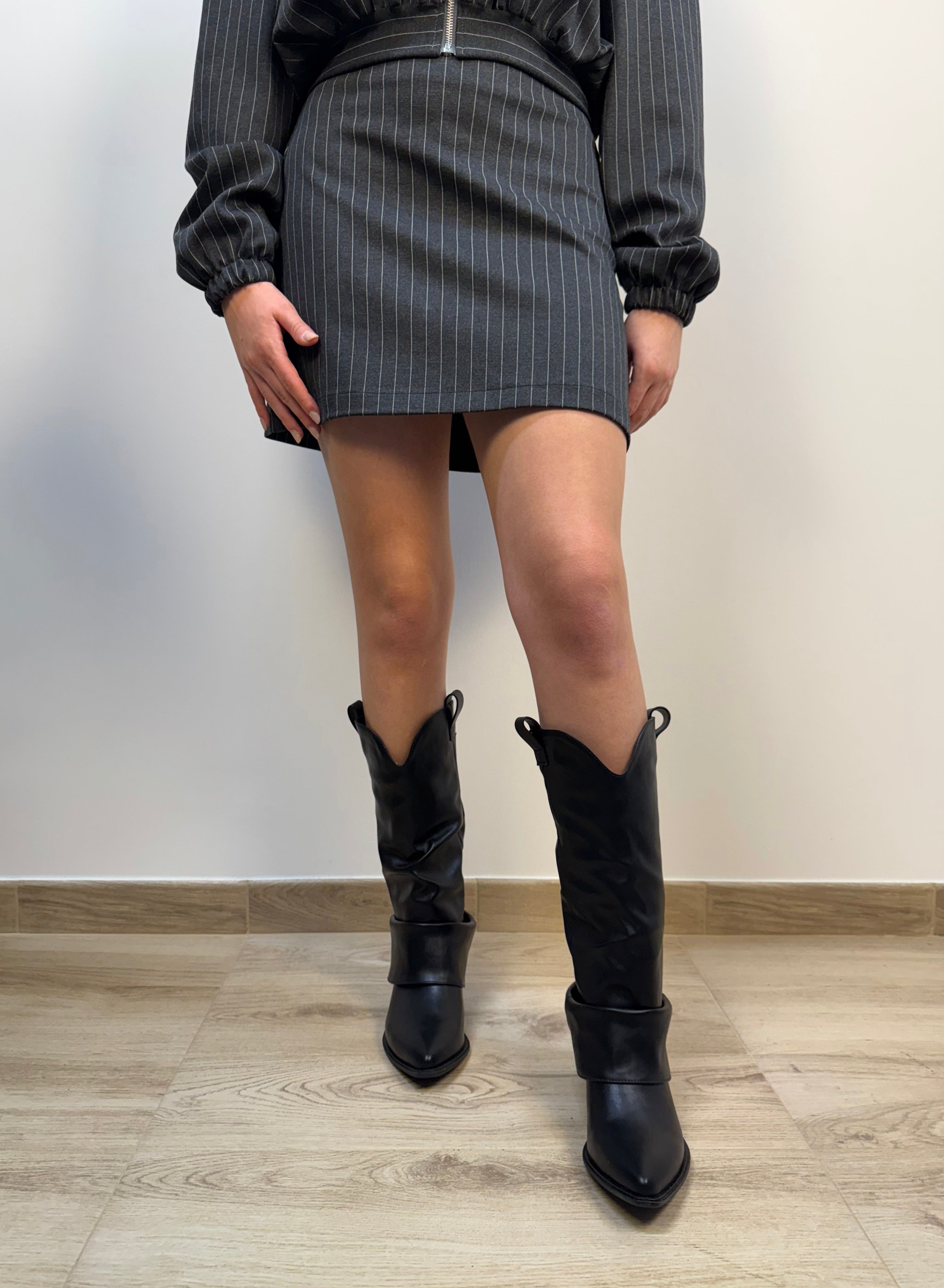 Gonna Akè elegante e versatile realizzata in tessuto caldo ed elasticizzato, che garantisce comfort e libertà di movimento. La trama gessata in tonalità grigio scuro conferisce un look sofisticato e classico, perfetto per l’ufficio o occasioni formali. Il modello a vita alta valorizza la silhouette, mentre la zip laterale invisibile assicura una chiusura pratica e discreta. La morbidezza del tessuto rende la gonna confortevole da indossare anche per tutta la giornata.