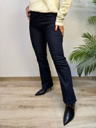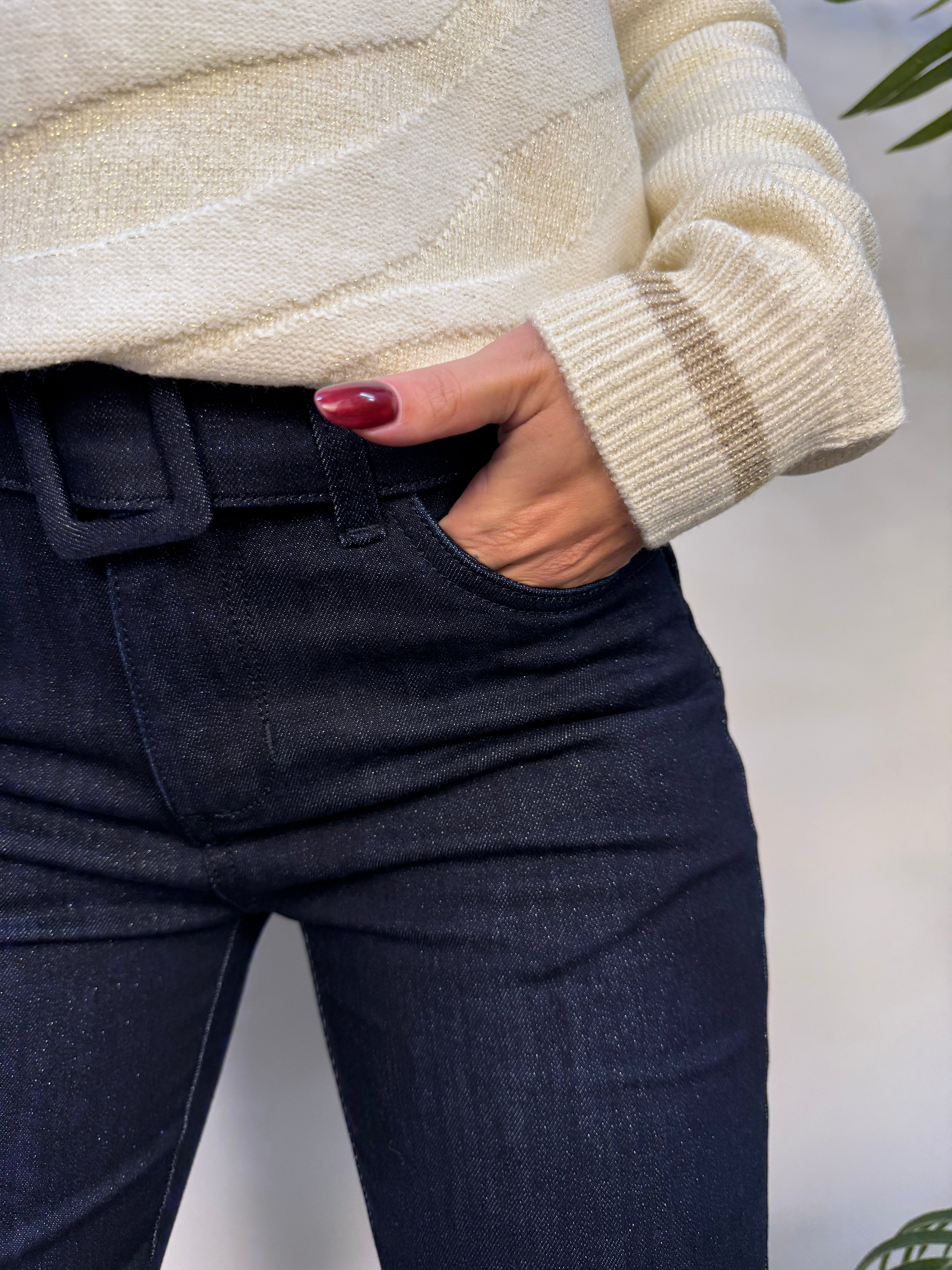 Jeans a gamba svasata con cintura tono su tono e filo lurex