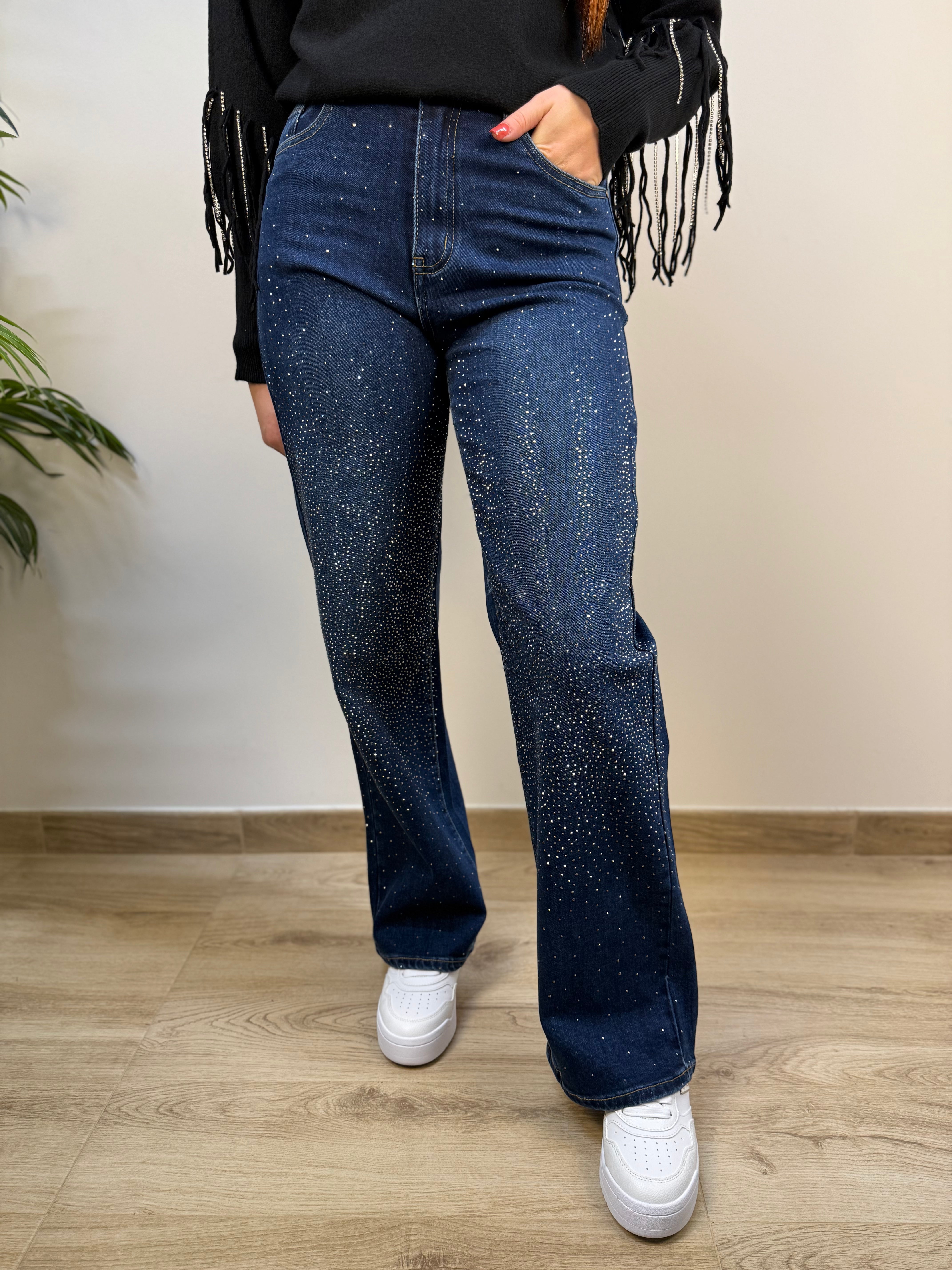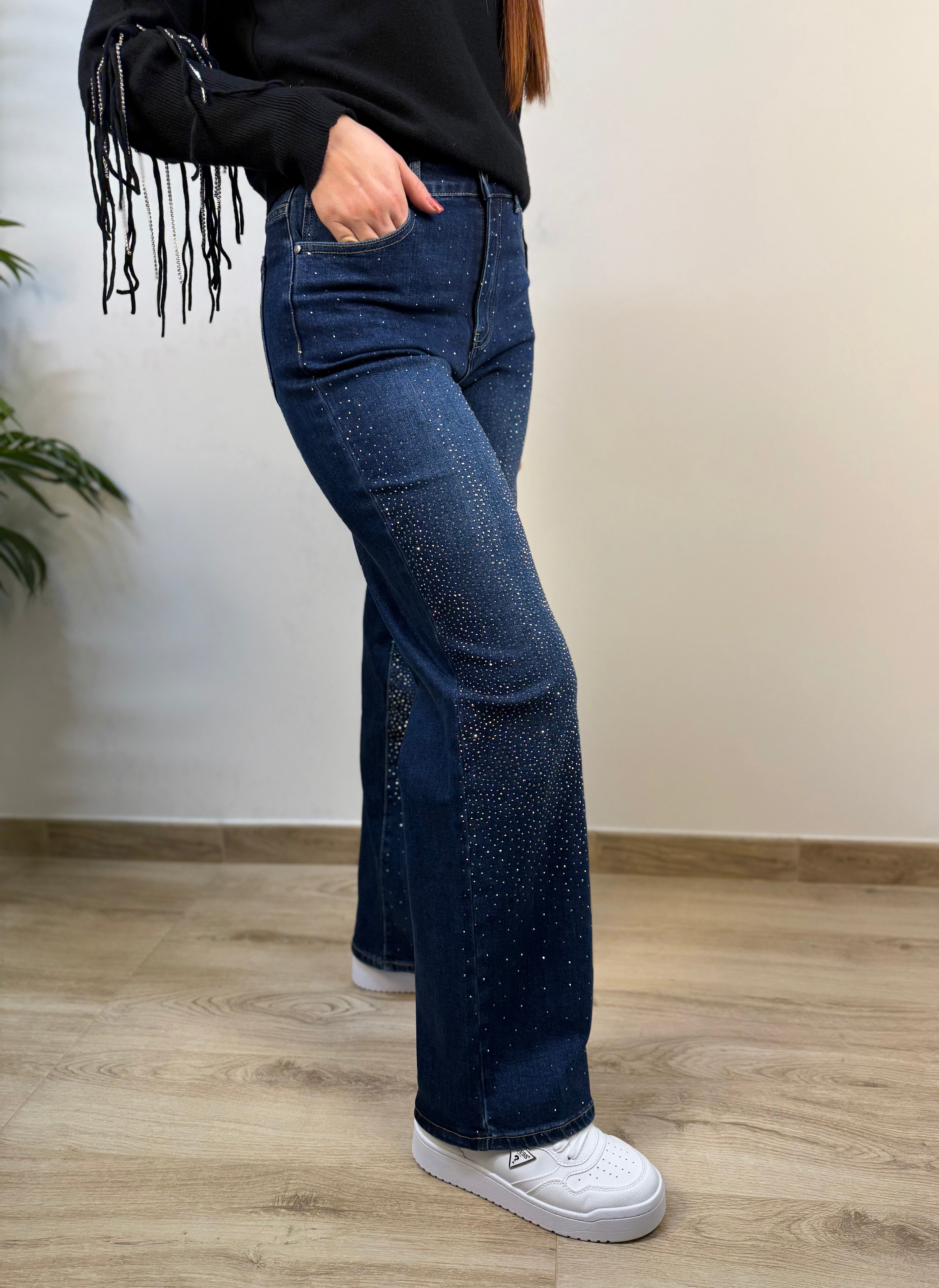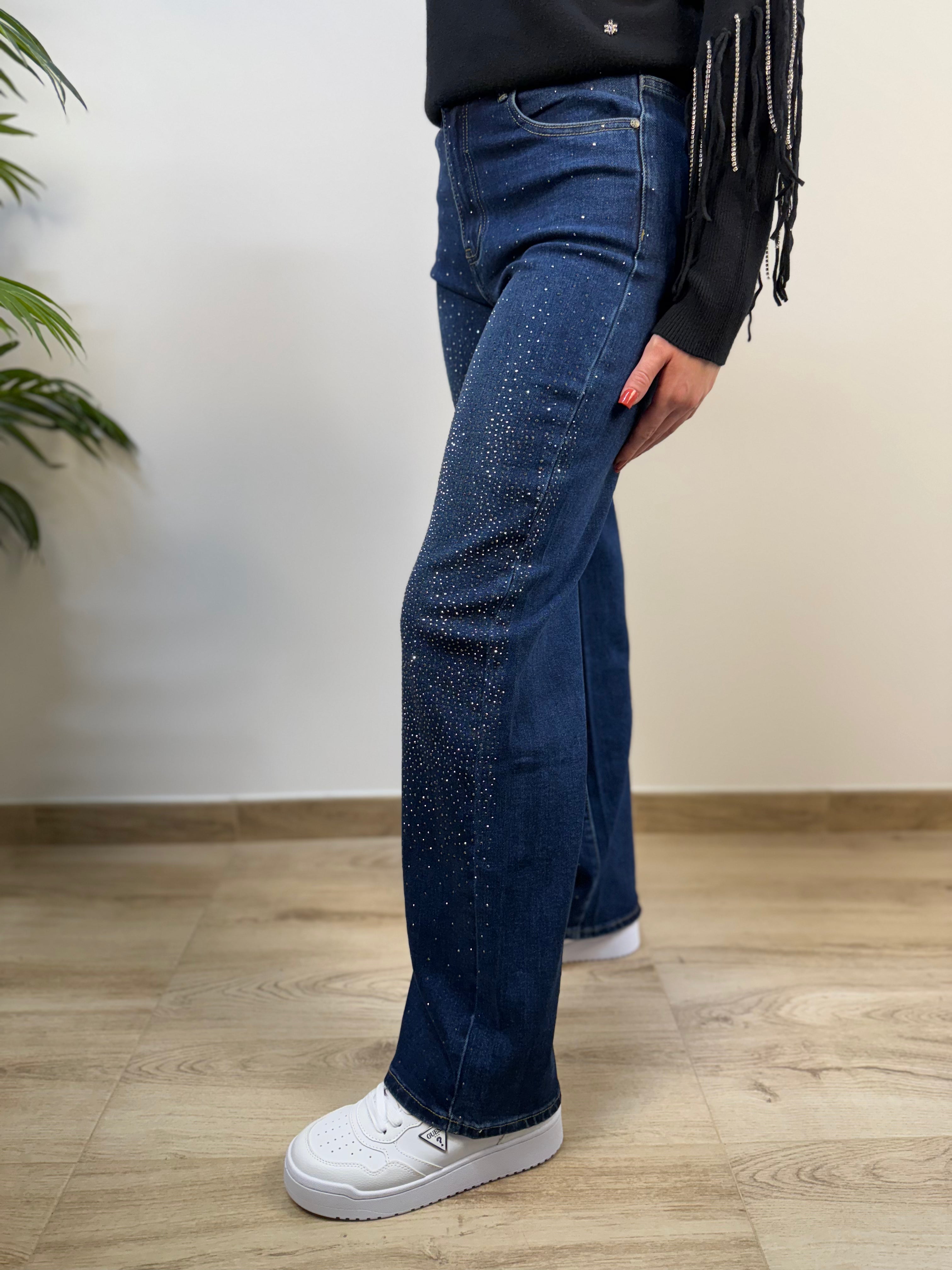 I jeans palazzino a vita alta Vantage uniscono comfort e brillantezza in un modello dal fascino contemporaneo. Realizzati in denim elasticizzato, seguono le linee del corpo con naturalezza senza rinunciare alla libertà di movimento. Il taglio a 5 tasche richiama lo stile classico del jeans, mentre la gamba dritta slancia la figura donando un look pulito e versatile. A impreziosire il design, una pioggia di strass sulla parte frontale, che illumina il capo e aggiunge un tocco glamour perfetto per distinguersi con stile, sia di giorno che di sera.