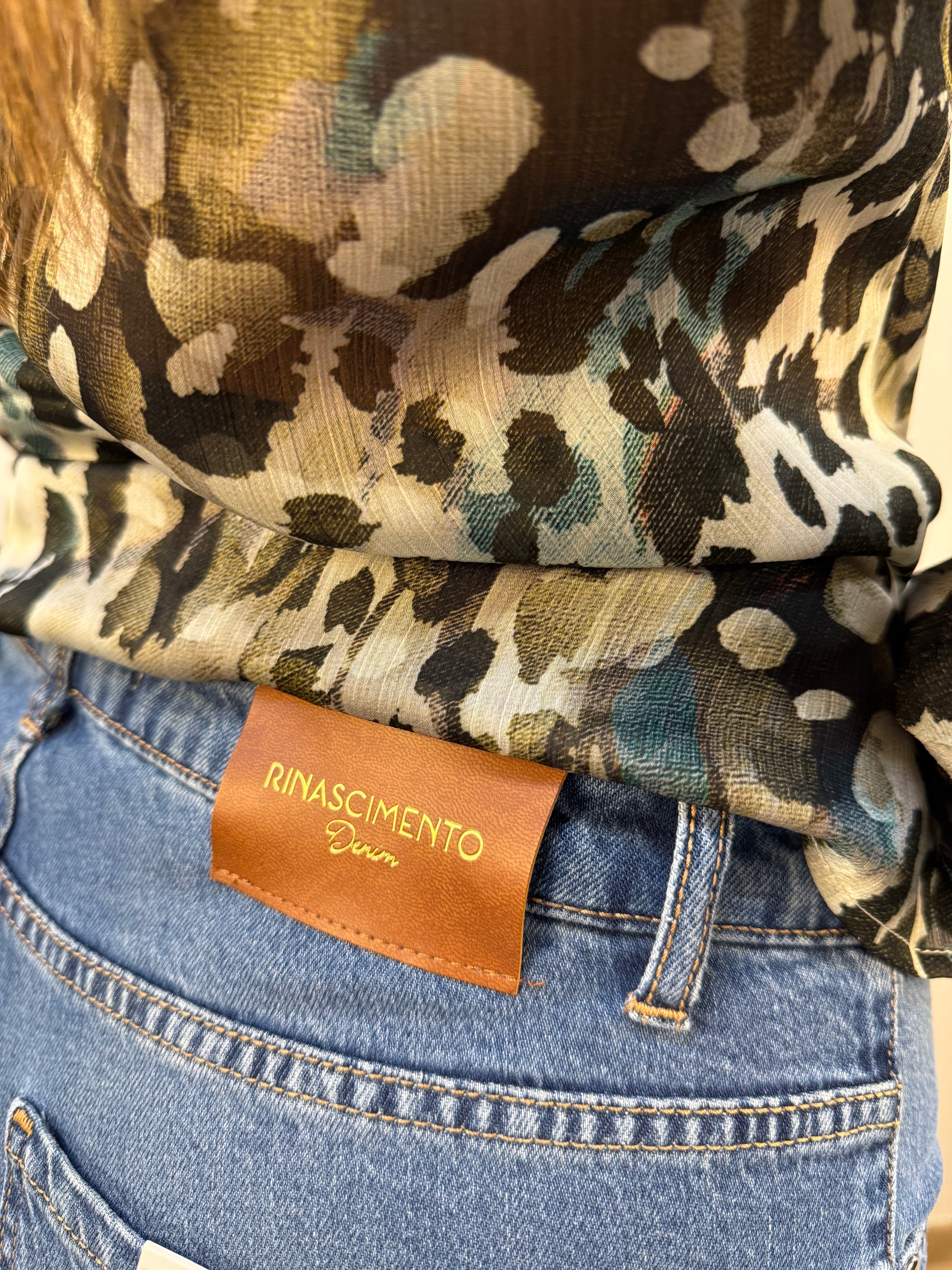 Jeans Rinascimento modello straight in denim, con classico design a 5 tasche. La linea dritta della gamba è valorizzata da un effetto piega centrale che dona un tocco ordinato e sofisticato. Chiusura frontale con zip e bottone in metallo argentato, in tono con i dettagli delle tasche e con la piccola "R" applicata sulla tasca posteriore, simbolo distintivo del marchio. Un capo essenziale ma curato nei dettagli, perfetto per un look versatile.