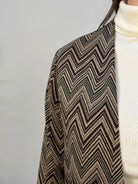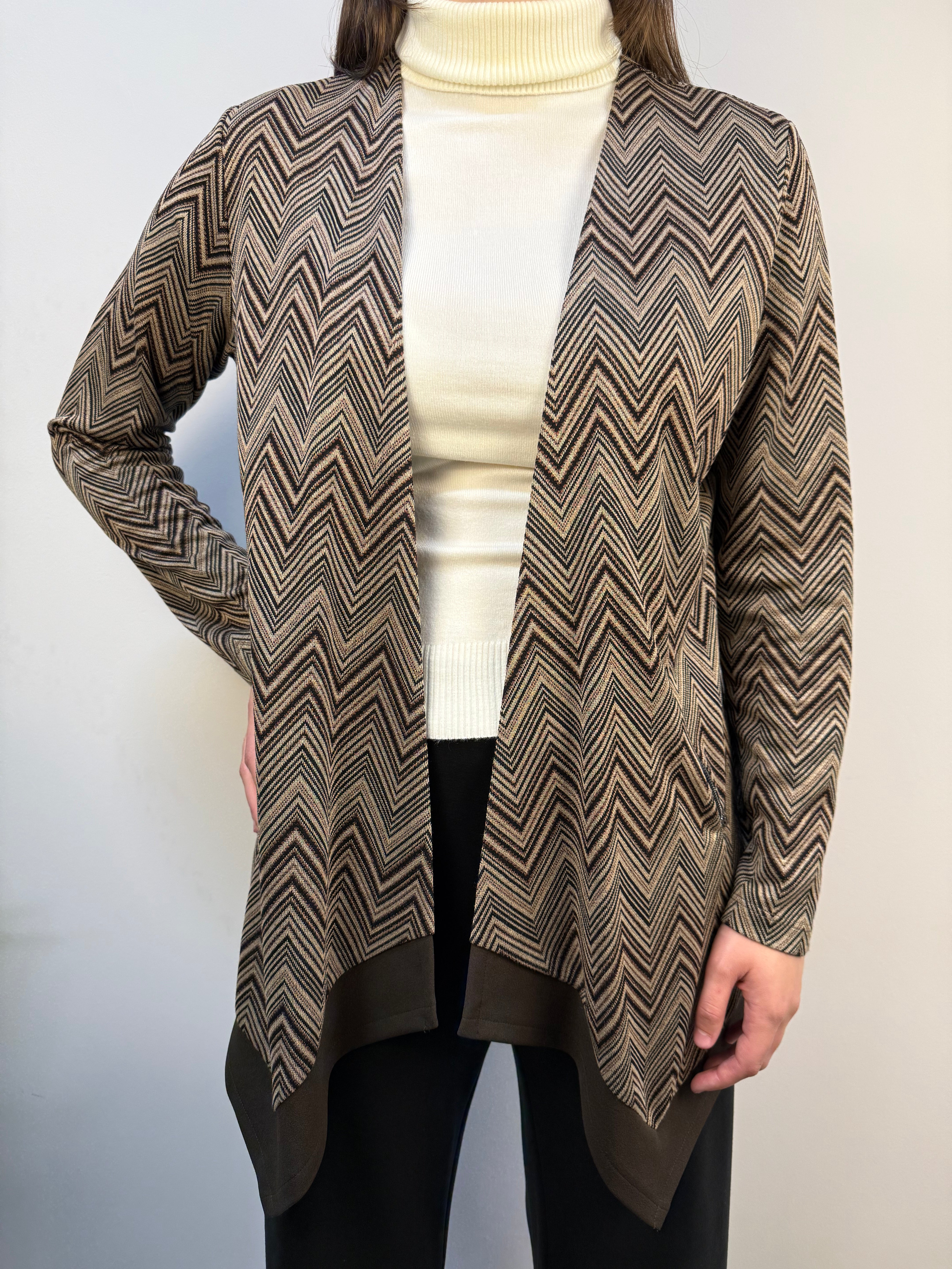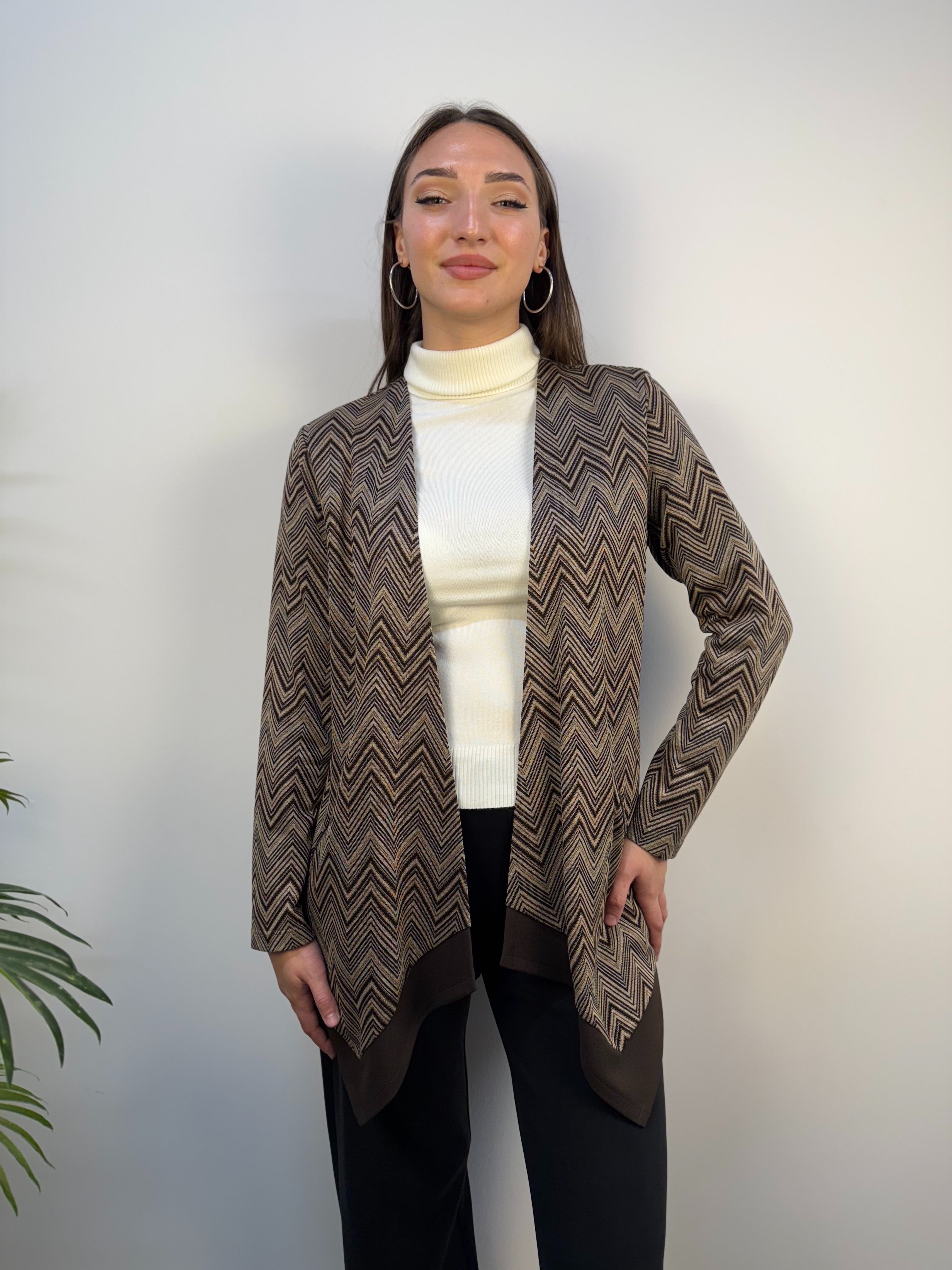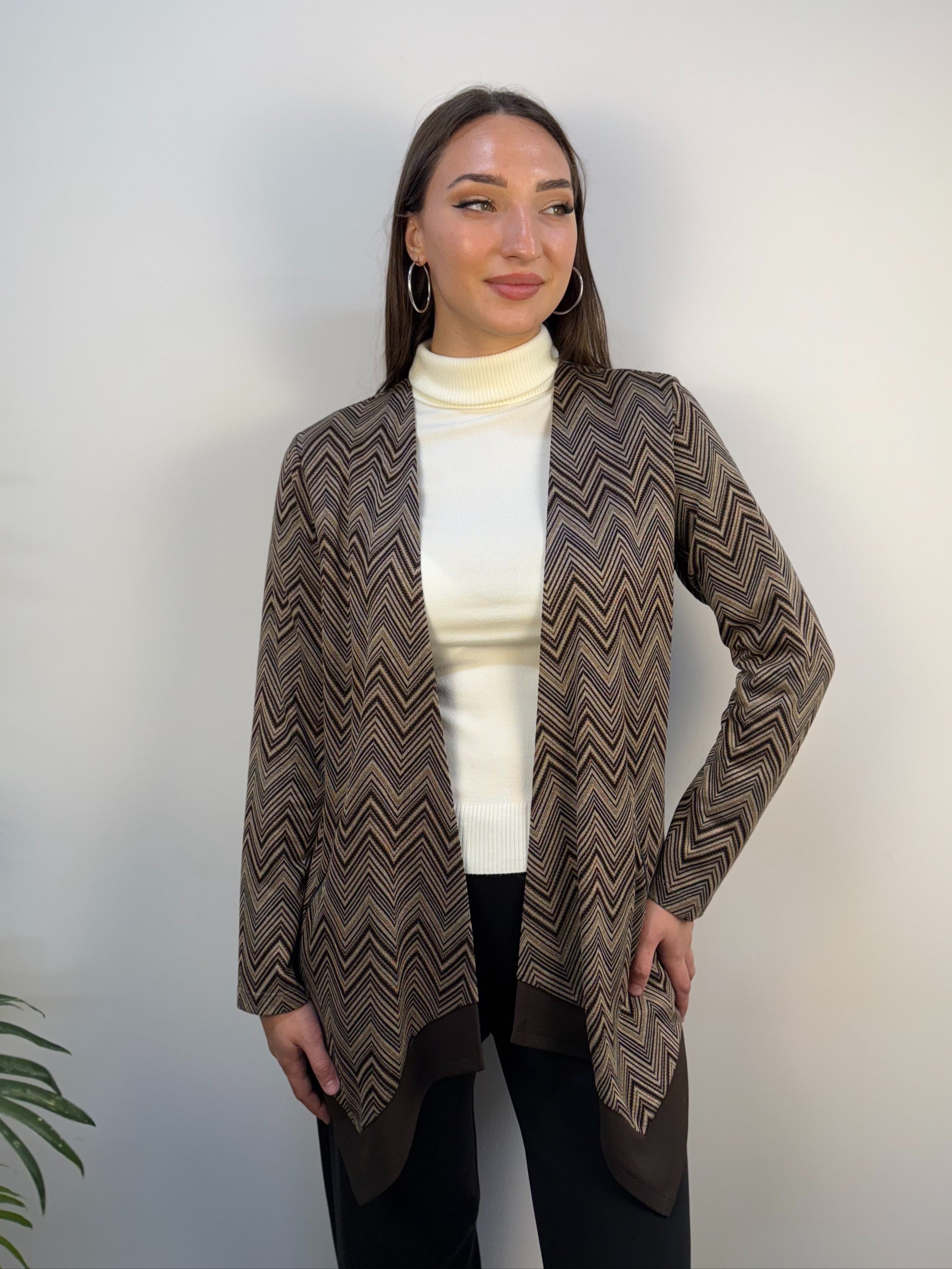 Cardigan Clarin Shavien aperto dal design raffinato e avvolgente, caratterizzato da una fantasia a righe nei toni caldi del nero e del cioccolato. Realizzato in un filato morbido e delicato, offre una piacevole sensazione di comfort. Il modello è impreziosito da fili lurex che donano un tocco luminoso e sofisticato, mentre le due tasche frontali con chiusura zip aggiungono praticità e modernità. Un capo versatile e chic, perfetto per completare con stile i look di ogni giorno.