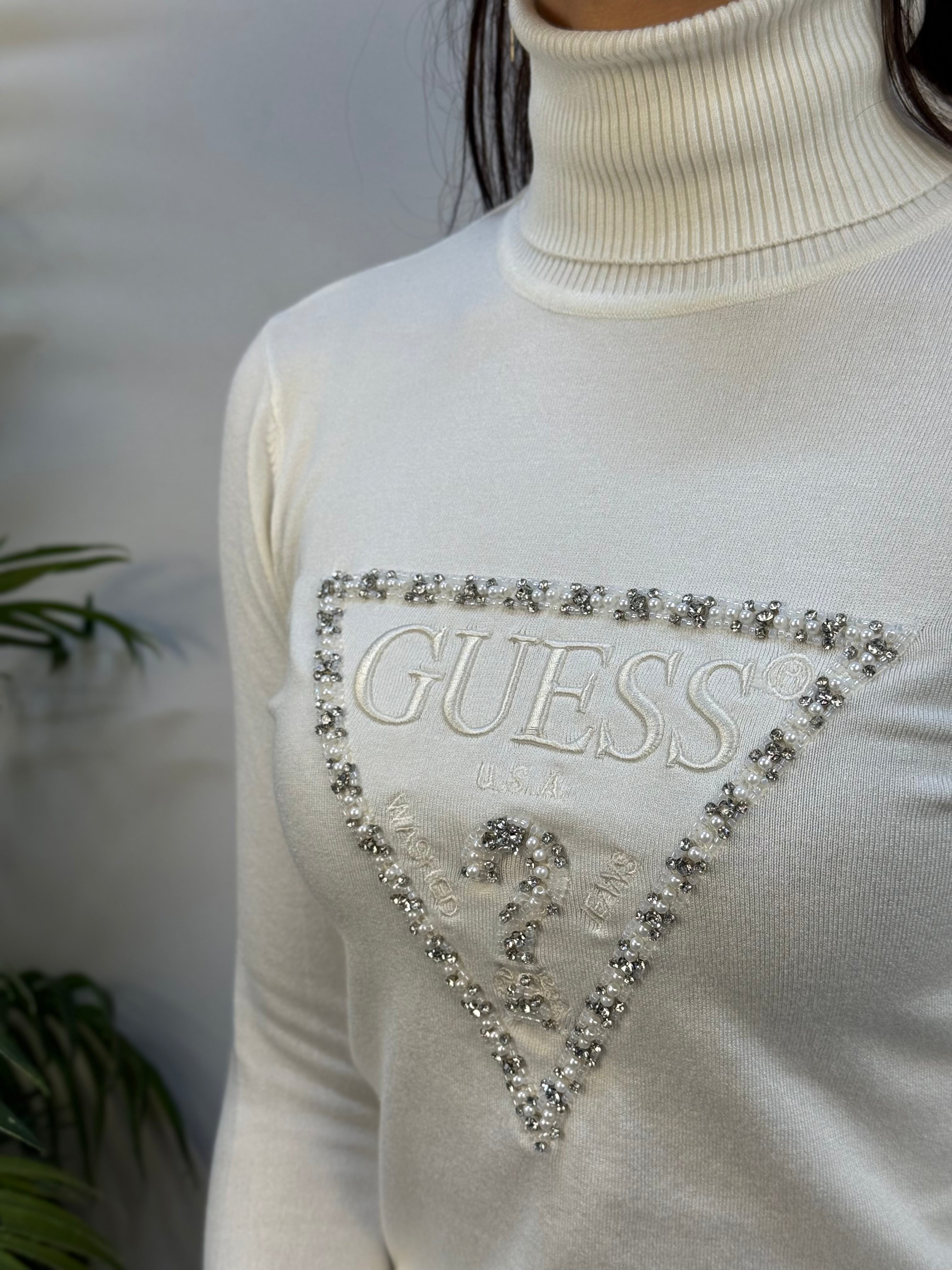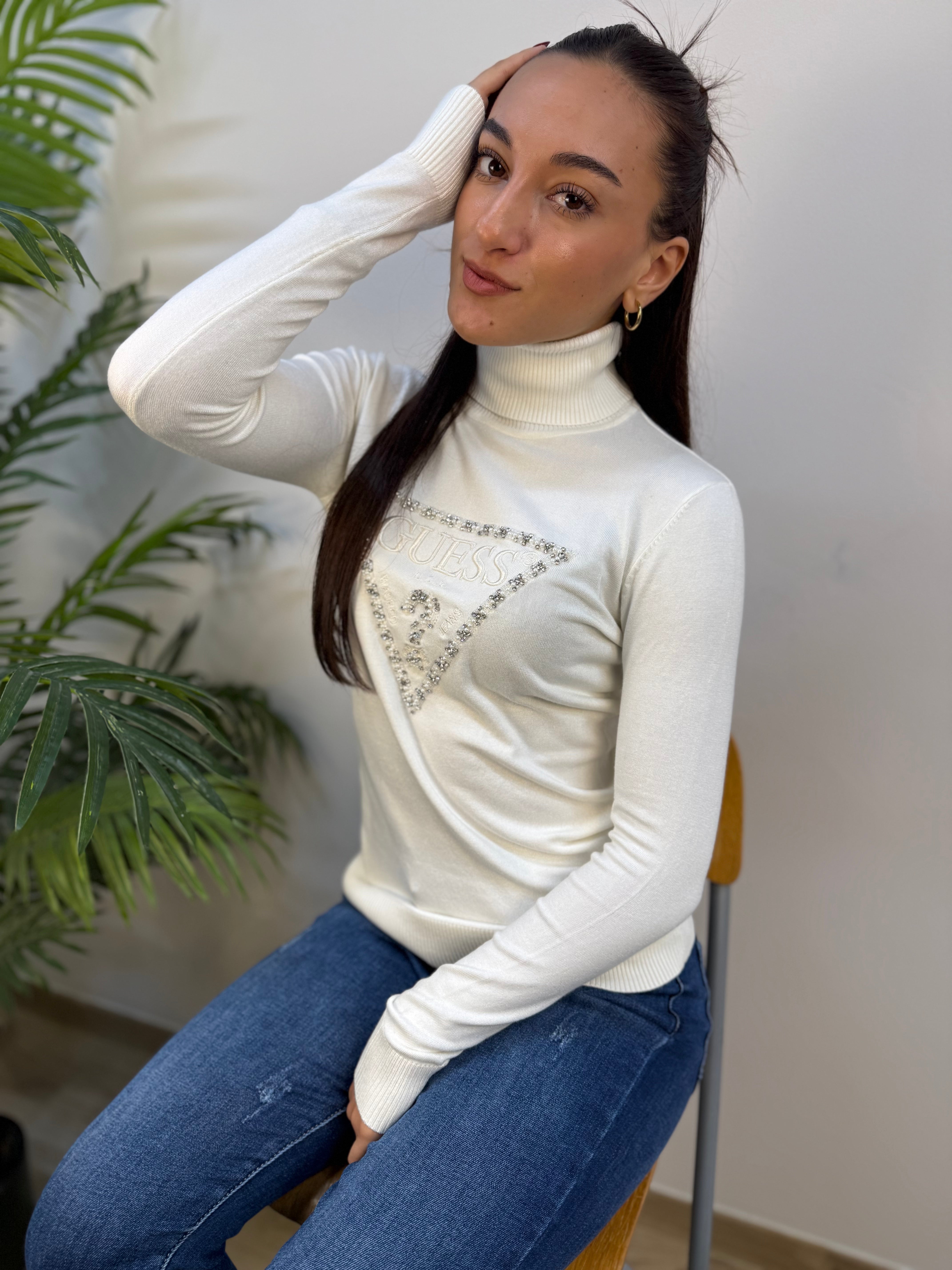 Dolcevita Guess realizzato in morbida viscosa elasticizzata, un tessuto caldo e confortevole che si adatta perfettamente alle forme. Il modello si distingue per il logo frontale ricamato tono su tono, impreziosito da strass e perline coordinate, che aggiungono un tocco di raffinata luminosità. Il collo alto, insieme al fascione e ai polsini a costine, valorizza la linea del capo e garantisce una vestibilità impeccabile. Un capo elegante, versatile e femminile, perfetto per affrontare la stagione invernale con stile e comfort.