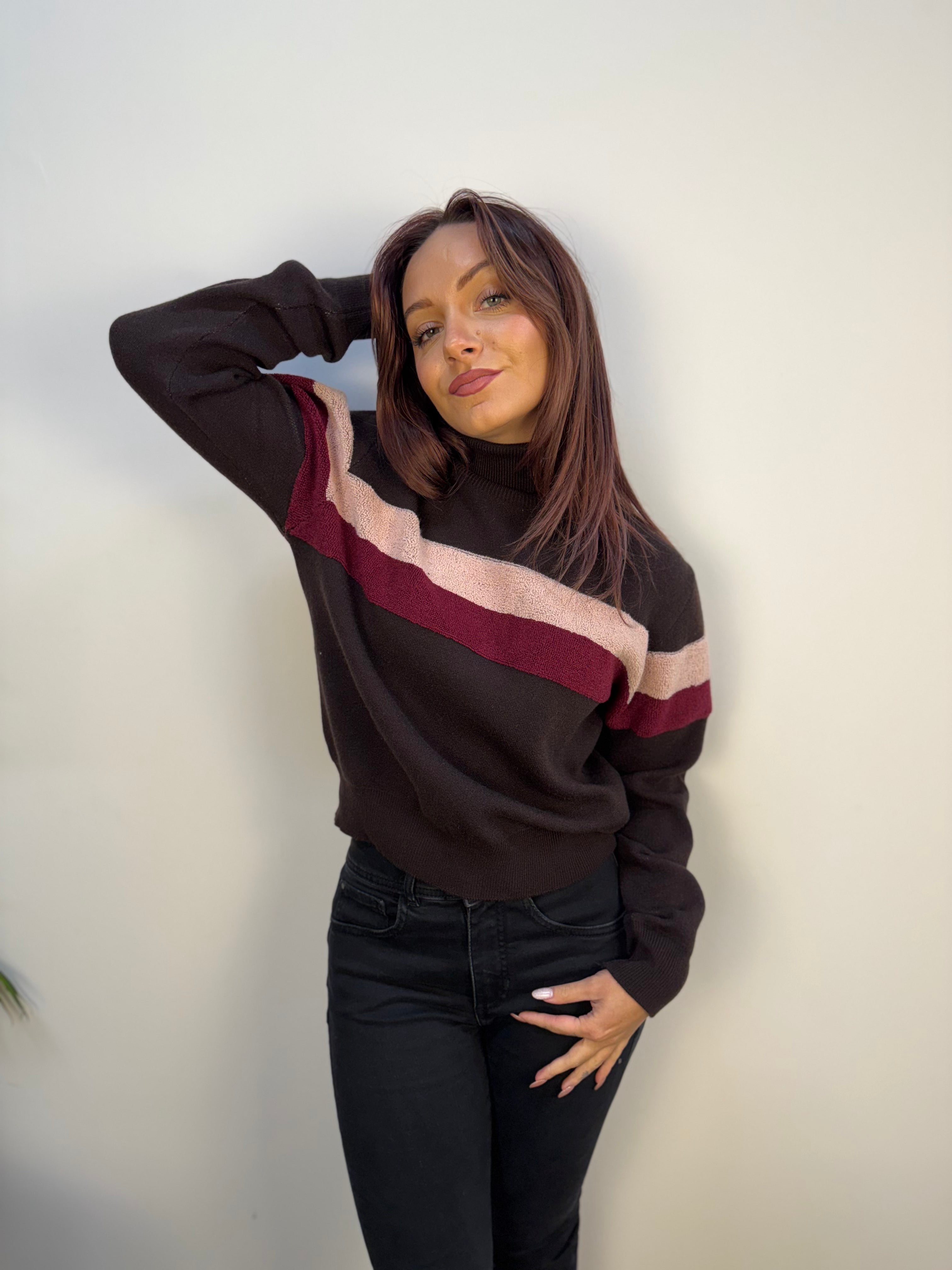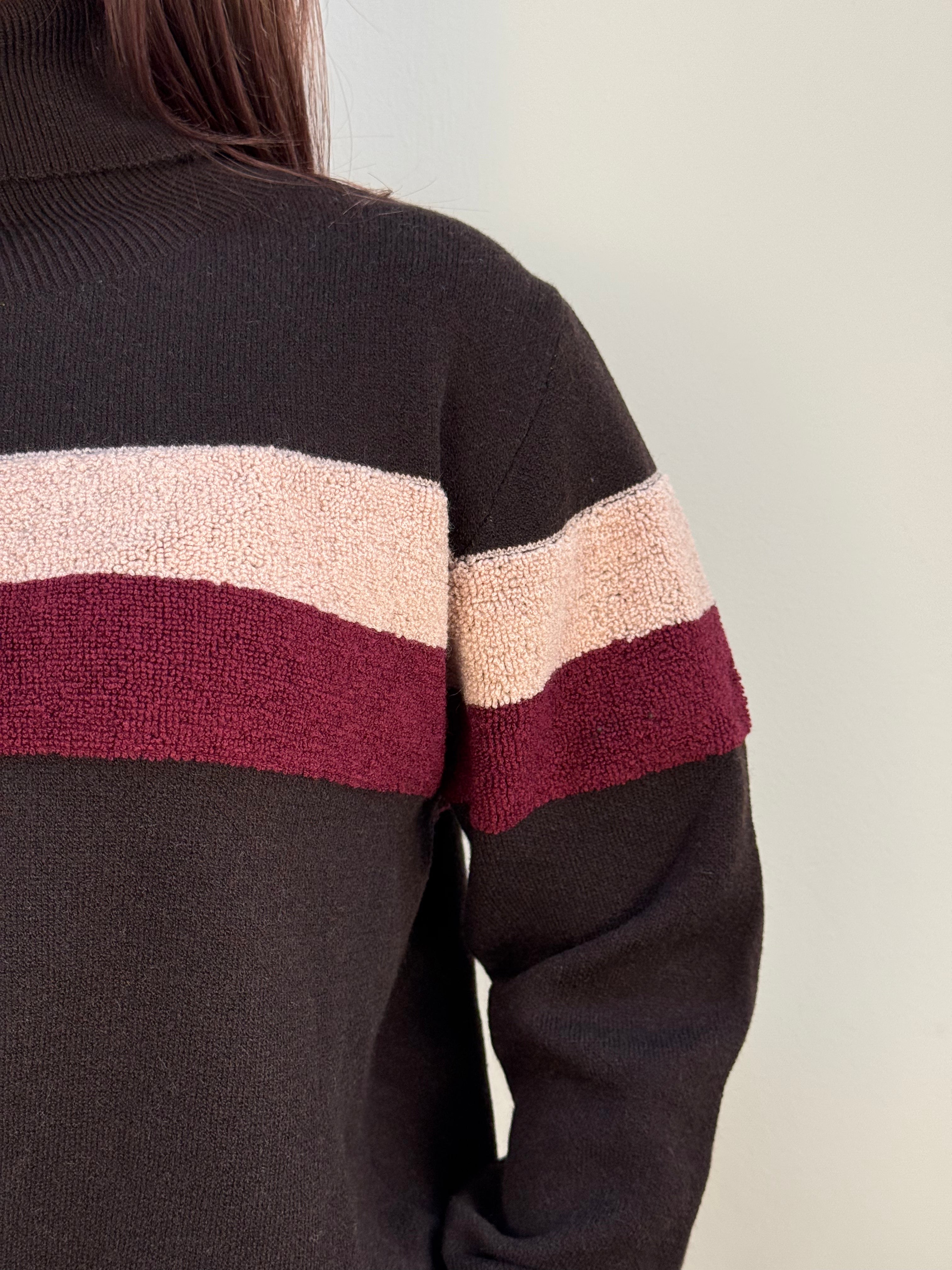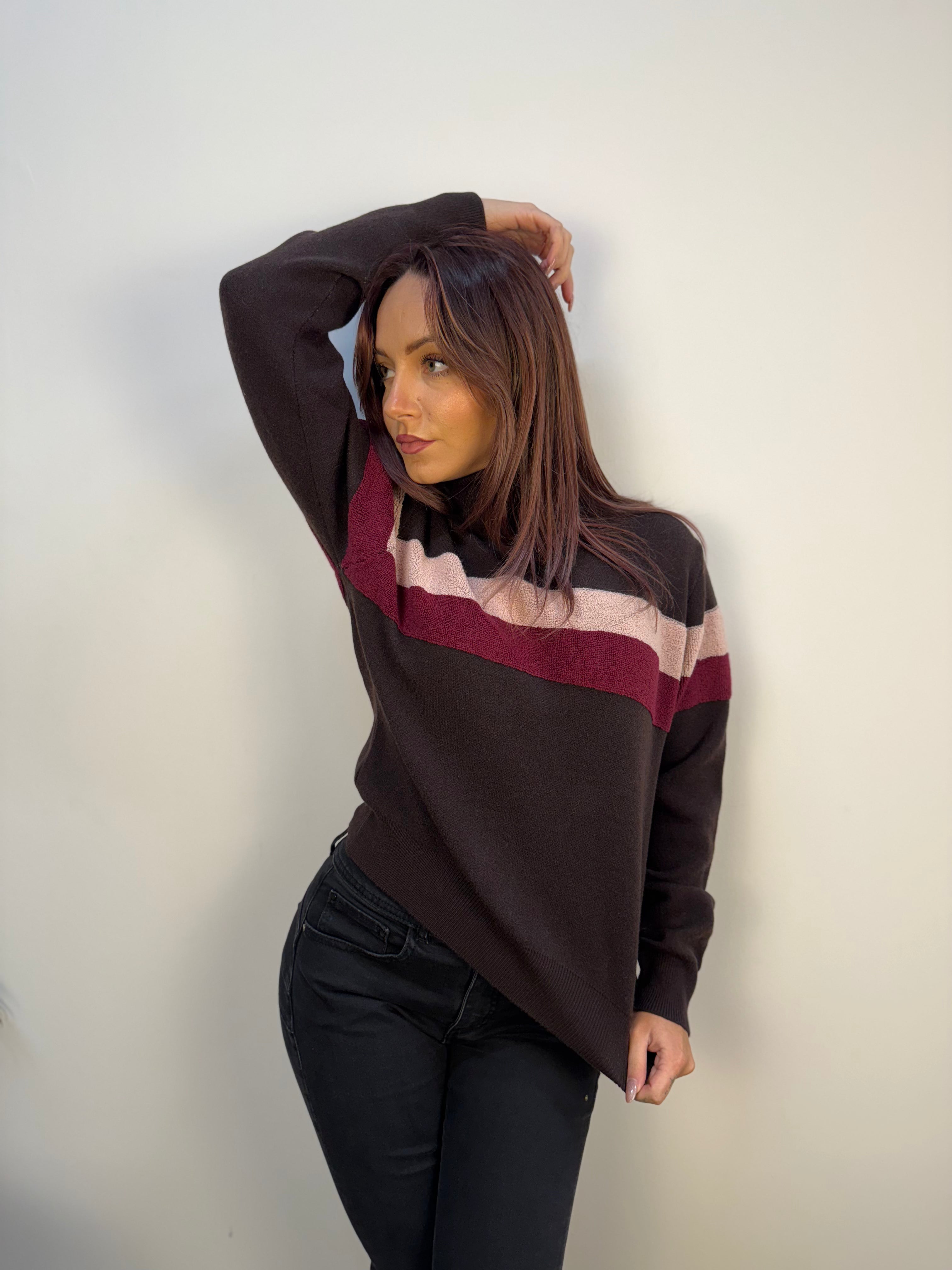 Maglia Susy Mix dal tocco morbido e confortevole, realizzata in misto viscosa con collo alto, polsini e fascione a costine. Il tessuto elasticizzato assicura comodità e vestibilità perfetta, mentre l’effetto a righe in teddy rosa e bordeaux aggiunge un tocco di stile contemporaneo e originale.
