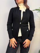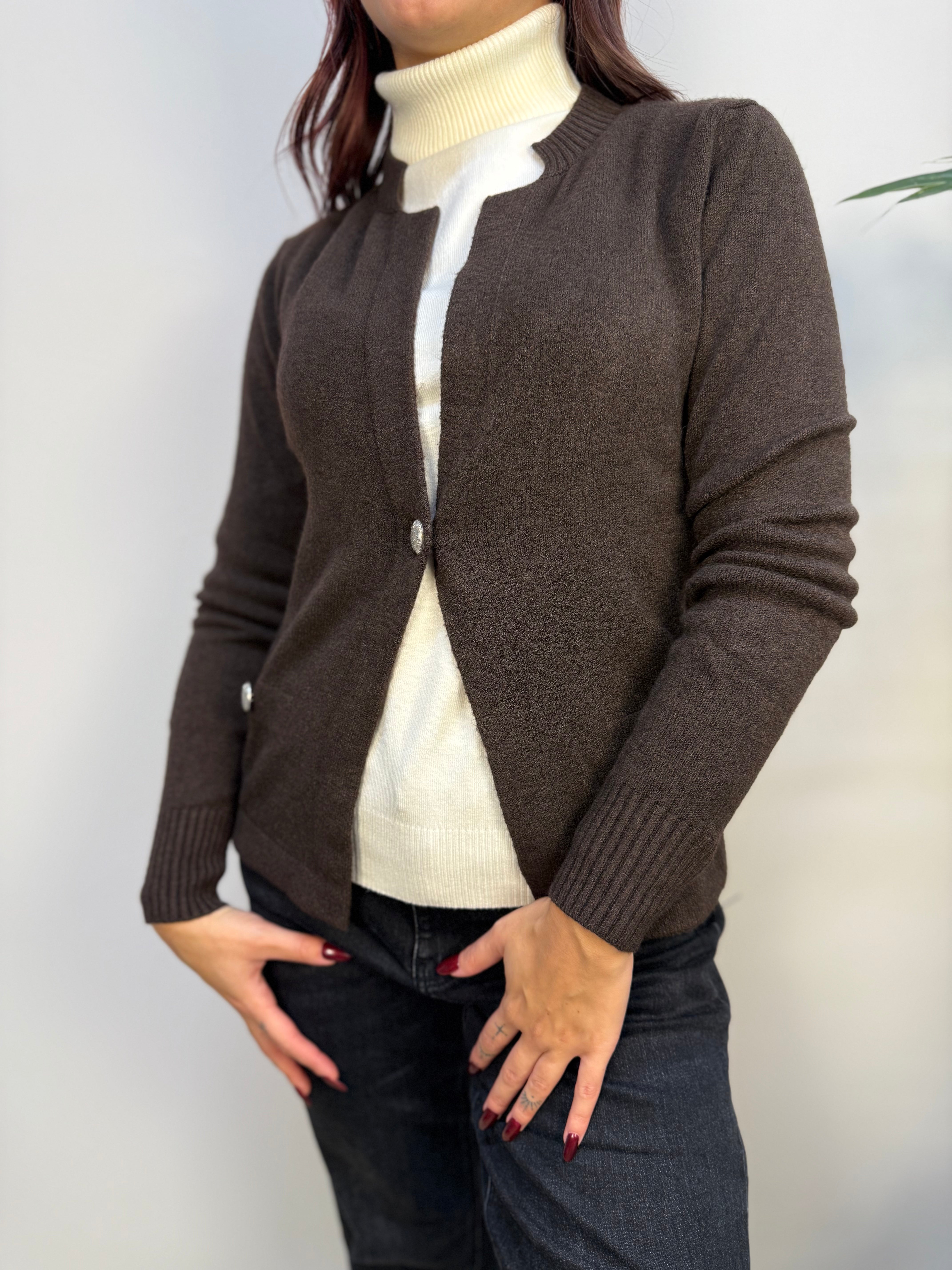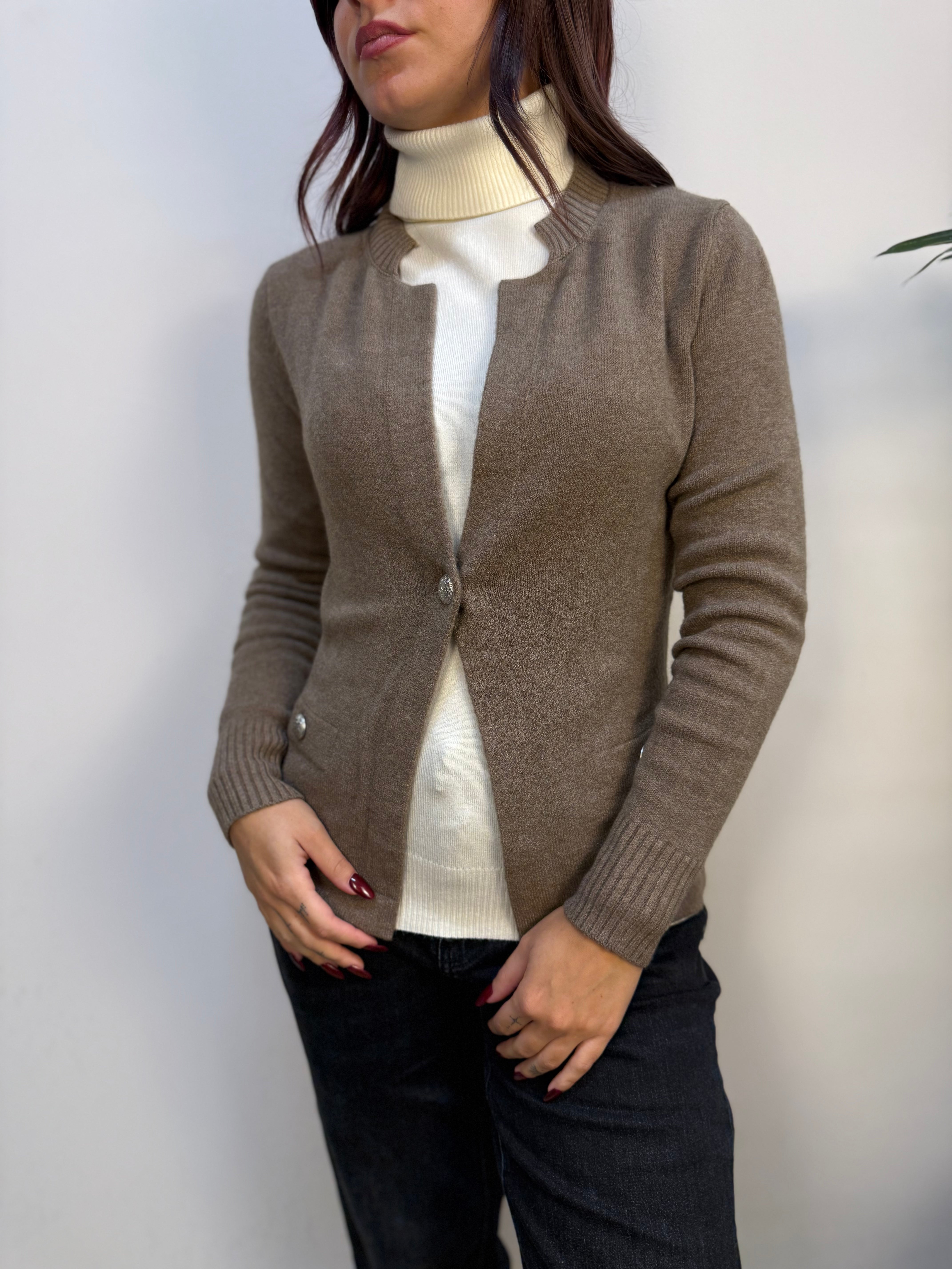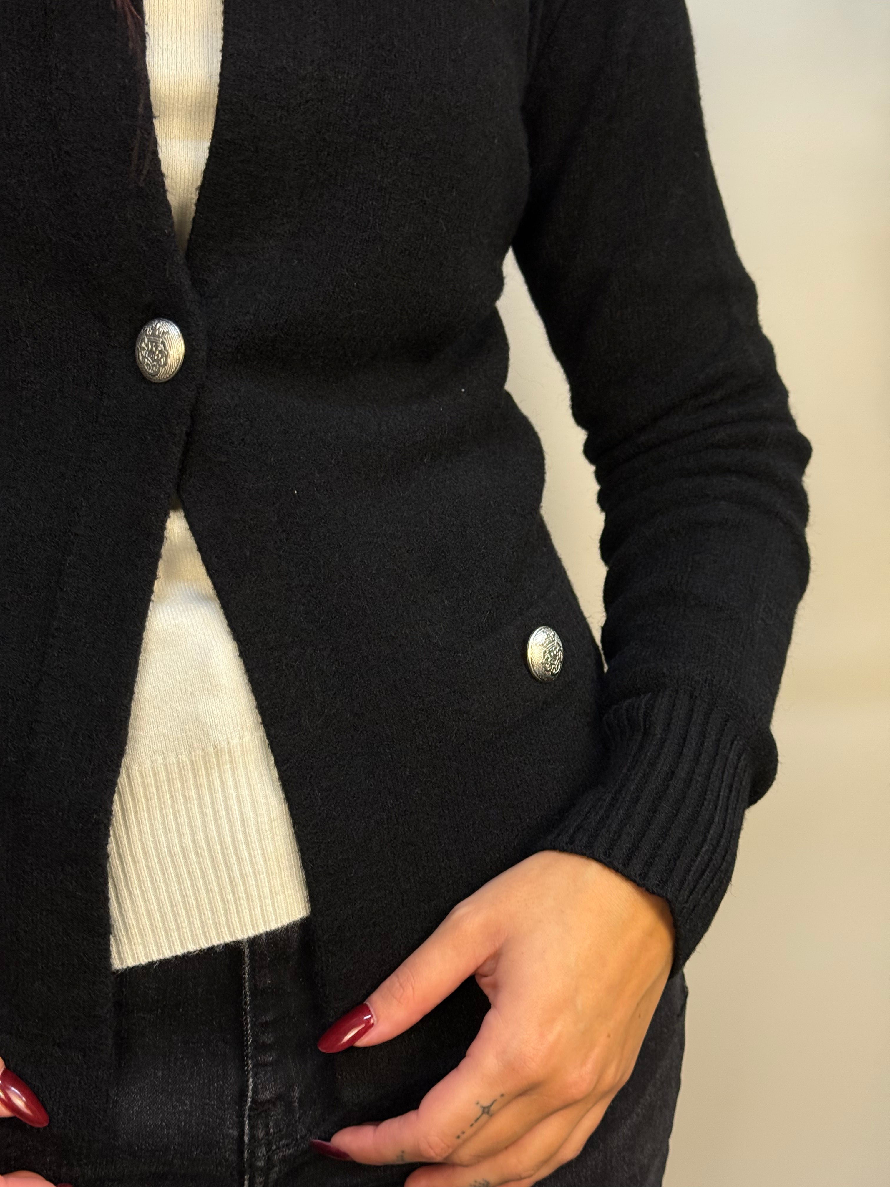 Un capo intramontabile con un tocco di luce: questo cardigan Susy Mix in filato morbido e delicato si distingue per la sua chiusura con bottone singolo e l’applicazione di bottoni decorativi in metallo dorato, che ne esaltano la linea con un’eleganza discreta. Disponibile in diverse varianti colore, è perfetto per completare qualsiasi look, dal più casual al più sofisticato. La vestibilità comoda e la texture piacevole lo rendono un alleato ideale per la stagione.