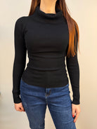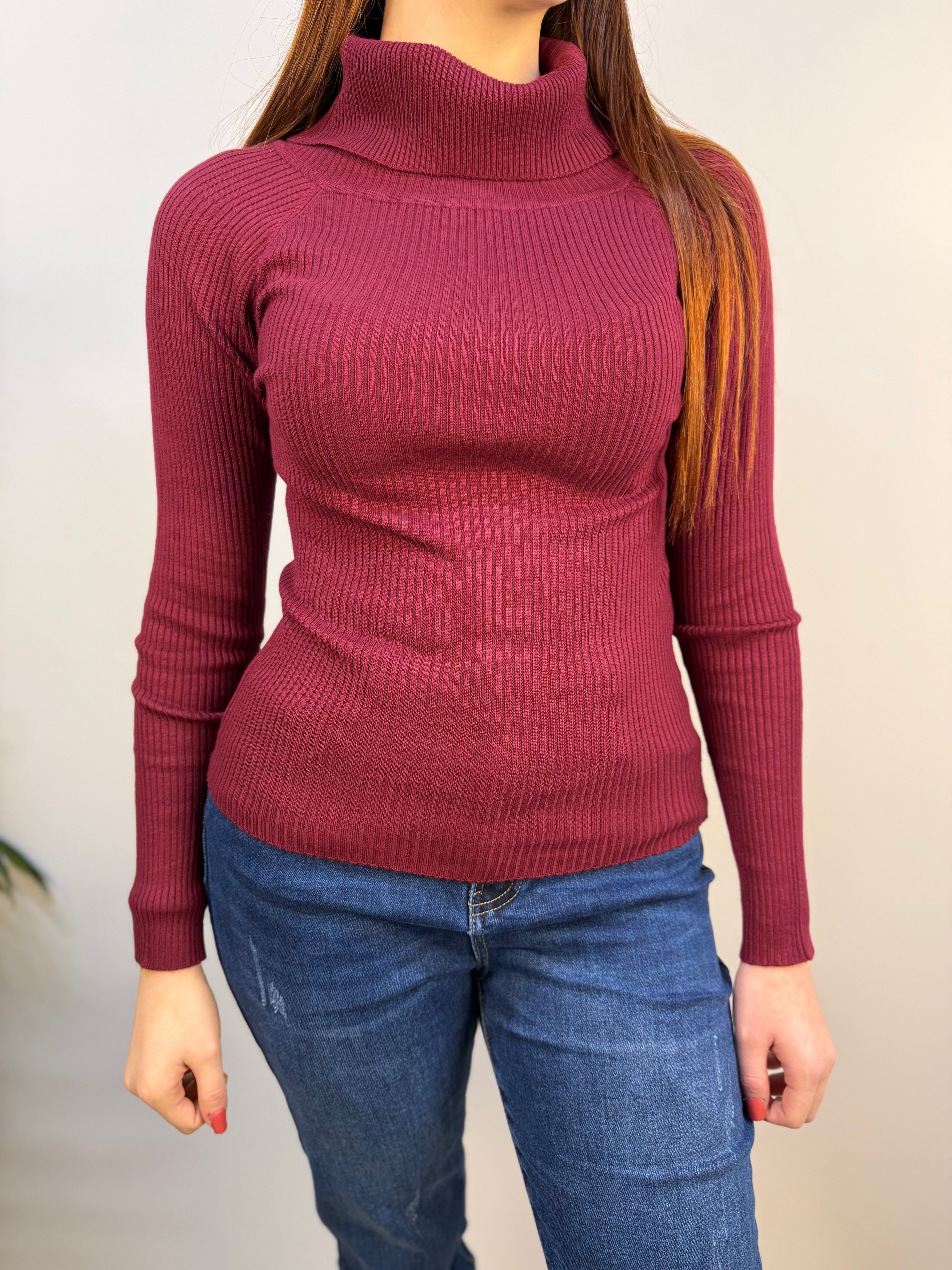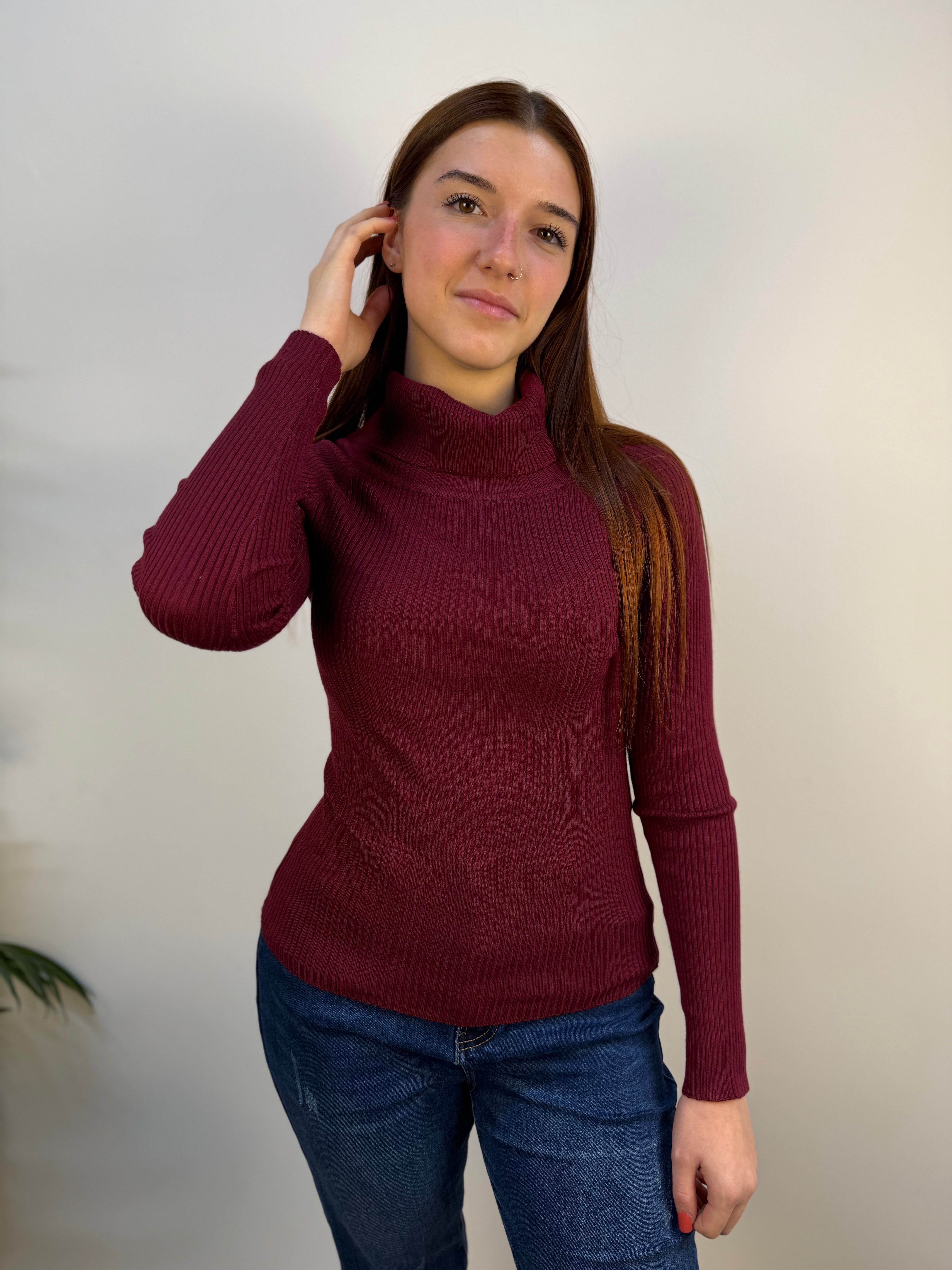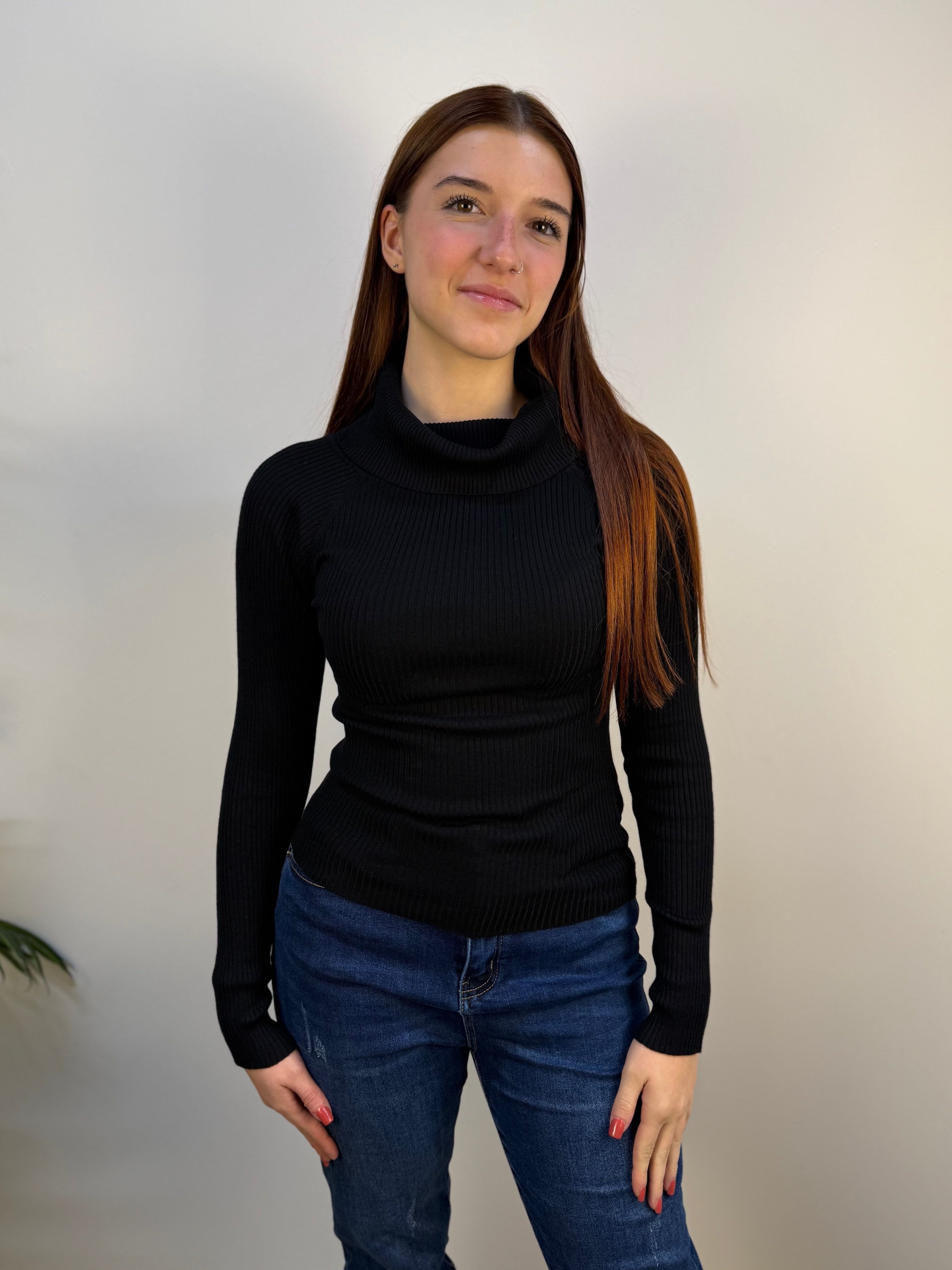 Maglia Blash calda e morbida in misto viscosa con collo ampio e linea aderente. La lavorazione a costine assicura una vestibilità comoda e femminile.