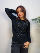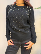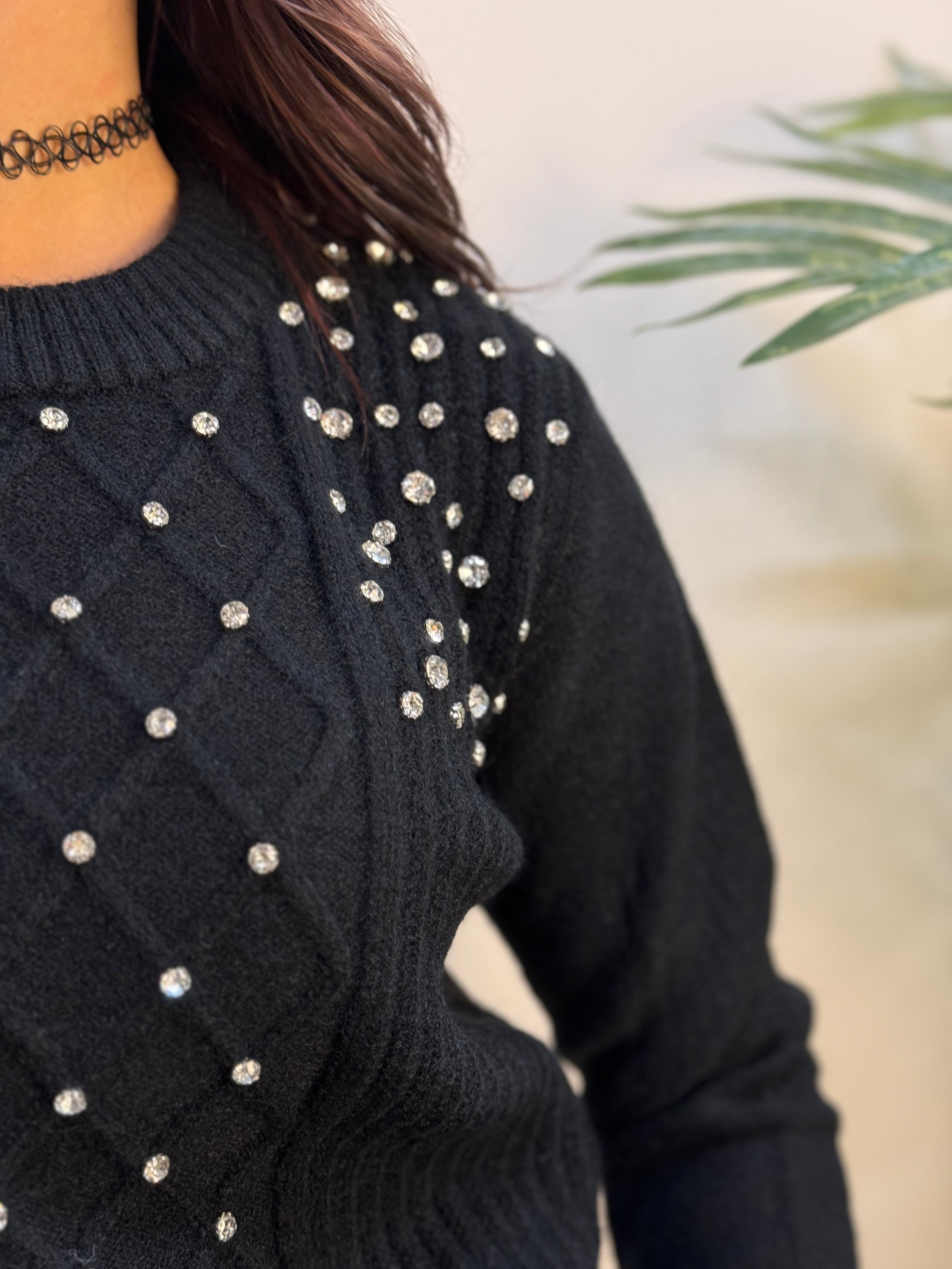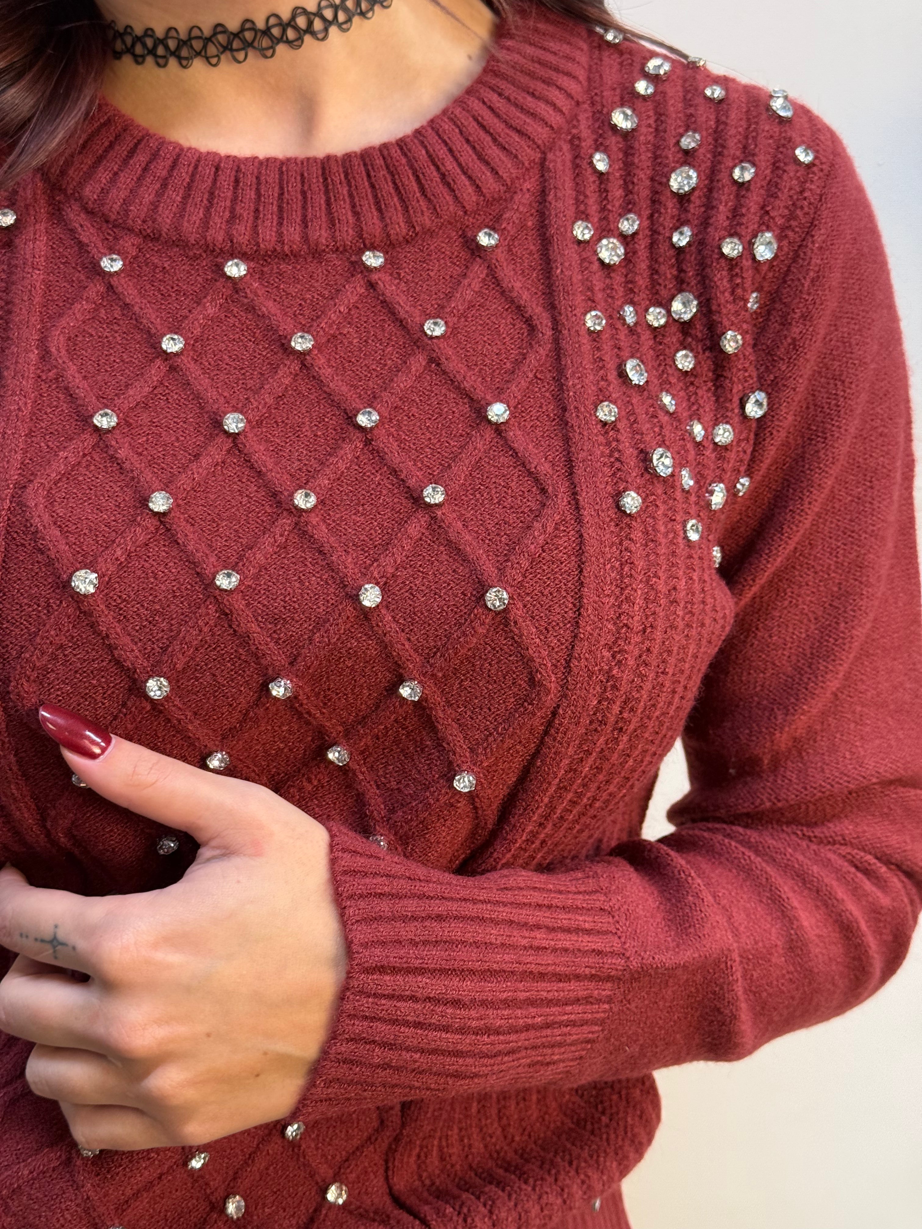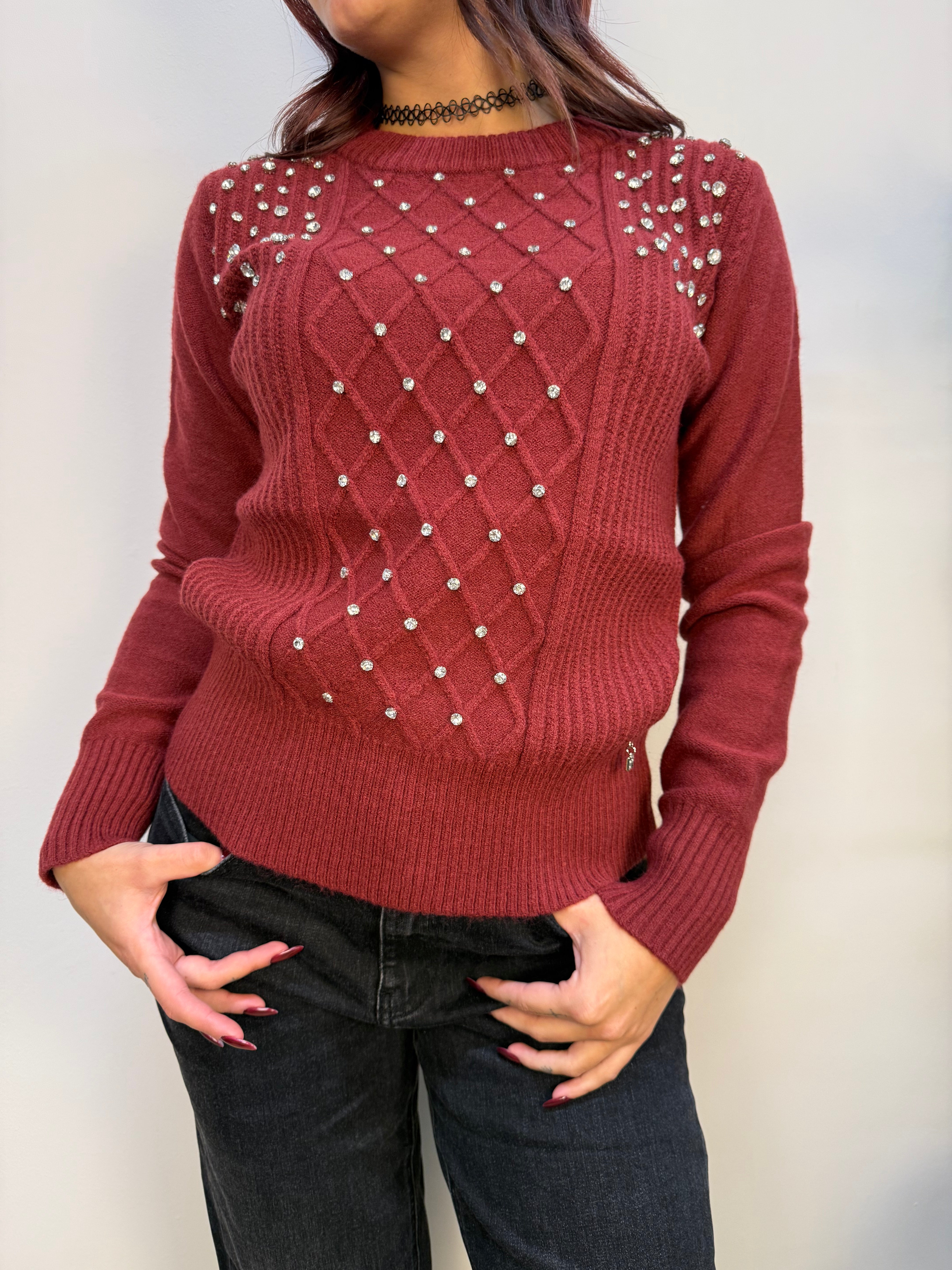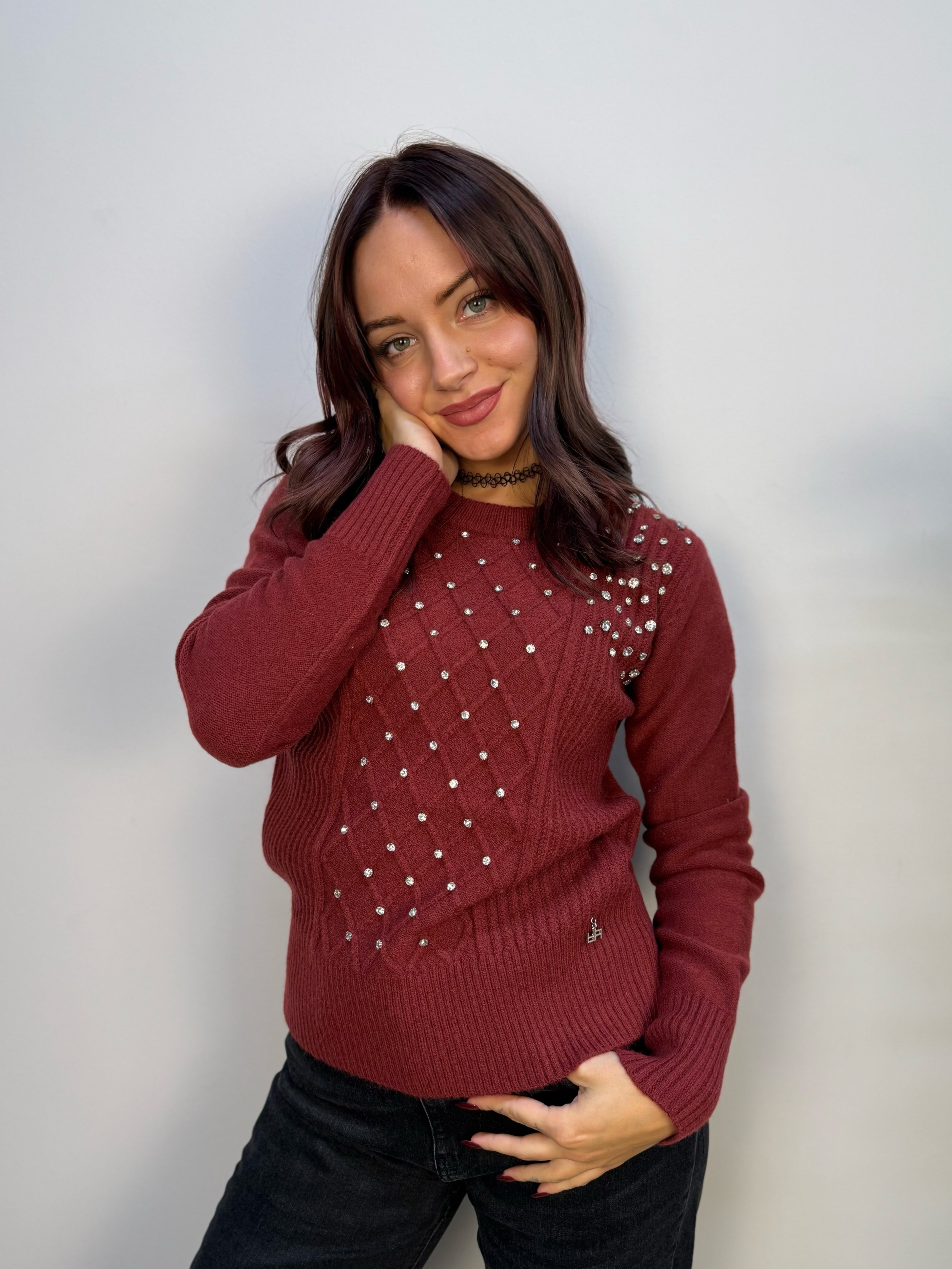 Maglia Artigli girocollo dalla linea elegante e raffinata, caratterizzata da una trama a rombi in rilievo che valorizza il design con un delicato effetto tridimensionale. Gli strass applicati aggiungono luminosità e femminilità, rendendo il capo perfetto per donare luce ai look quotidiani. Realizzata in un tessuto morbido, caldo ed elasticizzato, offre comfort e vestibilità impeccabile per tutta la giornata. Un capo versatile e chic, ideale da abbinare a pantaloni o gonne per un look sofisticato ma confortevole.