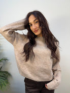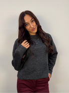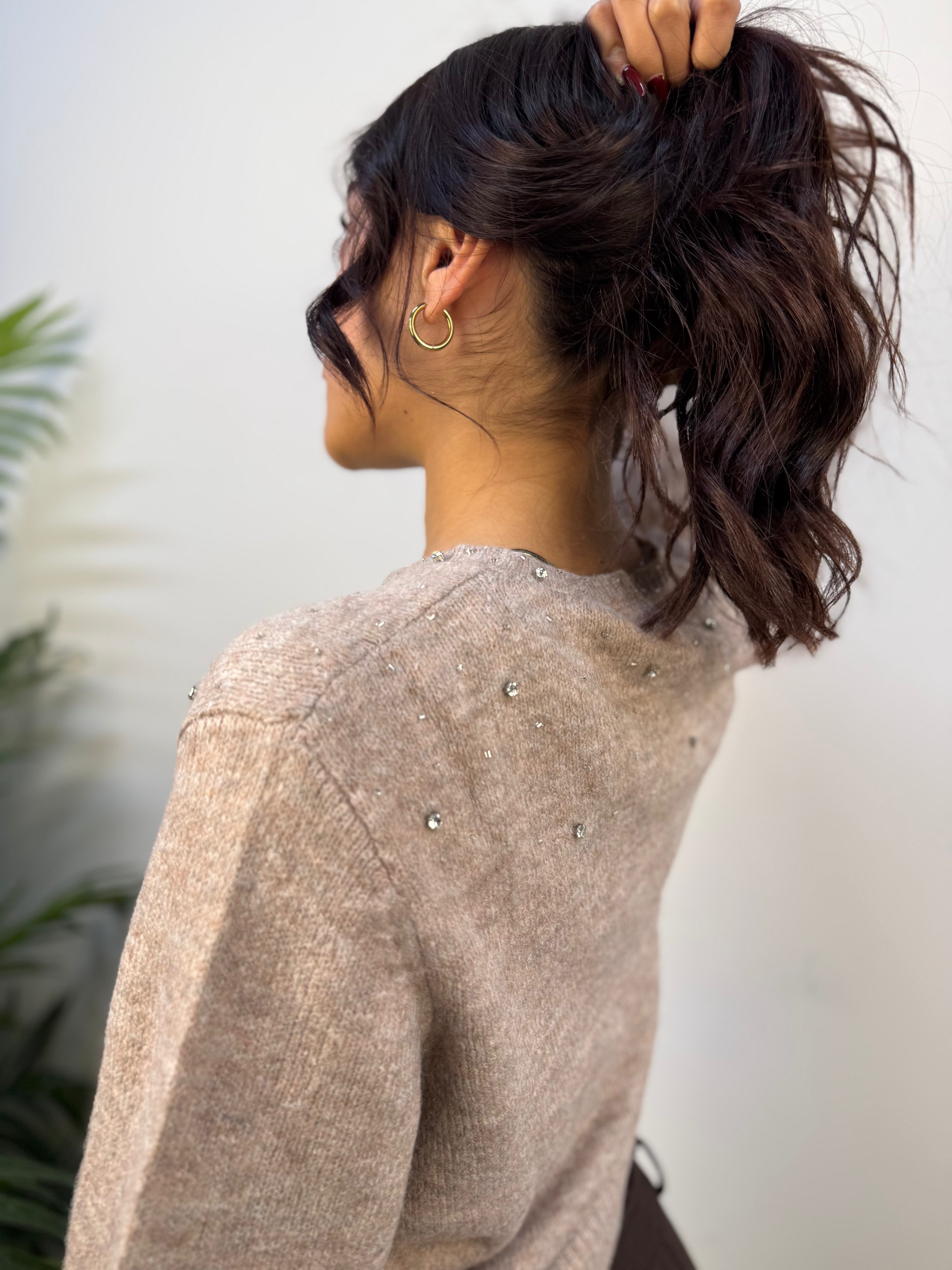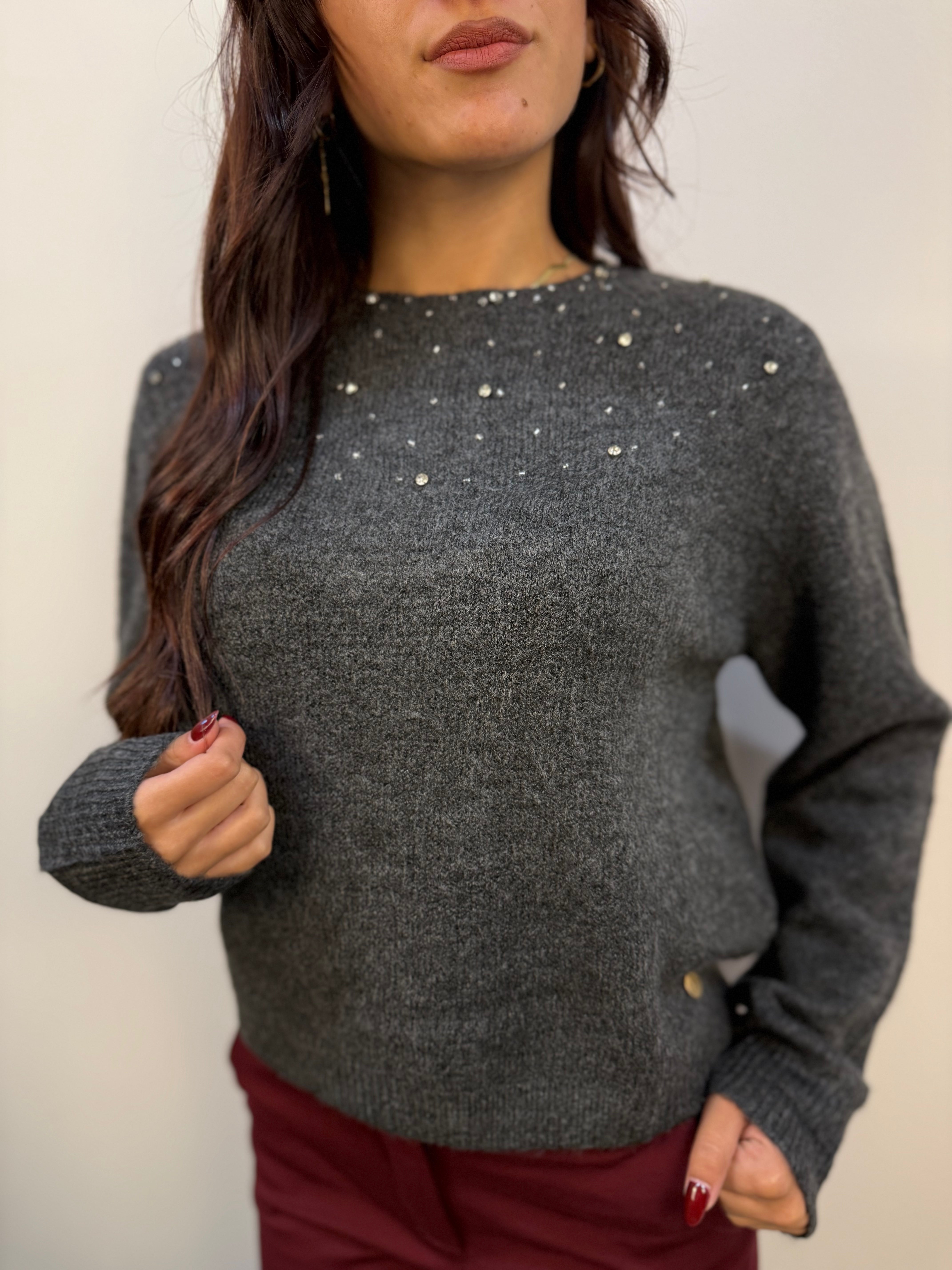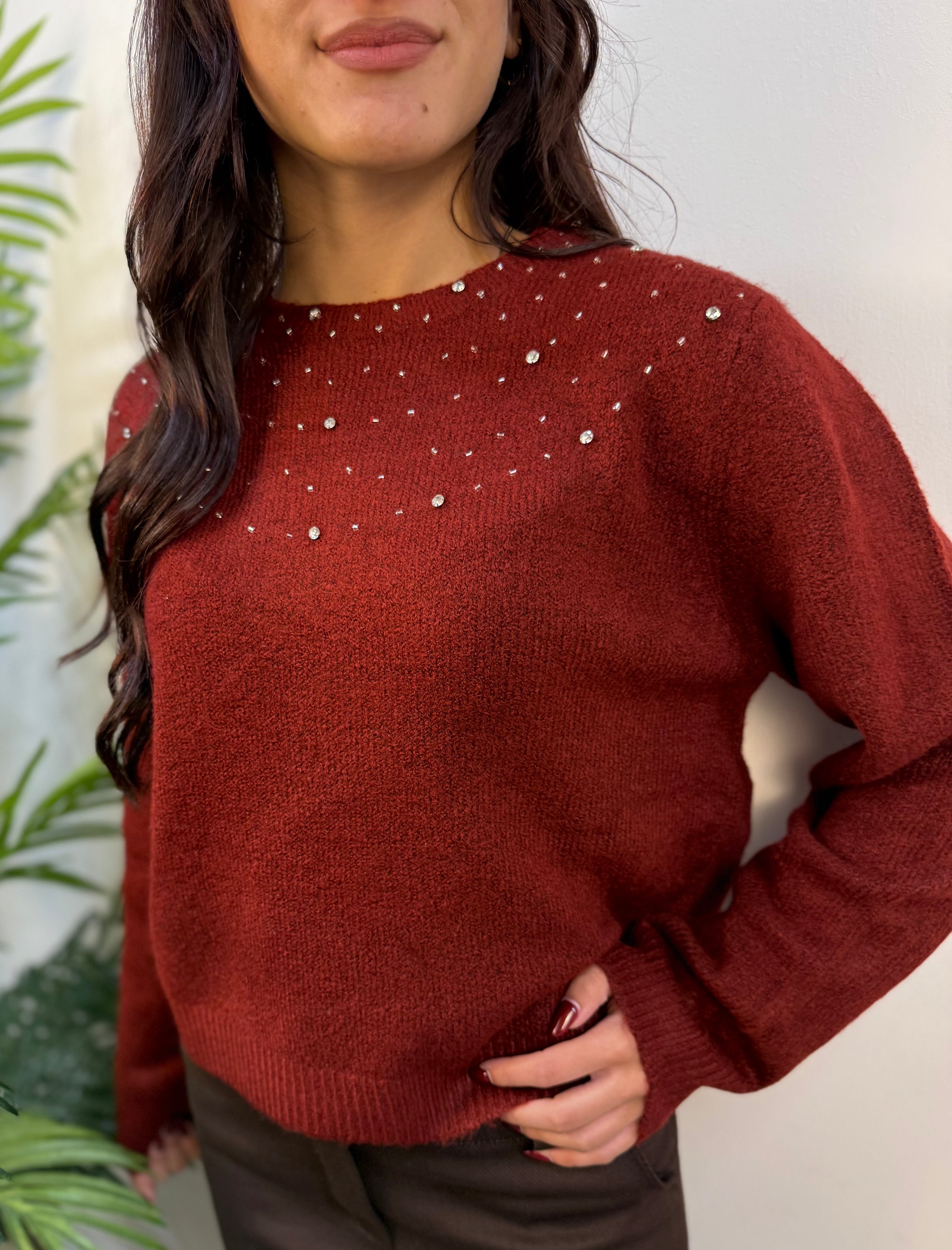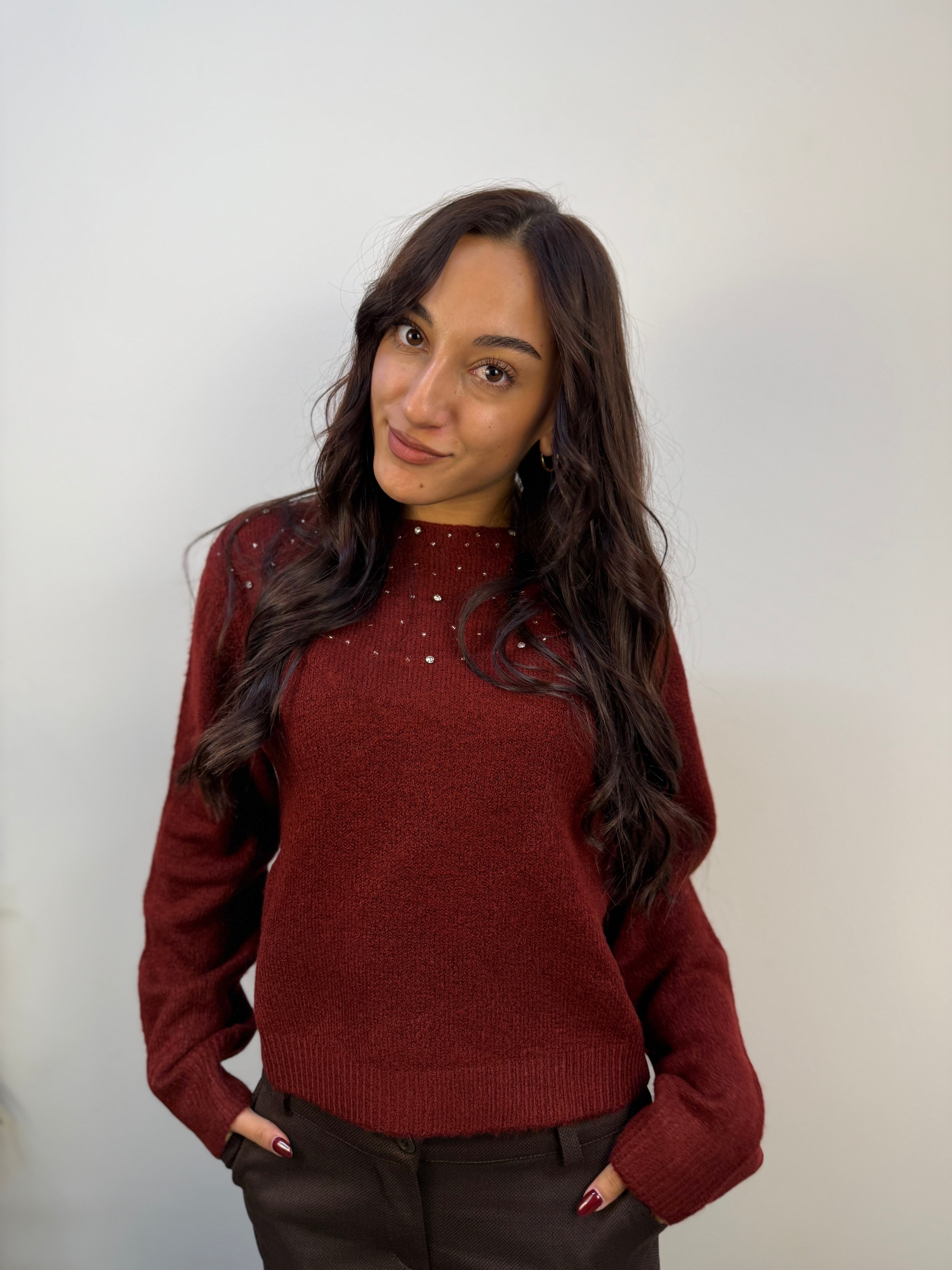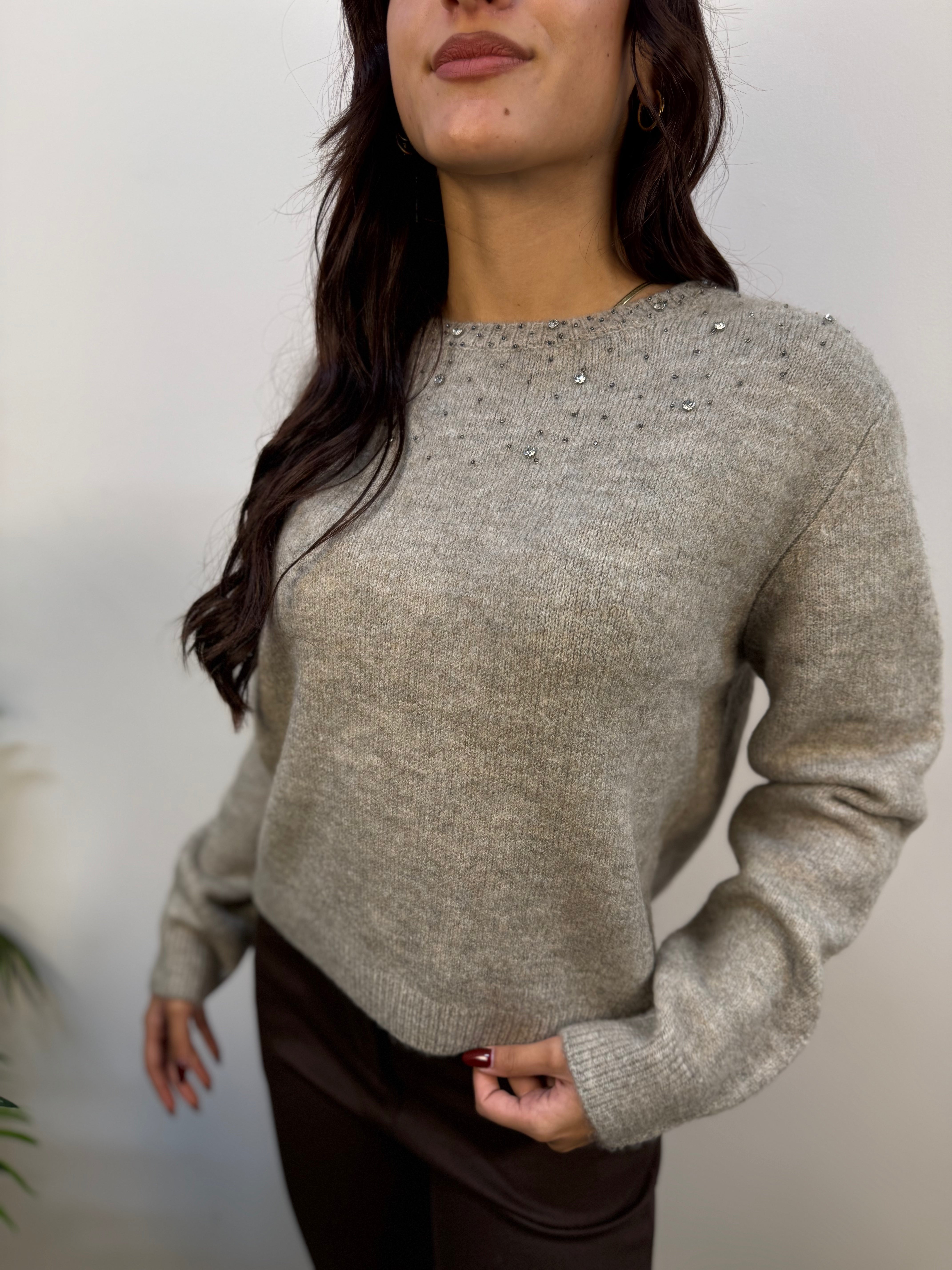 Maglia Yes-Zee in morbida maglia calda ed elasticizzata, caratterizzata da un raffinato scollo leggermente a barca che valorizza la linea delle spalle. Il modello, in tinta unita, è impreziosito da strass ricamati su scollo e spalle, che donano al capo luminosità e un tocco di eleganza. Un capo femminile e confortevole, perfetto per illuminare con stile i look della stagione fredda.