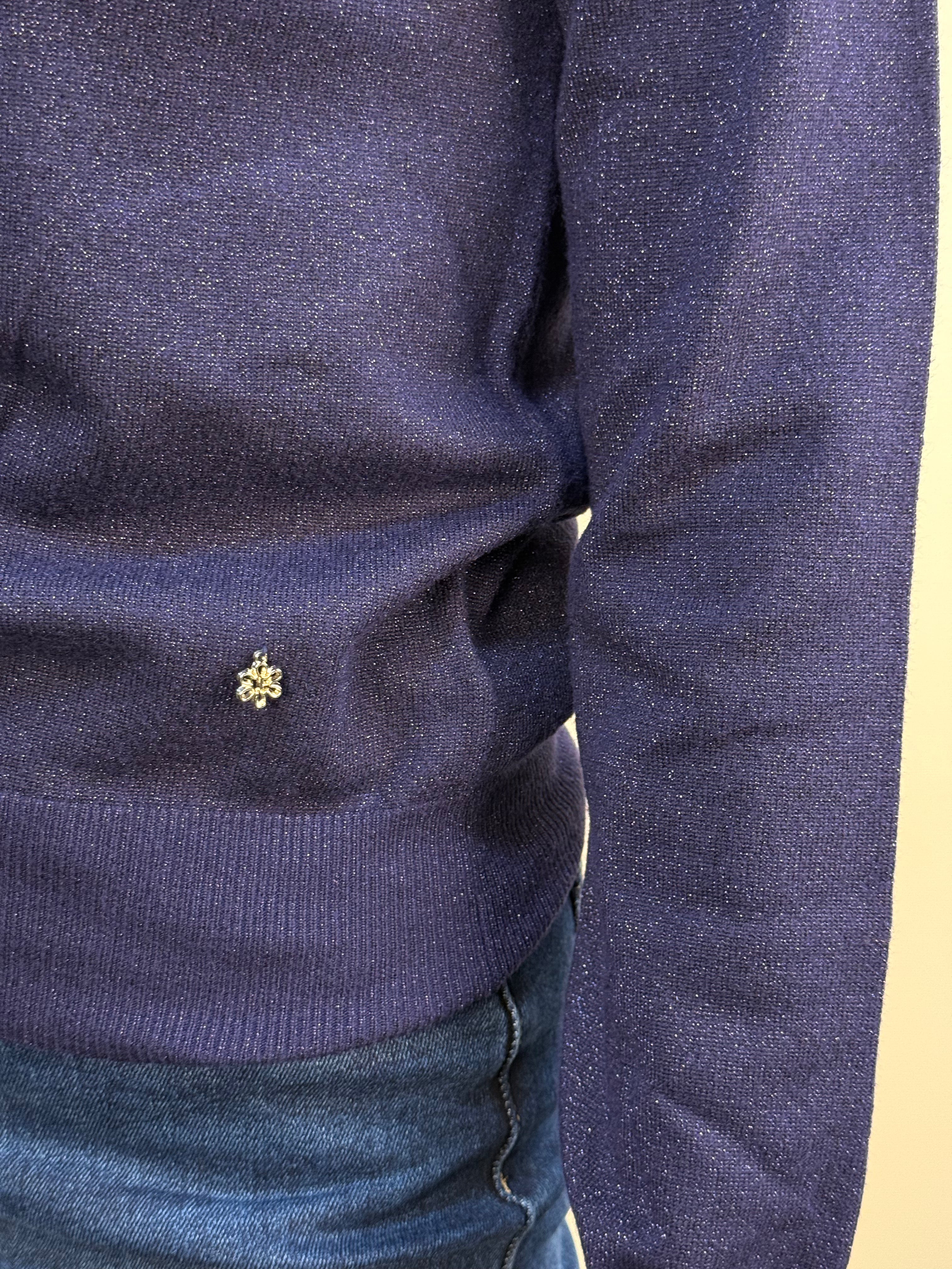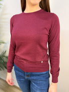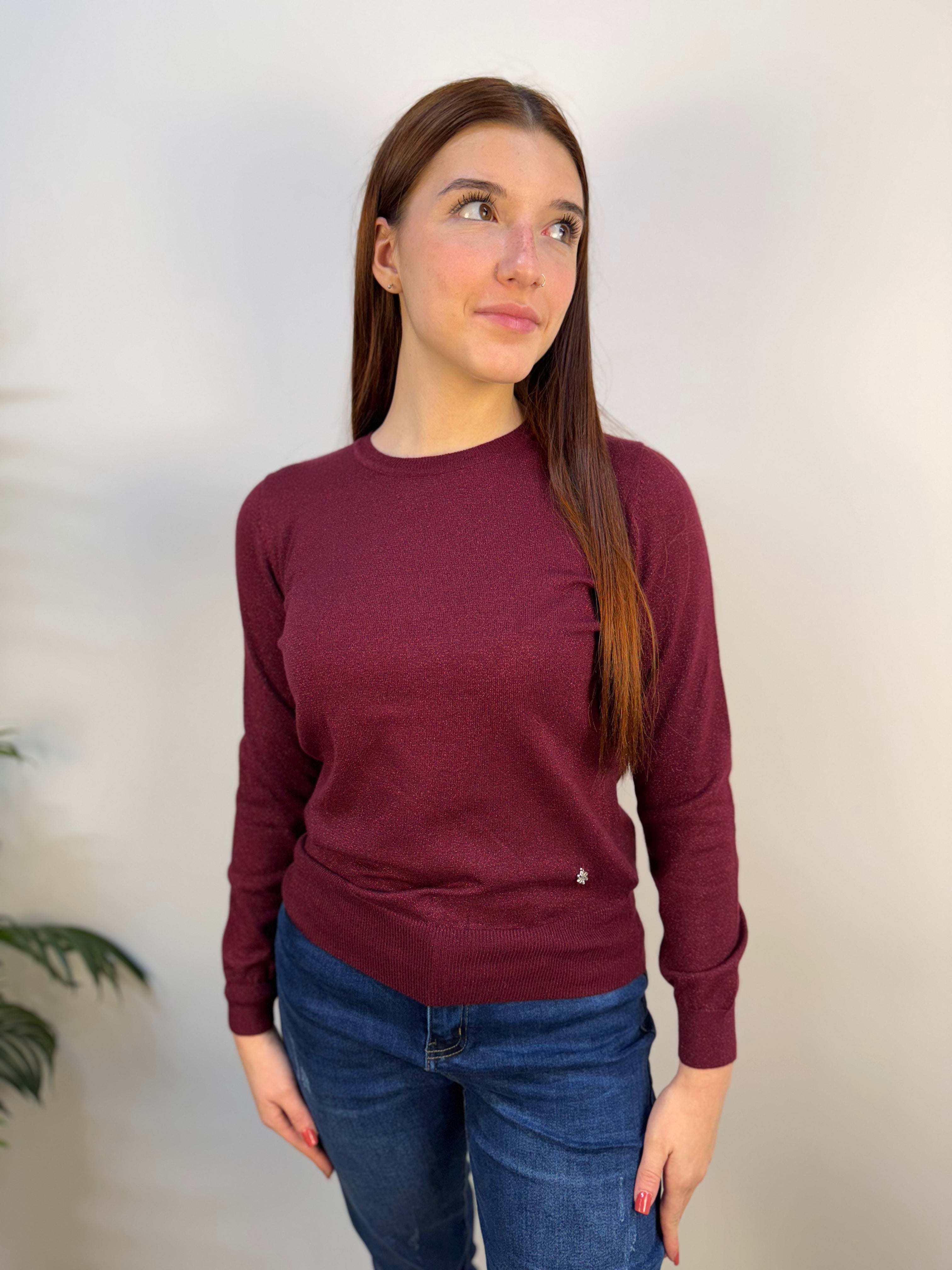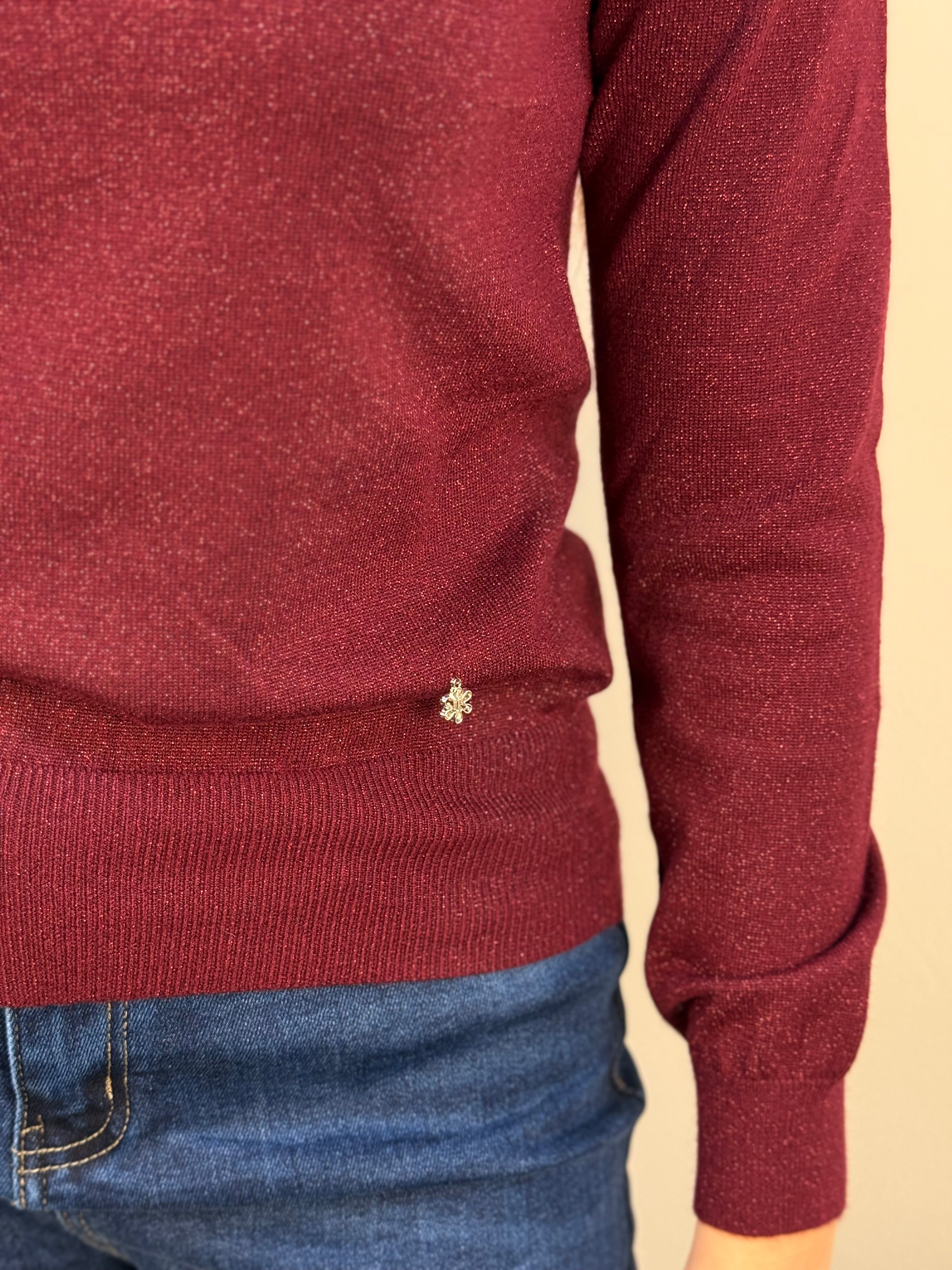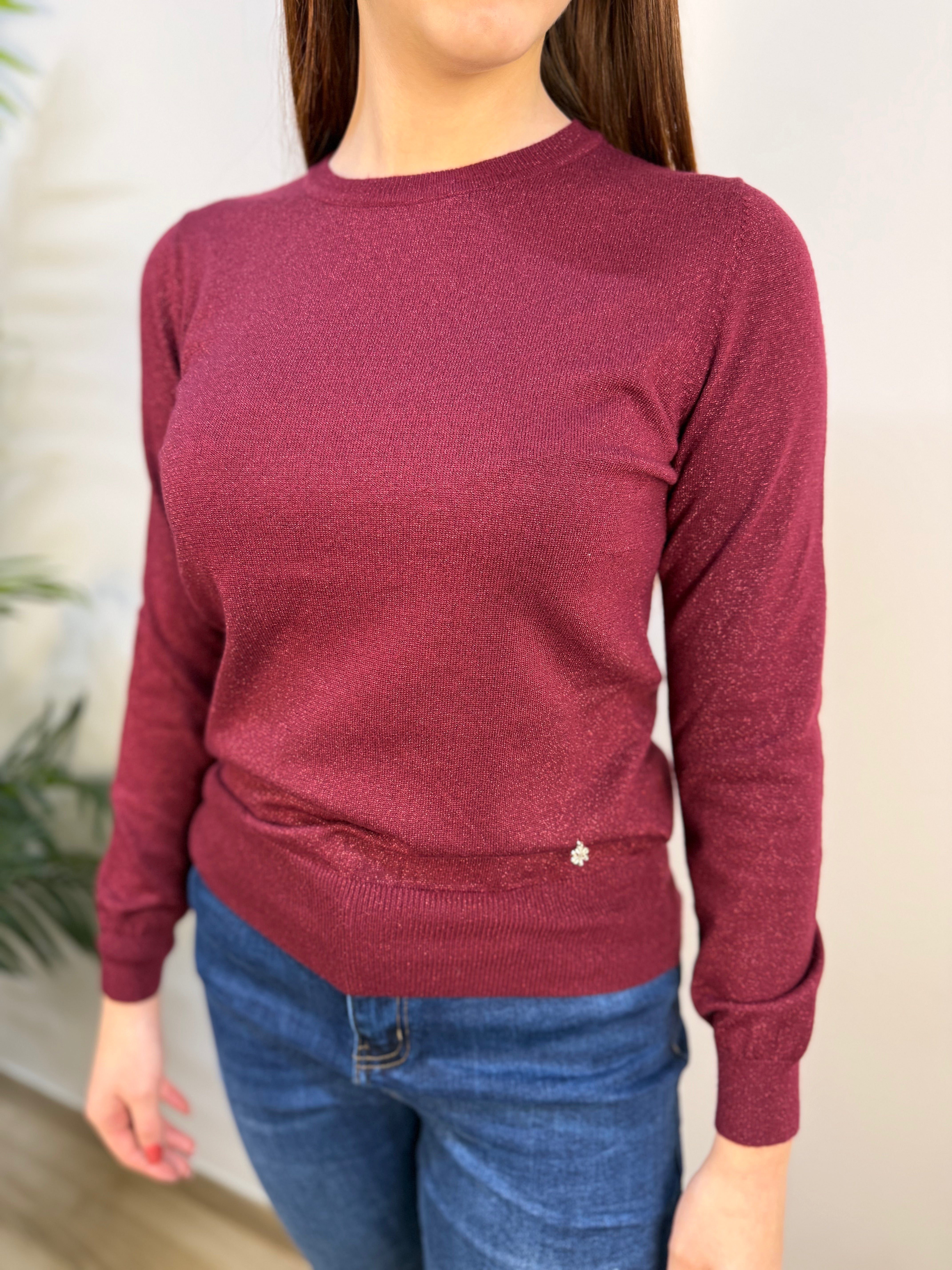 Maglia Fresh Flower girocollo realizzata in morbido misto viscosa elasticizzato, piacevole al tatto e confortevole da indossare. Il filato lurex tono su tono aggiunge un delicato tocco di luce e raffinatezza, illuminando il capo con discrezione. I polsini, lo scollo e il fascione a costine definiscono la vestibilità e donano struttura alla silhouette. Proposta in due varianti colore, borgogna e blu, è una maglia versatile e femminile, perfetta per completare look sia casual che eleganti con una nota brillante e sofisticata.