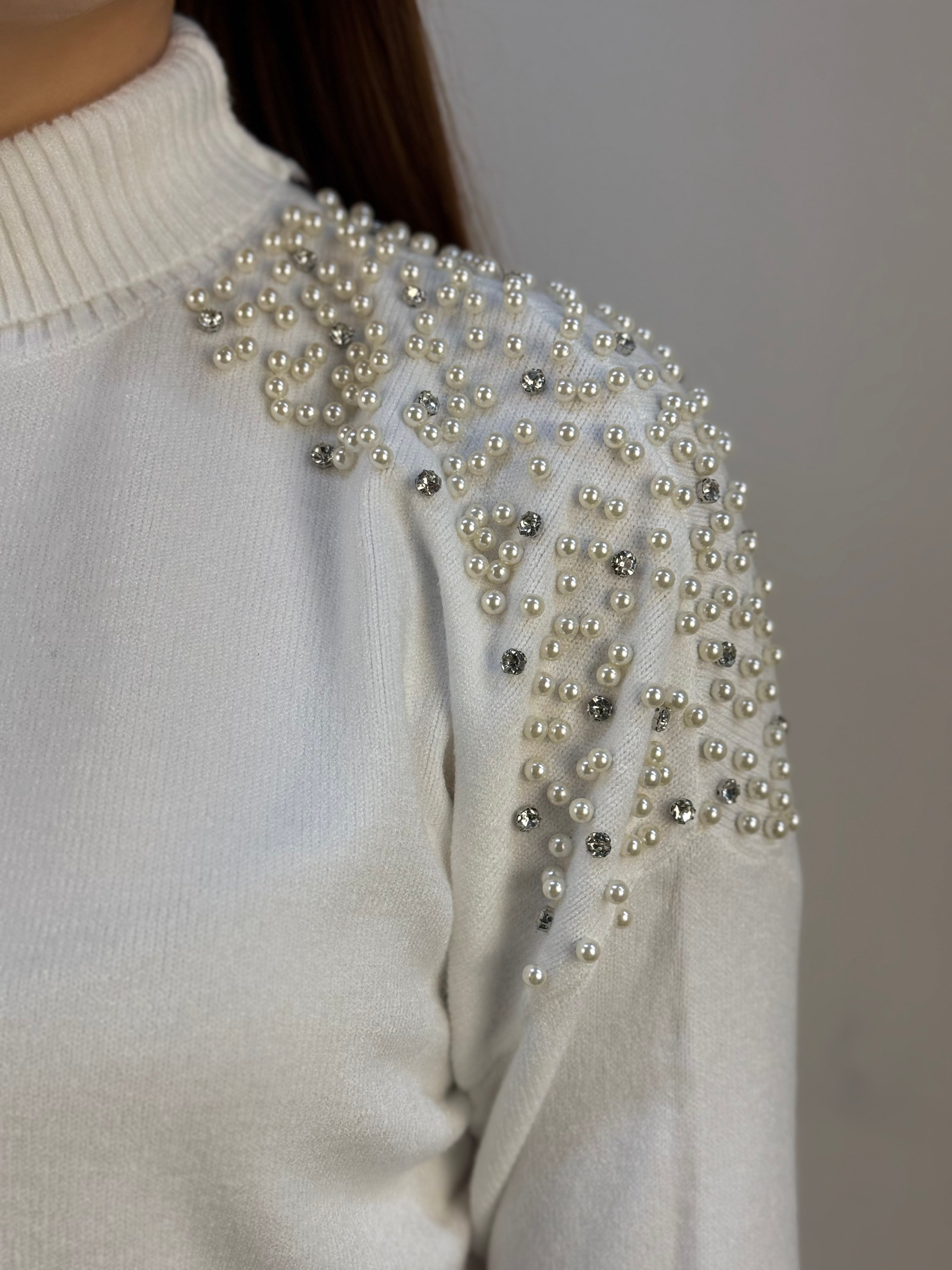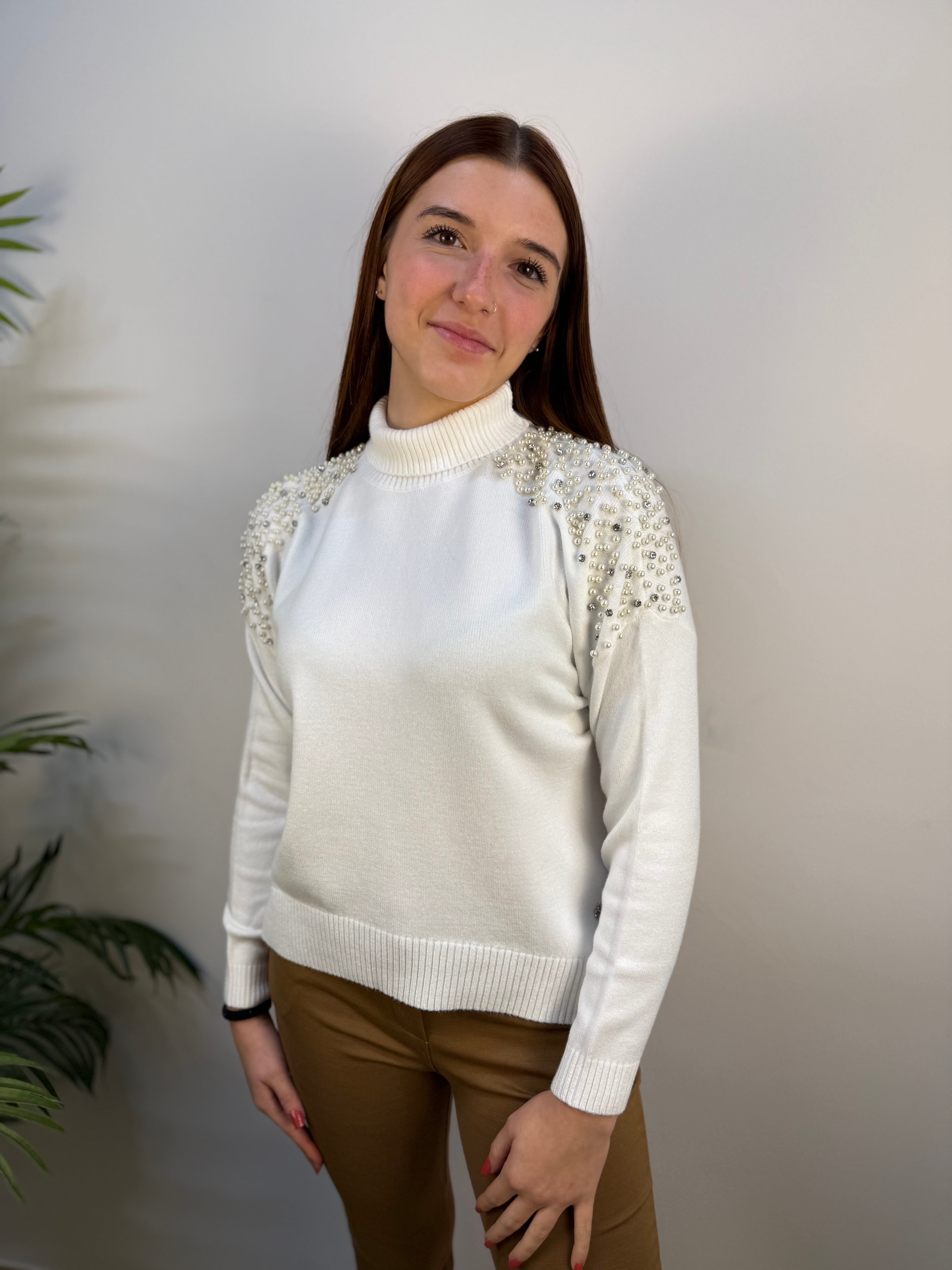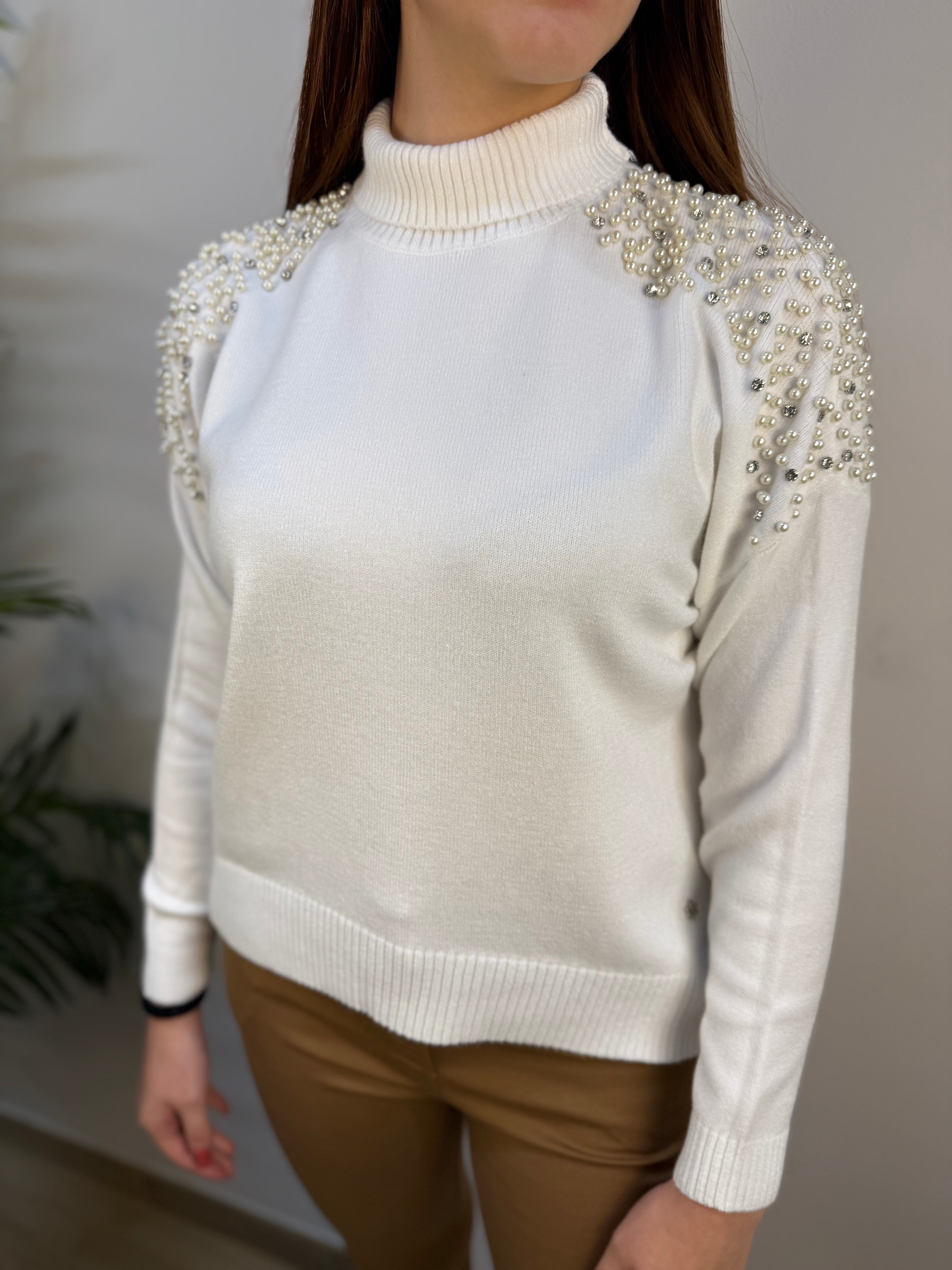 Maglione mezzo collo Fresh Flower in un delicato color panna, realizzato in un morbido e confortevole misto viscosa elasticizzato. Le spalle sono arricchite da eleganti perle e strass che donano movimento e luce, trasformando il capo in un dettaglio prezioso per il tuo guardaroba. I polsini, fascione e collo a costine completano il design, assicurando una vestibilità perfetta e curata nei dettagli. Perfetto per chi cerca un maglione raffinato, versatile e femminile.