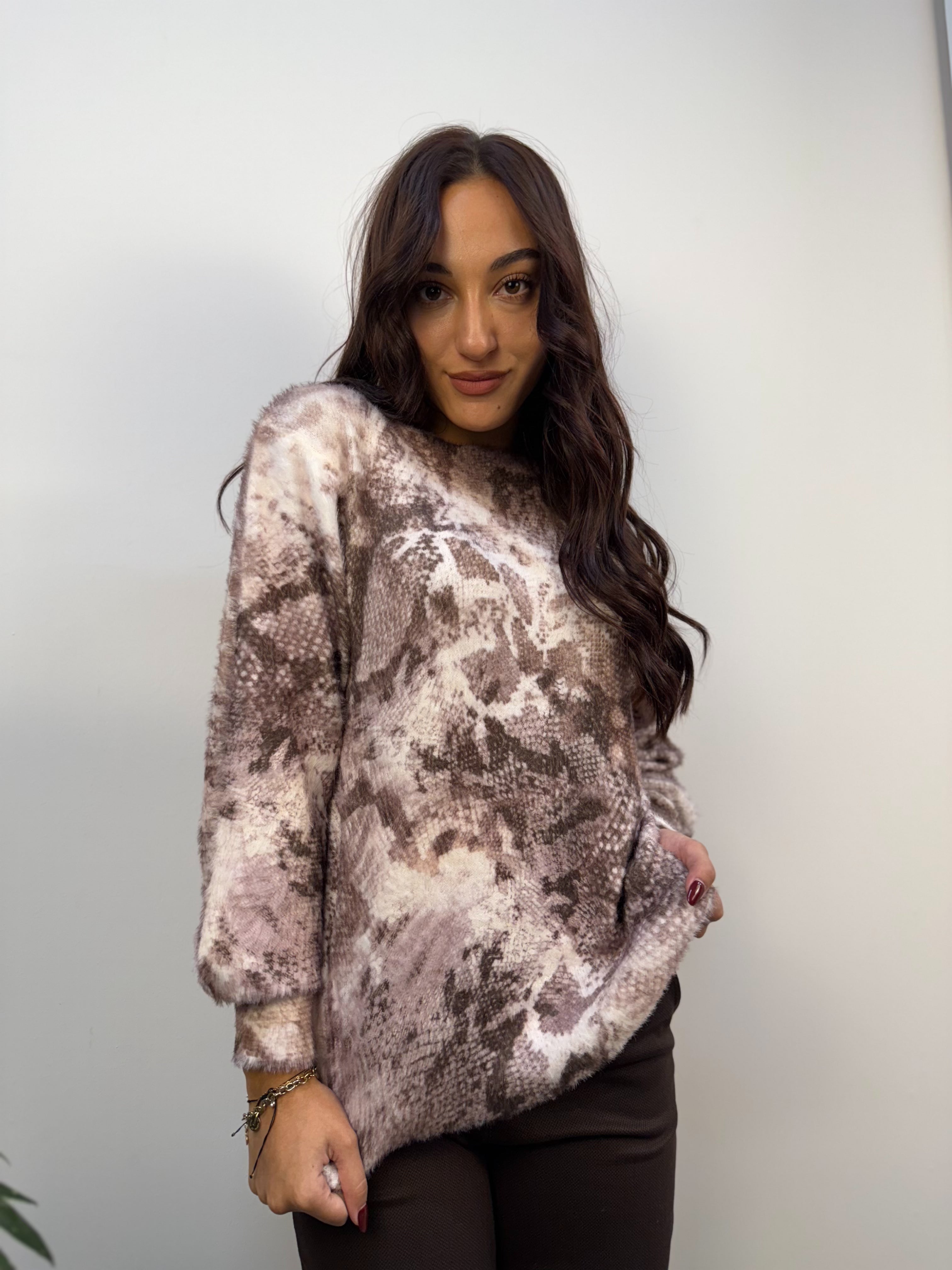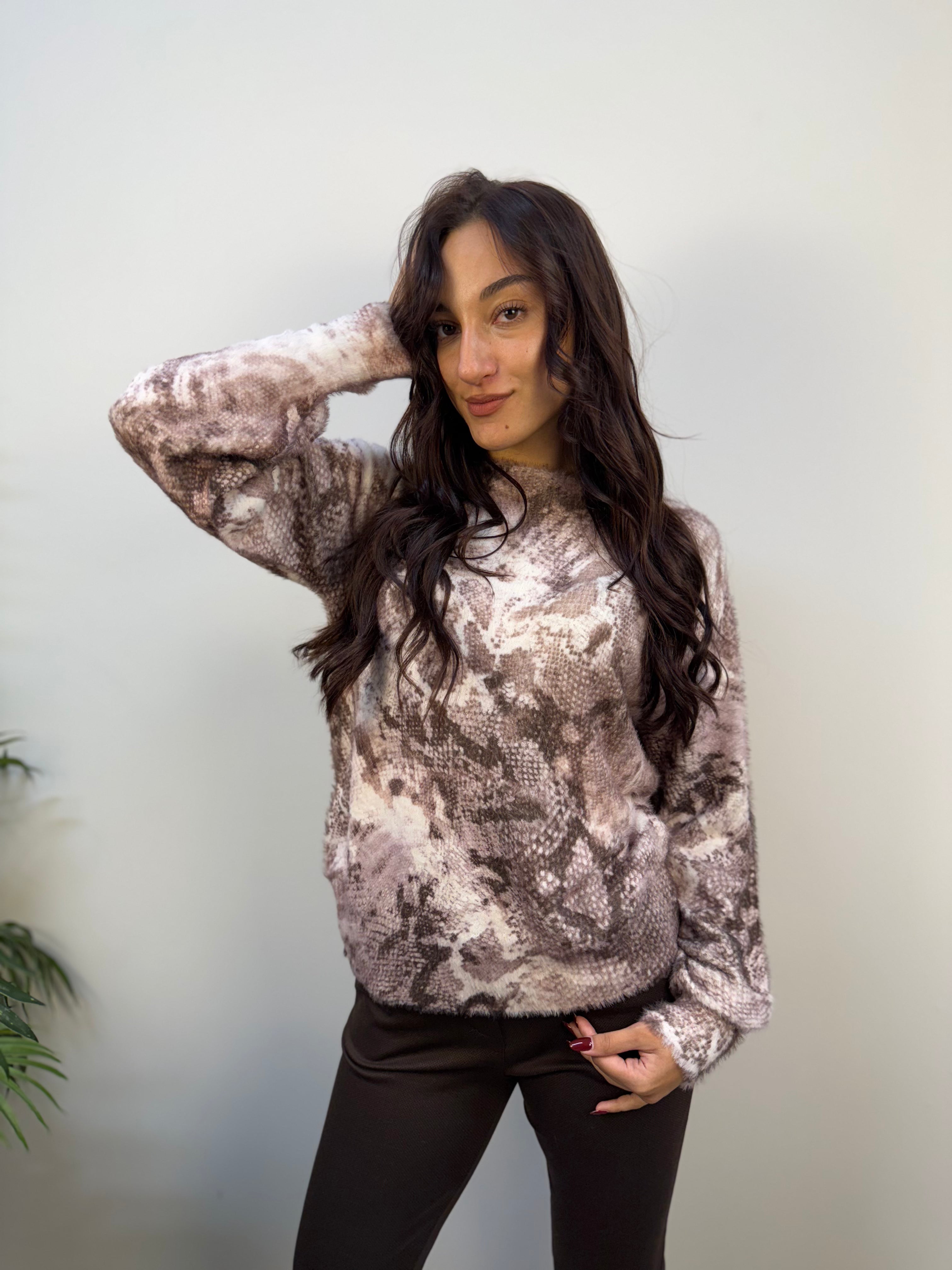 Morbidissima e calda, questa maglia Blash soffice a pelo corto è realizzata in un tessuto elasticizzato che avvolge la figura con comfort e morbidezza. La delicata stampa pitonata nei toni tenui si posa su uno sfondo bianco luminoso, donando al capo un’allure sofisticata e moderna. Perfetta per chi cerca stile e comodità in un unico capo.