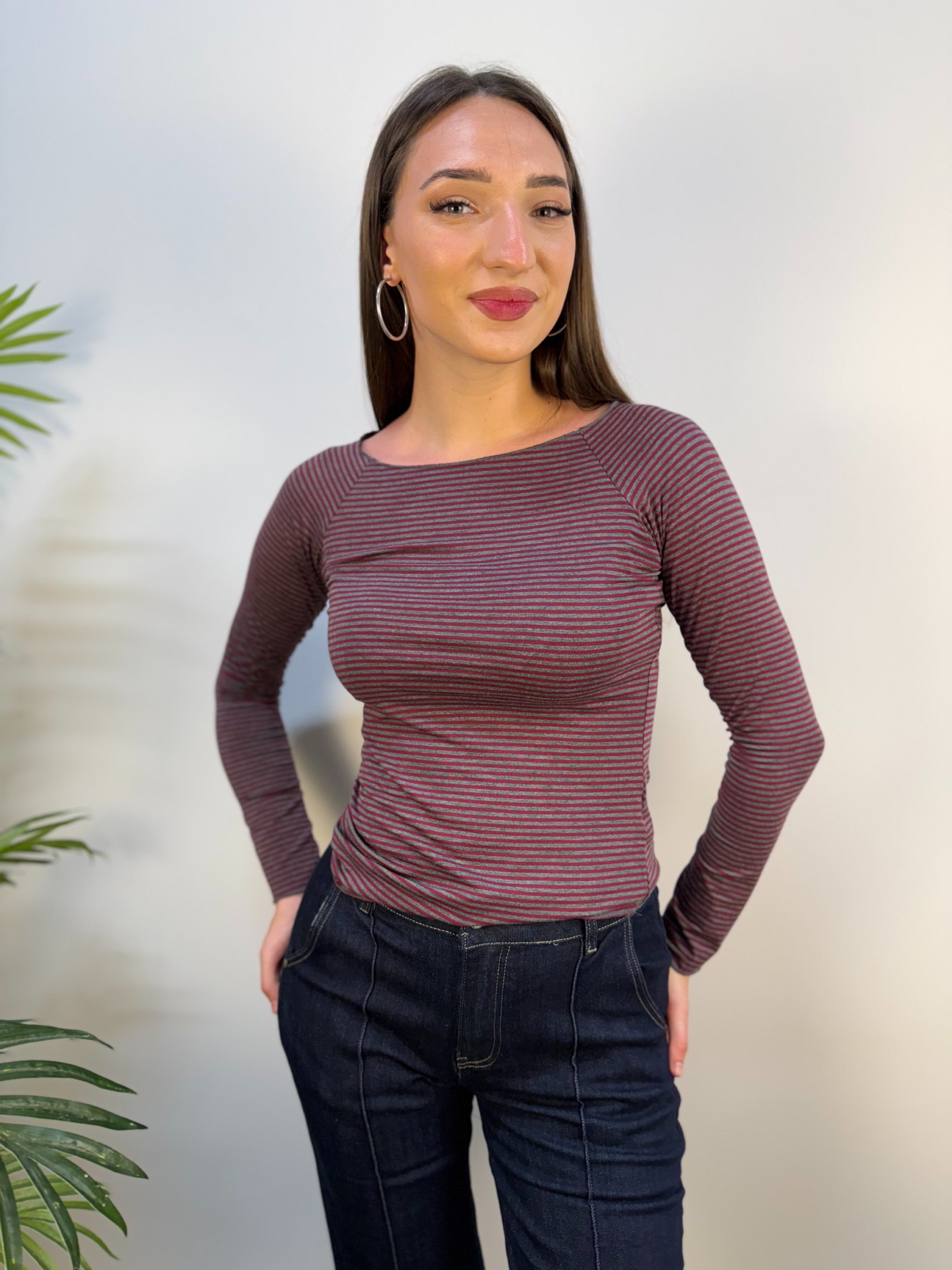 Maglia Susy Mix a manica lunga con scollo a barchetta e taglio raglan, realizzata in tessuto sottile ed elasticizzato che si adatta perfettamente alla silhouette. Caratterizzata da una fantasia a righe senza tempo, è proposta in diverse varianti colore, rendendola un capo facile da abbinare e perfetto per ogni occasione. Un must-have dal gusto casual e raffinato, ideale da indossare sia da sola che sotto giacche o cardigan.