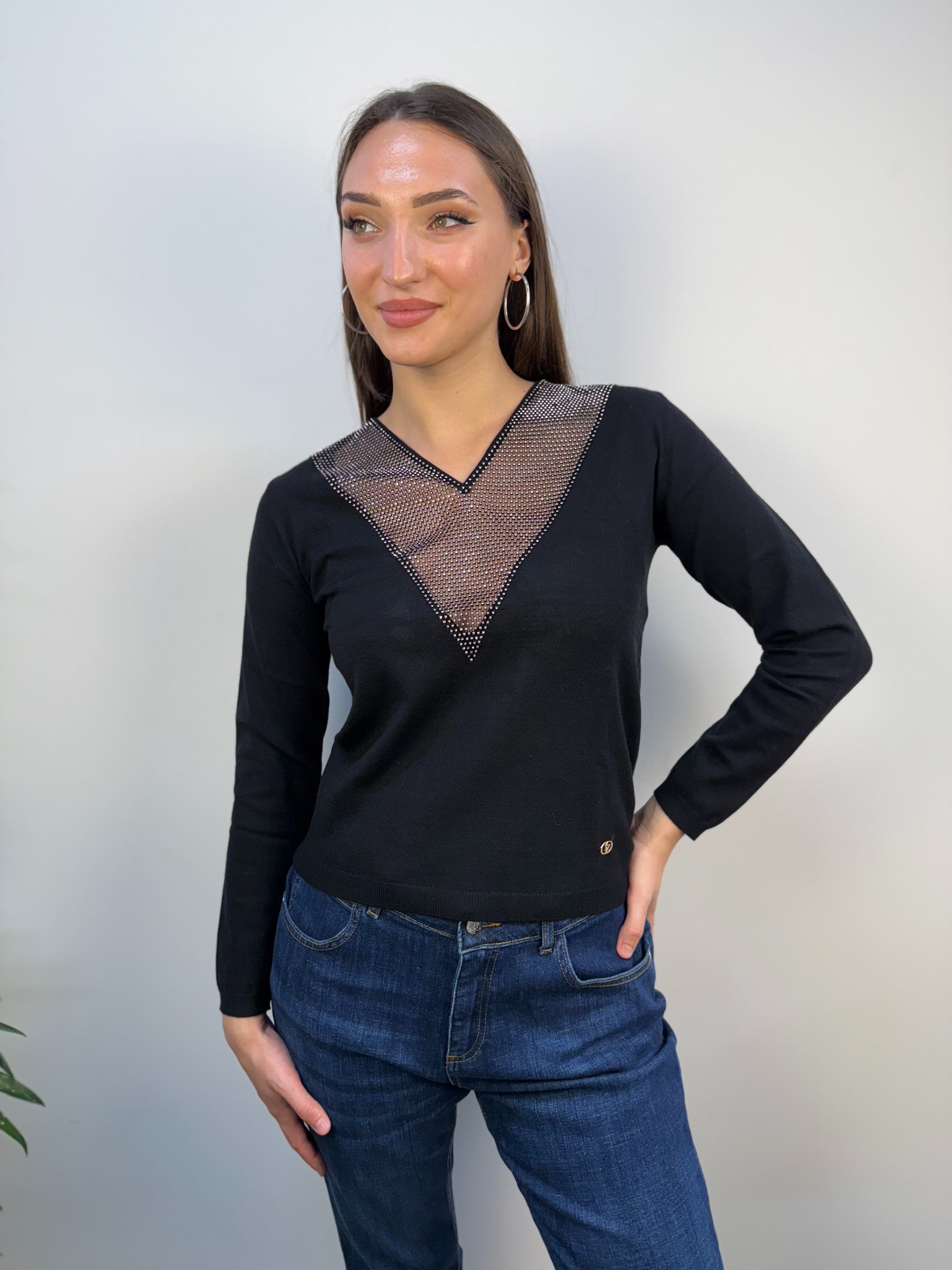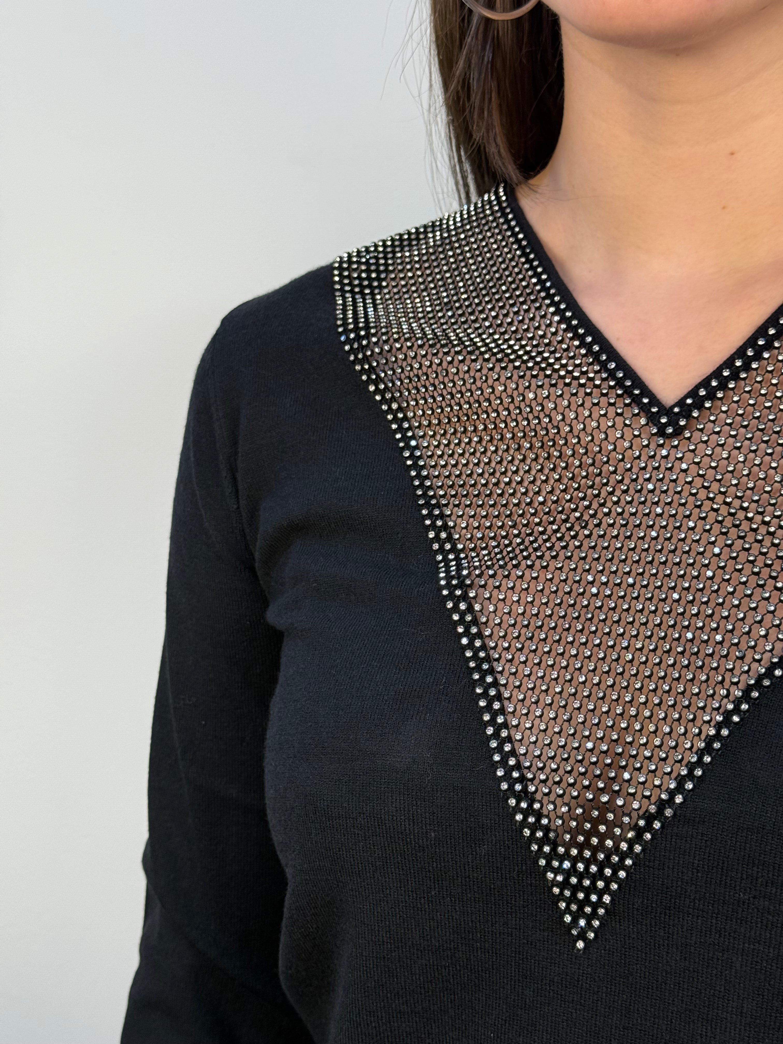 Maglia in misto viscosa con scollo a V in rete e strass