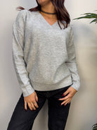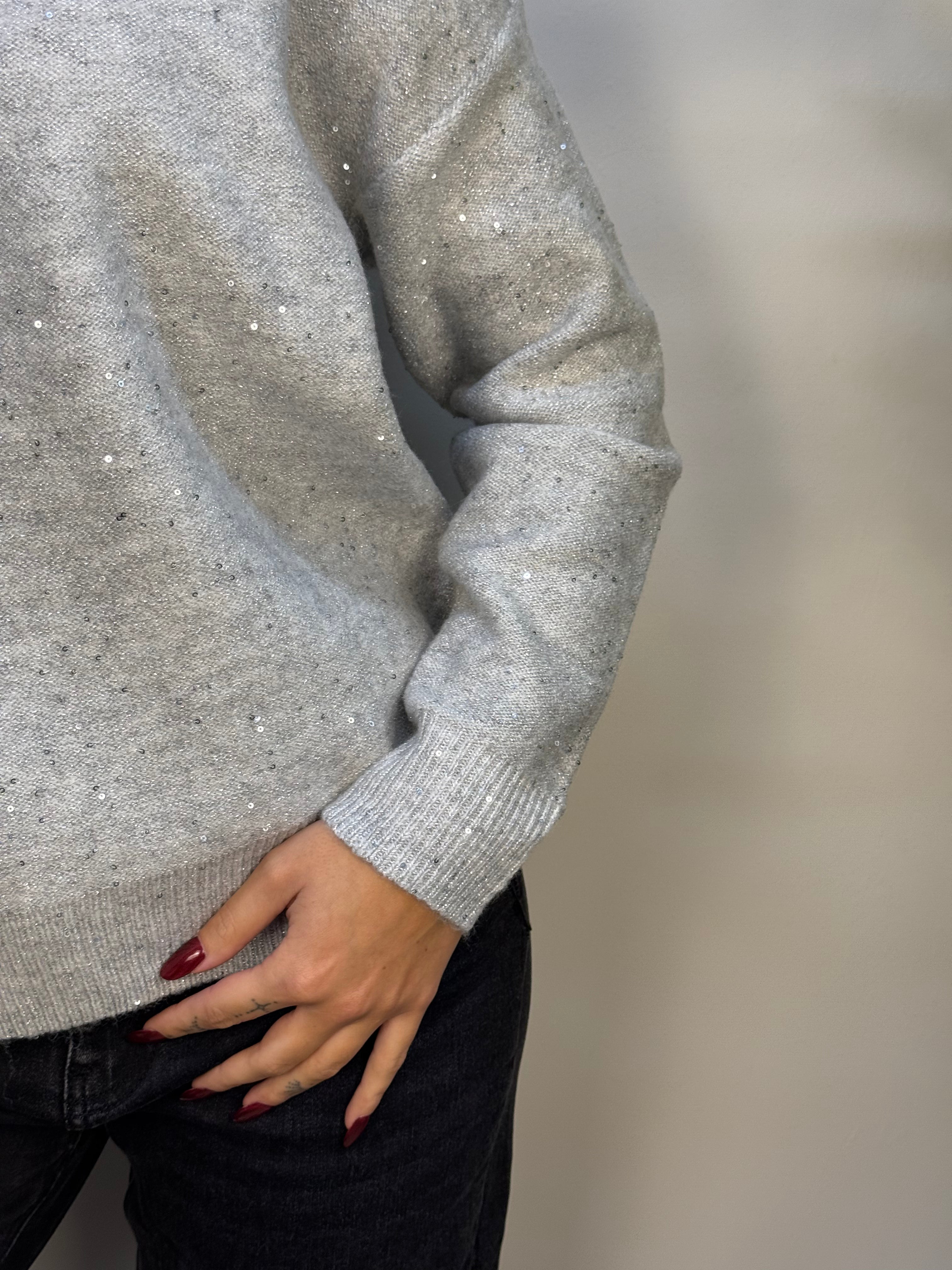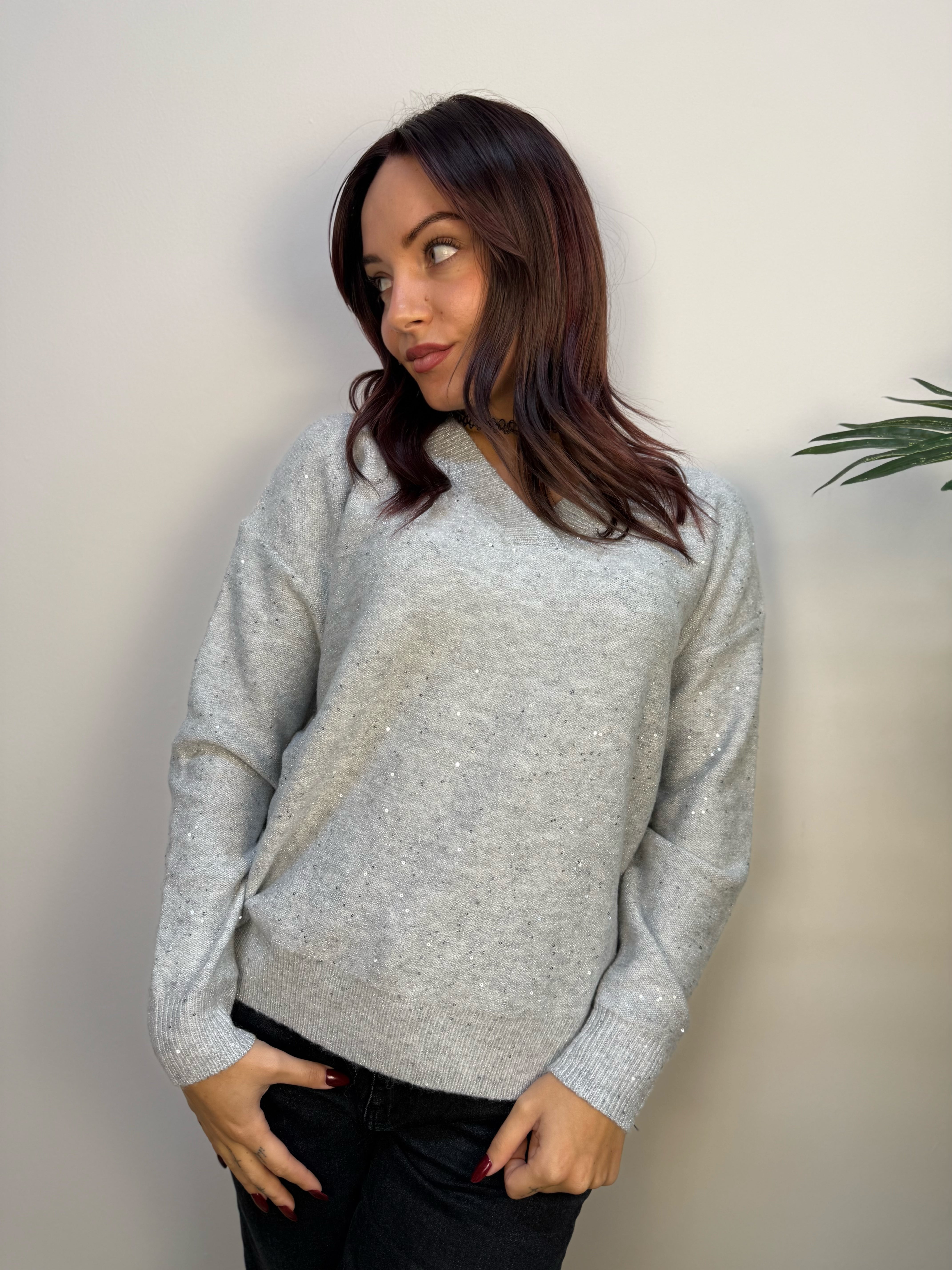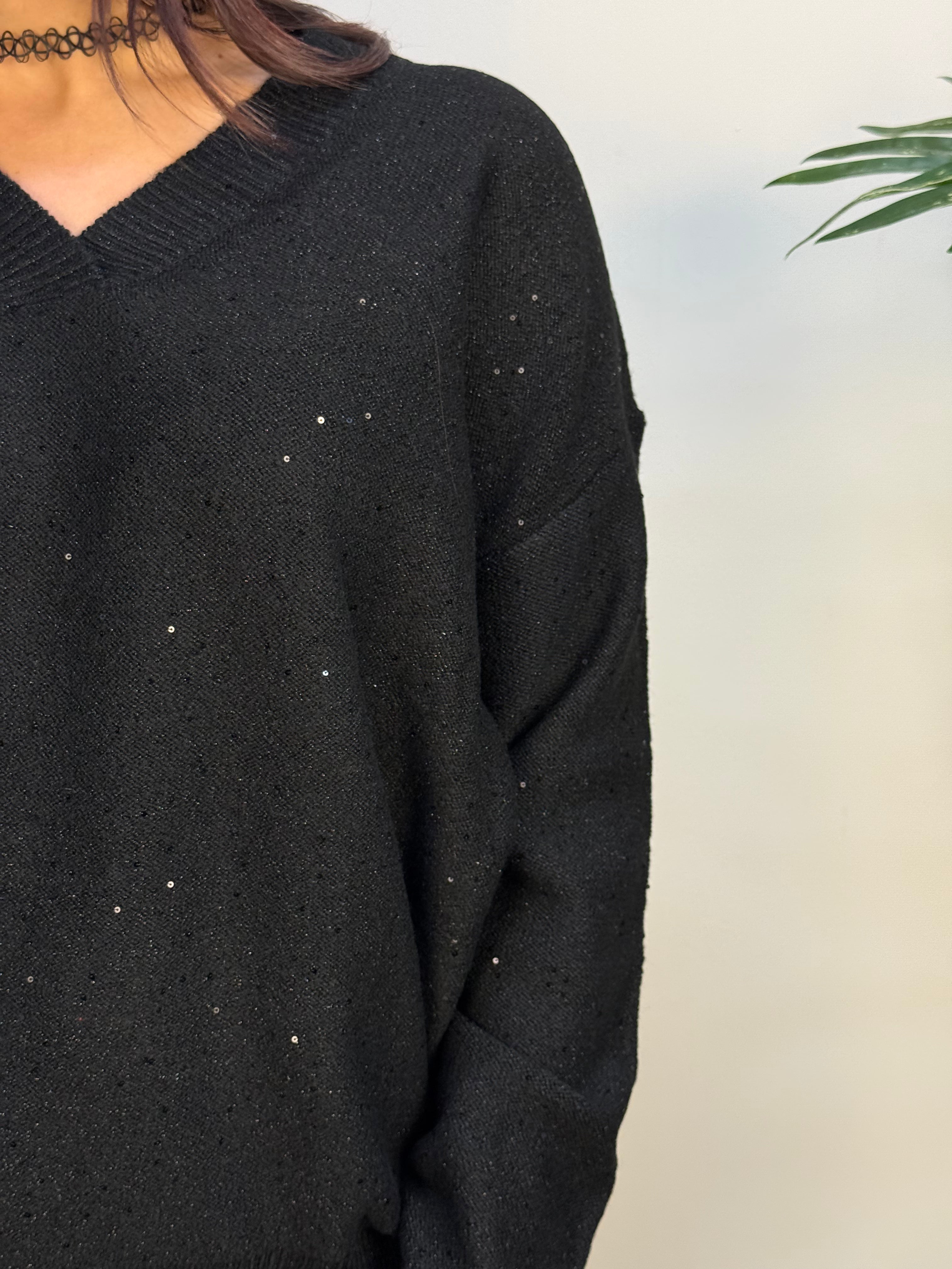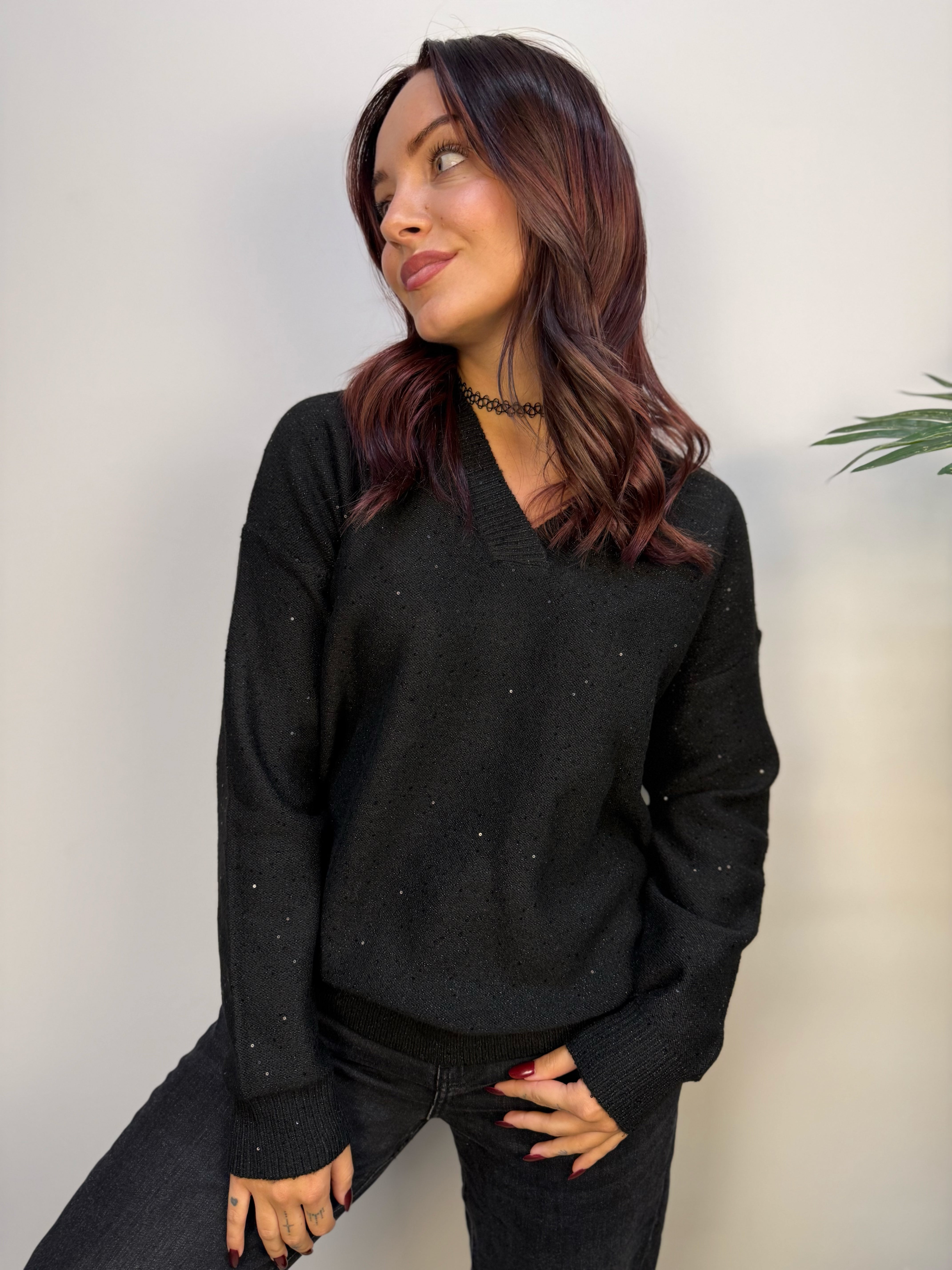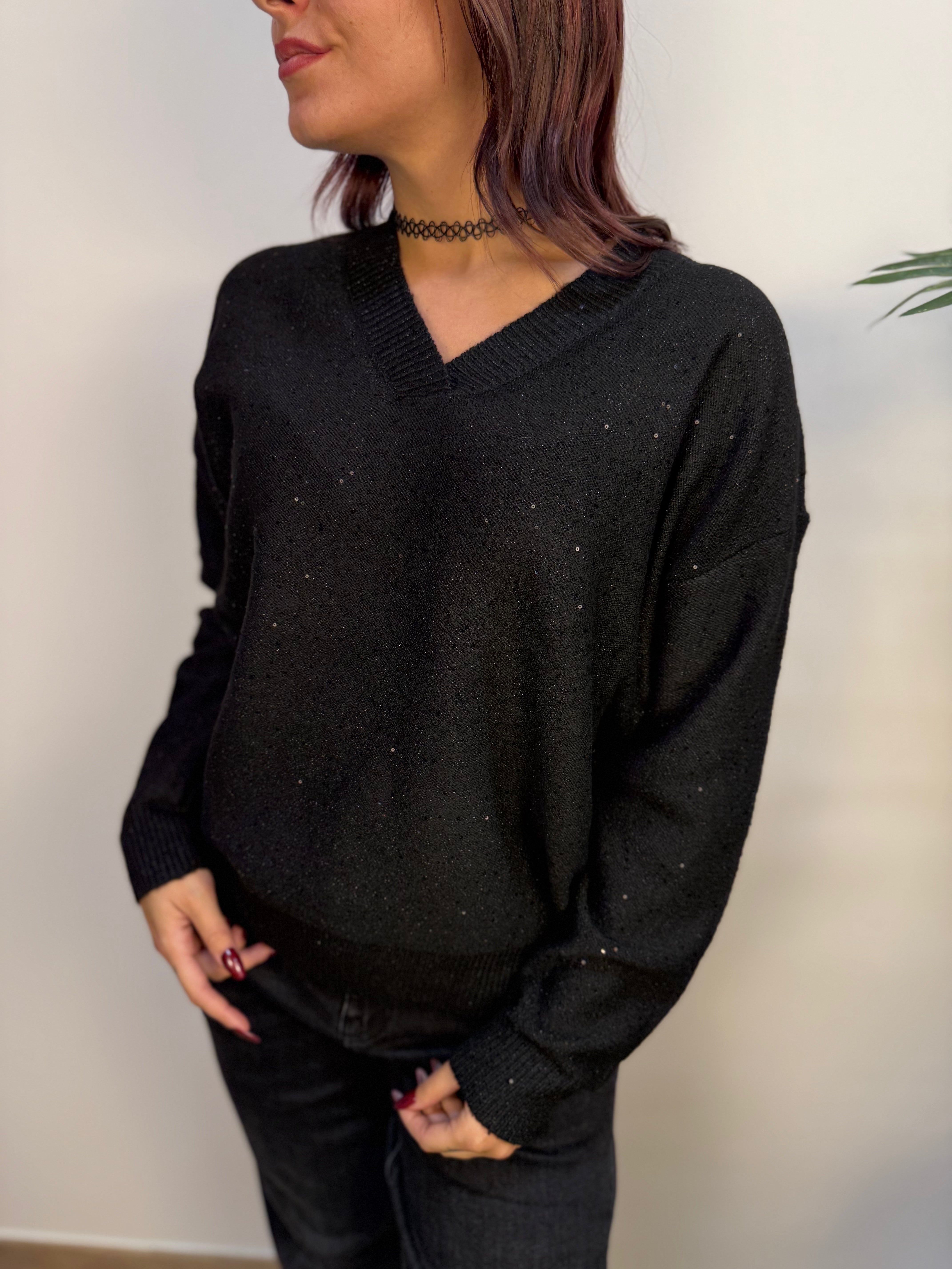 Maglia Artigli leggermente oversize dalla linea morbida, pensata per cadere ampia sui fianchi e offrire una vestibilità confortevole e contemporanea. Realizzata in tinta unita, presenta uno scollo a V e dettagli a costine su scollo, polsini e fascione che valorizzano il design. È impreziosita da micropaillettes che donano luce e movimento al capo, rendendolo elegante e femminile. Il tessuto super elasticizzato e caldo garantisce comfort e morbidezza, ideale per la stagione più fredda. Un capo versatile e luminoso, perfetto per look casual chic o per aggiungere un tocco glamour all’abbigliamento quotidiano.