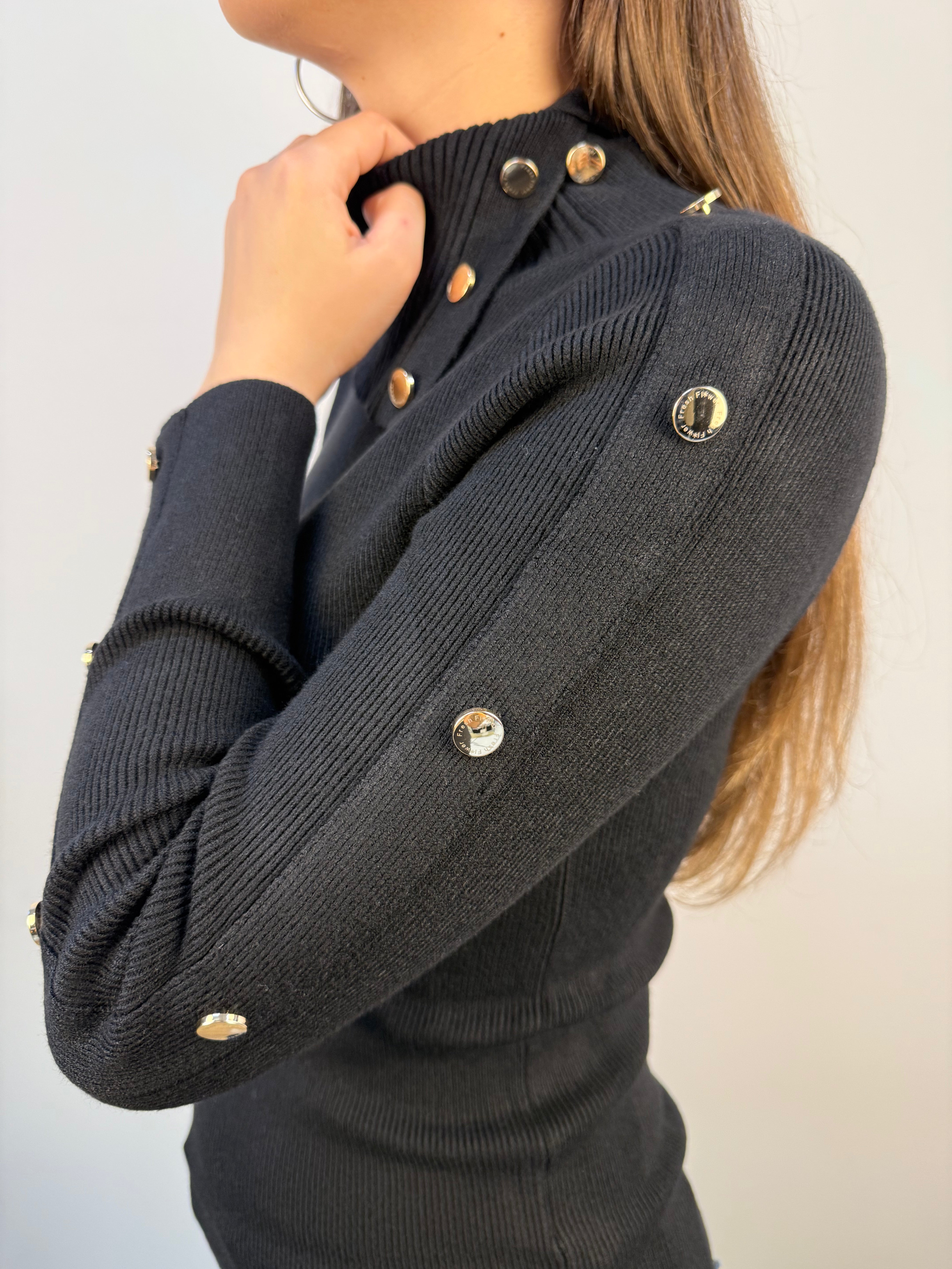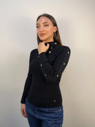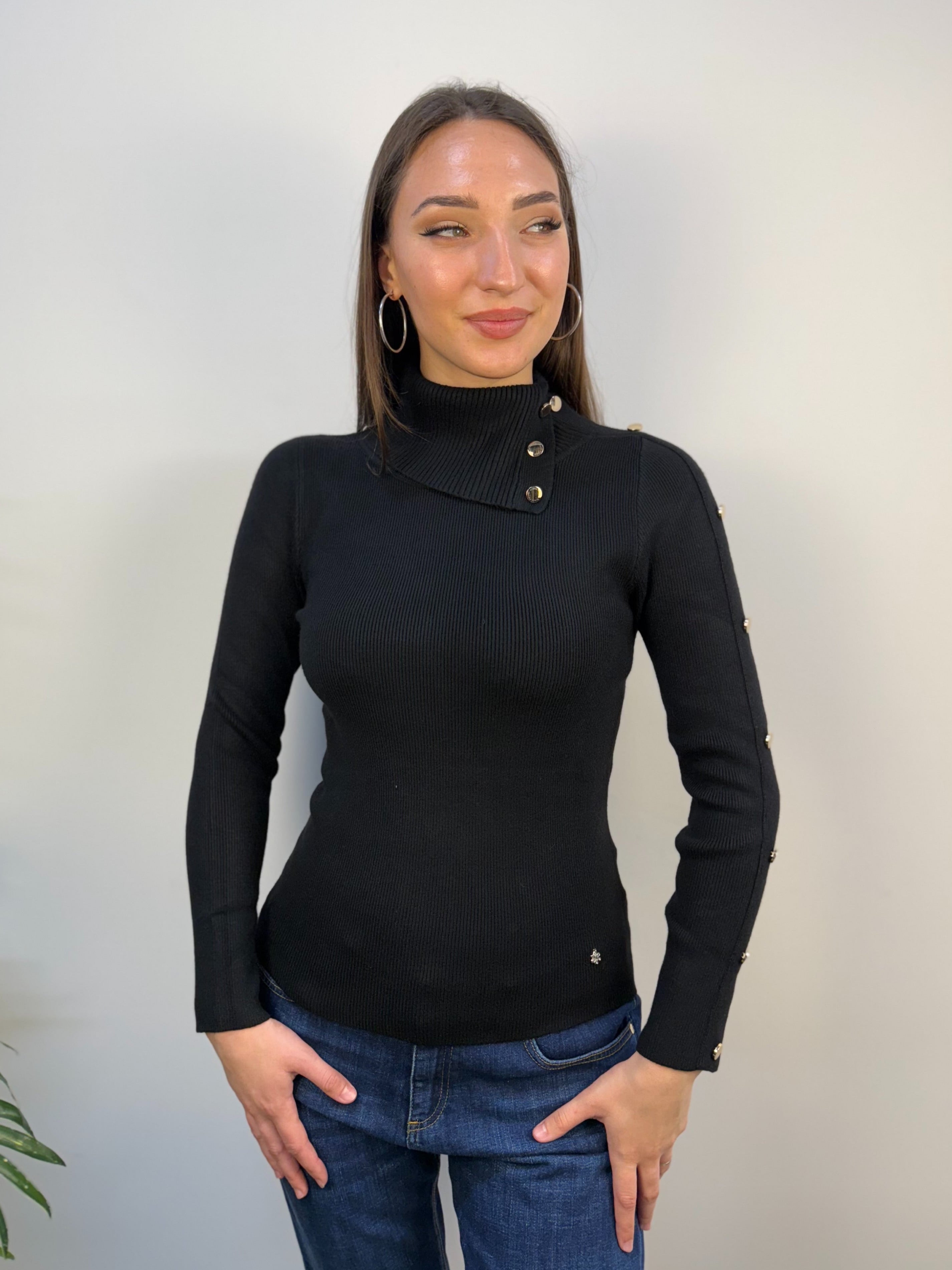 Un classico rivisitato con dettagli sofisticati: questo maglione Fresh Flower a costine in tinta unita unisce calore, comfort ed eleganza in un unico capo. Il collo inglese, strutturato e avvolgente, è impreziosito da bottoni dorati decorativi, presenti anche lungo la manica, per un tocco luminoso e raffinato. Realizzato in una maglia calda ed elasticizzata, segue delicatamente la silhouette offrendo una vestibilità comoda ma femminile. Il design semplice ma curato lo rende perfetto sia per il daywear che per abbinamenti più ricercati. Un capo passe-partout, ideale da indossare con pantaloni sartoriali o gonne midi per uno stile essenziale ma distintivo.