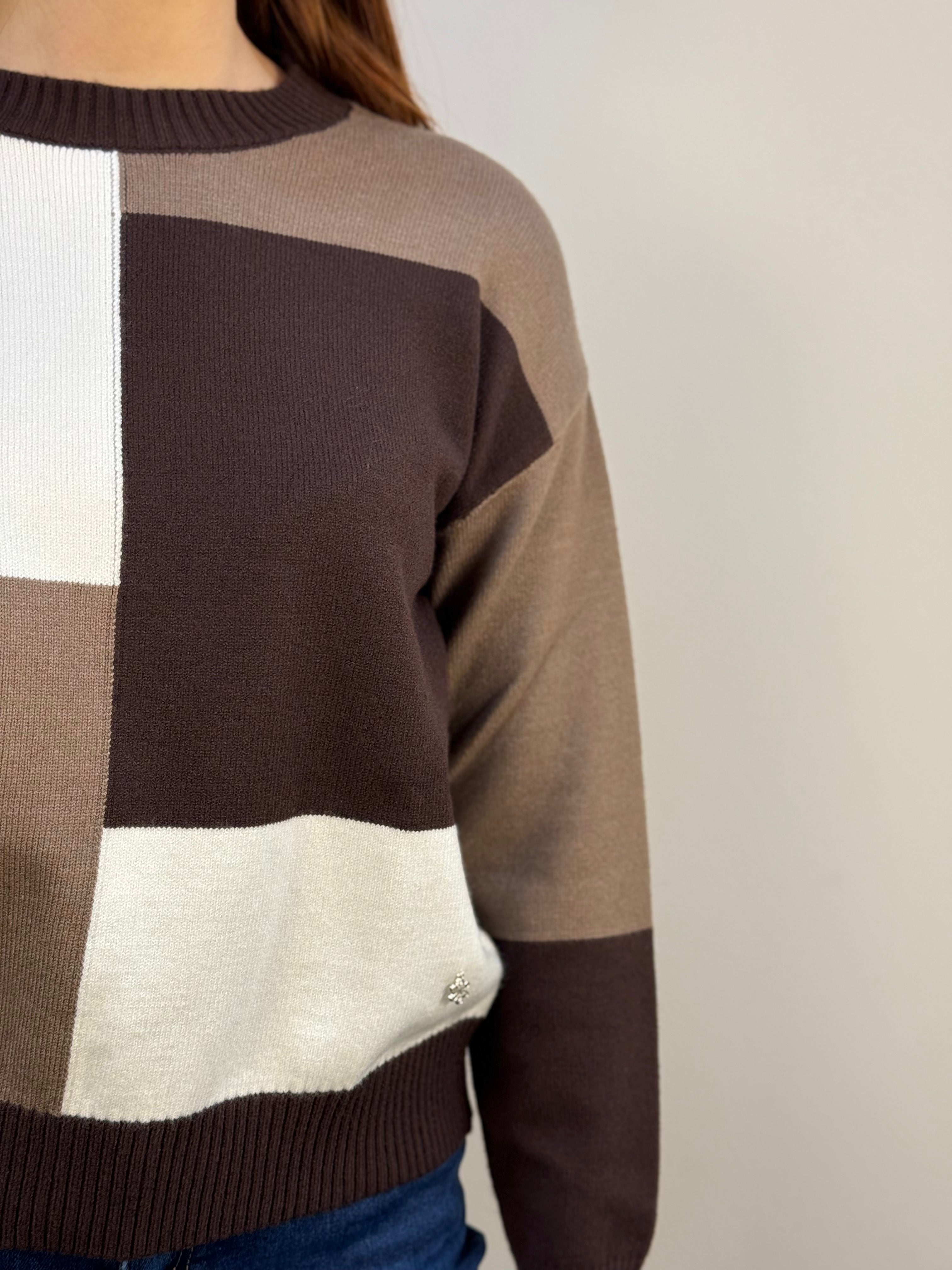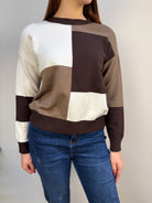 Maglione girocollo Fresh Flower realizzato in un morbido misto viscosa, piacevole al tatto e caldo da indossare. Presenta polsini, scollo e fascione a costine che assicurano una vestibilità confortevole e ben definita. Il design è impreziosito da una fantasia geometrica con taglio centrale, nei raffinati toni del cioccolato, bianco e caffè, per un effetto elegante e contemporaneo. Un capo morbido, caldo e versatile, perfetto per completare look casual o più ricercati con un tocco di stile. Elasticizzato e comodo.