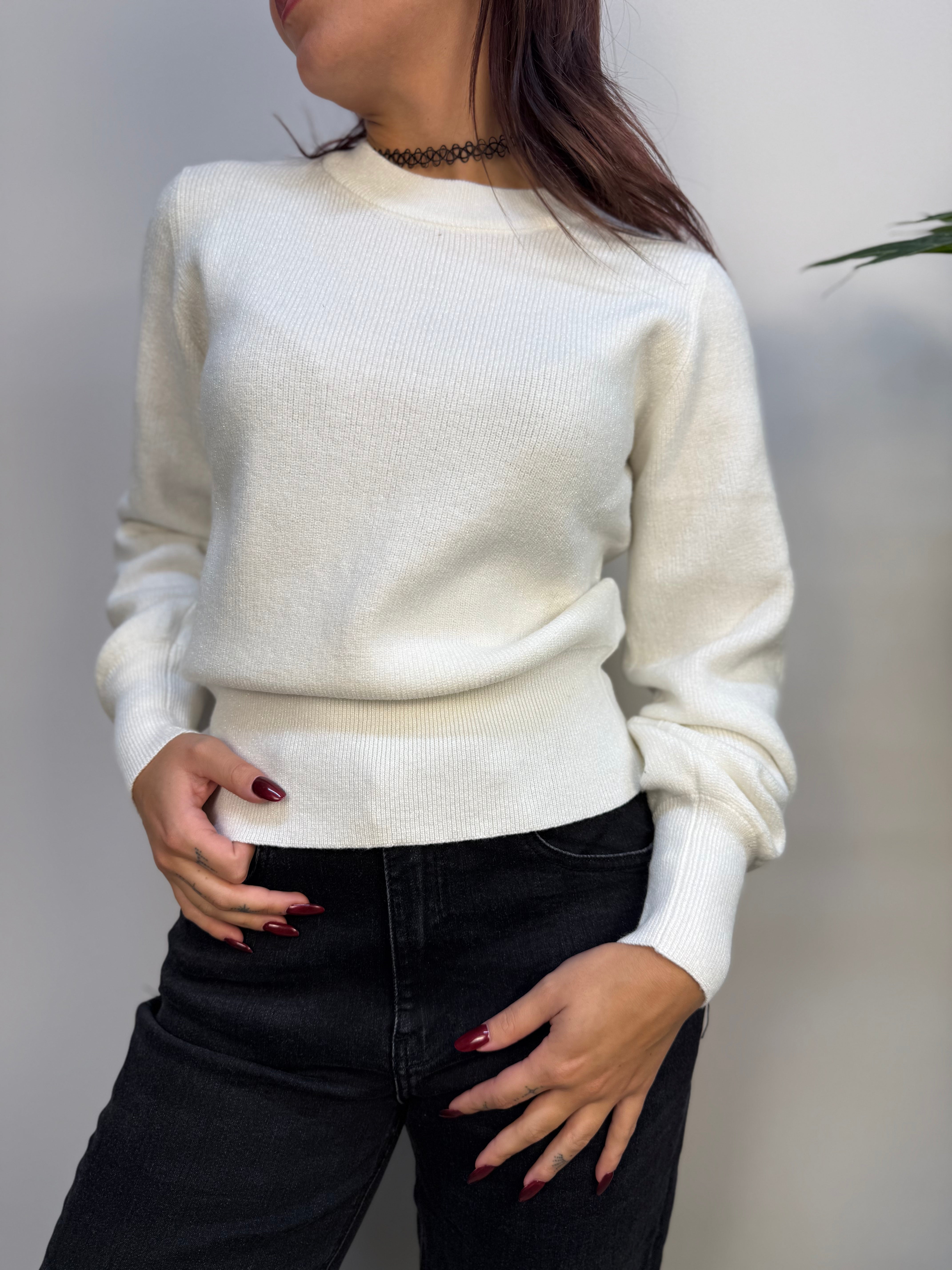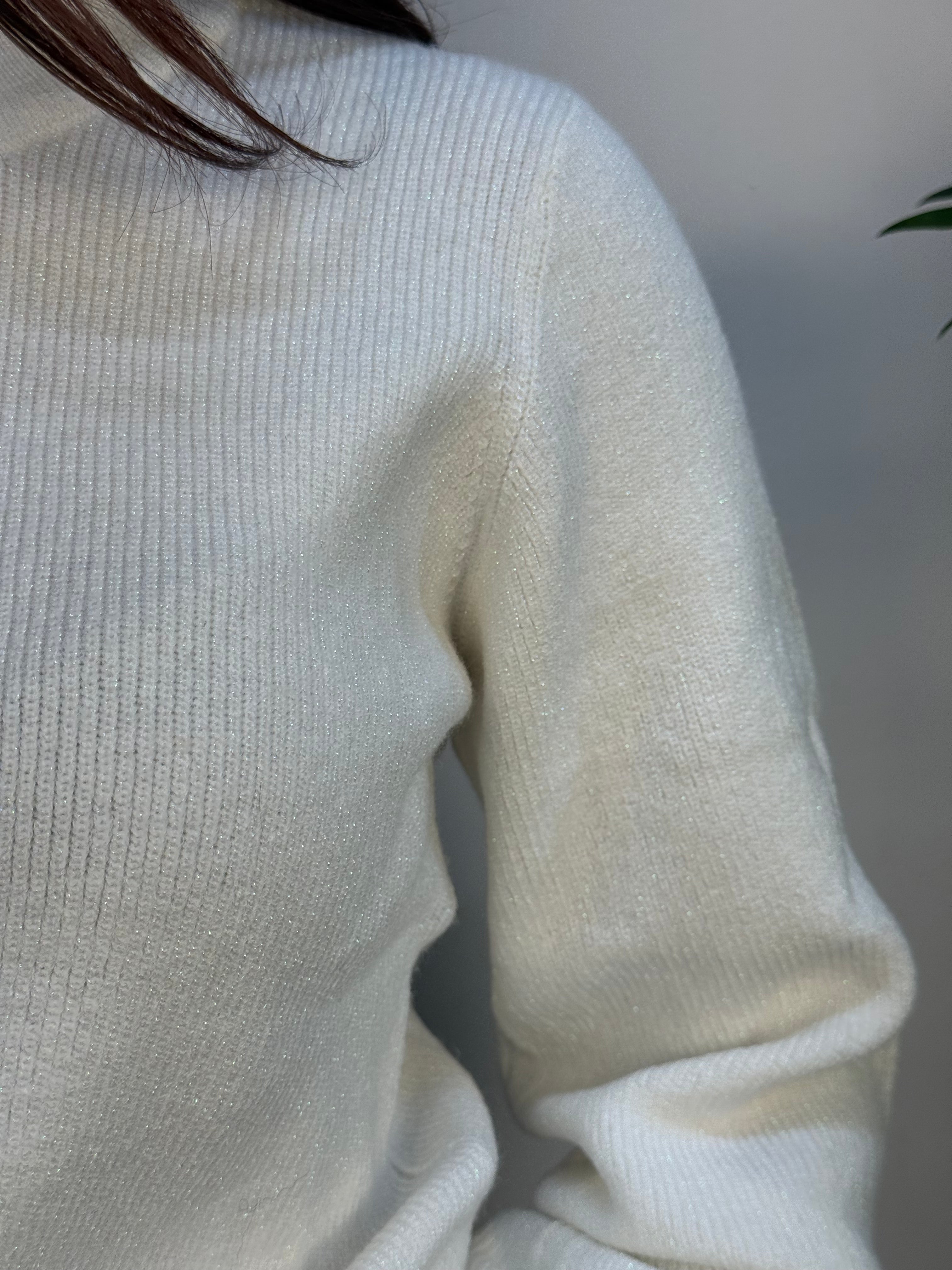 Maglione Blash in morbido misto viscosa, dal design semplice ma d’effetto. Proposto in tinta unita color latte, si distingue per un delicato gioco di luce dato dal filato lurex, che crea un contrasto raffinato e luminoso. I polsini e il fascione a costine, leggermente stretti, assicurano un fit più aderente e una vestibilità confortevole. Il tessuto elasticizzato garantisce morbidezza e libertà di movimento, rendendo il capo perfetto per un look casual-chic dal tocco sofisticato.