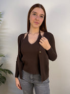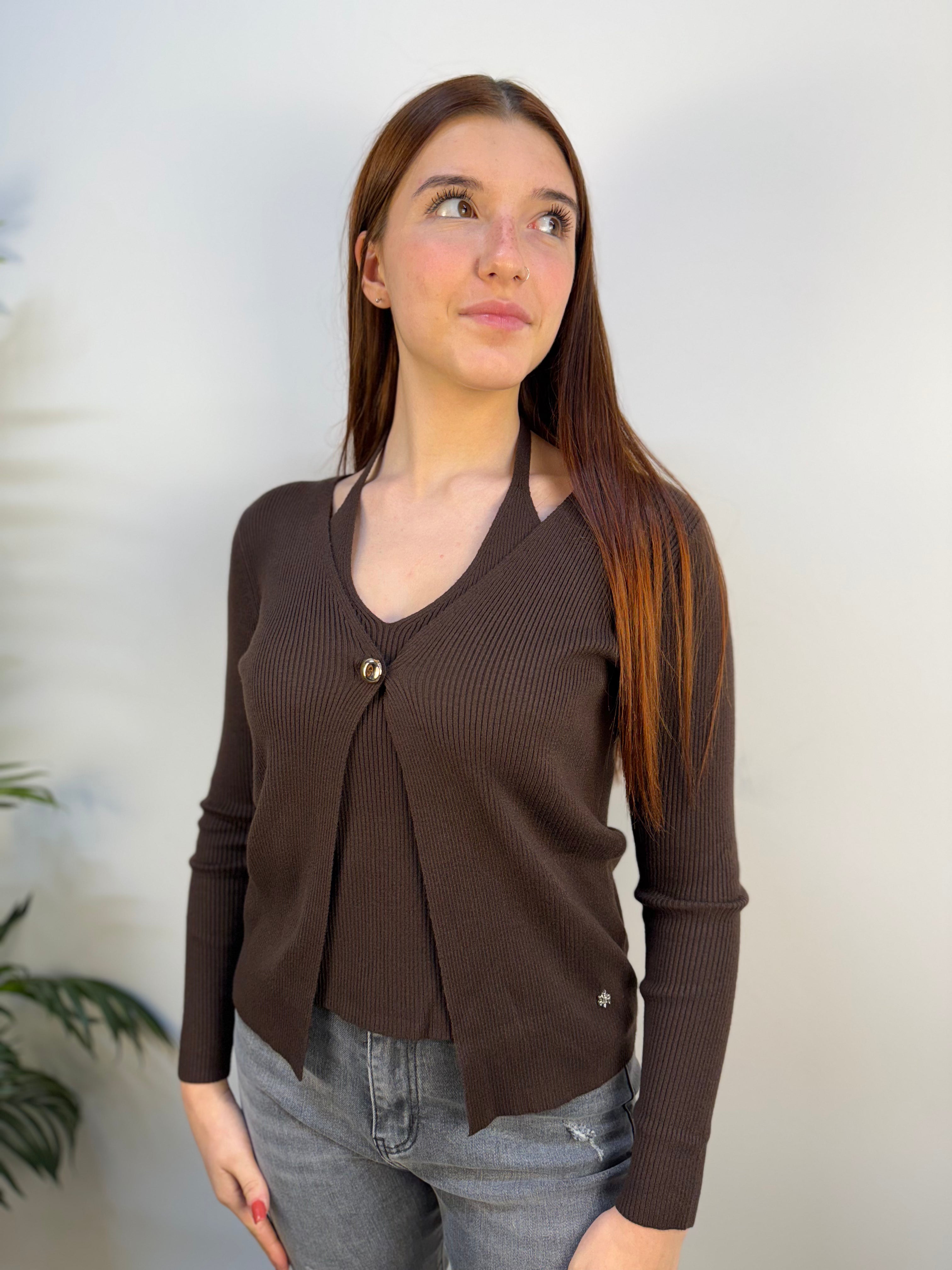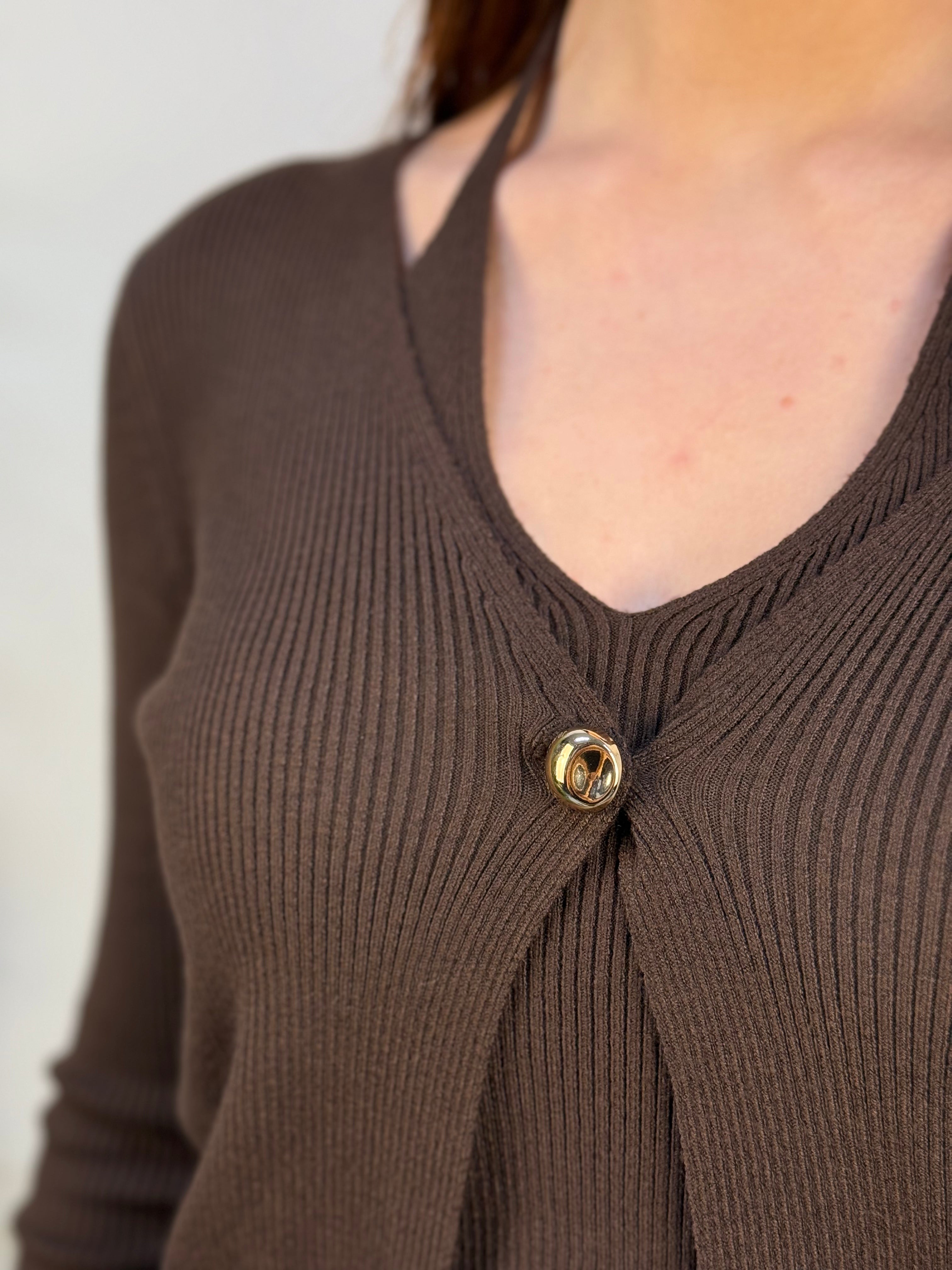 Elegante twin set Fresh Flower in color cioccolato, con effetto canotta e cardigan uniti in un unico capo. Il bottone dorato ad asola sul davanti aggiunge un dettaglio raffinato e luminoso. Realizzato in maglia a costine morbida, calda ed elasticizzata, avvolge la figura con comfort e stile. Un modello versatile e sofisticato, perfetto per look femminili dal gusto contemporaneo.
