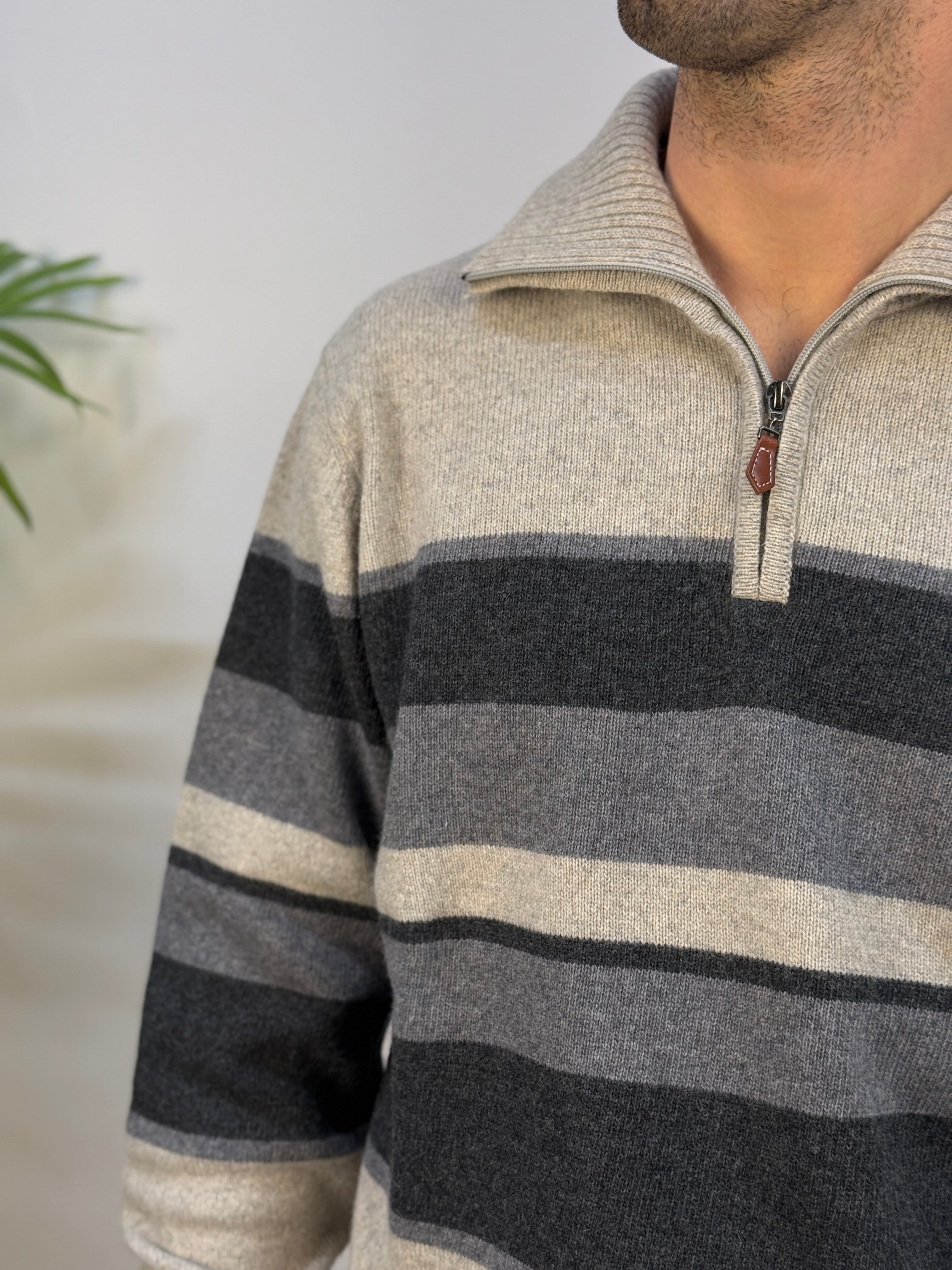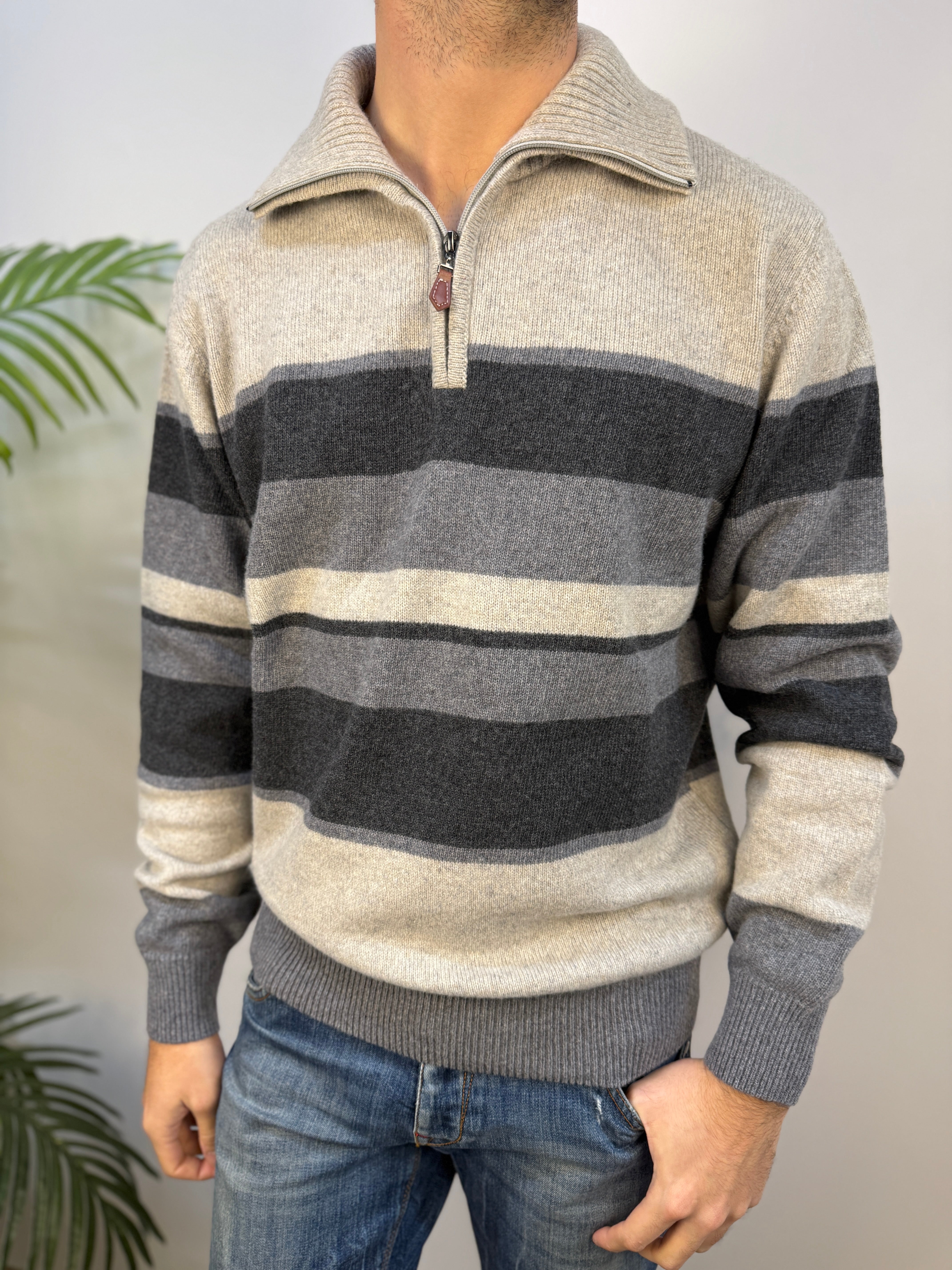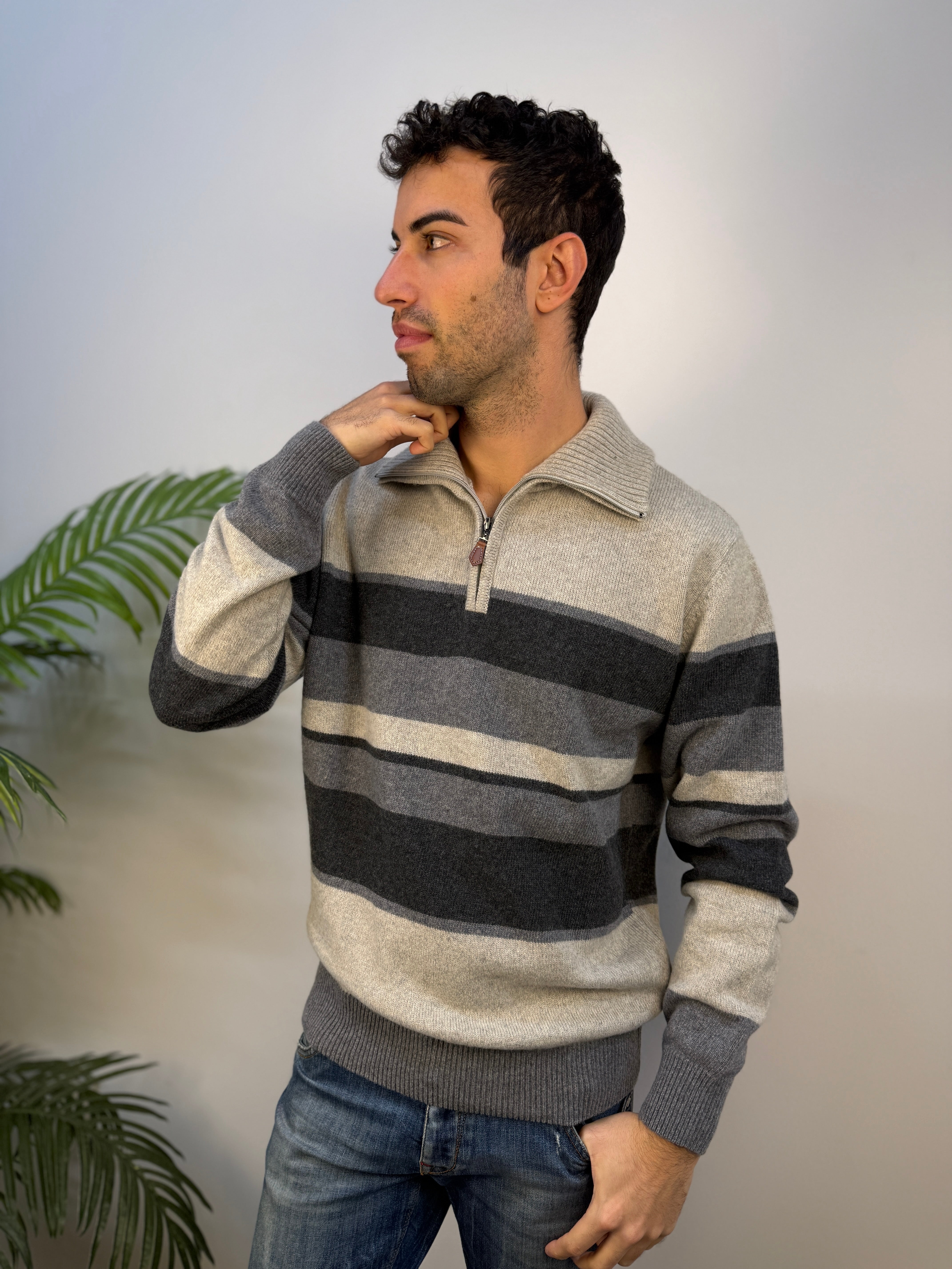 Dolcevita con mezza zip sul colletto, caratterizzato da una fantasia a righe a contrasto. Realizzato in misto lana caldo e leggermente elasticizzato, offre comfort, morbidezza e una vestibilità piacevole. Perfetto per un look casual ma curato durante la stagione fredda.