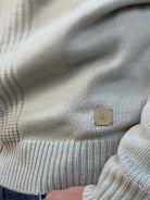 Giacca Gianni Lupo mezzocollo con zip, proposta in elegante variante color ghiaccio, realizzata con lavorazione a trecce grosse alternate a microtrecce. Dotata di taschini frontali con bottone ad asola e patch ricamate a contrasto sui gomiti. Leggermente elasticizzata per un comfort ottimale.