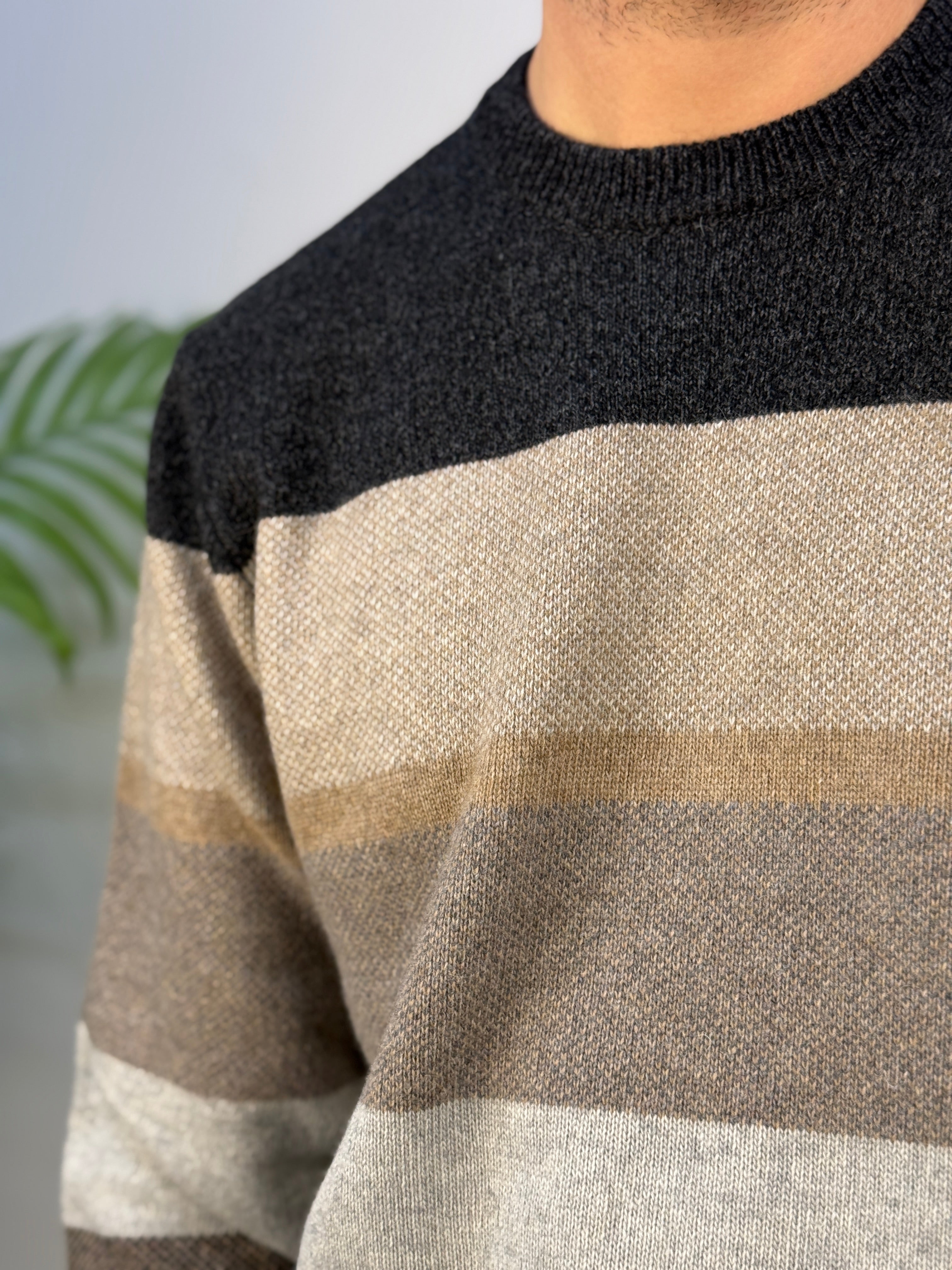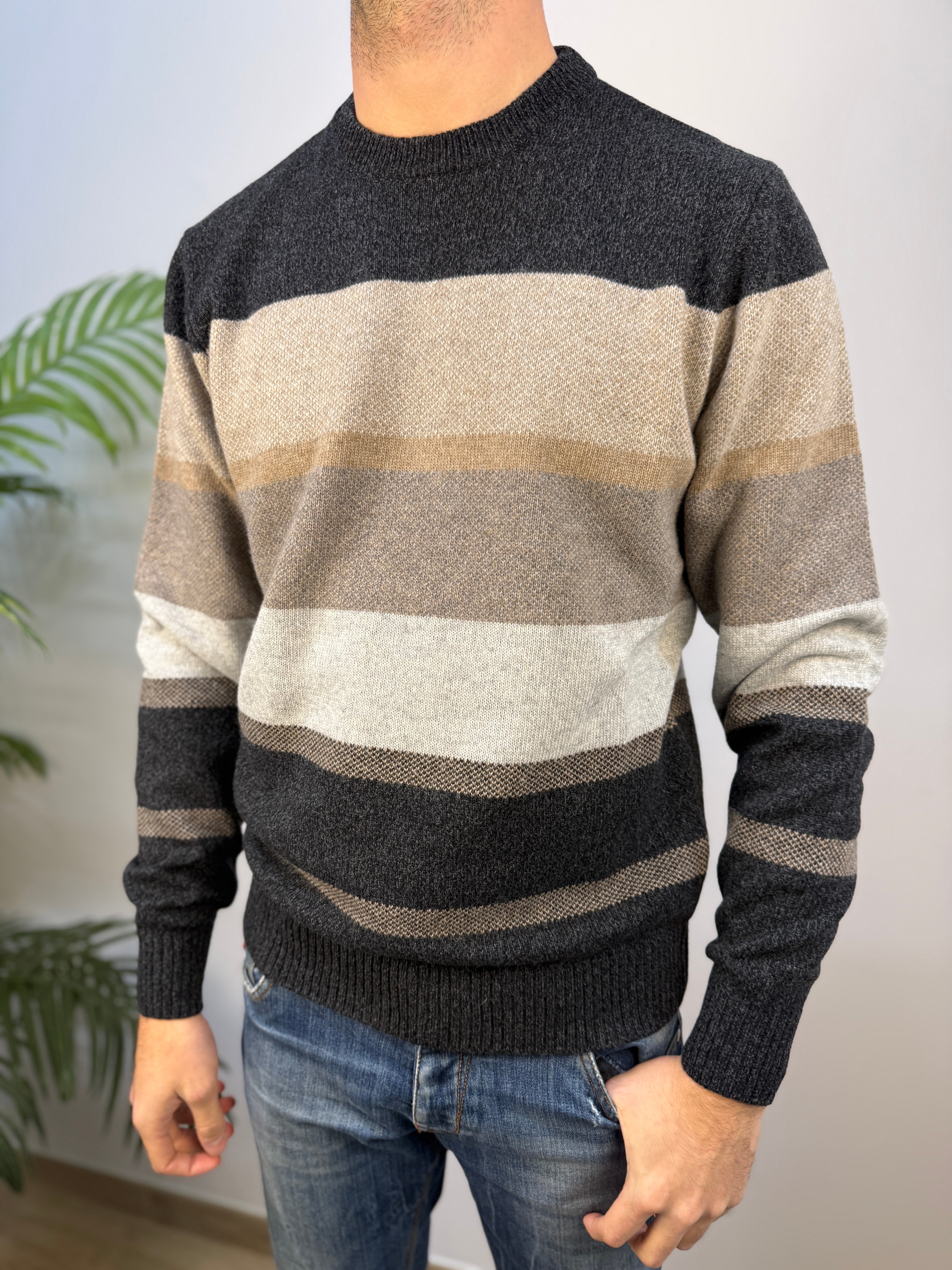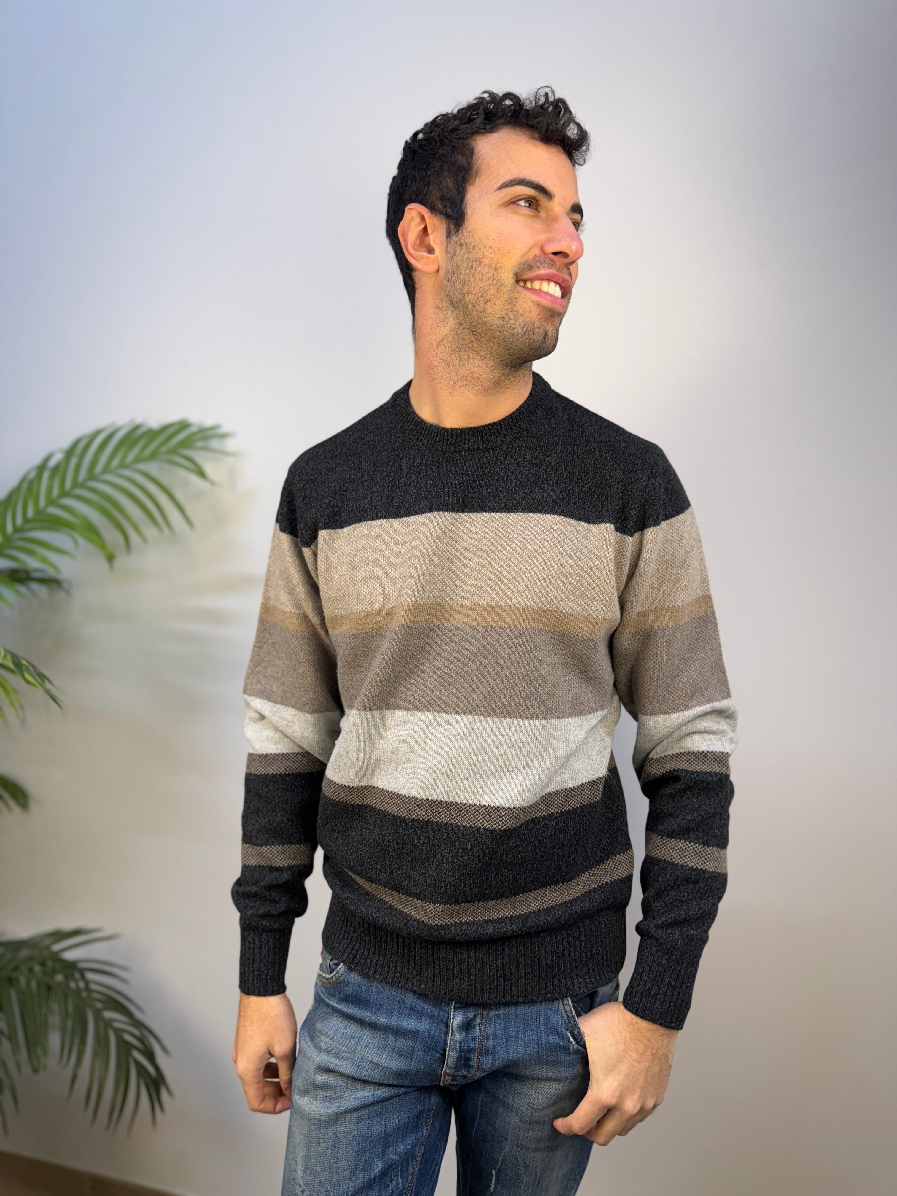 Maglia girocollo in misto lana, calda ed elasticizzata per un comfort ottimale. Caratterizzata da una fantasia a righe a contrasto, combina stile e praticità, perfetta per un look casual ma curato.
