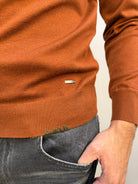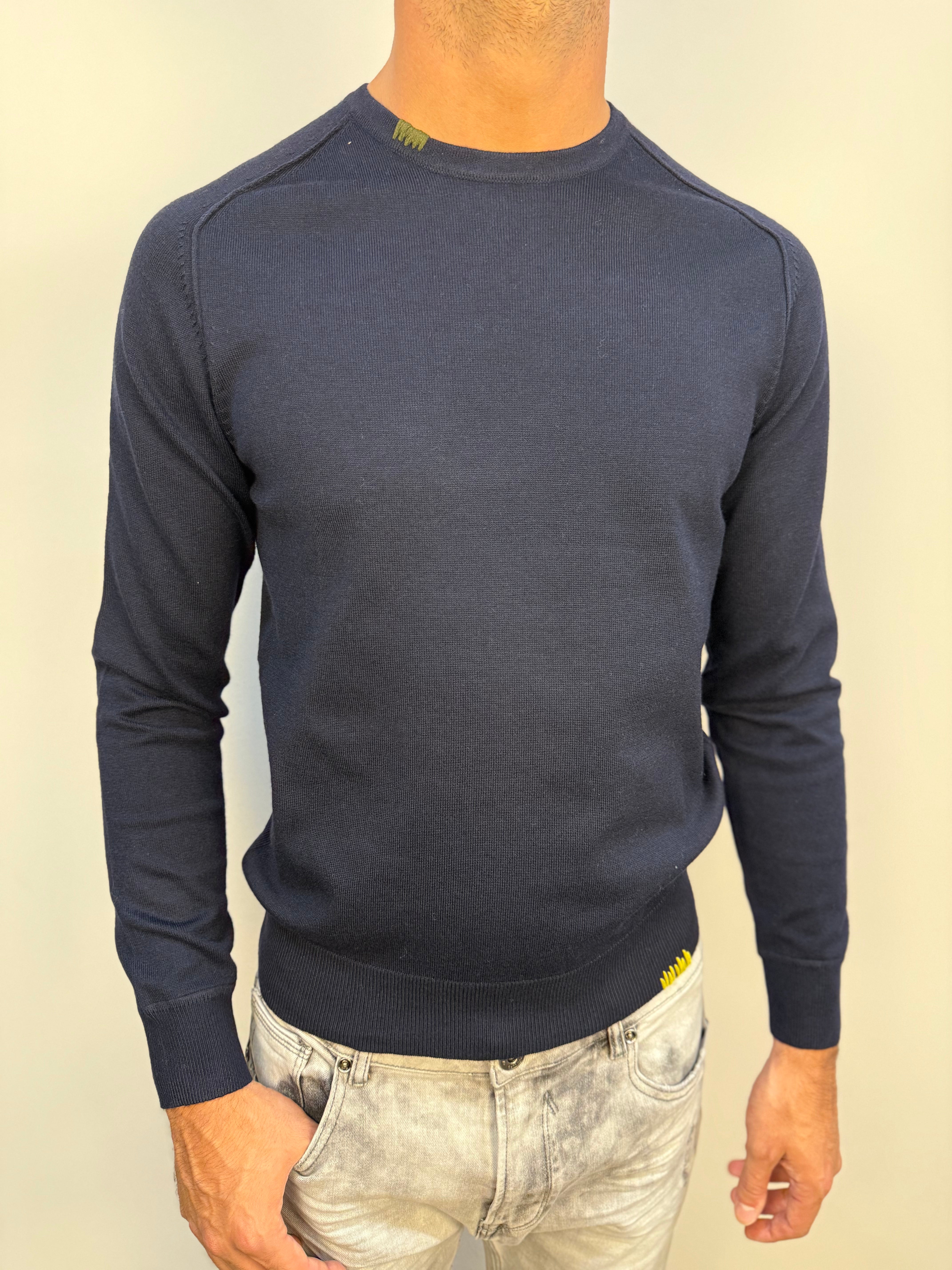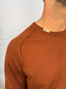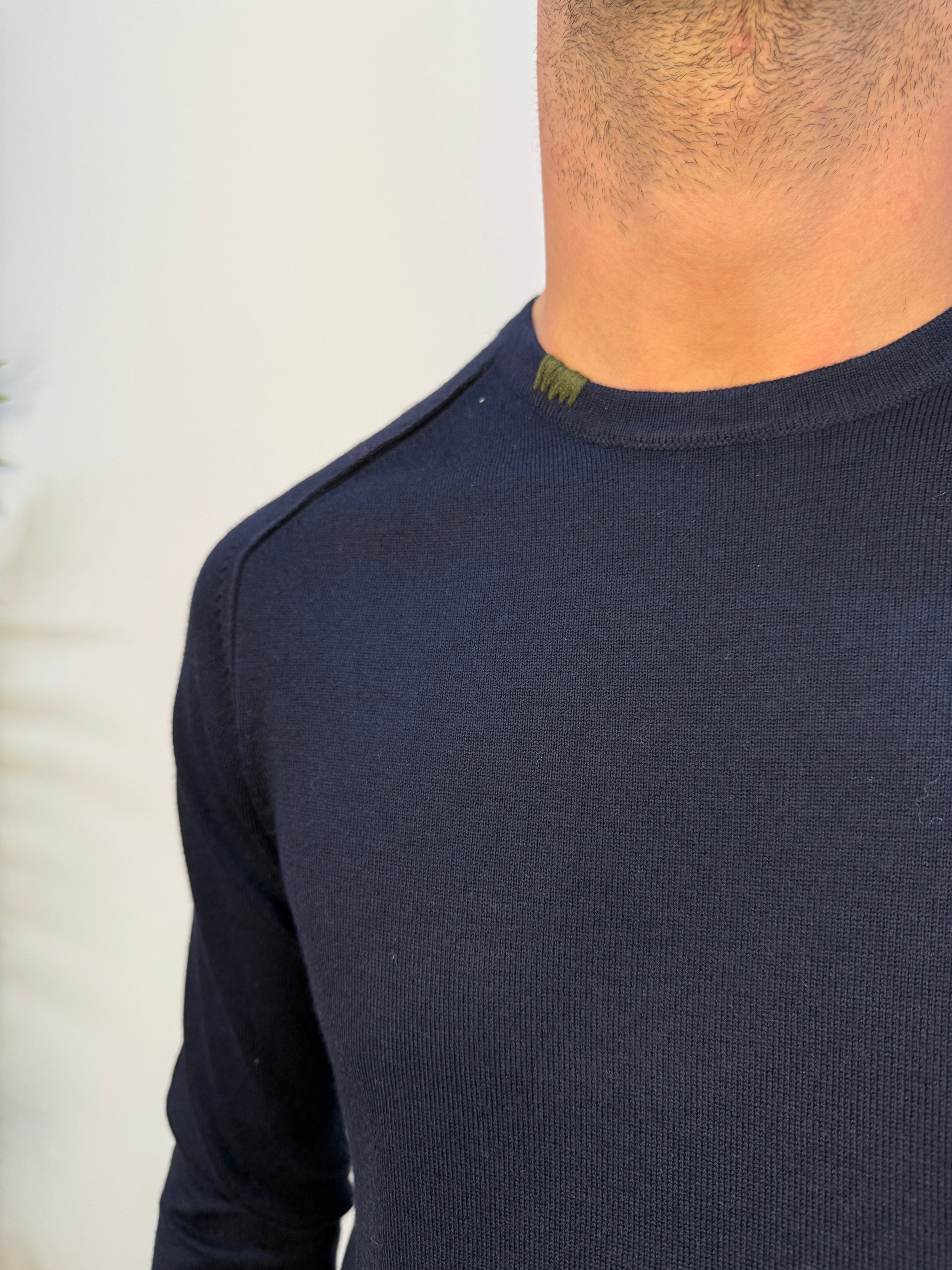 Maglioncino Gianni Lupo girocollo realizzato in tessuto morbido ed elasticizzato, disponibile nelle varianti colore coccio e navy. La tinta unita è arricchita da delicati dettagli ricamati a contrasto sullo scollo e sul fascione, che aggiungono un tocco di carattere senza appesantire il design. Scollo, fascione e polsini sono rifiniti a costine per una vestibilità confortevole e curata. Il capo è completato da una toppa al gomito con solo ricamo attorno, che dona un dettaglio raffinato e originale.