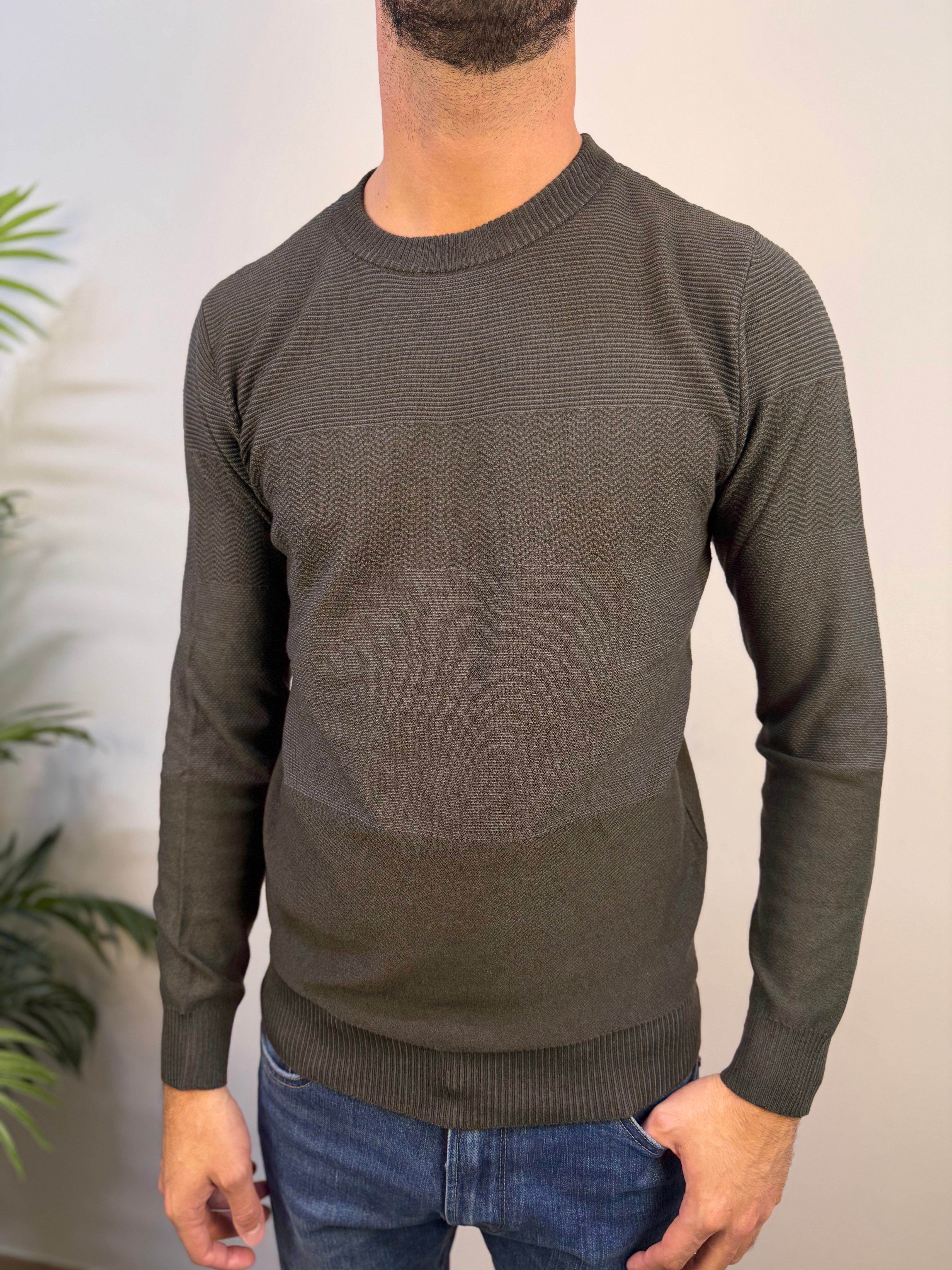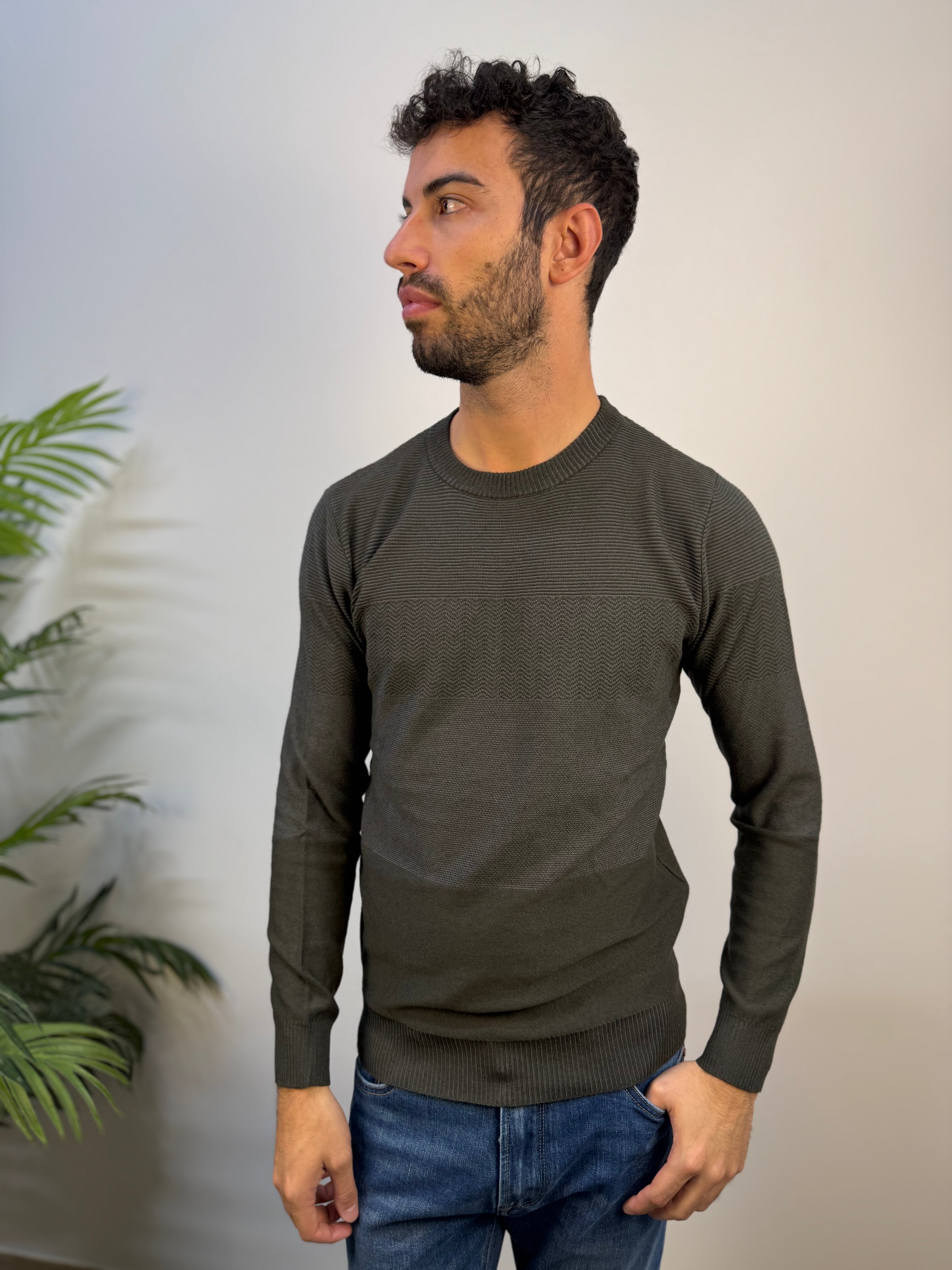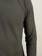 Maglia Consenso girocollo in verde foresta, realizzata in una leggera trama geometrica tono su tono che aggiunge profondità e raffinatezza al capo. Il collo, i polsini e il fascione a costine assicurano una vestibilità definita e confortevole. Il tessuto, caldo ma sottile, offre il giusto equilibrio tra eleganza e praticità, ideale per uno stile curato in ogni occasione.