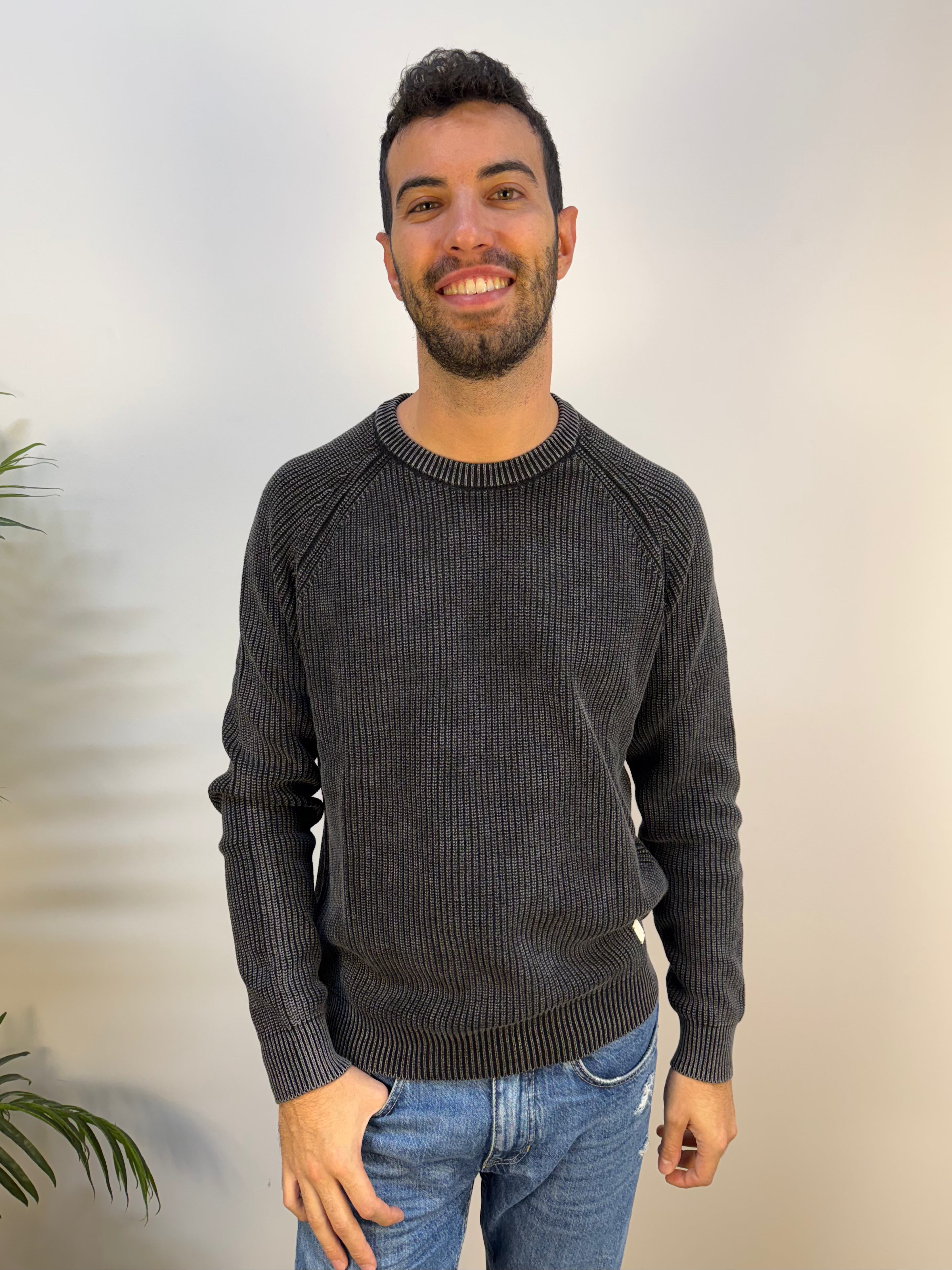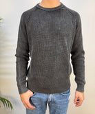 Maglia Gianni Lupo in cotone elasticizzato con fascione, polsini e scollo a costine. La lavorazione a trecce e il filo bianco nel tessuto donano un tocco raffinato e distintivo.