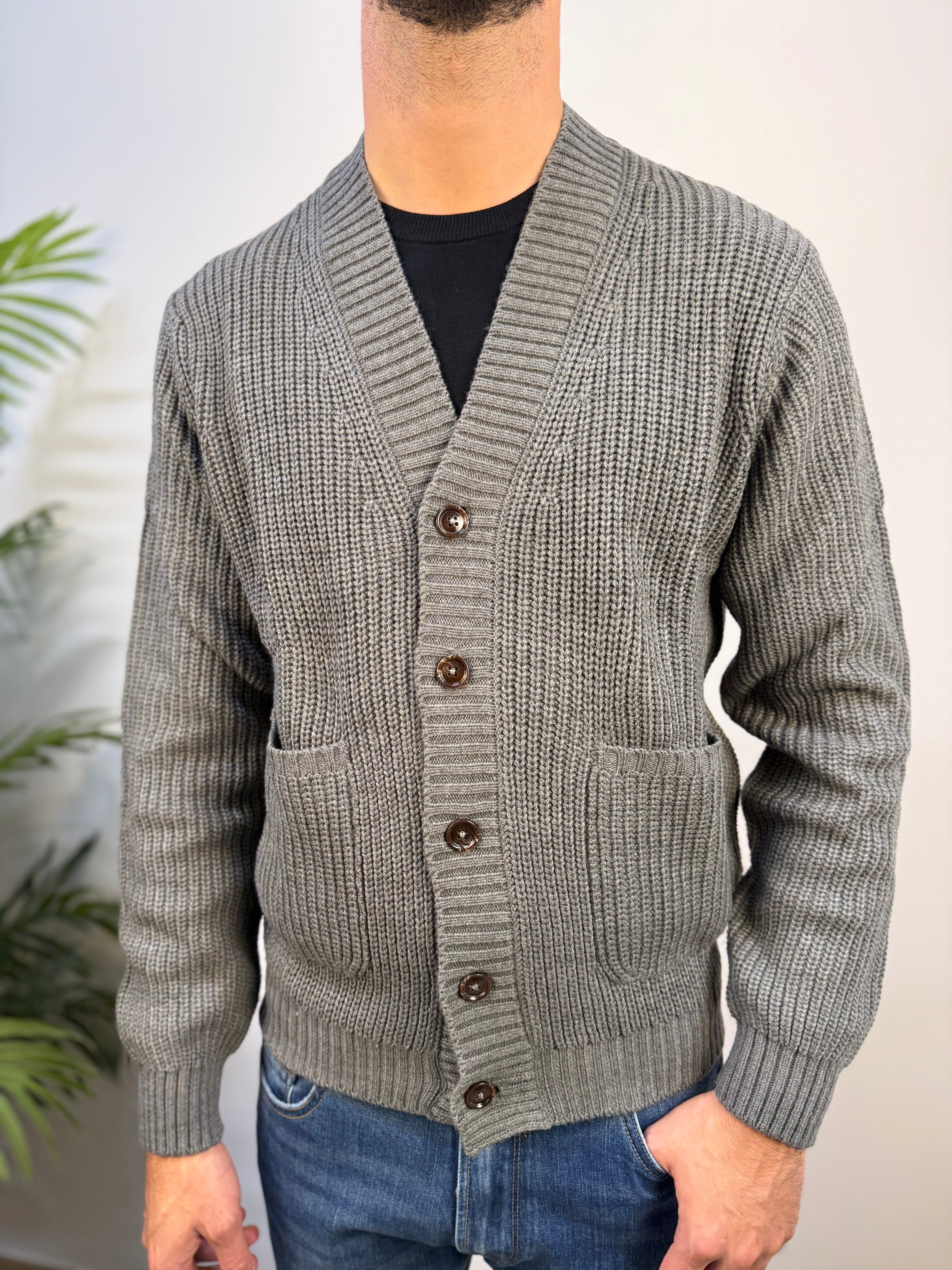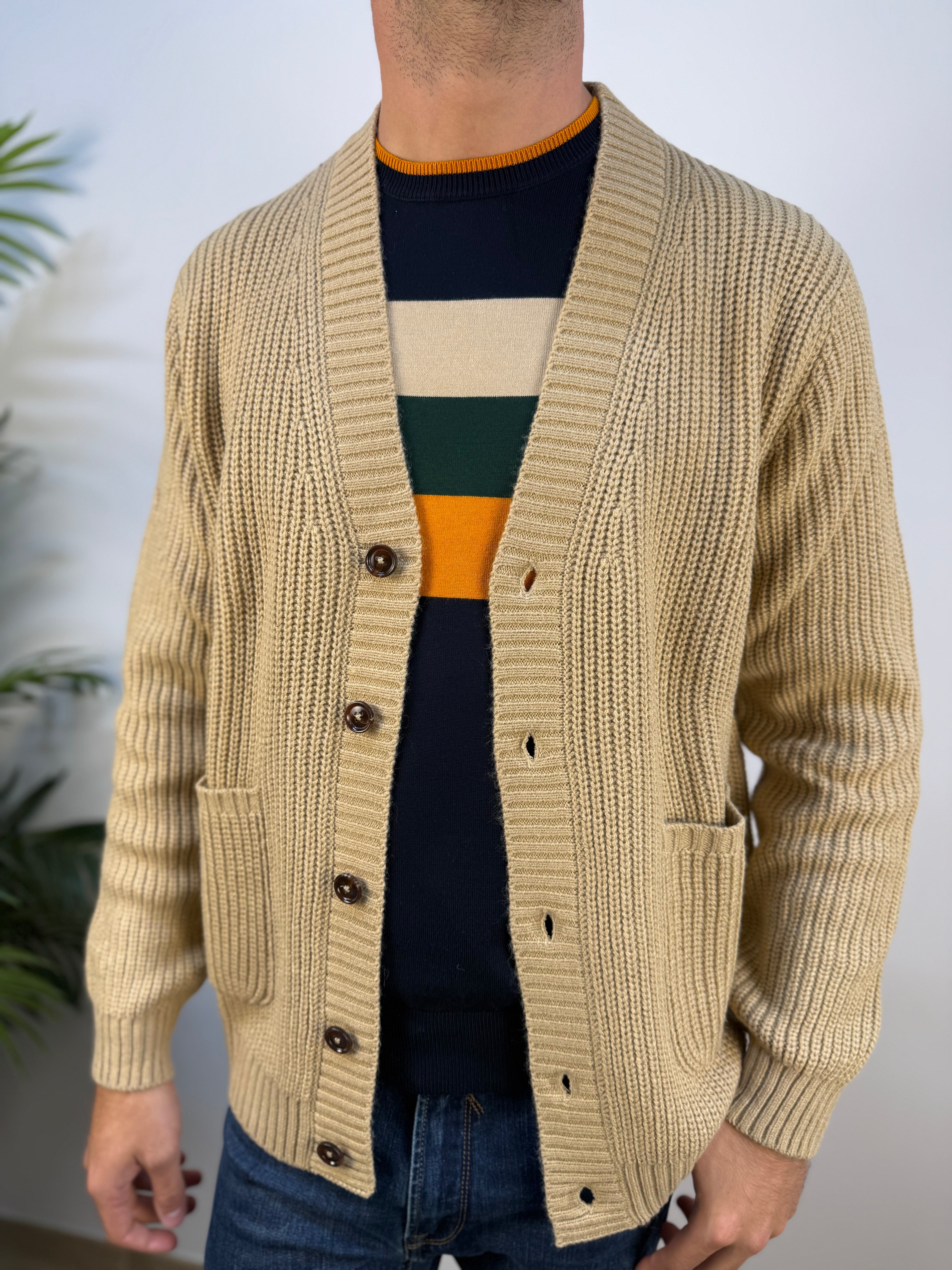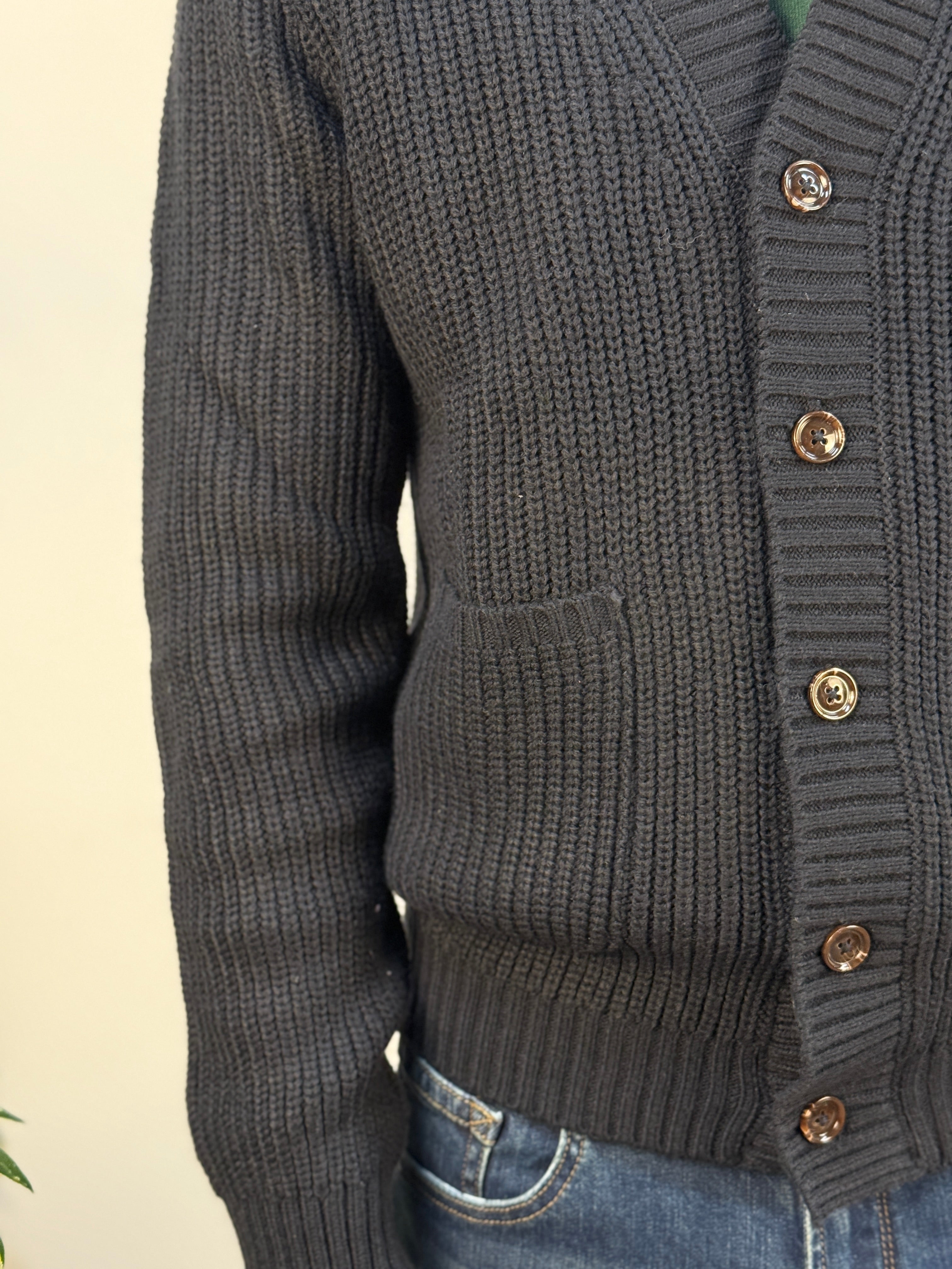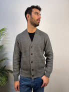 Cardigan Urban Ring da uomo con scollo a V e chiusura con bottoni ad asola, realizzato in un filato leggermente elasticizzato che garantisce comfort e una vestibilità impeccabile. Proposto nel tono marrone scuro, questo modello si distingue per il suo stile elegante, caldo e raffinato, ideale per completare look casual chic o più formali. Il piccolo logo ricamato tono su tono sul fondo aggiunge un dettaglio discreto ma distintivo. Disponibile nelle varianti grigio, navy e cammello, per adattarsi a diversi gusti e occasioni.
