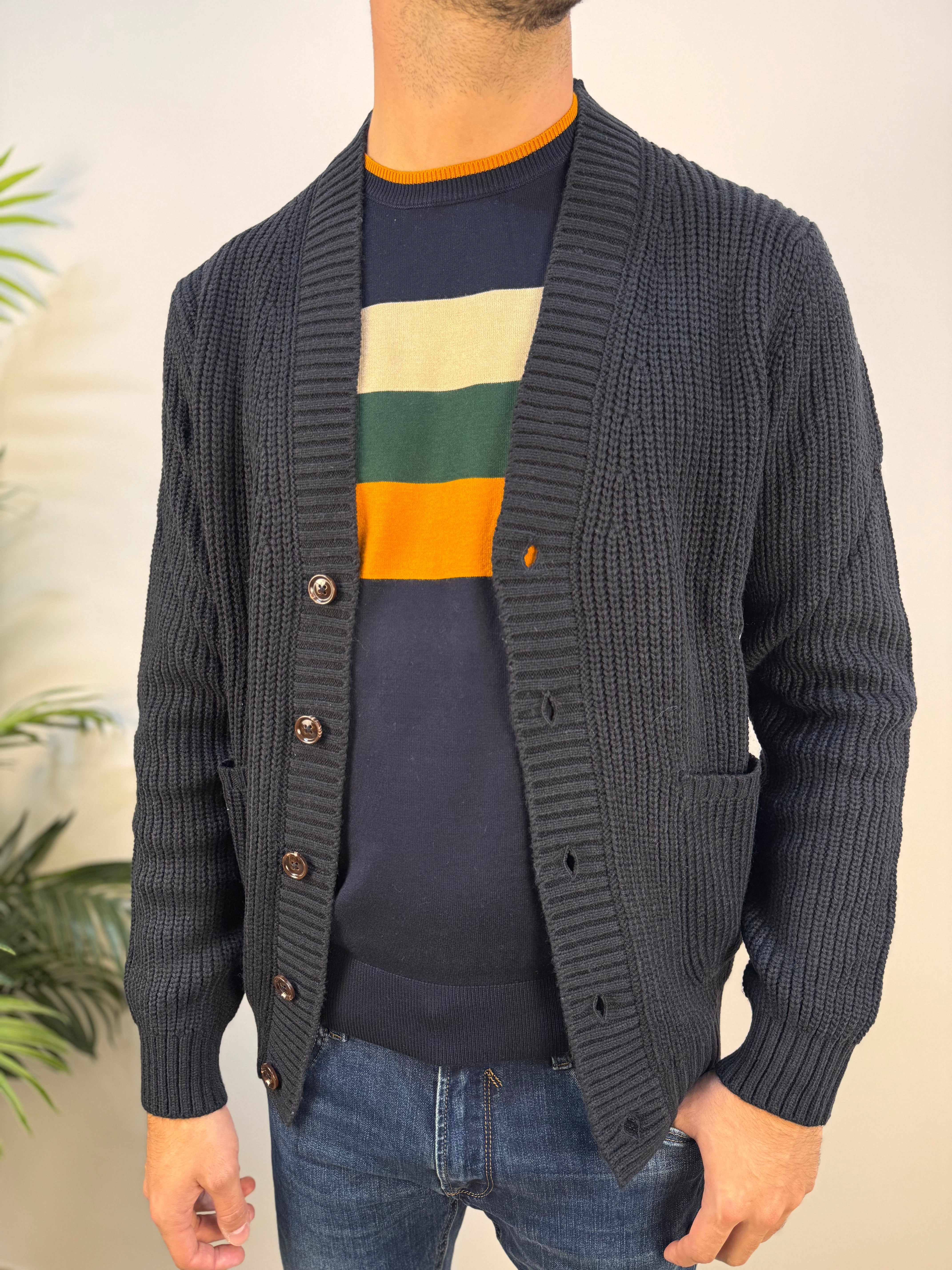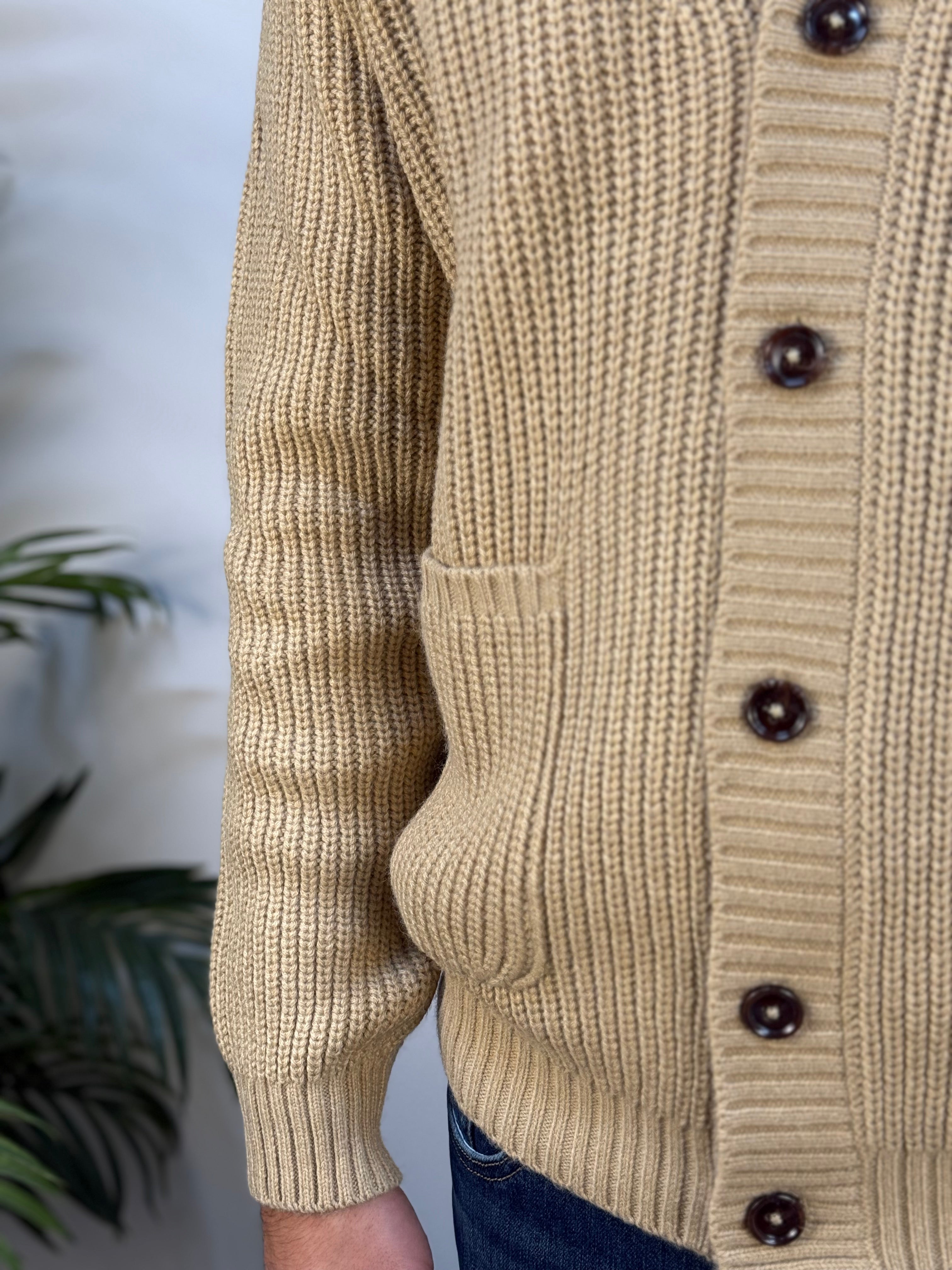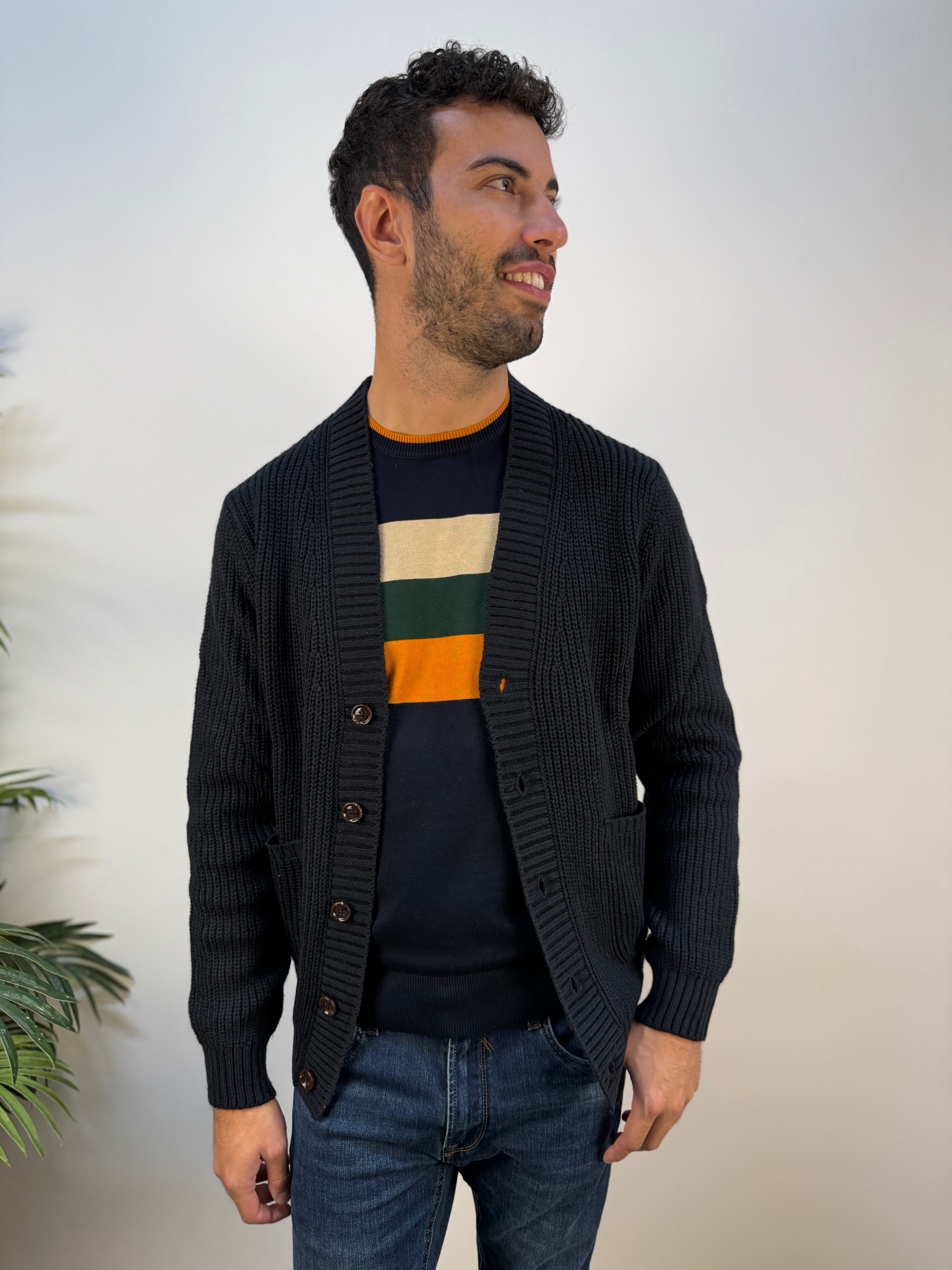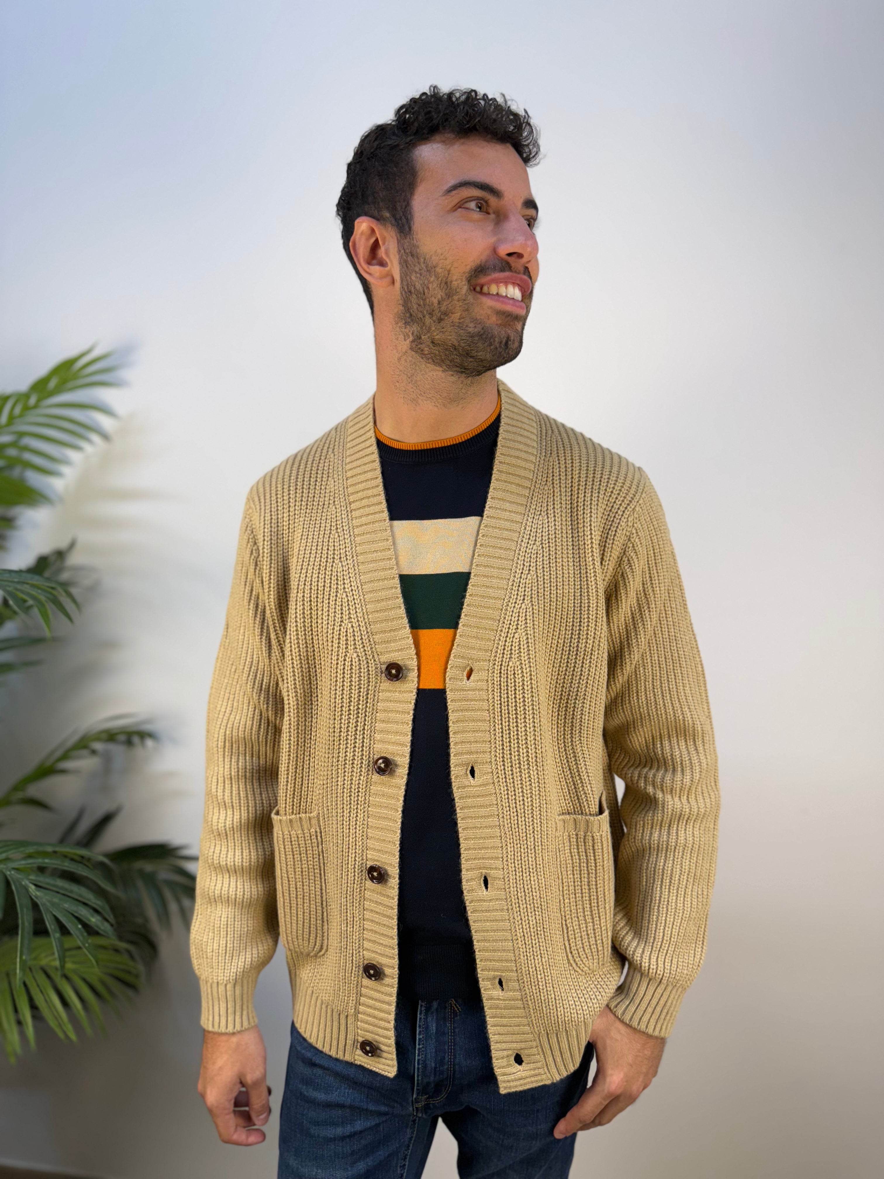 Cardigan Urban Ring da uomo con scollo a V e chiusura con bottoni ad asola, realizzato in un filato leggermente elasticizzato che garantisce comfort e una vestibilità impeccabile. Proposto nel tono marrone scuro, questo modello si distingue per il suo stile elegante, caldo e raffinato, ideale per completare look casual chic o più formali. Il piccolo logo ricamato tono su tono sul fondo aggiunge un dettaglio discreto ma distintivo. Disponibile nelle varianti grigio, navy e cammello, per adattarsi a diversi gusti e occasioni.