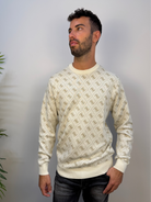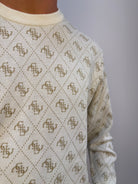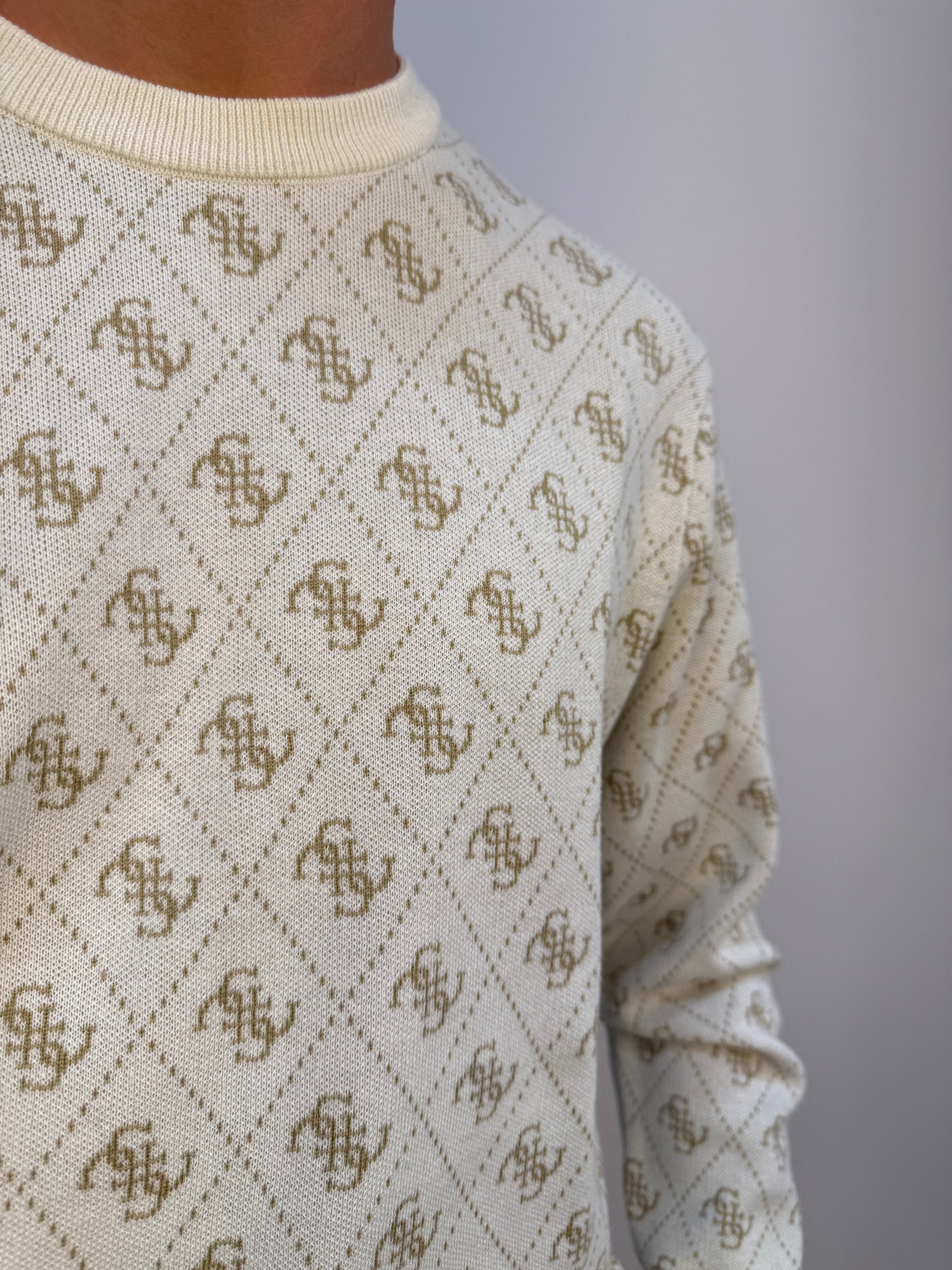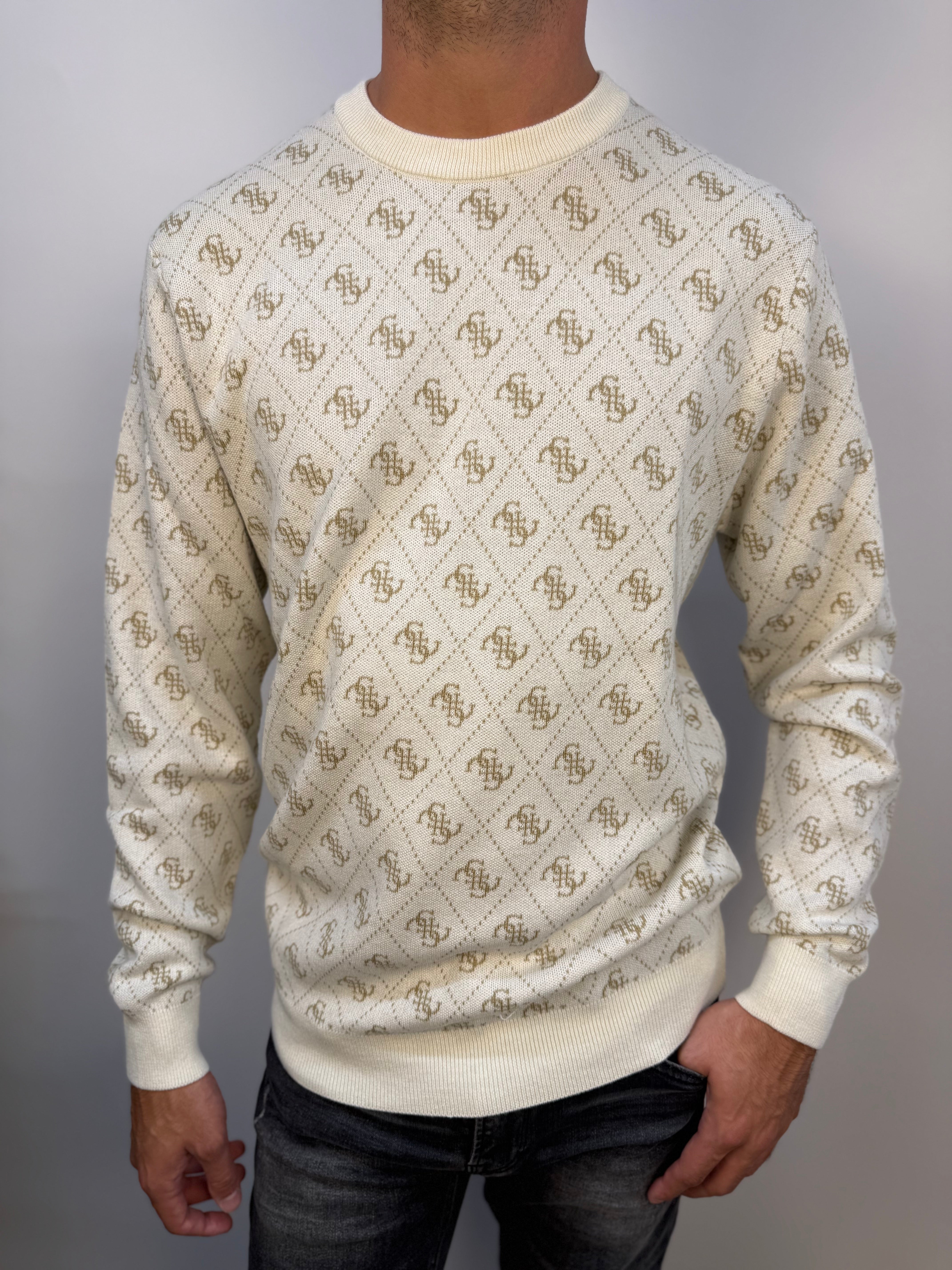 Maglione Guess girocollo in color panna della linea Golf Club, arricchito da una sofisticata trama 4G all over in tono cammello, che dona al capo un’eleganza sobria e ricercata. Realizzato in un tessuto morbido e caldo, è pensato per offrire il massimo comfort durante la stagione fredda. I polsini, il fascione sul fondo e lo scollo sono rifiniti a costine, per una tenuta impeccabile e una vestibilità regolare che si adatta con naturalezza alla silhouette. Un capo delicato e raffinato, perfetto per un look curato e senza tempo.