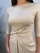 Elegante nella sua semplicità, questo abito Rinascimento in morbida viscosa color beige unisce comfort e stile con dettagli studiati per valorizzare la figura. Il taglio sfiancato accompagna le forme con delicatezza, mentre le maniche al gomito e lo scollo rotondo lo rendono adatto a diverse occasioni. L’effetto arricciato sulla zona della pancia crea un raffinato gioco di drappeggi, completato da un piccolo spacco centrale nella gonna che aggiunge movimento e femminilità. Un capo versatile da indossare con facilità, dal giorno alla sera.