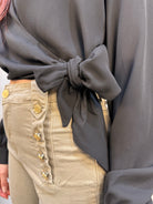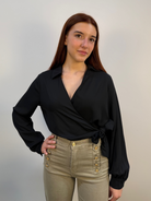 Blusa Akè leggera e femminile in tessuto velato, caratterizzata da uno scollo a V che valorizza la silhouette. Il colletto a camicia aggiunge un tocco classico e raffinato al design. La chiusura ad intreccio sul fianco si chiude delicatamente con un fiocco, donando movimento e originalità al capo. Il fondo è arricchito da un elastico che assicura una vestibilità confortevole e aderente, mentre i bottoni ai polsini completano il look con un dettaglio curato e sofisticato.