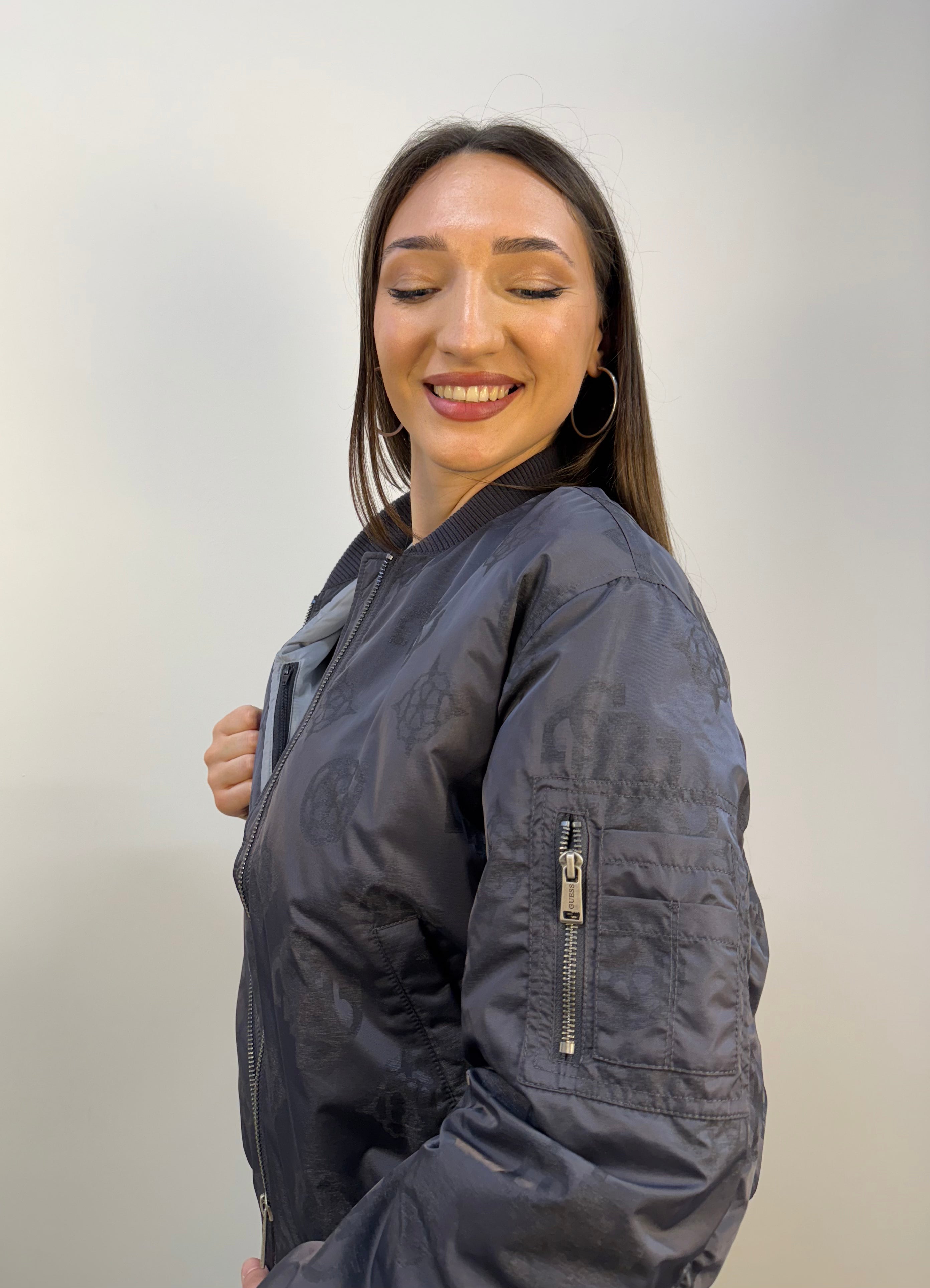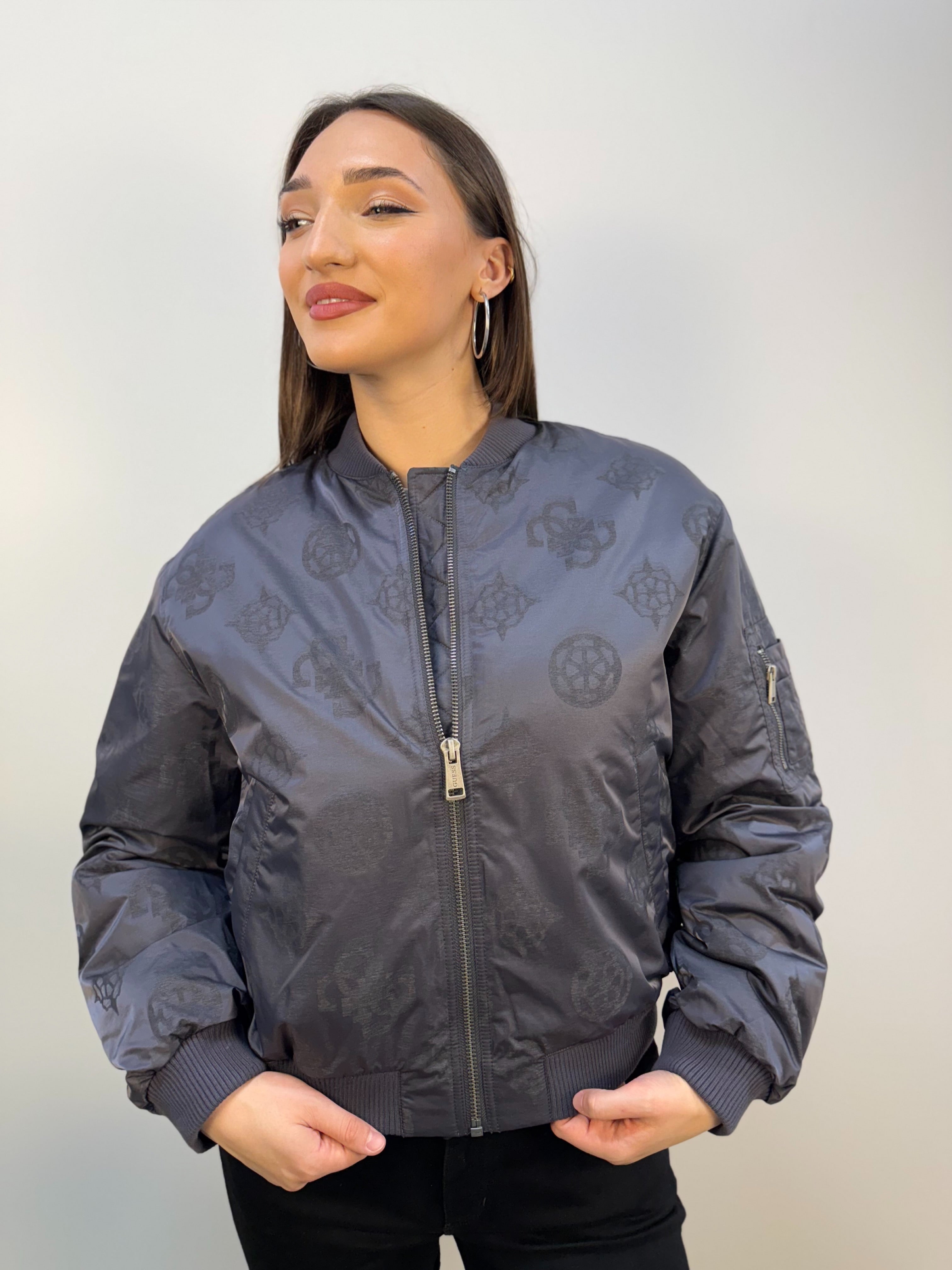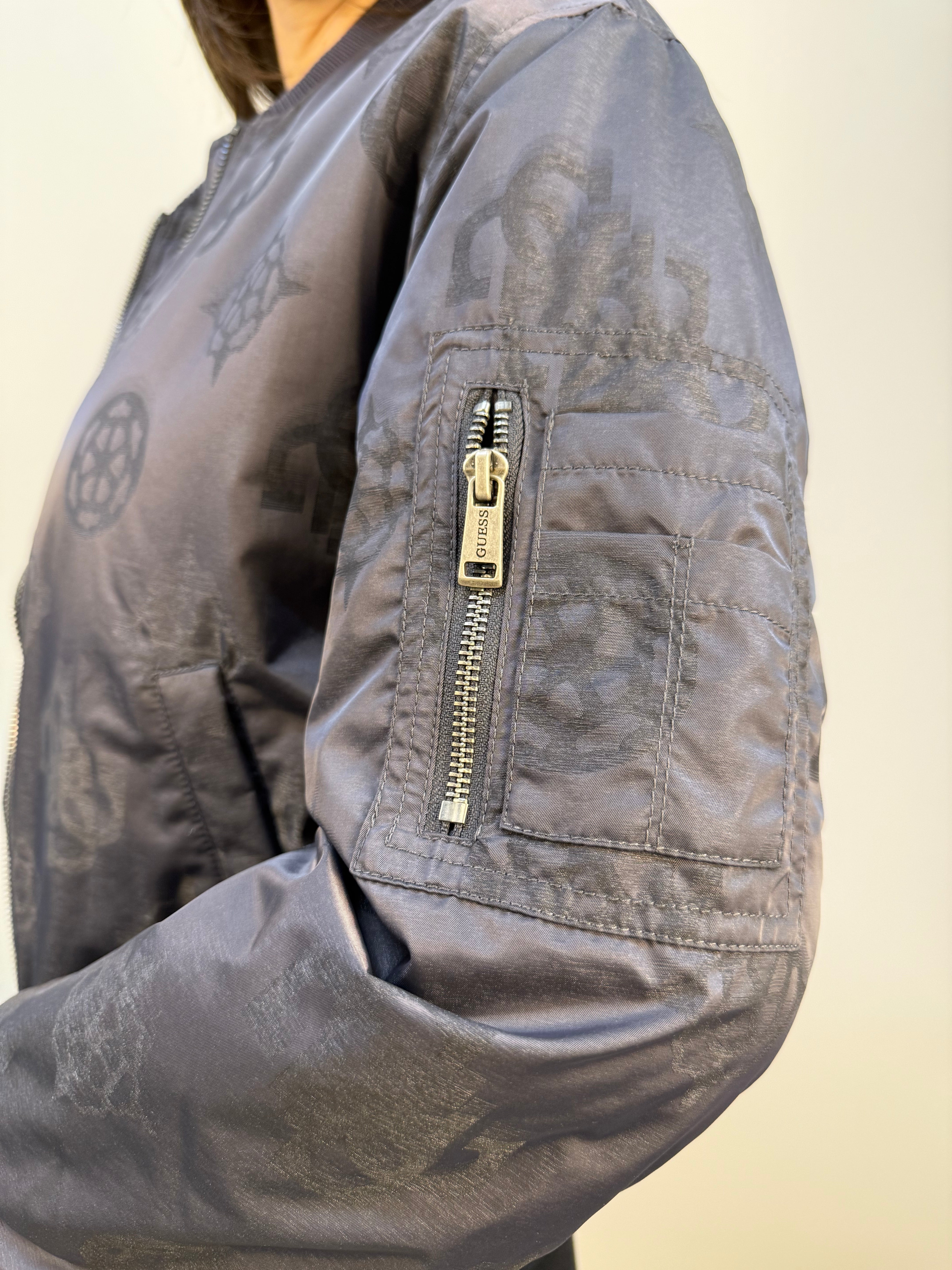 Bomber tecnico Guess leggermente imbottito, ideale per affrontare vento e pioggia con stile. Realizzato in tessuto impermeabile e antivento, è caratterizzato da una trama 4G all over a contrasto che dona al capo un look deciso e contemporaneo. La chiusura frontale è con zip, essenziale e funzionale. Collo, polsini e fondo sono rifiniti con costine elasticizzate per una vestibilità confortevole e aderente. Completano il design due tasche frontali con chiusura a bottone a pressione e una tasca utility sulla manica, dotata di tre scomparti aperti e uno con zip, perfetti per riporre oggetti di uso quotidiano.