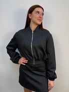 Felpa Akè stile bomber cropped realizzata in tessuto elasticizzato con trama gessata in tonalità grigio scuro, perfetta per un look moderno e sofisticato. La fodera interna garantisce calore e comfort, ideale per le giornate più fresche. La chiusura frontale è con zip in metallo color argento, mentre polsini e fascione elasticizzati assicurano una vestibilità aderente e confortevole. Un capo versatile che unisce stile e praticità in un design contemporaneo.