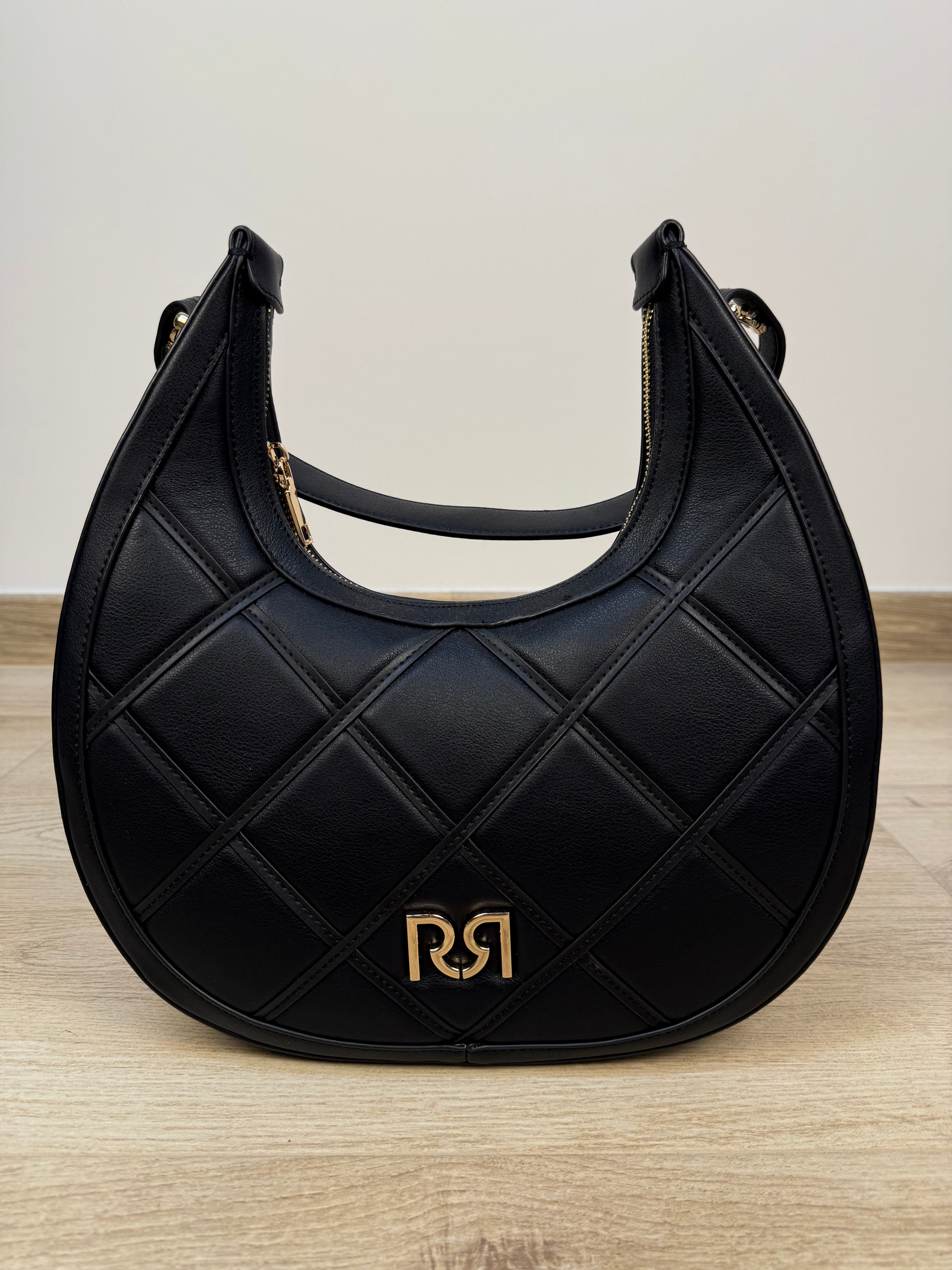 Dal design moderno e femminile, questa borsa hobo trapuntata Rinascimento si distingue per la sua silhouette a mezzaluna e le eleganti cuciture diagonali, che donano movimento e stile. Realizzata in materiale sintetico effetto pelle, è impreziosita dal logo RR in metallo dorato applicato sul davanti, per un tocco luminoso e sofisticato. Pensata per adattarsi a ogni esigenza, è dotata di doppio manico removibile: un manico corto per portarla a spalla e una tracolla regolabile e removibile per un comodo utilizzo crossbody. L’interno, foderato, presenta una tasca con zip e una tasca aperta, ideali per organizzare gli oggetti personali. Completa la funzionalità una tasca esterna con zip, perfetta per avere subito a portata di mano ciò che usi più spesso.