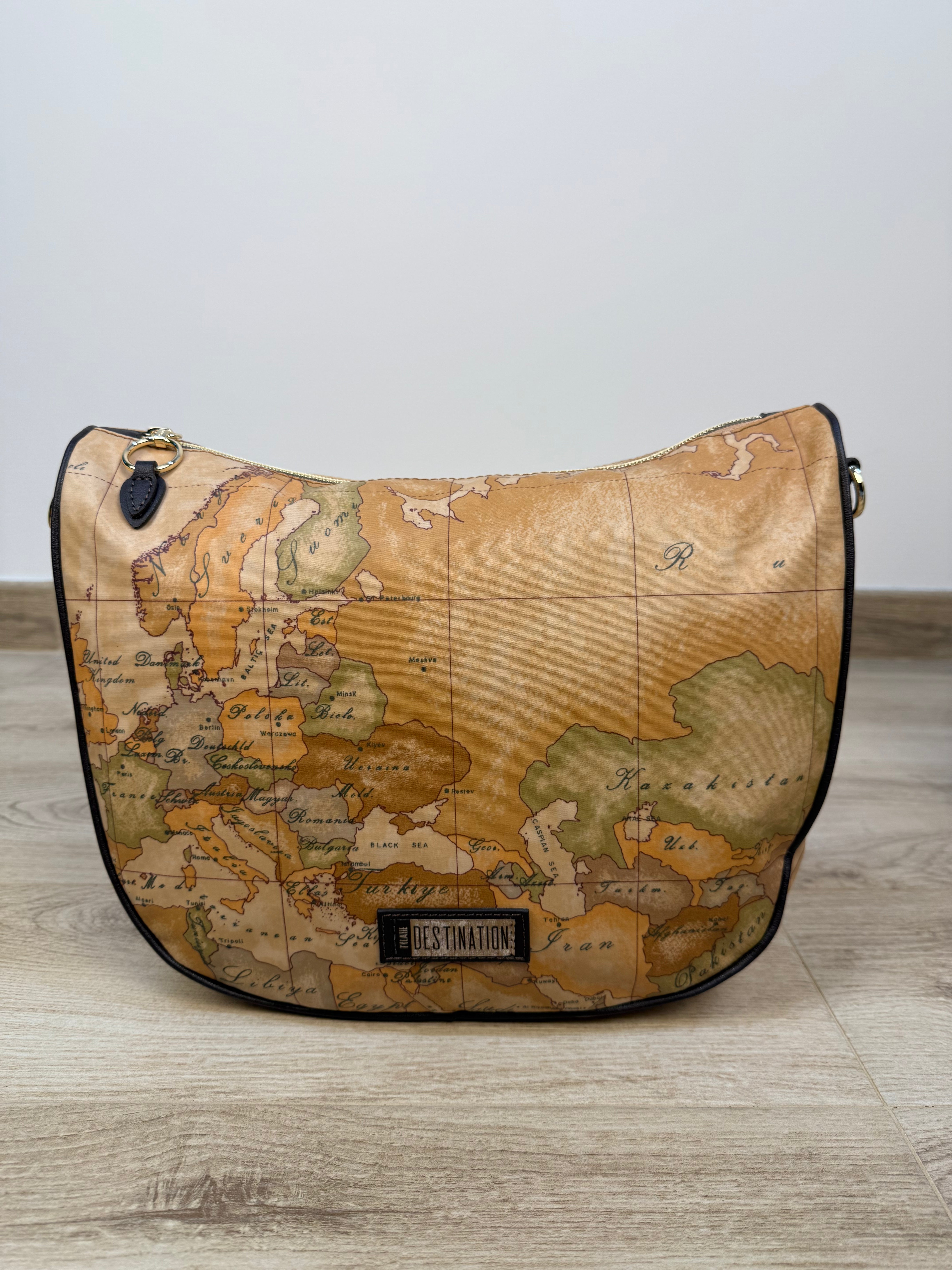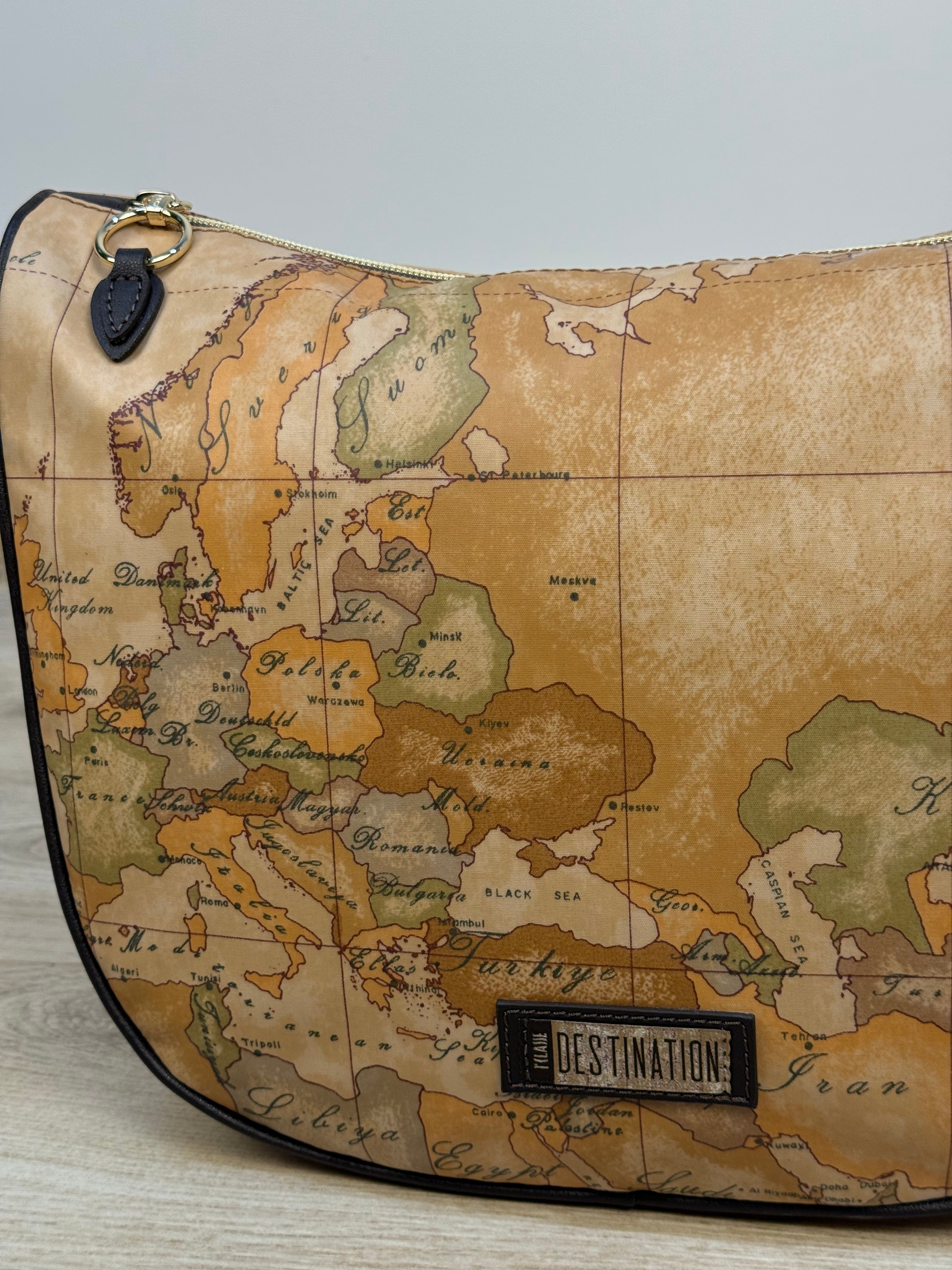 Elegante, versatile e leggera: questa borsa a mezzaluna fa parte della prestigiosa Linea Destination di Alviero Martini 1ᴬ Classe, pensata per chi desidera uno stile iconico e raffinato anche nella quotidianità. Realizzata in tessuto Soft Geo, abbina la riconoscibile stampa geografica a un materiale morbido e flessibile, per un risultato sofisticato ma pratico. Il design moderno è completato da dettagli curati come la patch frontale ricamata in similpelle color cioccolato e la metalleria dorata logata, per un tocco di discreto lusso. Pensata per adattarsi a ogni stile e momento della giornata, è dotata di due tracolle intercambiabili: una più corta per portarla a spalla e una più lunga per un uso crossbody, entrambe in similpelle color cioccolato coordinate con le finiture della borsa. L’interno, spazioso e ben organizzato, presenta due tasche aperte e una tasca con zip, ideali per tenere in ordine gli oggetti essenziali.