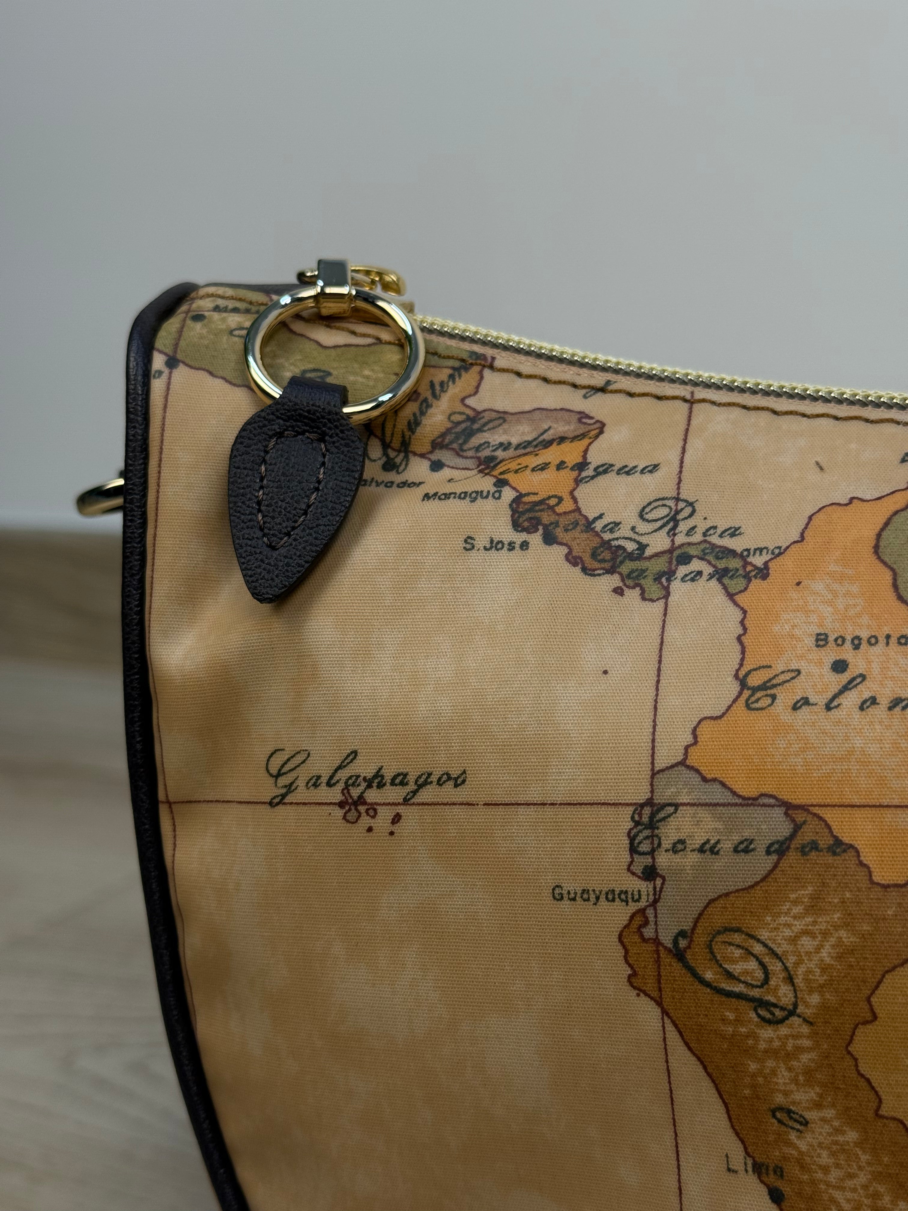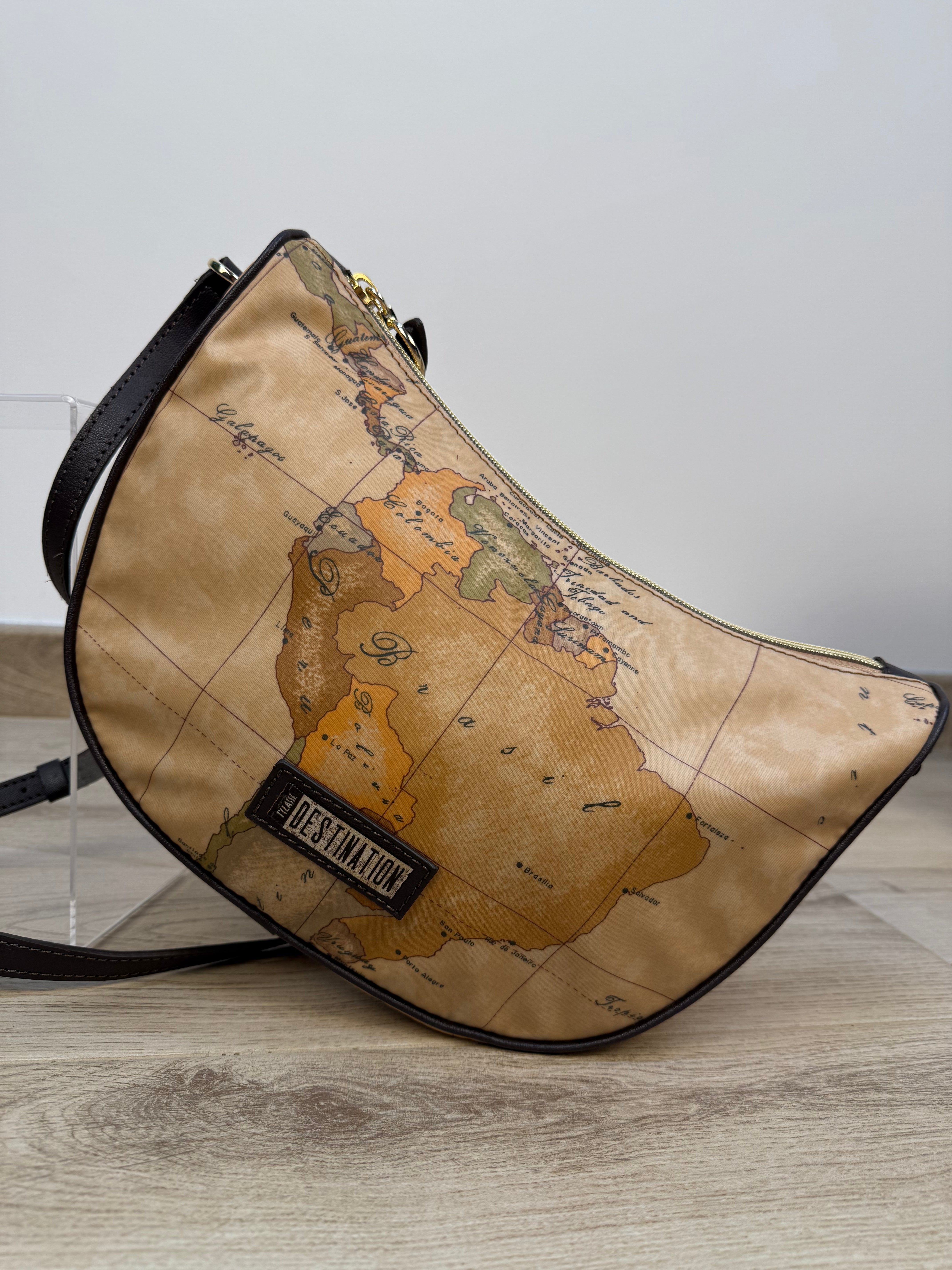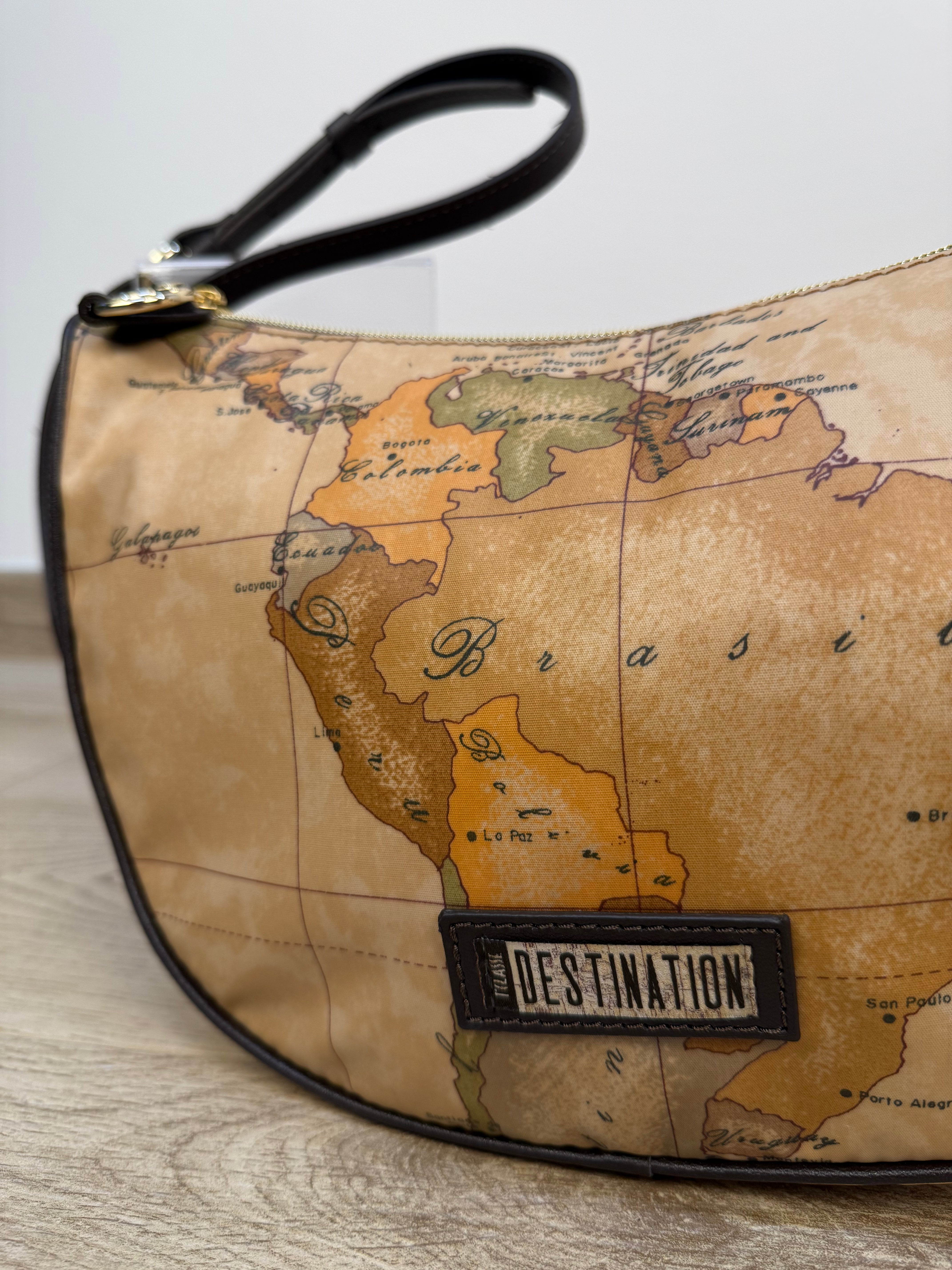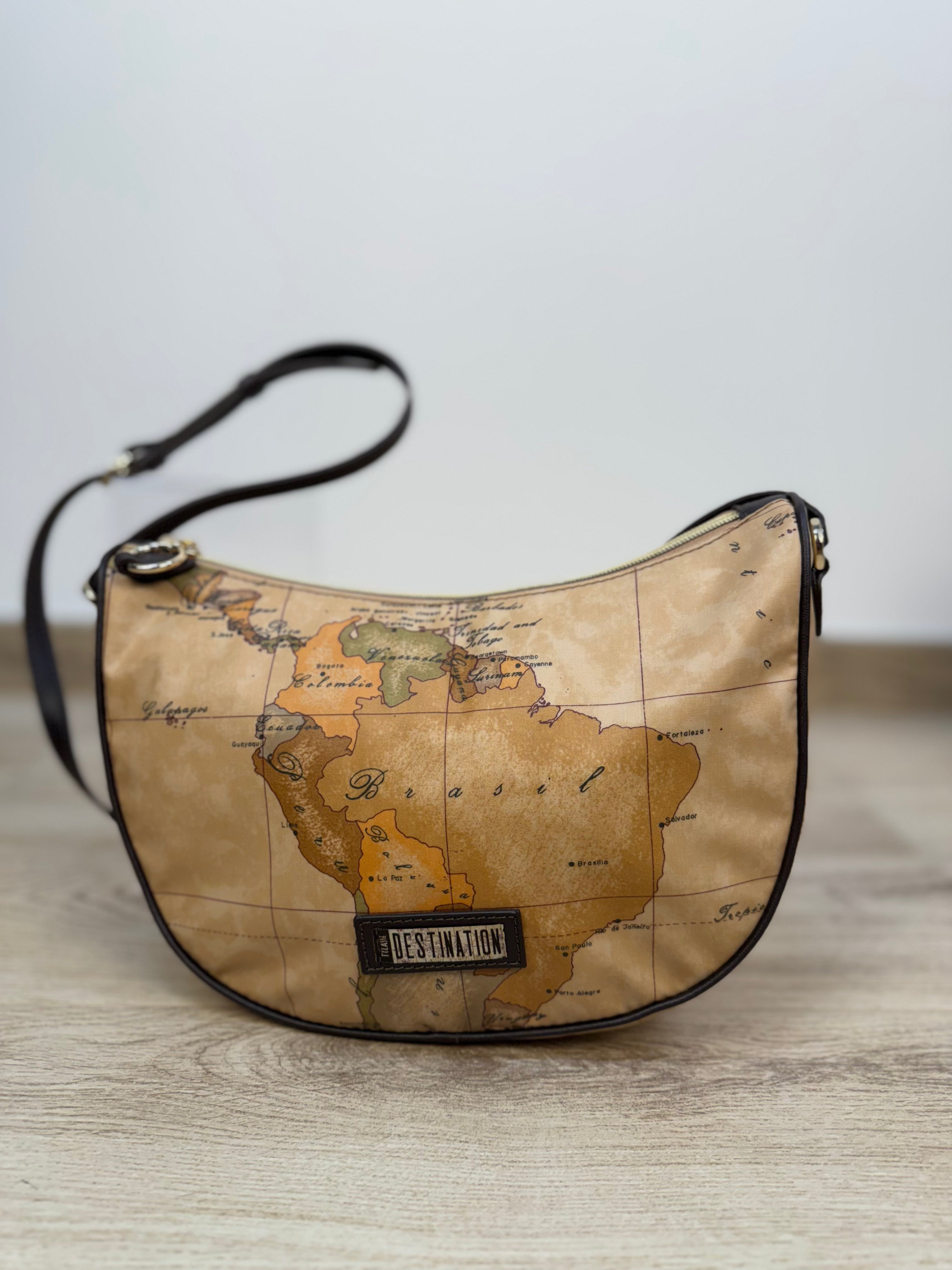 Elegante e versatile, questa borsa a mezzaluna fa parte della prestigiosa linea Destination di Alviero Martini. Realizzata in tessuto soft Geo, combina leggerezza e stile in un design moderno. All’interno, è dotata di due tasche aperte e una tasca con chiusura a zip, per organizzare al meglio i tuoi effetti personali. La tracolla regolabile in similpelle color cioccolato riprende con eleganza le rifiniture della borsa. La piccola patch in similpelle con logo ricamato sulla parte frontale conferisce un tocco di eleganza discreta. La metalleria logata in finitura oro completa il look con un tocco di lusso