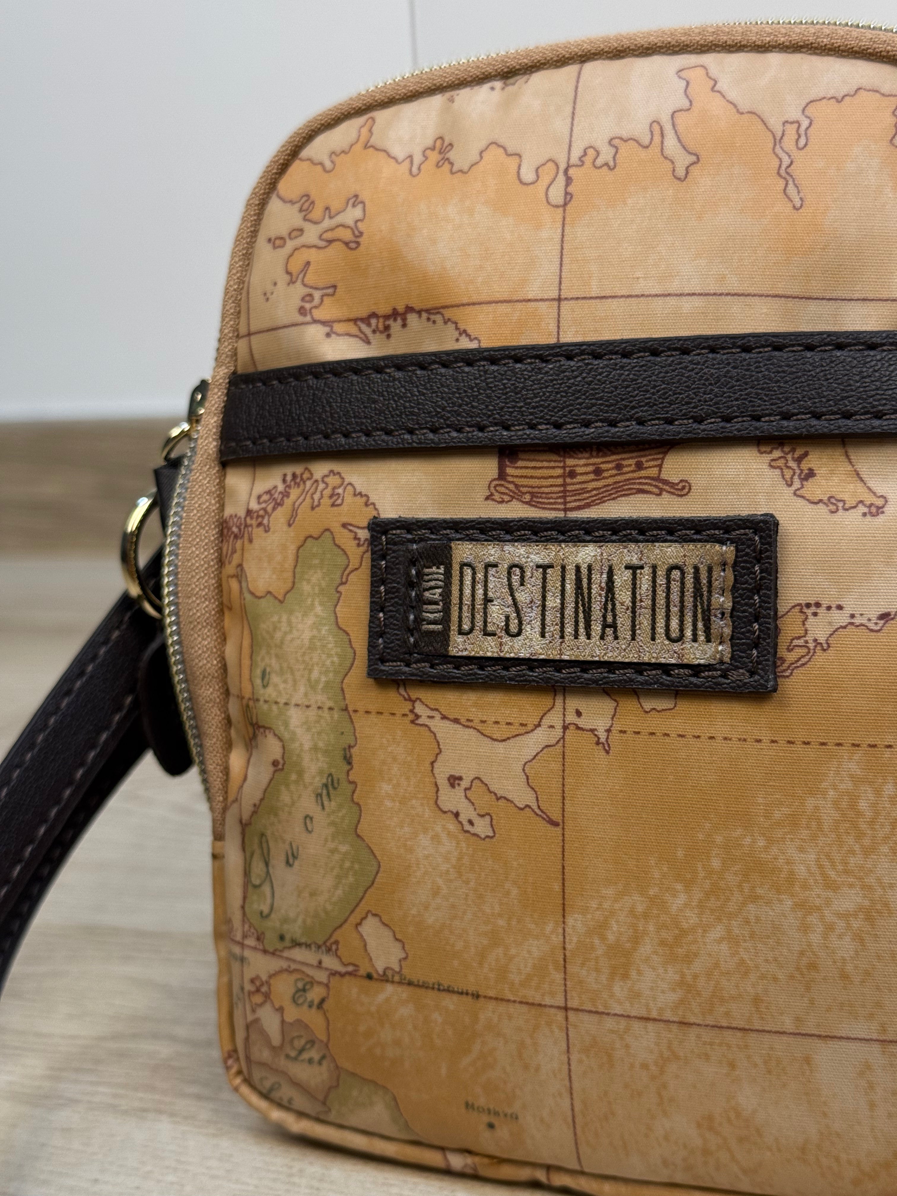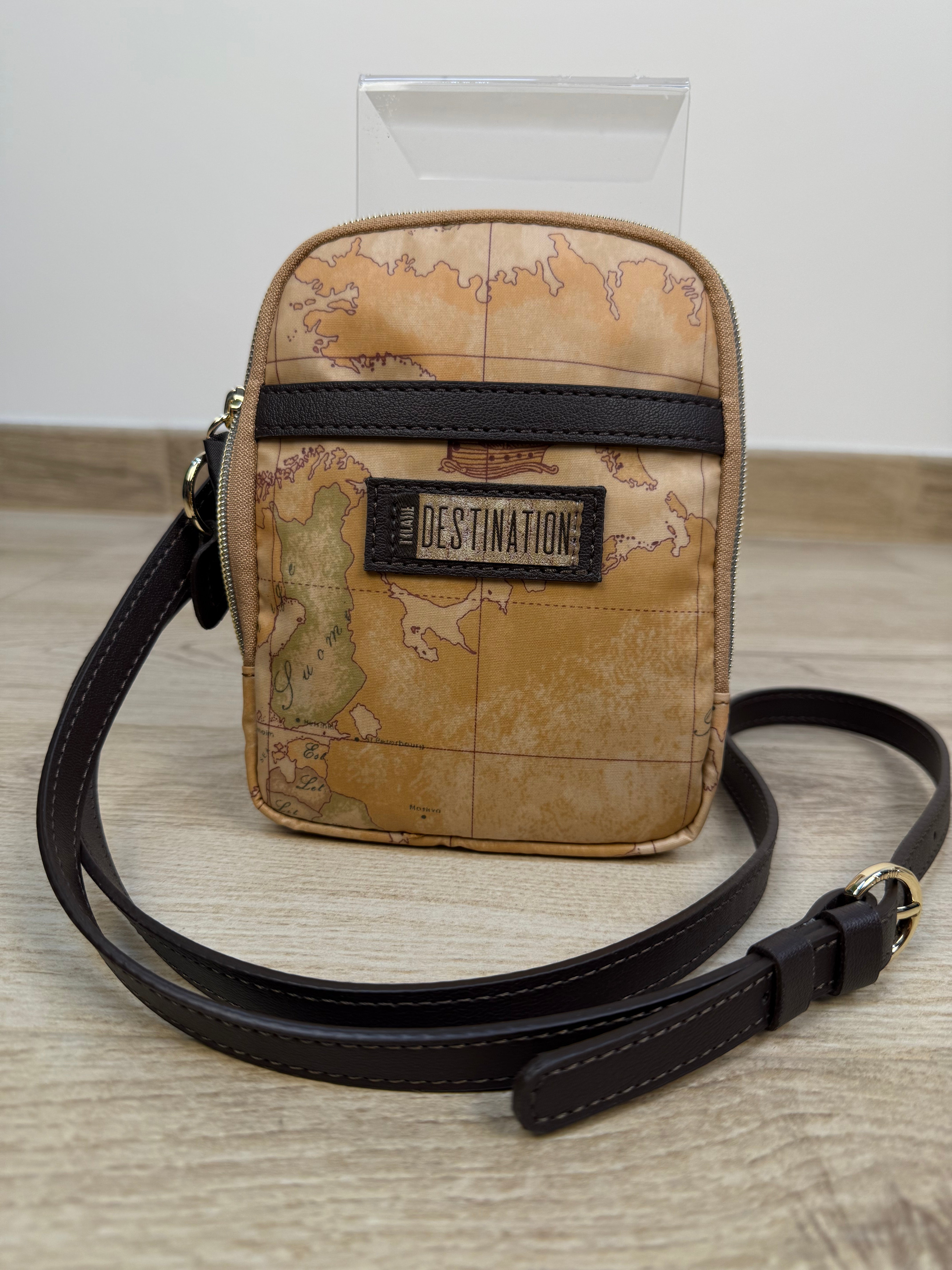 Compatta e pratica, questa tracollina in tessuto soft geo della linea Destination di Alviero Martini unisce funzionalità e stile. Sulla parte frontale presenta una tasca aperta, perfetta per avere a portata di mano gli oggetti essenziali. All’interno dello scomparto principale sono presenti due tasche aperte per organizzare al meglio tutto il necessario. La tracolla regolabile in similpelle color cioccolato riprende le rifiniture della borsa, mentre la piccola patch ricamata su similpelle sulla parte frontale conferisce un tocco di eleganza discreta. La metalleria logata in finitura oro completa il design con un dettaglio di classe. Un accessorio leggero e raffinato, ideale per ogni occasione.