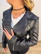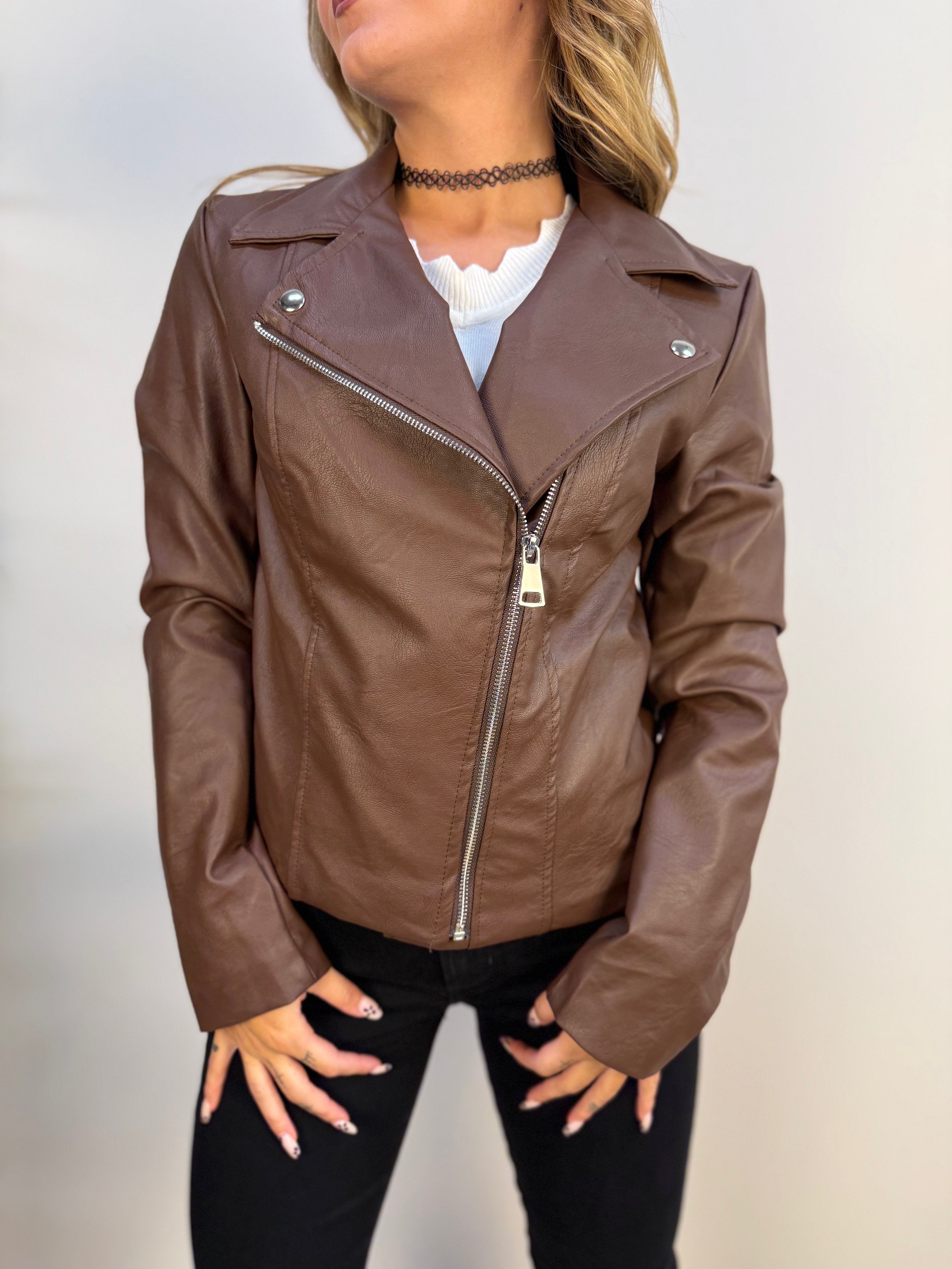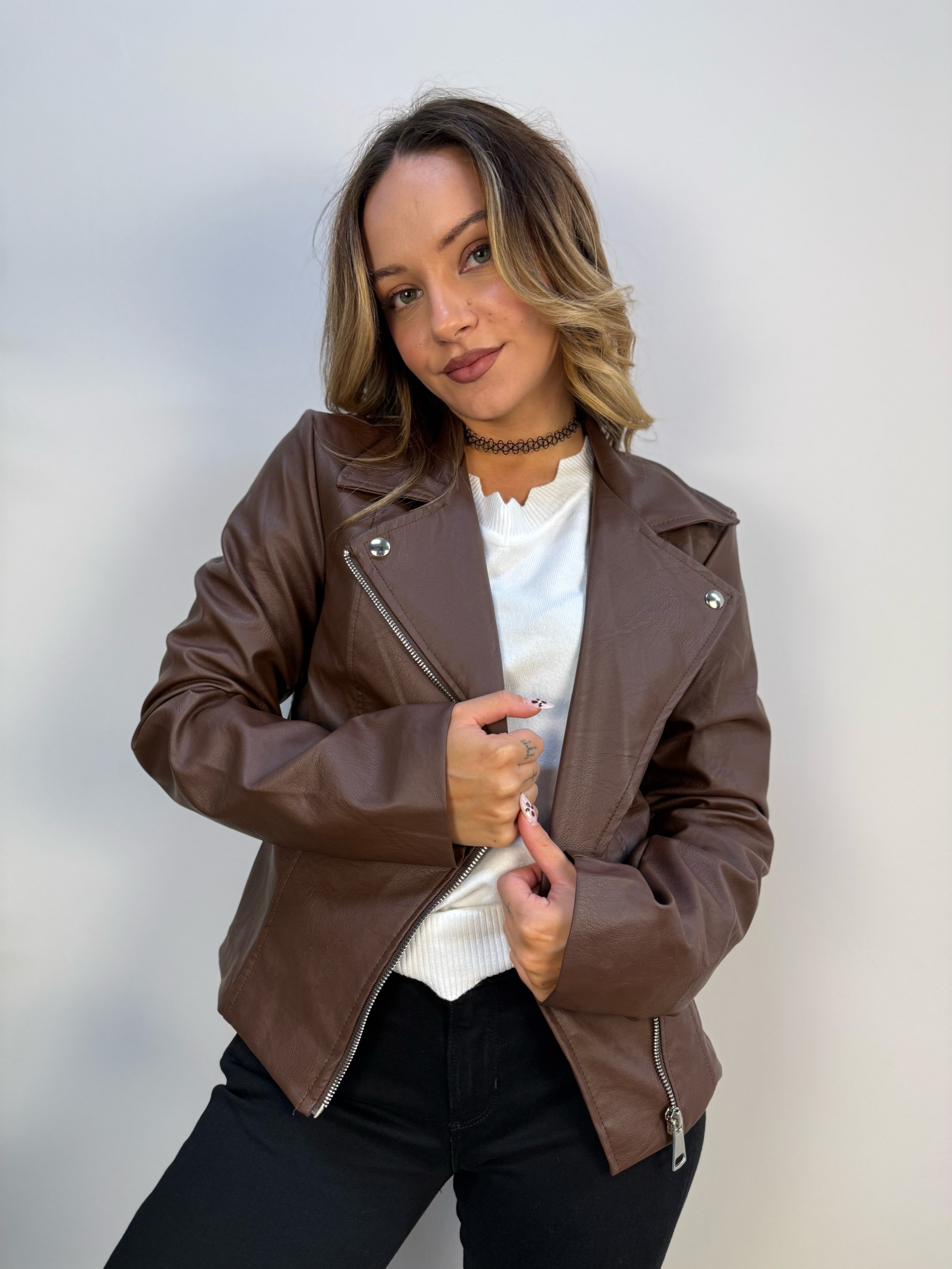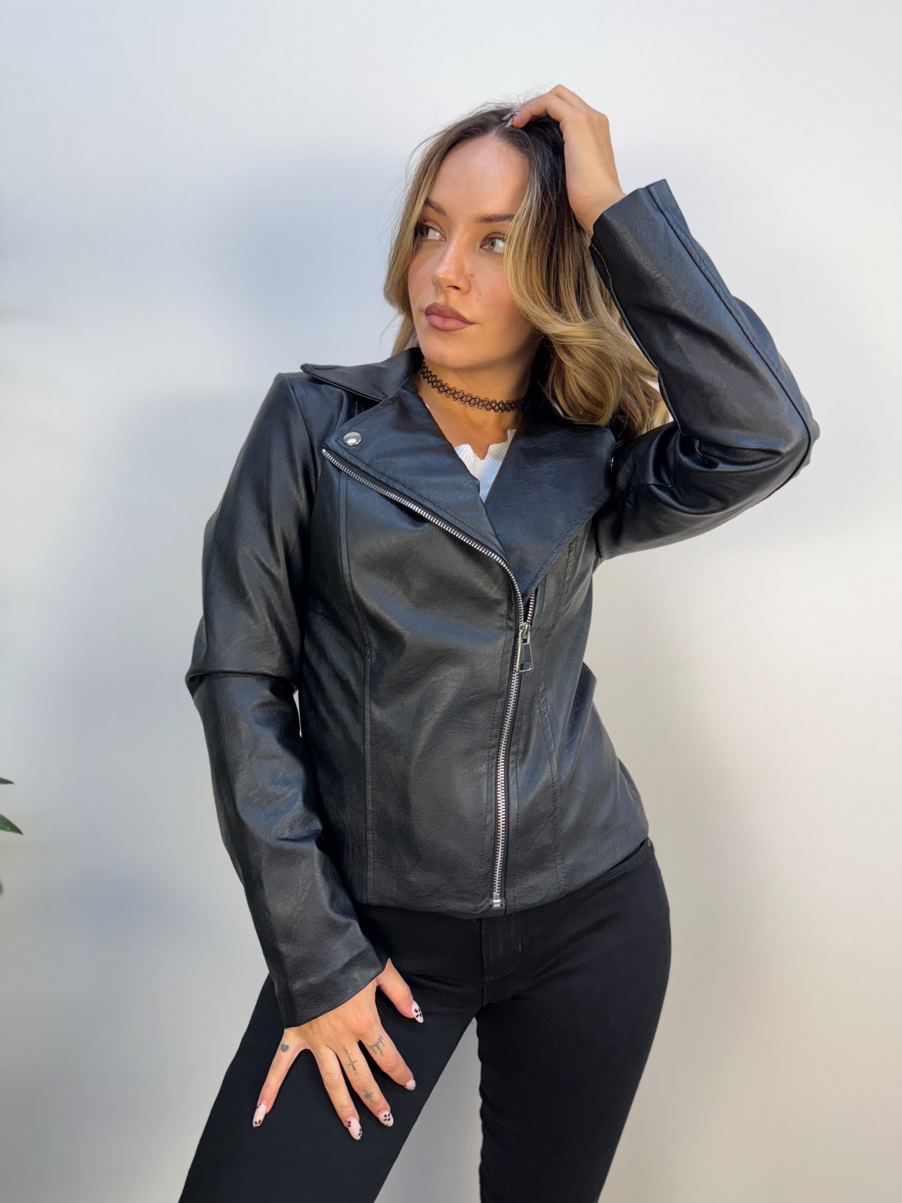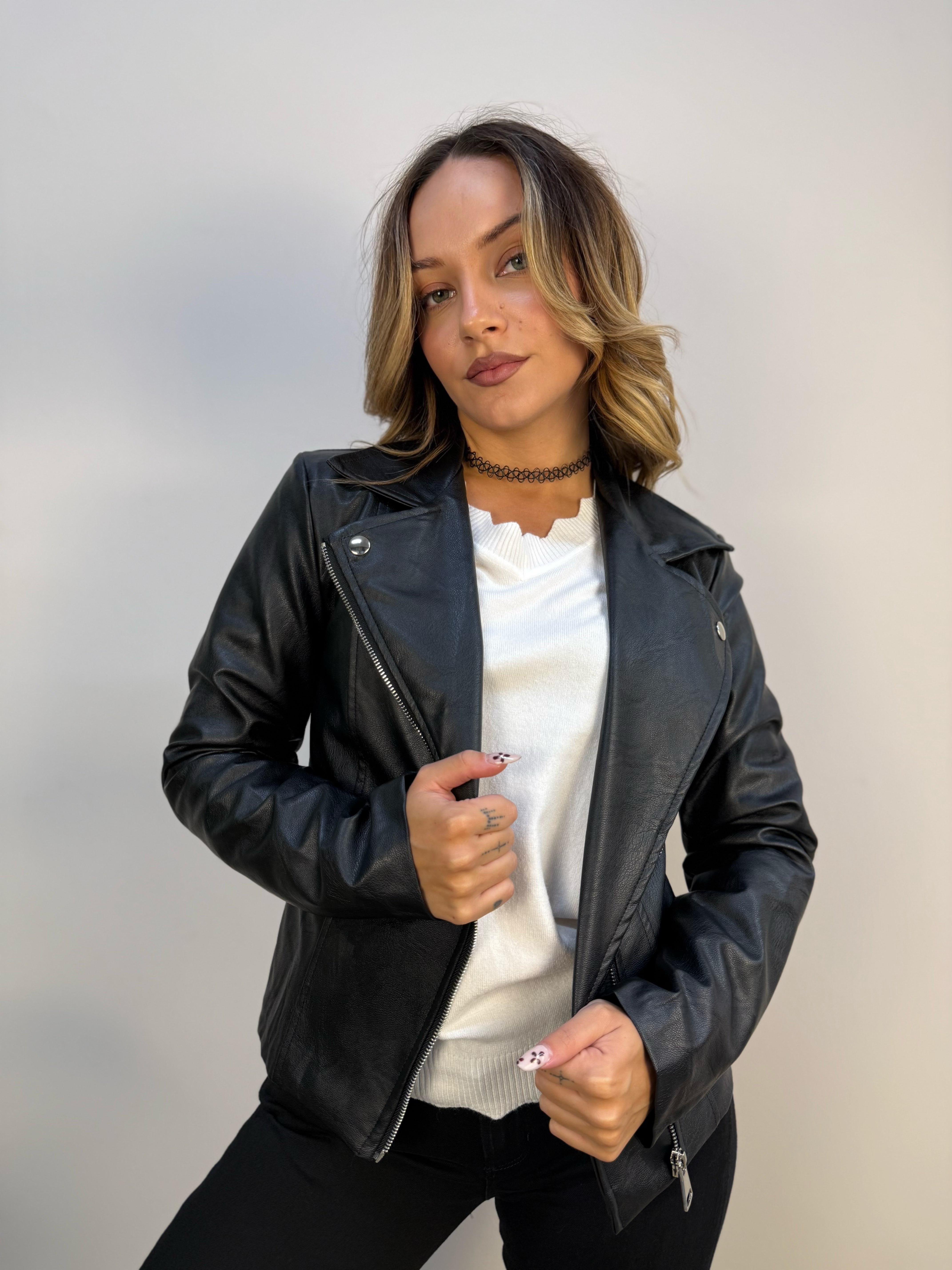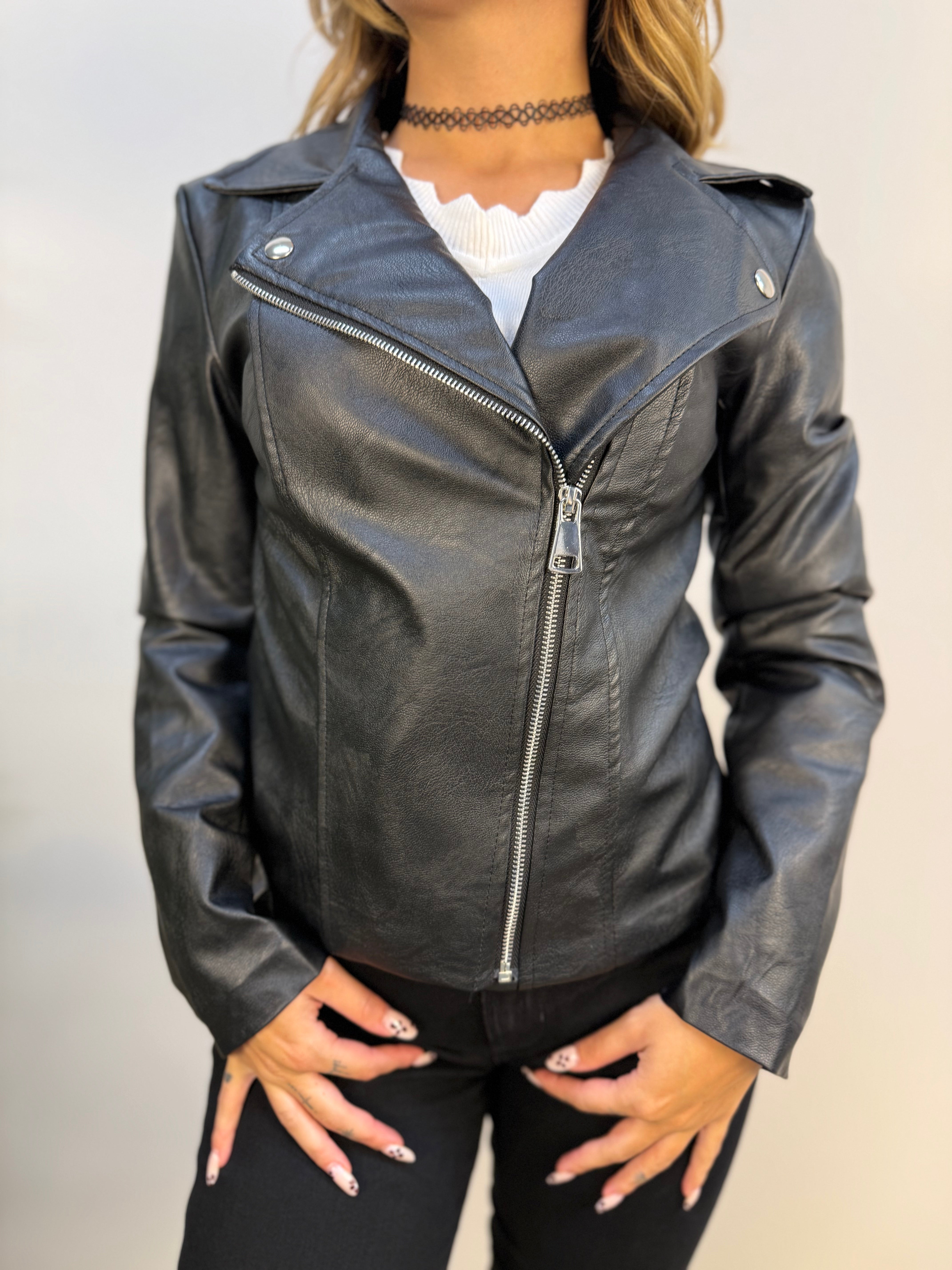 Chiodo Susy Mix dallo stile biker, realizzato in similpelle resistente e dal look deciso. Il capo è caratterizzato da una chiusura frontale con zip e dettagli in metallo color argento, inclusi bottoni e zip, che ne sottolineano l’anima rock e contemporanea. La lunghezza corta lo rende perfetto per abbinamenti casual e dinamici, ideale per chi ama uno stile grintoso e versatile.