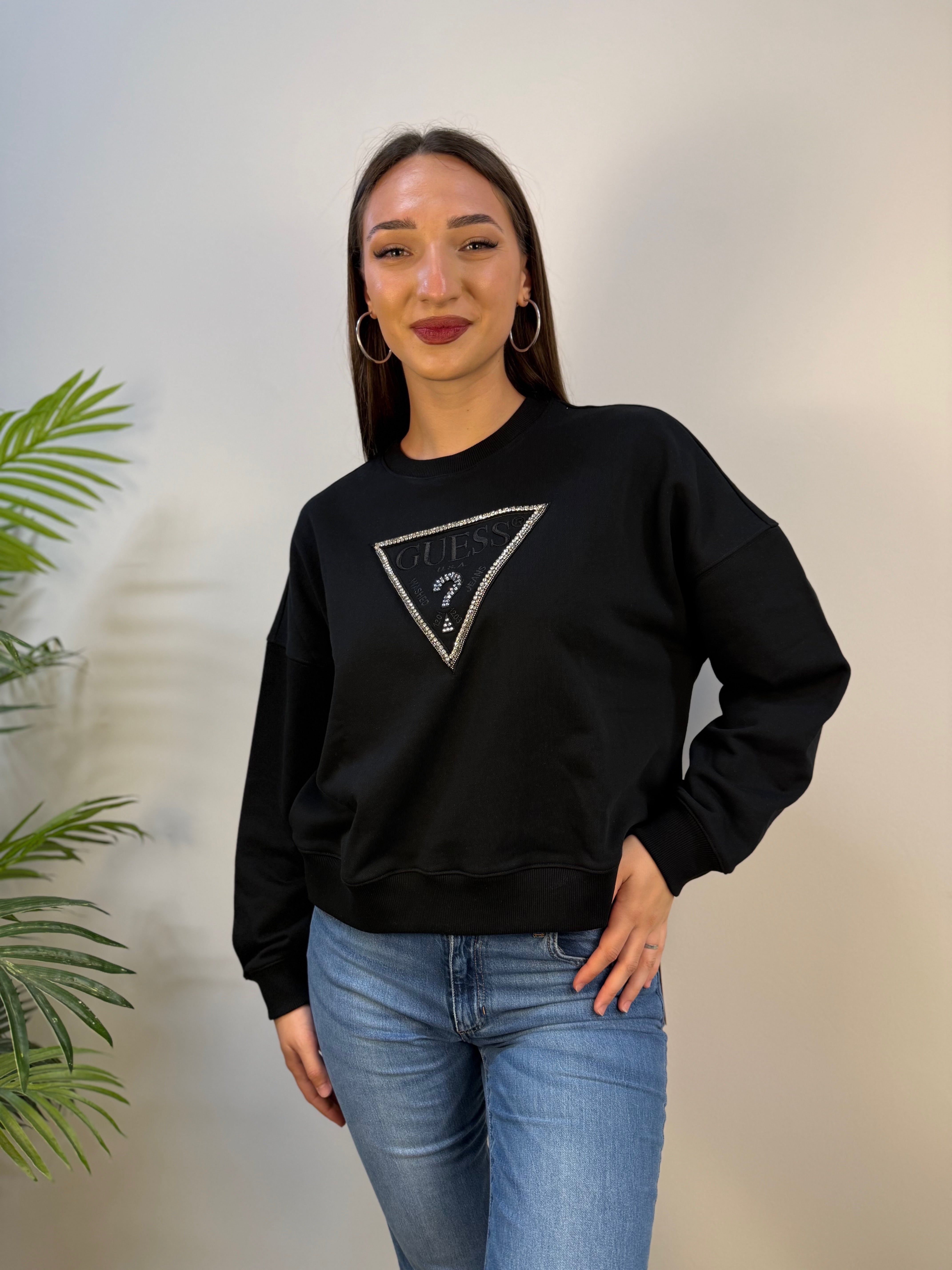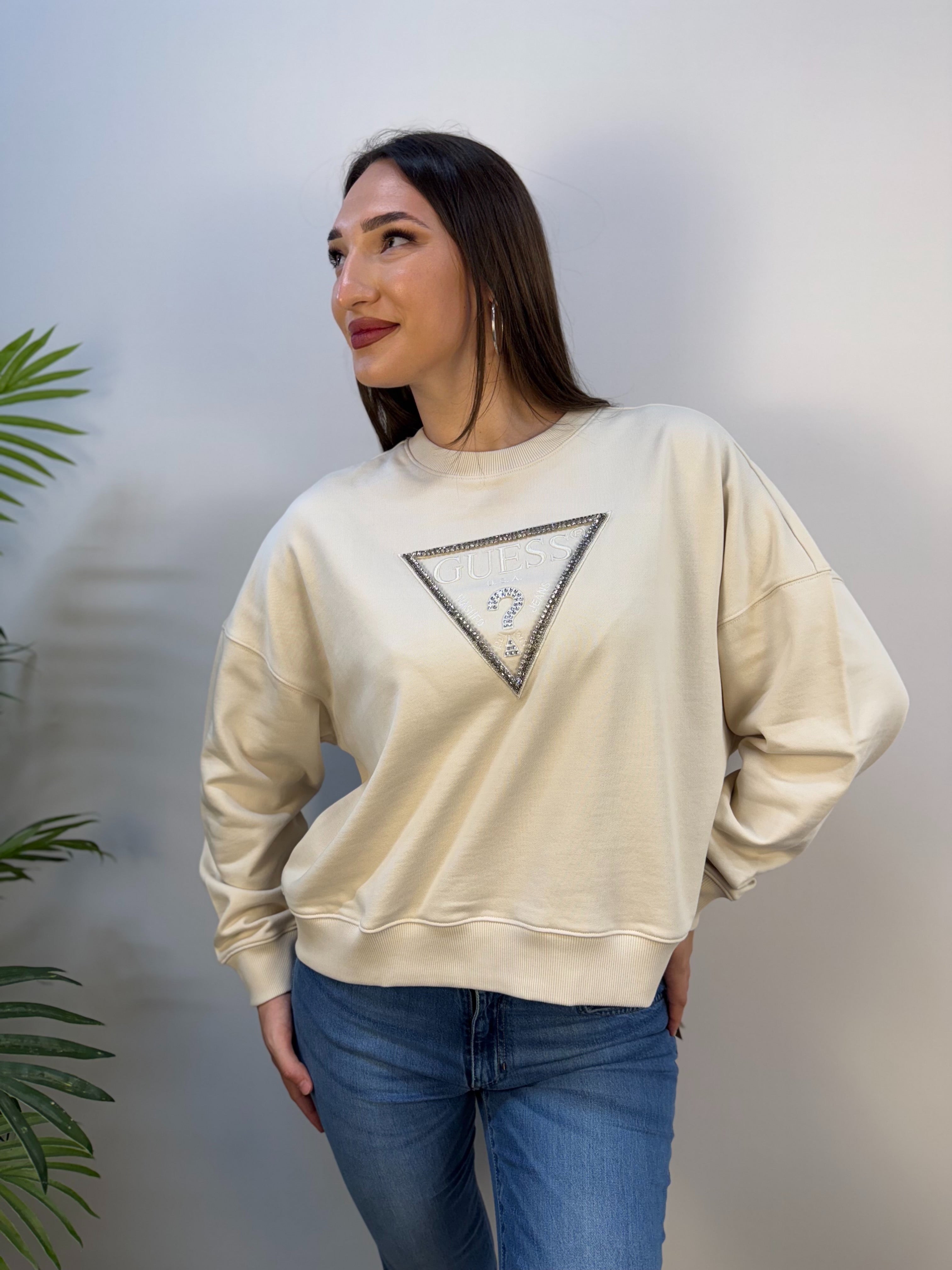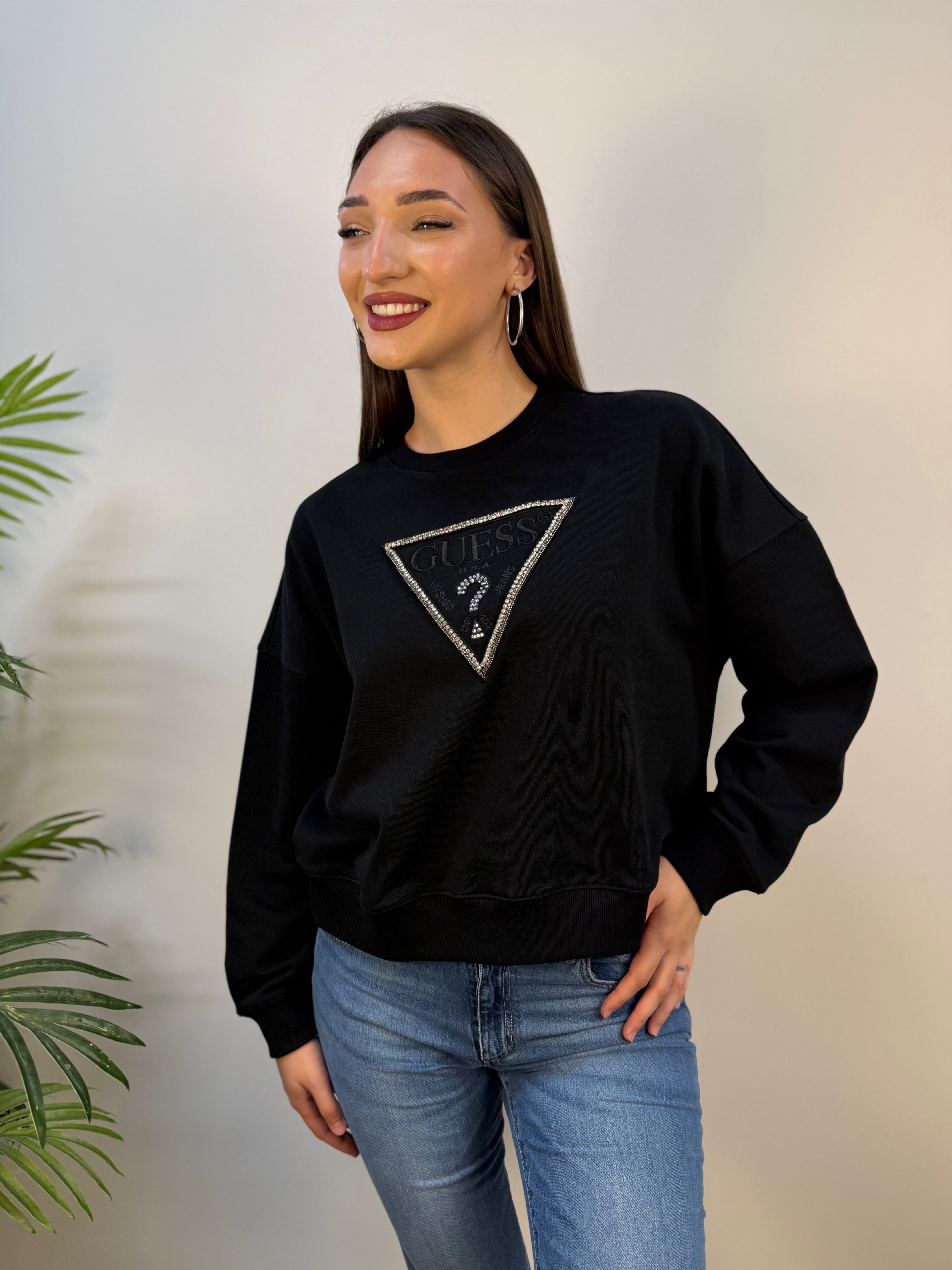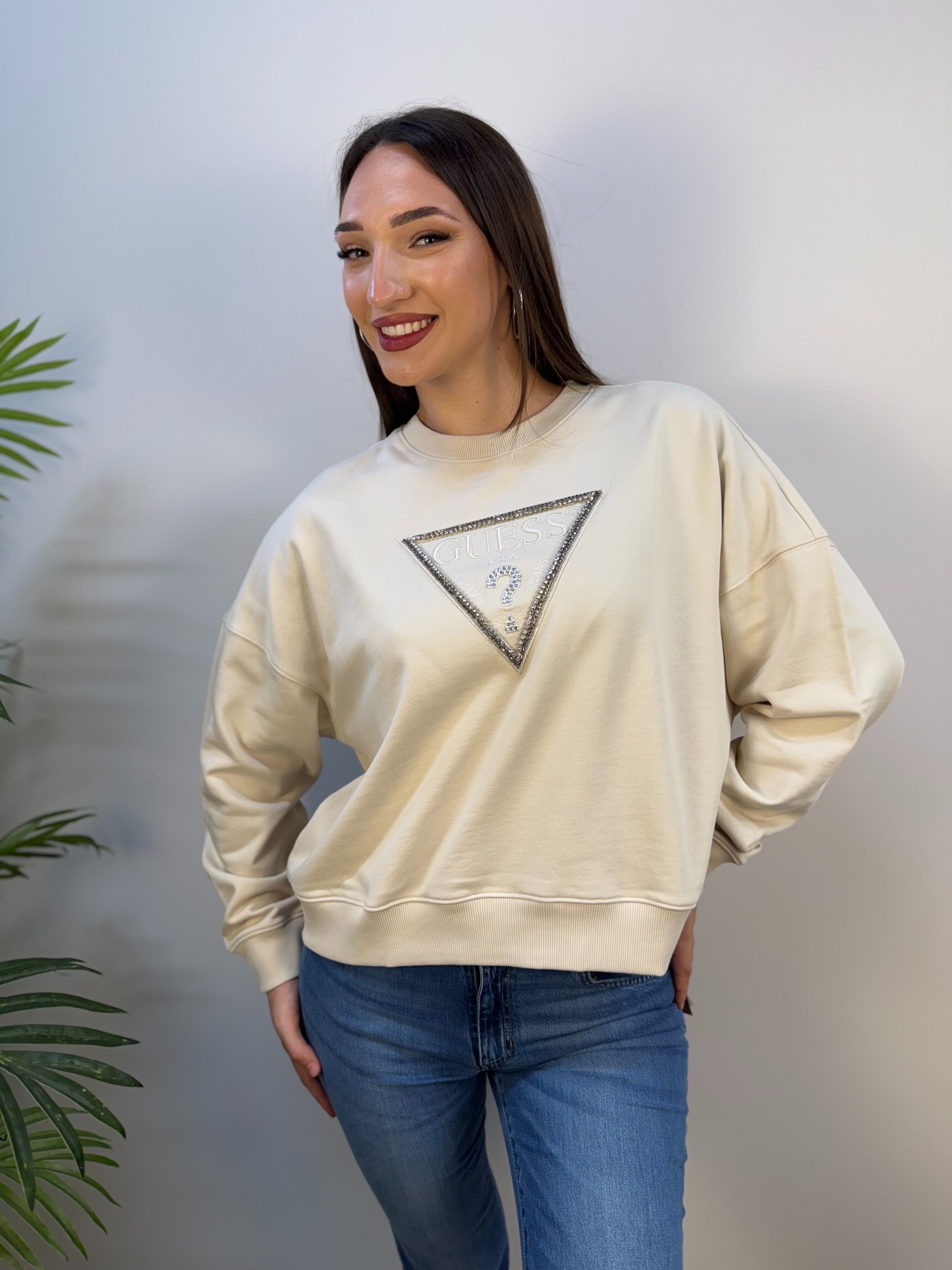 Felpa Guess girocollo in cotone garzato all’interno, calda e morbida a contatto con la pelle. Il design in tinta unita è impreziosito da un logo ricamato tono su tono, arricchito da una delicata applicazione di strass che dona un tocco luminoso ed elegante. Scollo, polsini e fascione sono realizzati in costine elasticizzate, per una vestibilità comoda e strutturata. Il taglio è morbido e leggermente ampio sui fianchi, per un effetto relaxed ma curato. Un capo versatile, perfetto per look casual con un tocco di stile.