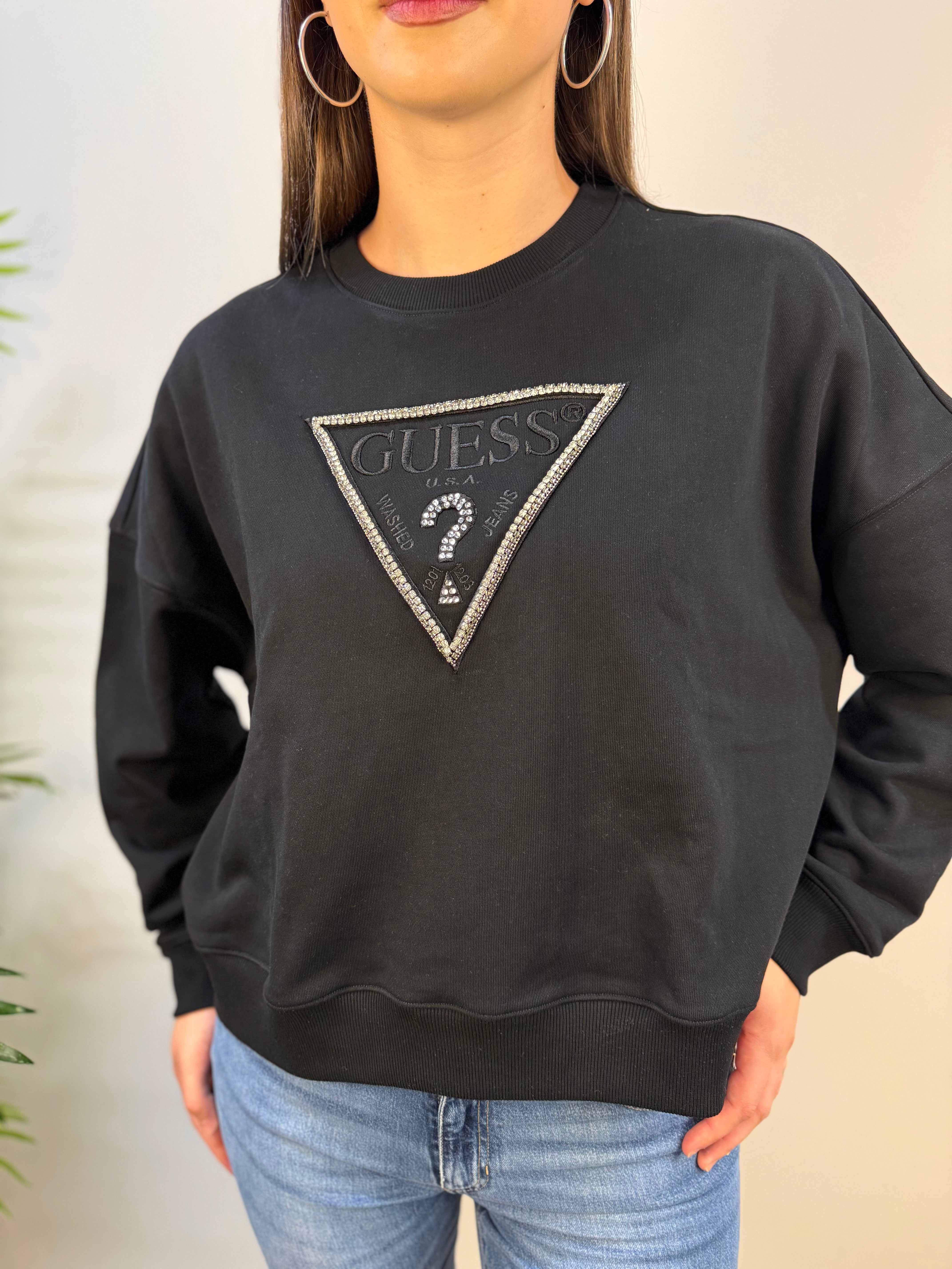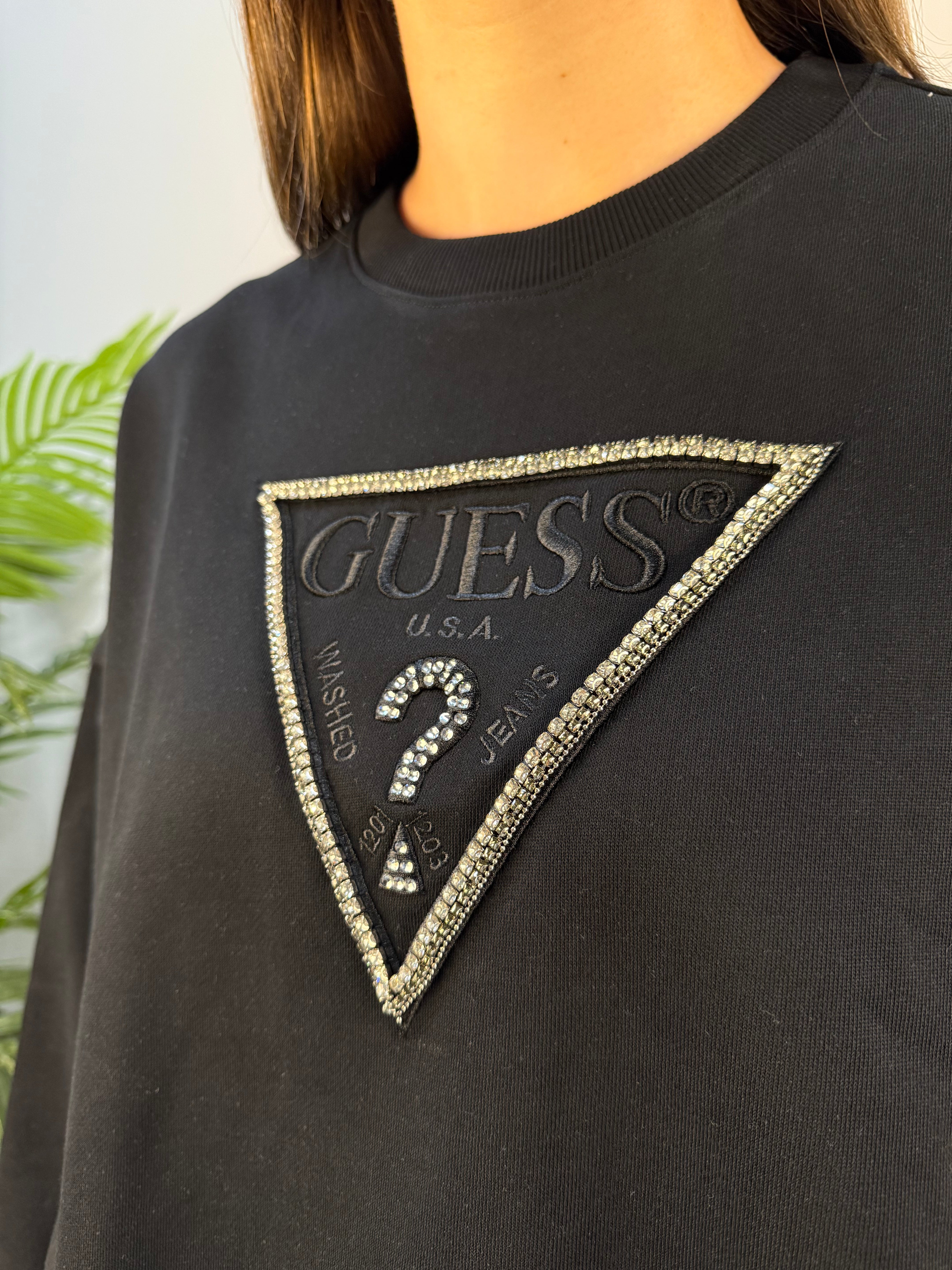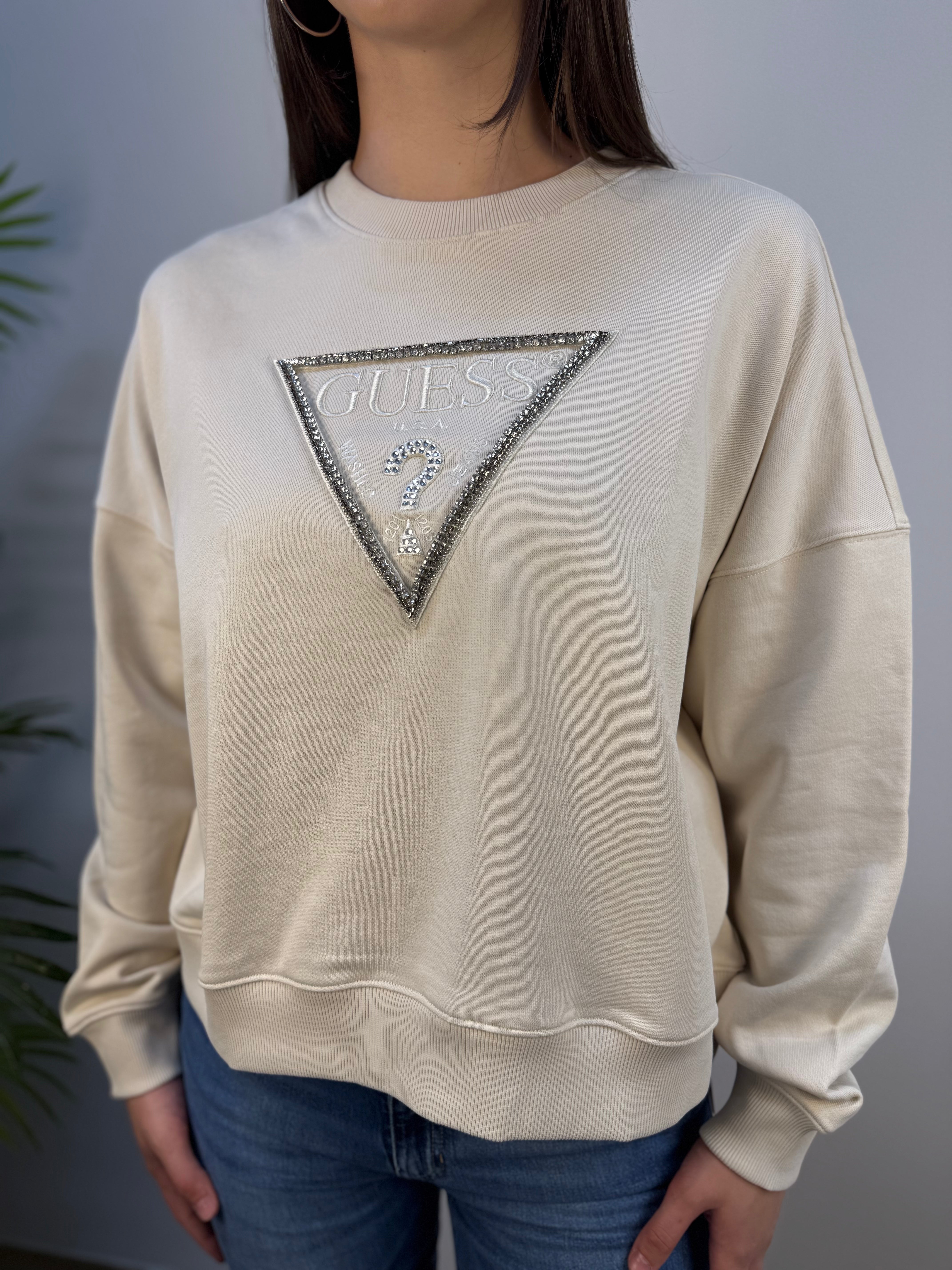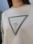 Felpa Guess girocollo in cotone garzato all’interno, calda e morbida a contatto con la pelle. Il design in tinta unita è impreziosito da un logo ricamato tono su tono, arricchito da una delicata applicazione di strass che dona un tocco luminoso ed elegante. Scollo, polsini e fascione sono realizzati in costine elasticizzate, per una vestibilità comoda e strutturata. Il taglio è morbido e leggermente ampio sui fianchi, per un effetto relaxed ma curato. Un capo versatile, perfetto per look casual con un tocco di stile.