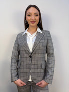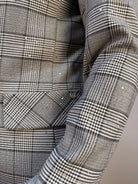 Giacca Rinascimento dal taglio raffinato in trama check nei toni del grigio, bianco e nero, impreziosita da paillettes trasparenti cucite direttamente sul tessuto, che donano una luce discreta e sofisticata al capo. Le spalle imbottite aggiungono struttura e carattere, mentre la chiusura frontale con bottone in tessuto e asola mantiene il design essenziale e curato nei dettagli. Un capo elegante ma versatile, perfetto da indossare sia di giorno che di sera per aggiungere un tocco brillante al tuo look.